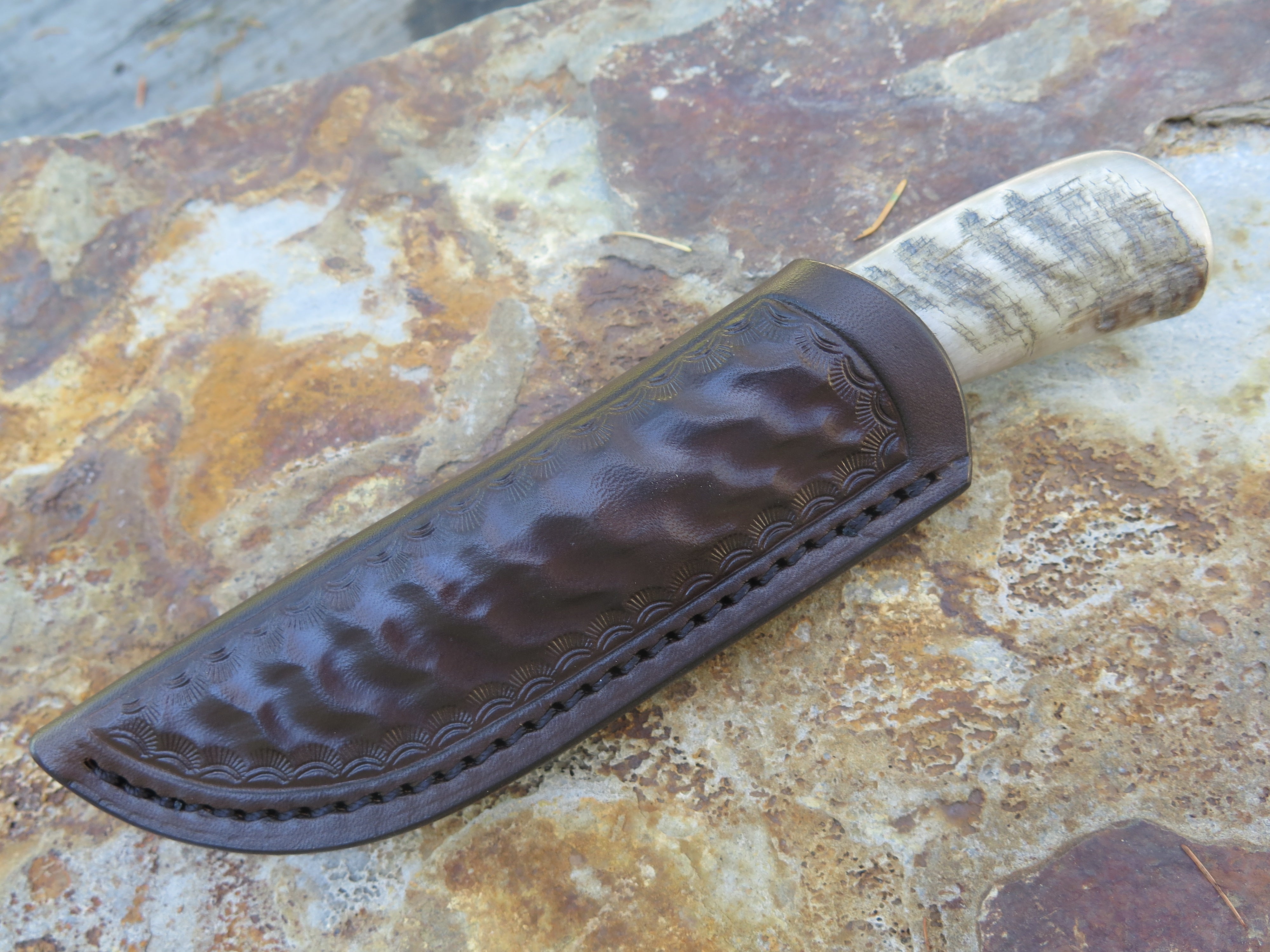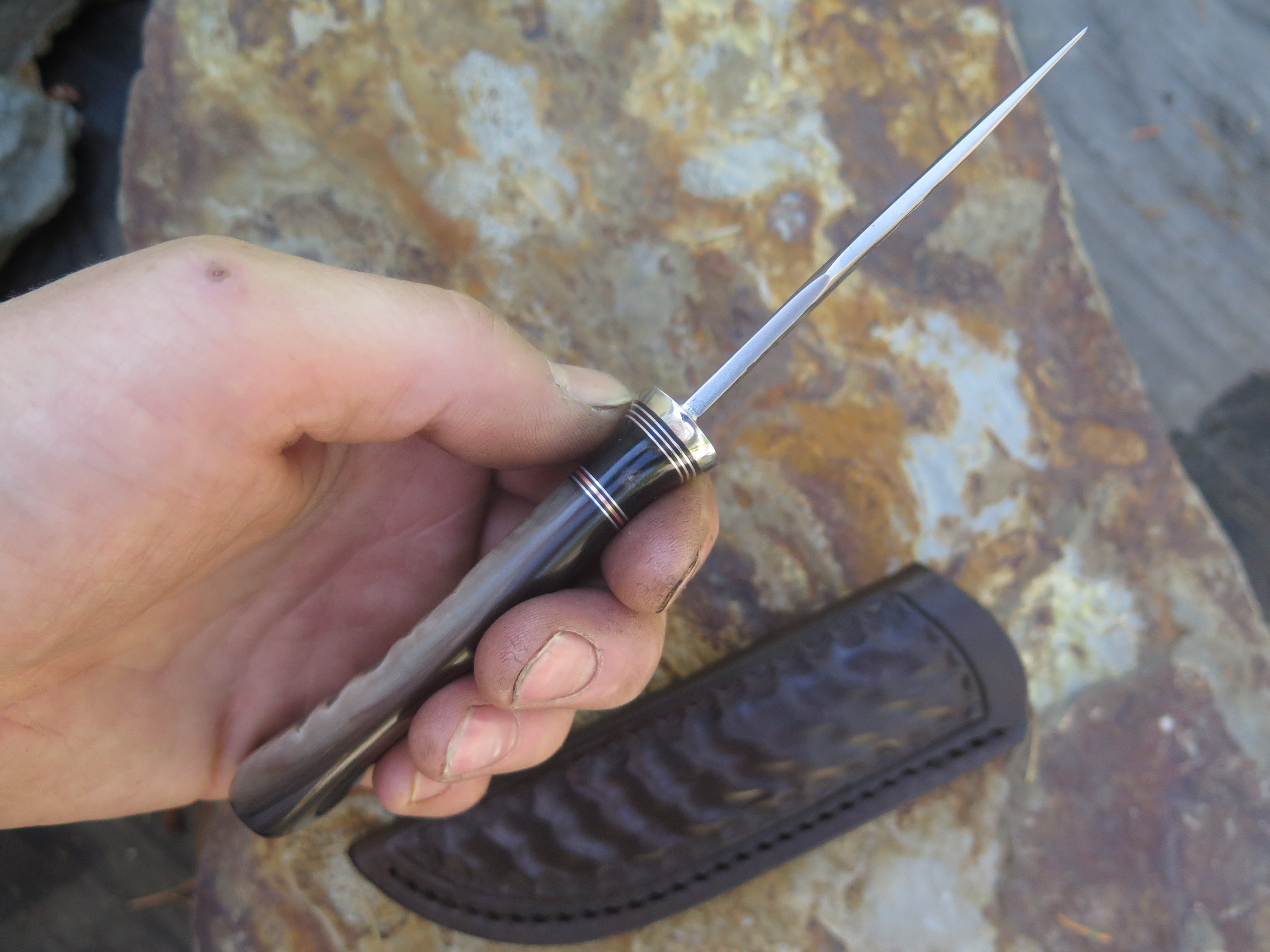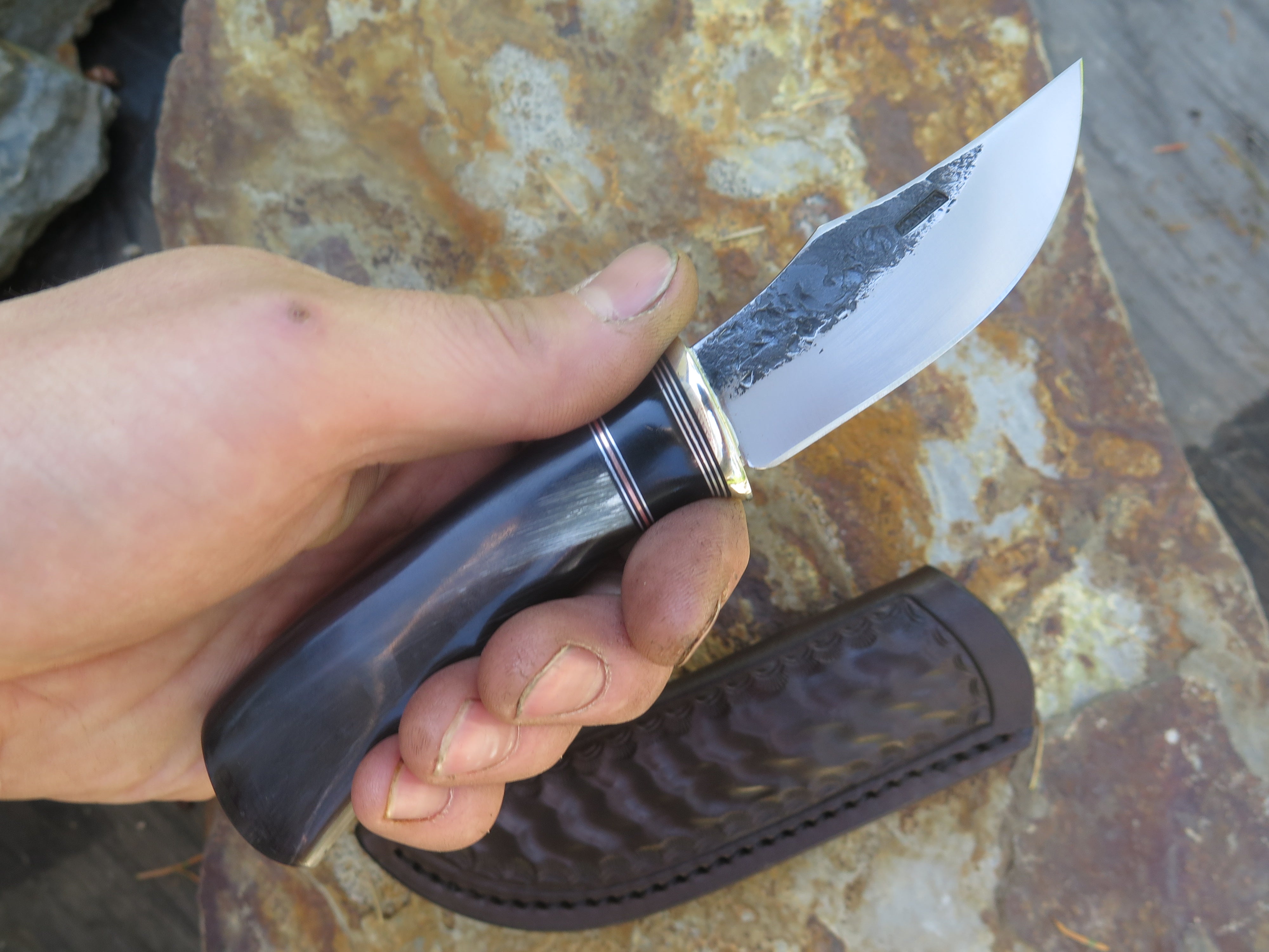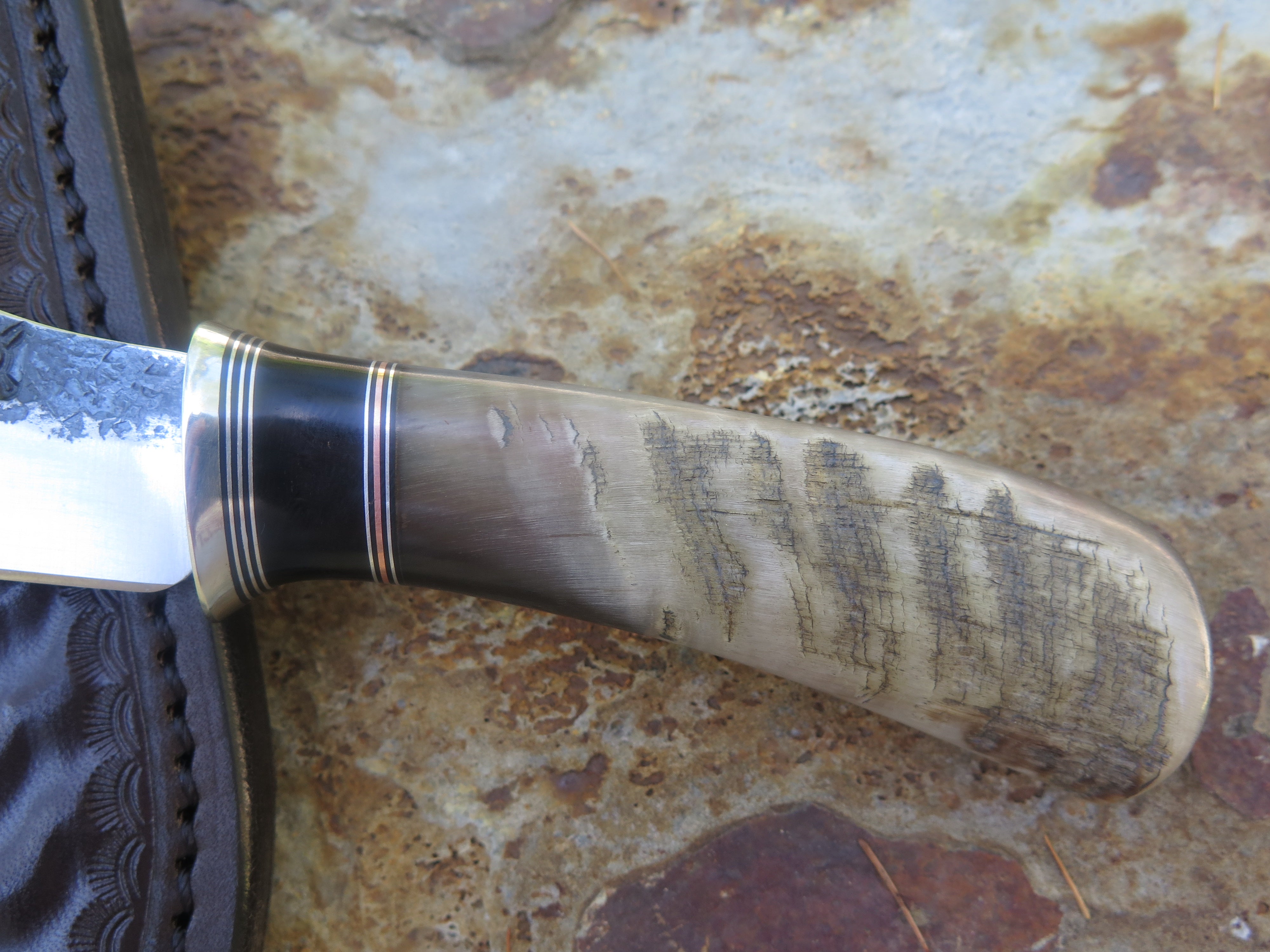 This beautiful new Pocket Knife from Behring Made© is hand forged from 1/8" thick high carbon 01 tool steel and it measures 3 1/4" from tip to guard with a razor sharp hollow grind and our hammermark finish. The nickel silver guard is soldered in place above black fiber, aluminum, copper and a remarkable black figure musk ox spacer which tops the high figure big horn sheep handle. The overall length measures 6 7/8" and it comes in a sheep tooled pocket clip sheath.