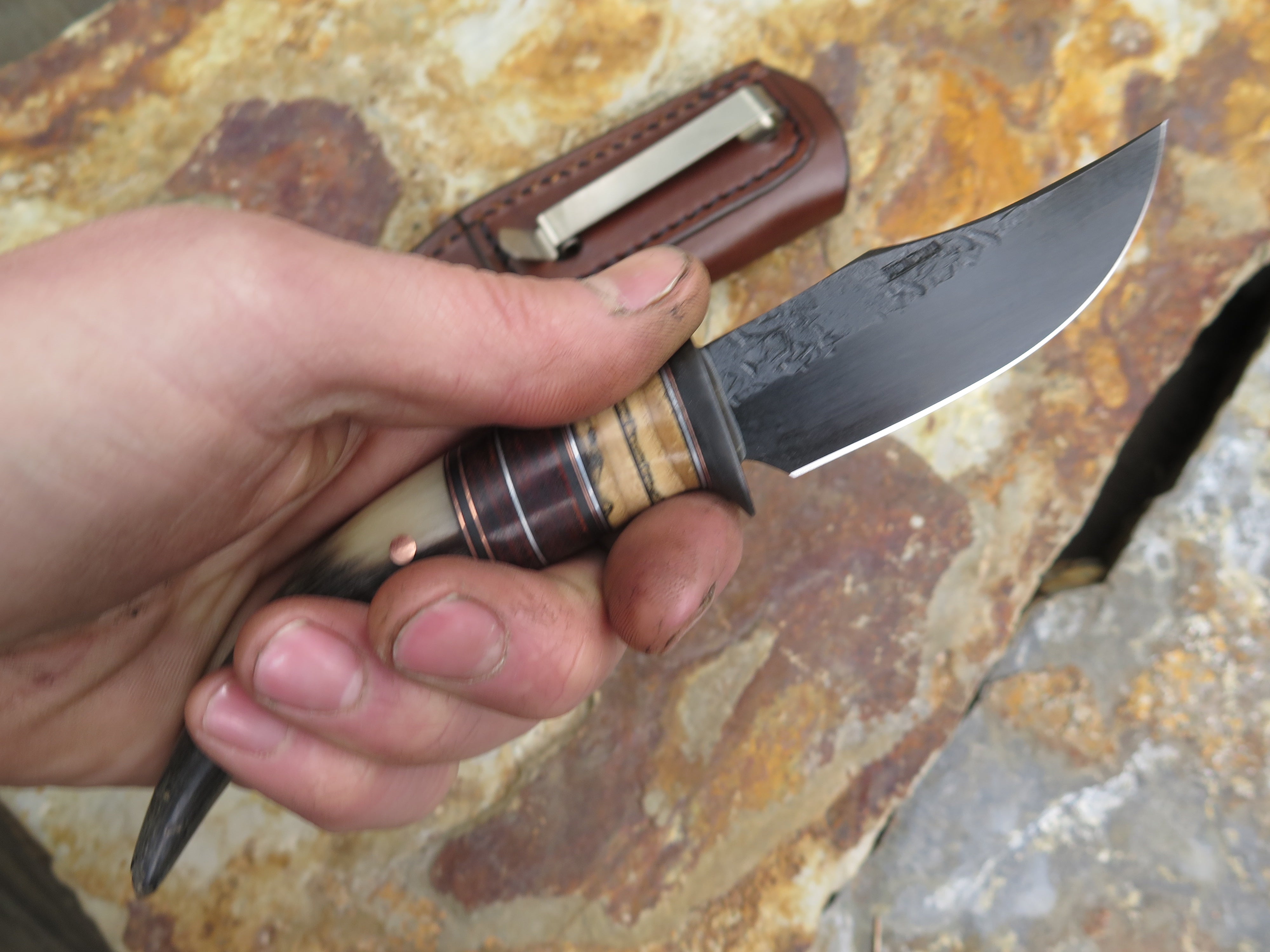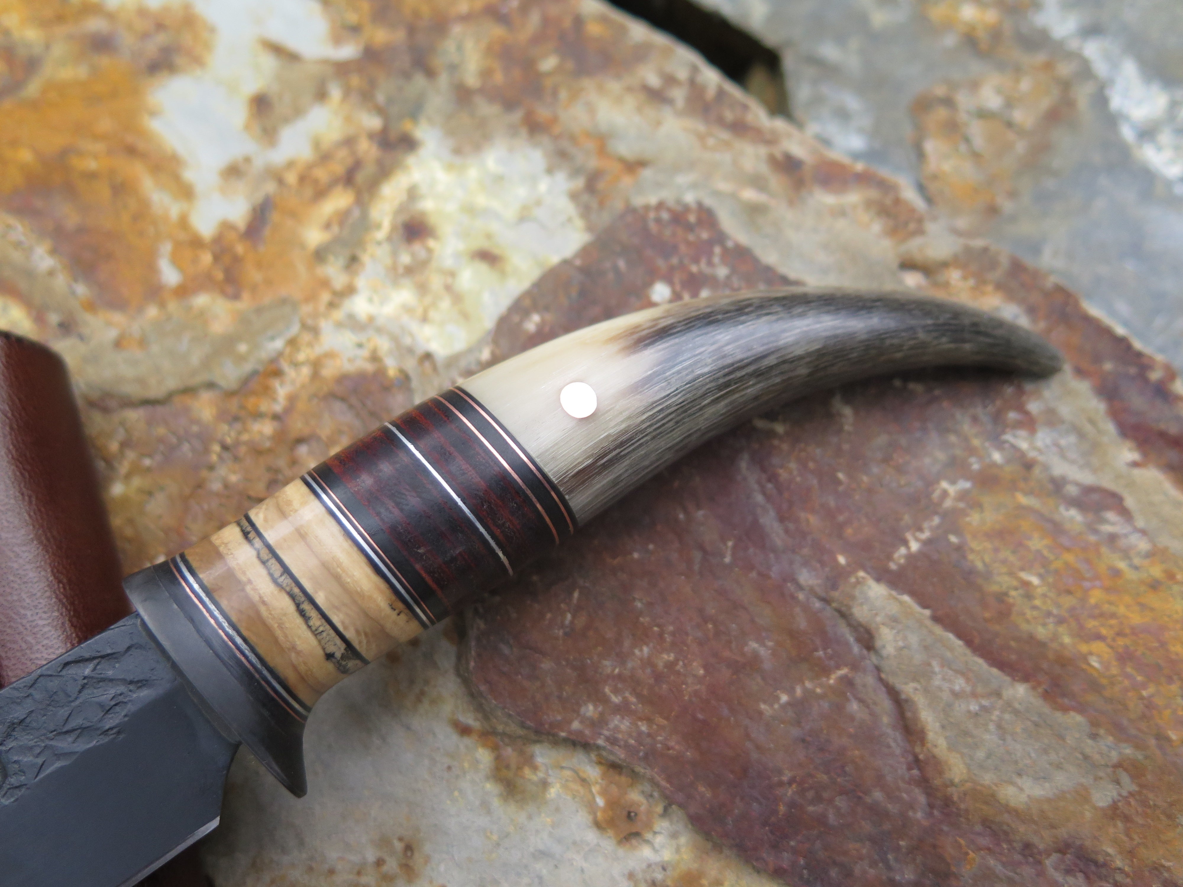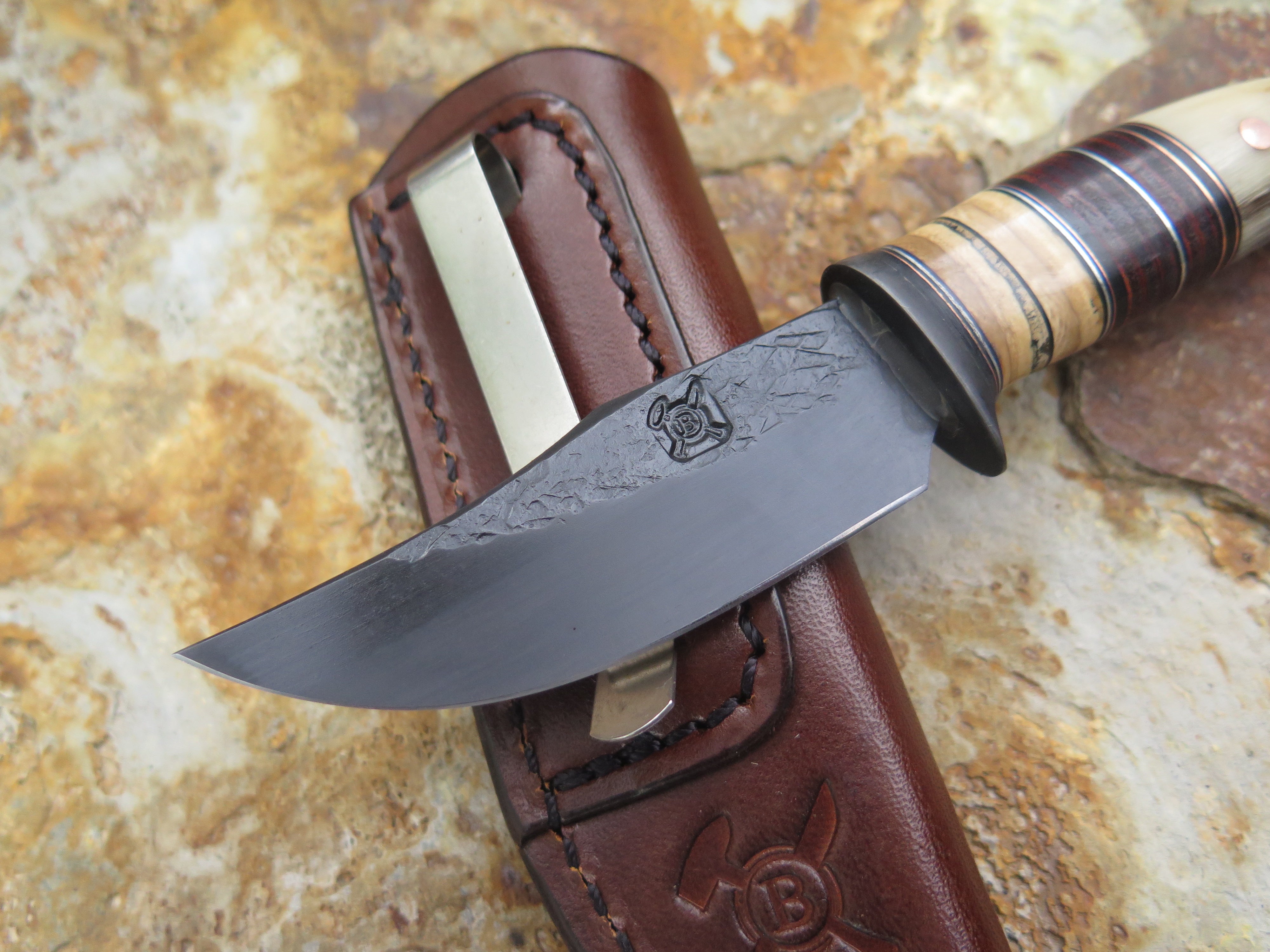 This beautiful new Pocket from Behring Made© is hand forged from 1/8" thick high carbon 01 tool steel and it measures 3" from tip to guard with a razor sharp hollow grind, hammermarks and our forced patina blued finish. The blued steel guard is soldered in place above black fiber, copper, aluminum, mammoth ivory and horsehide leather spacers in addition to the premium musk ox tine handle that's pinned through the tang with copper. The overall length measures 7 1/4" and it comes in a clip sheath designed to right in the right hand pocket of your britches.