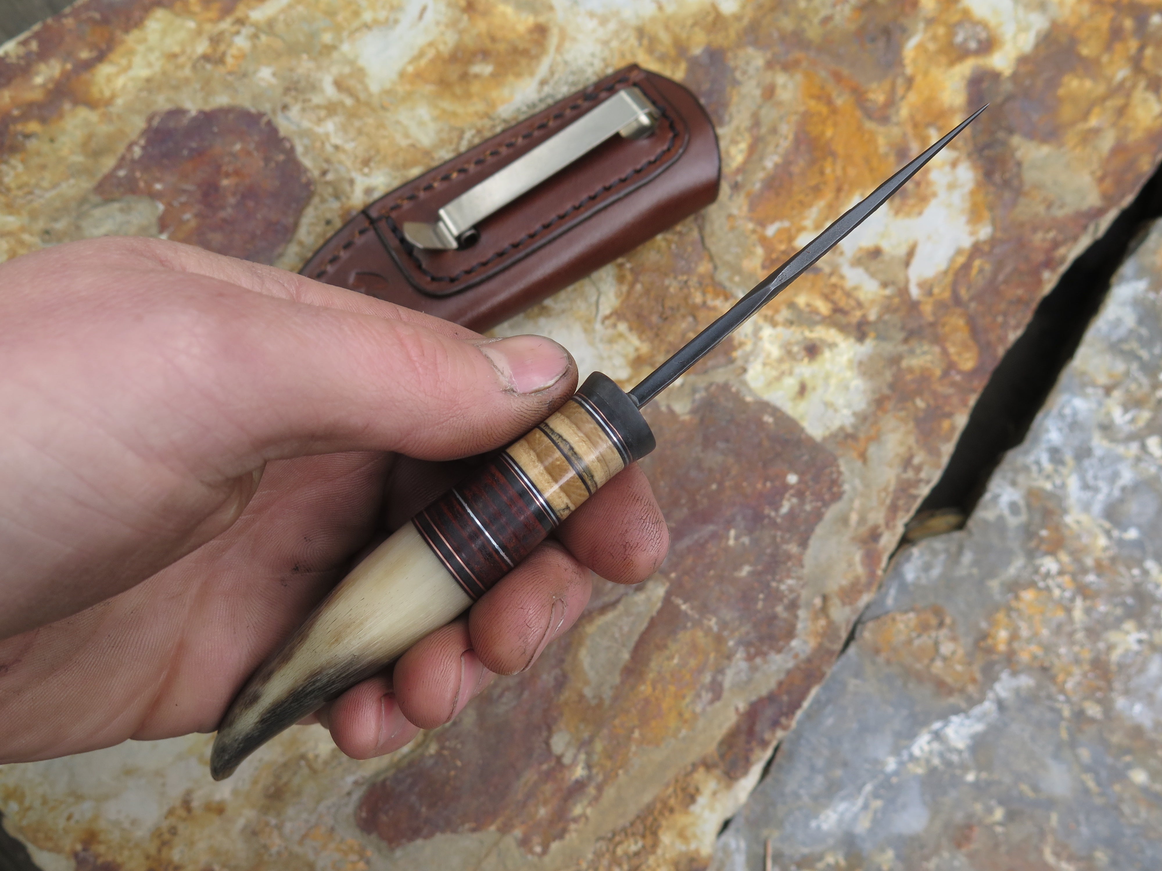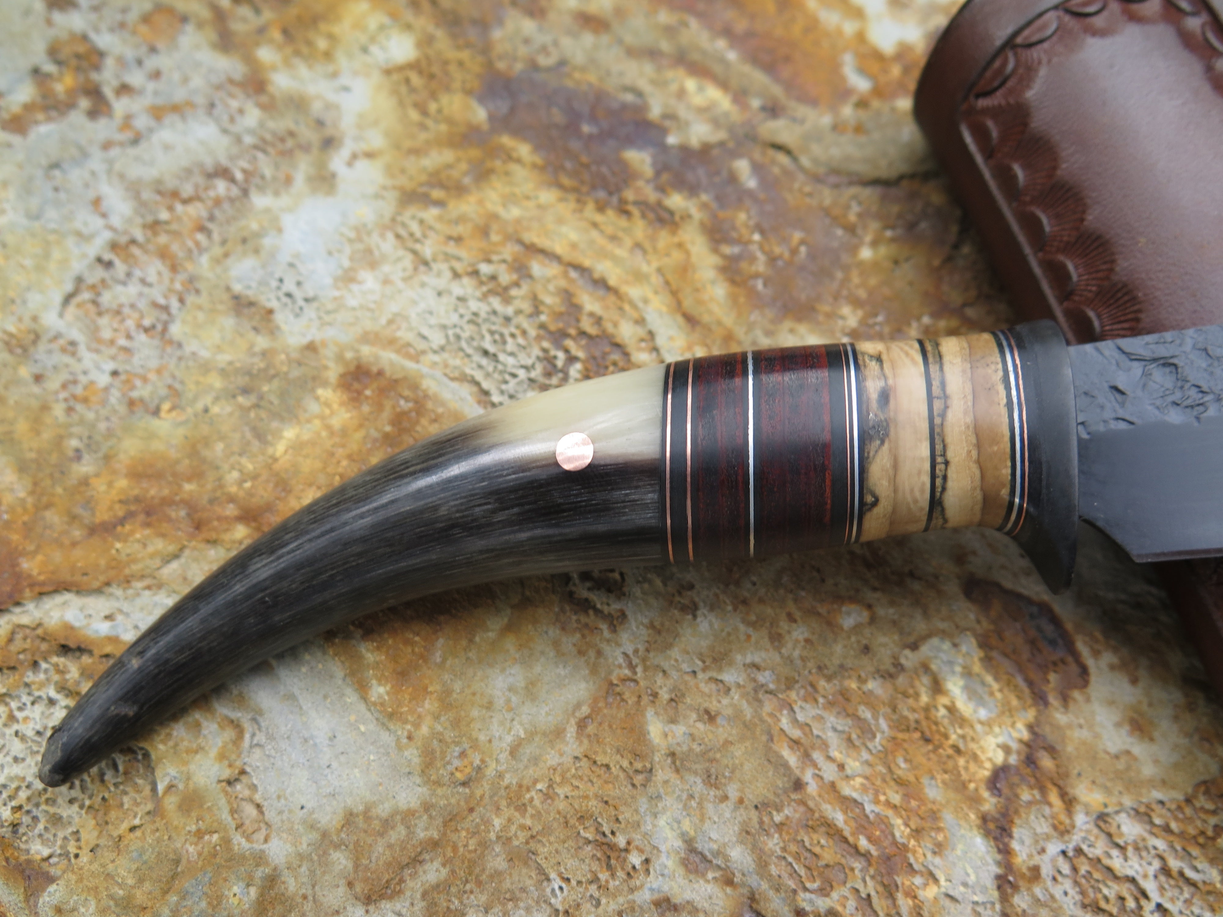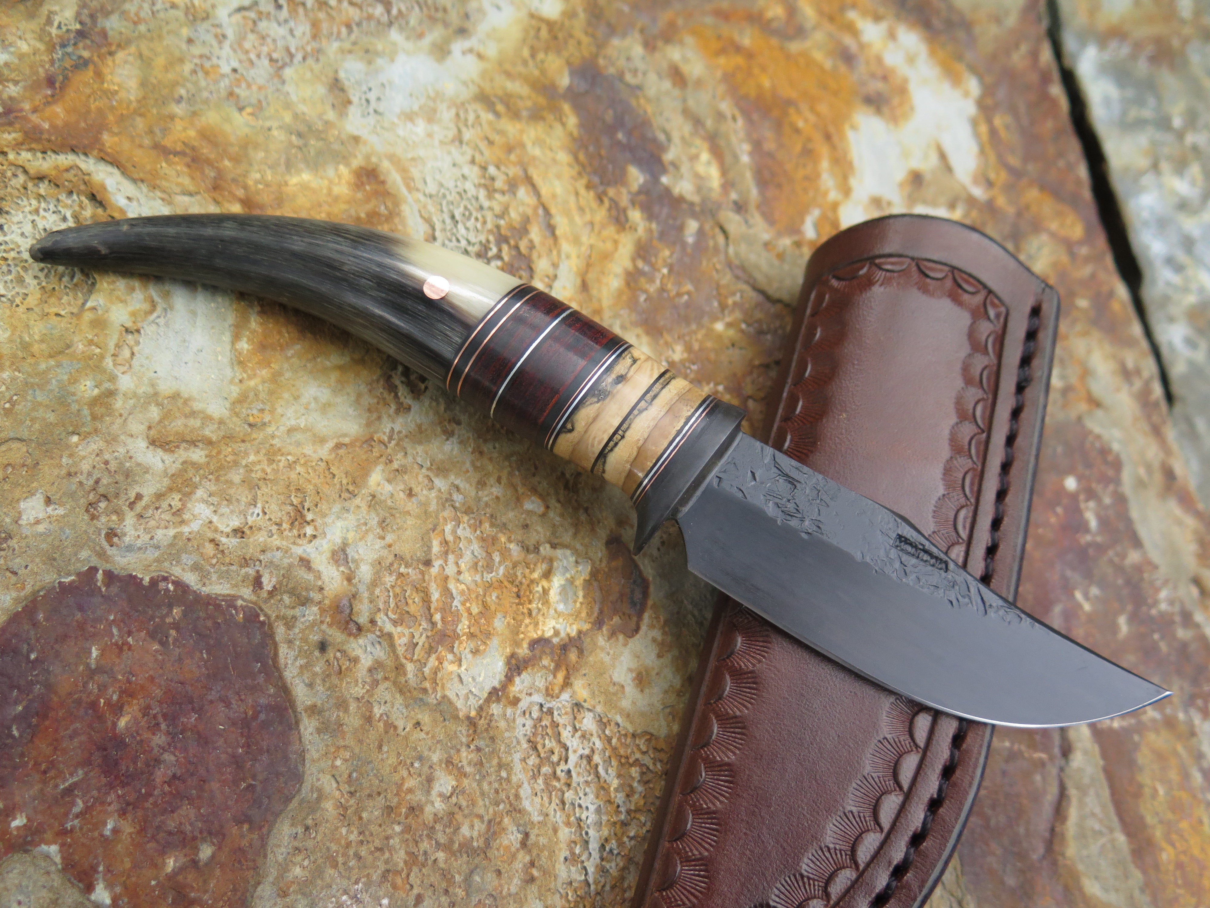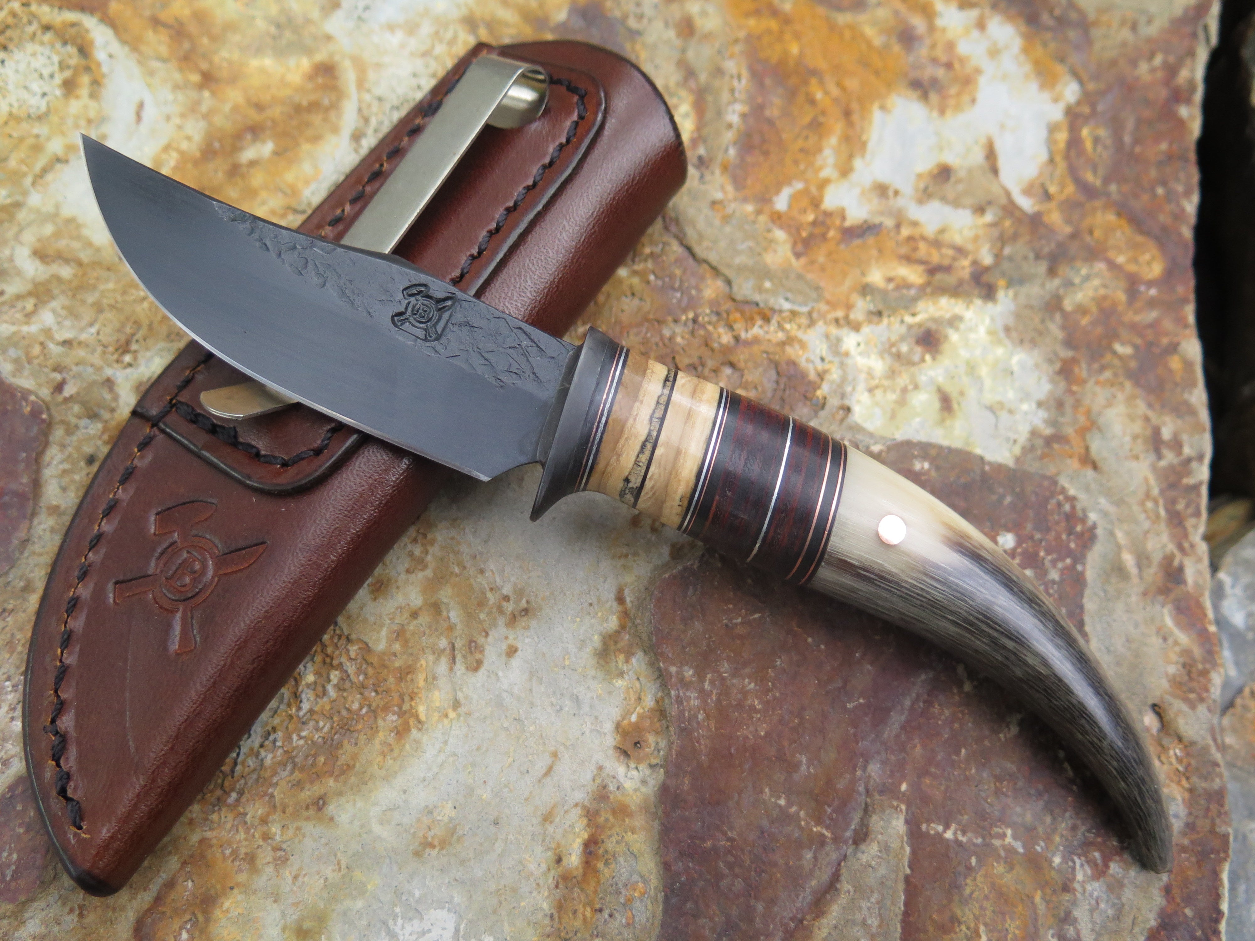 This beautiful new Pocket from Behring Made© is hand forged from 1/8" thick high carbon 01 tool steel and it measures 3" from tip to guard with a razor sharp hollow grind, hammermarks and our forced patina blued finish. The blued steel guard is soldered in place above black fiber, copper, aluminum, mammoth ivory and horsehide leather spacers in addition to the premium musk ox tine handle that's pinned through the tang with copper. The overall length measures 7 1/4" and it comes in a clip sheath designed to right in the right hand pocket of your britches.