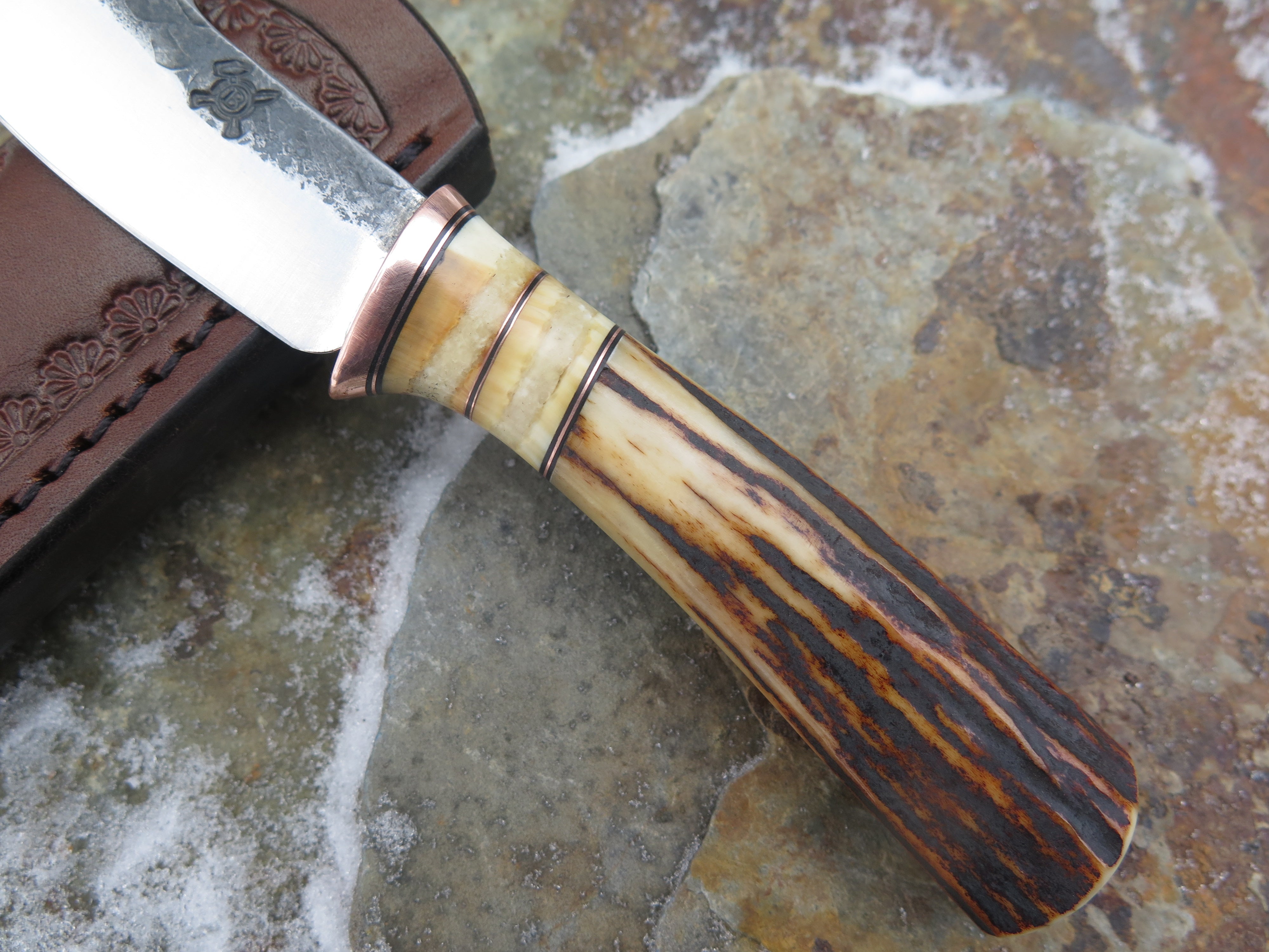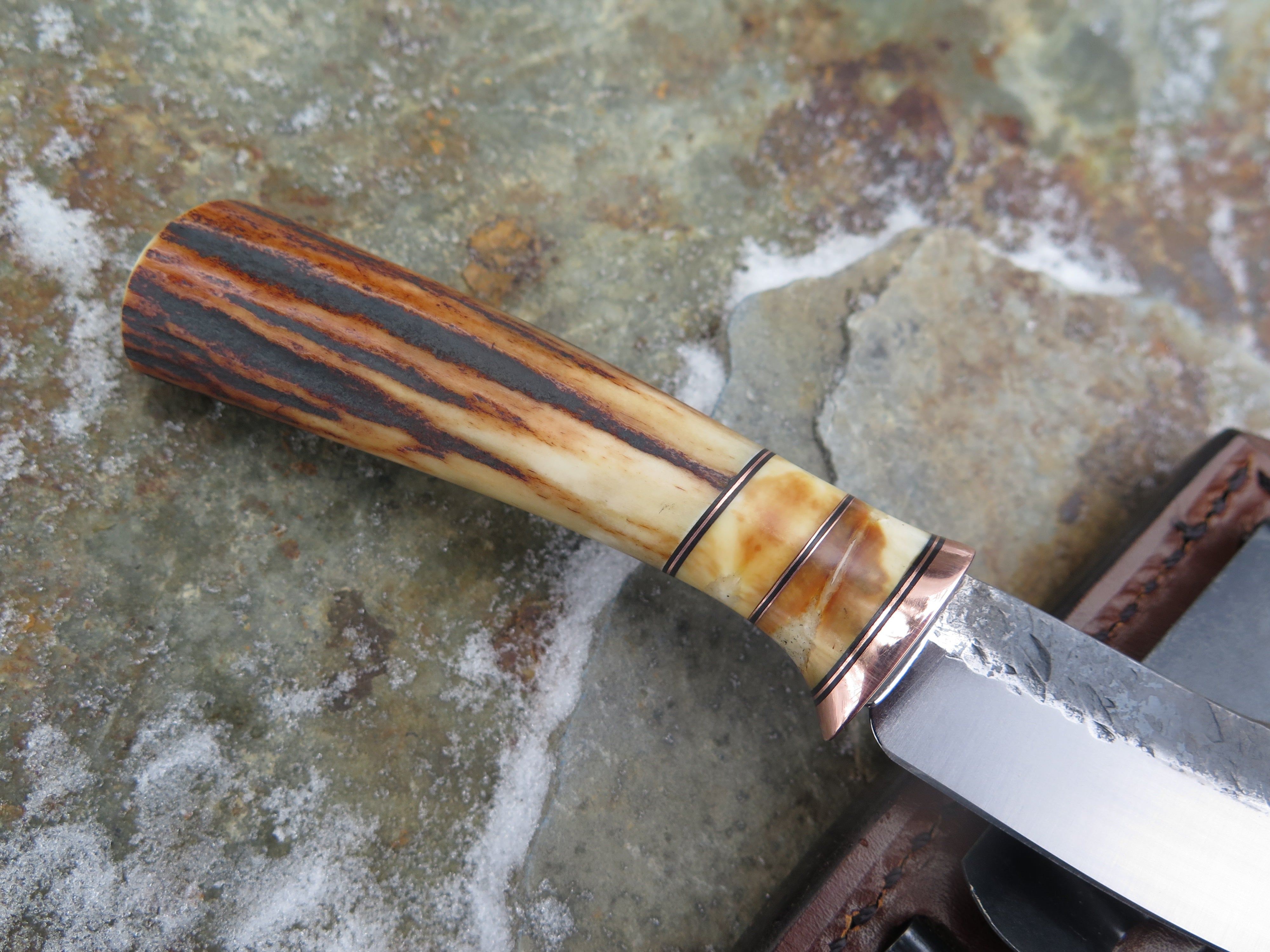This new Behring Made© Woodcraft pocket is hand forged from 1/8” 01 tool steel and measures 3” from tip to guard with a razor sharp hollow grind and our hammermark finish. A copper guard is soldered in place over black, copper and walrus spacers with a premium stag handle and warlander leather clip pocket sheath. Overall measures 6 5/8” and we guarantee this one for life, as always.