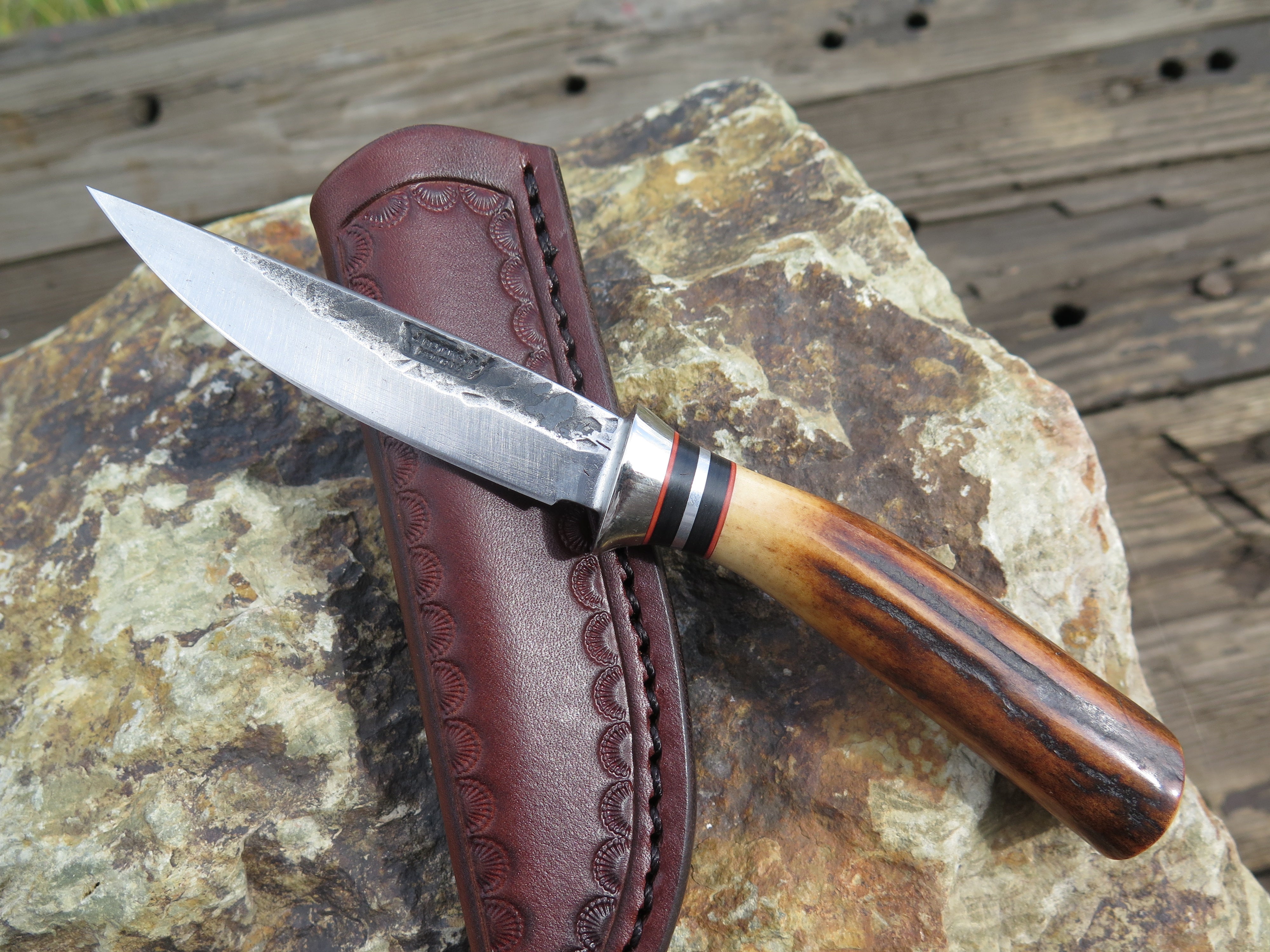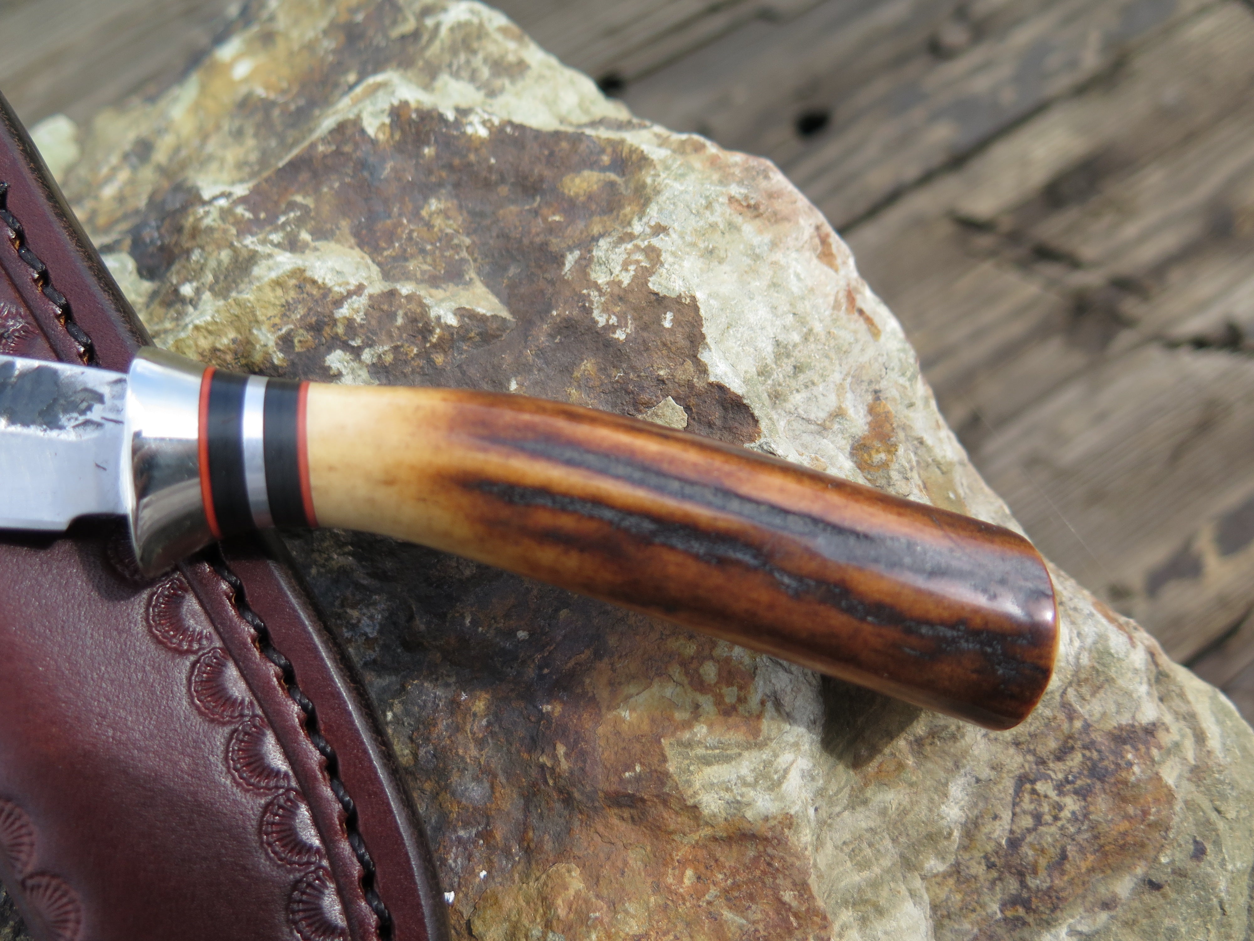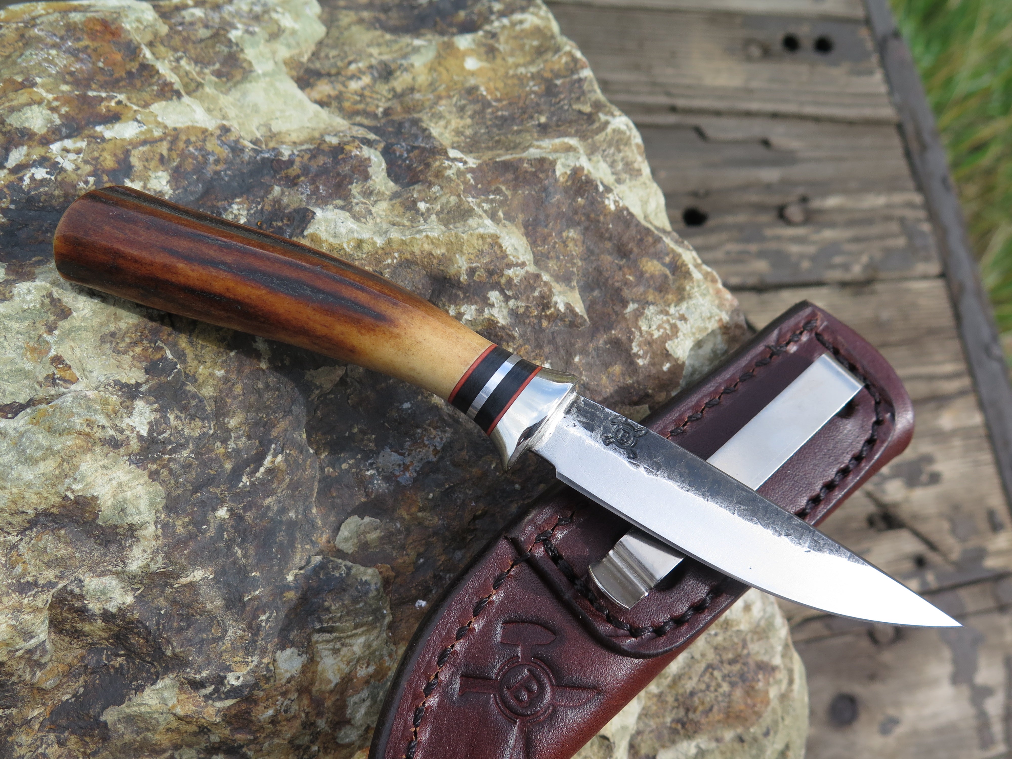 This beautiful new Pocket Knife from Behring Made© is hand forged from 1/8" thick high carbon 01 tool steel and it measures just shy of 3 1/4" from tip to guard with a razor sharp hollow grind and our hammermark finish. The nickel silver guard is soldered in place above black and maroon fiber and aluminum spacers which offer a classic transition to the premium sambar stag handle. The overall length measures 6 5/8" and it comes in a Warlander Leather pocket clip sheath designed to wear in the right hand pocket of your jeans.