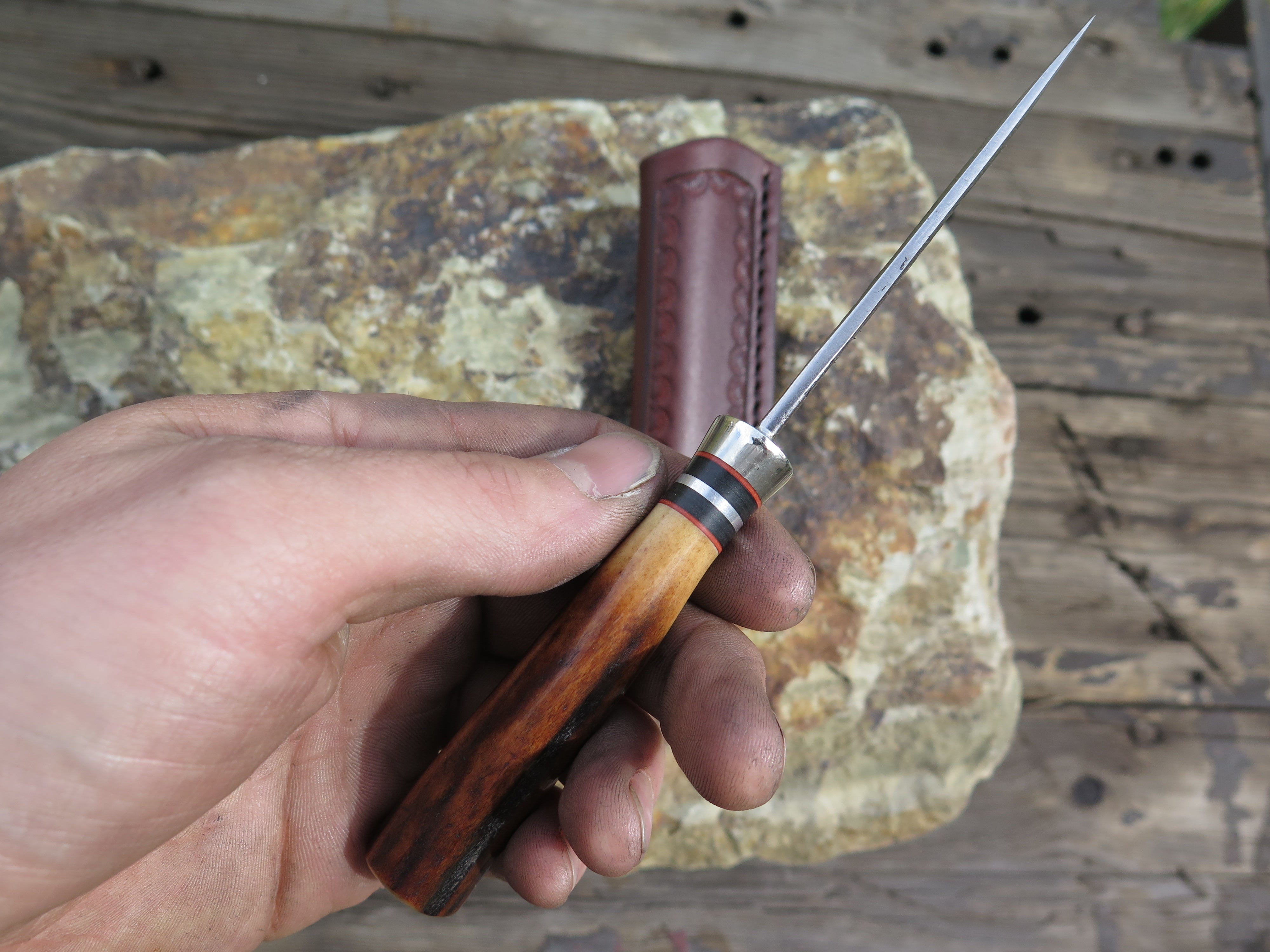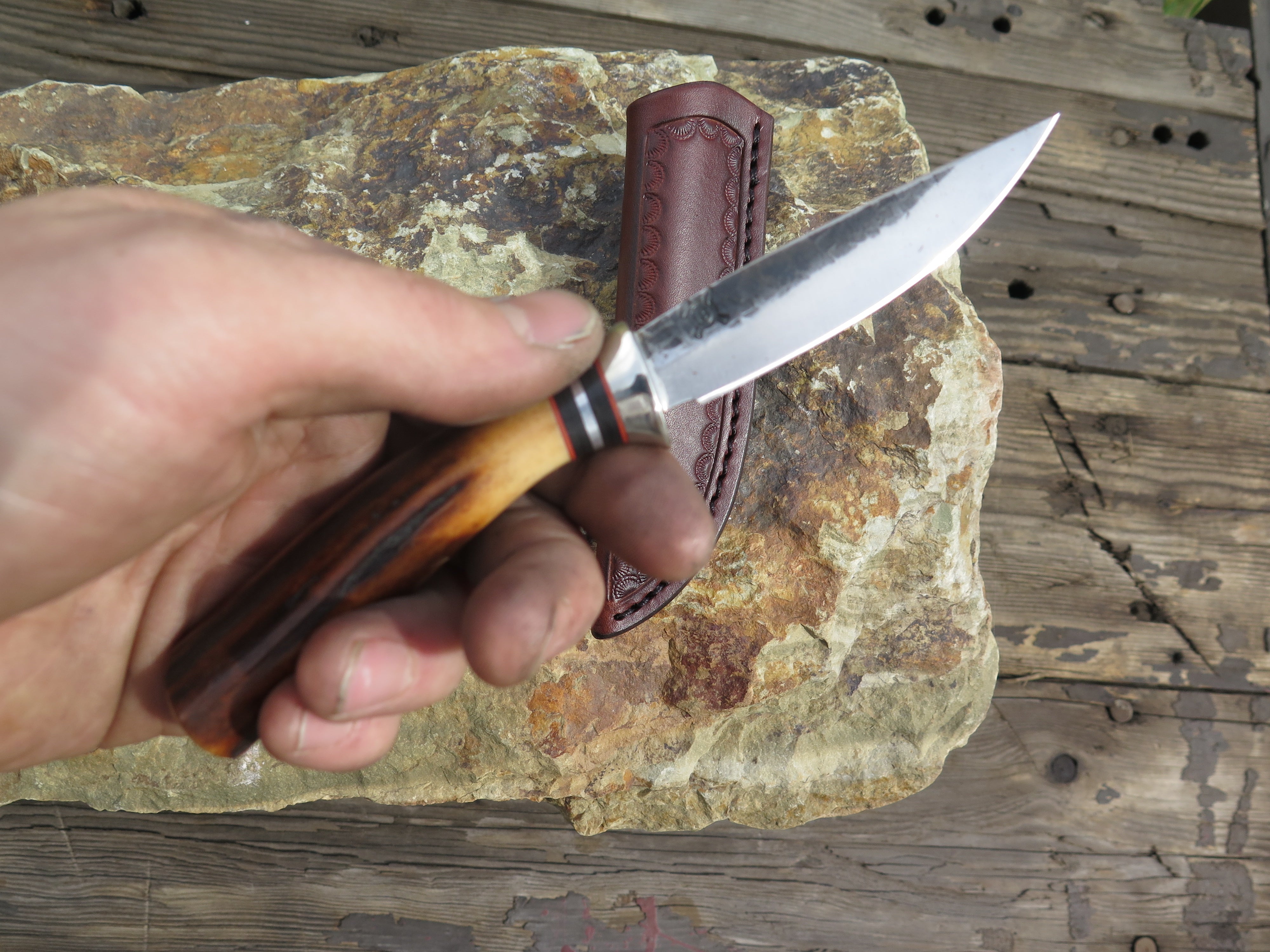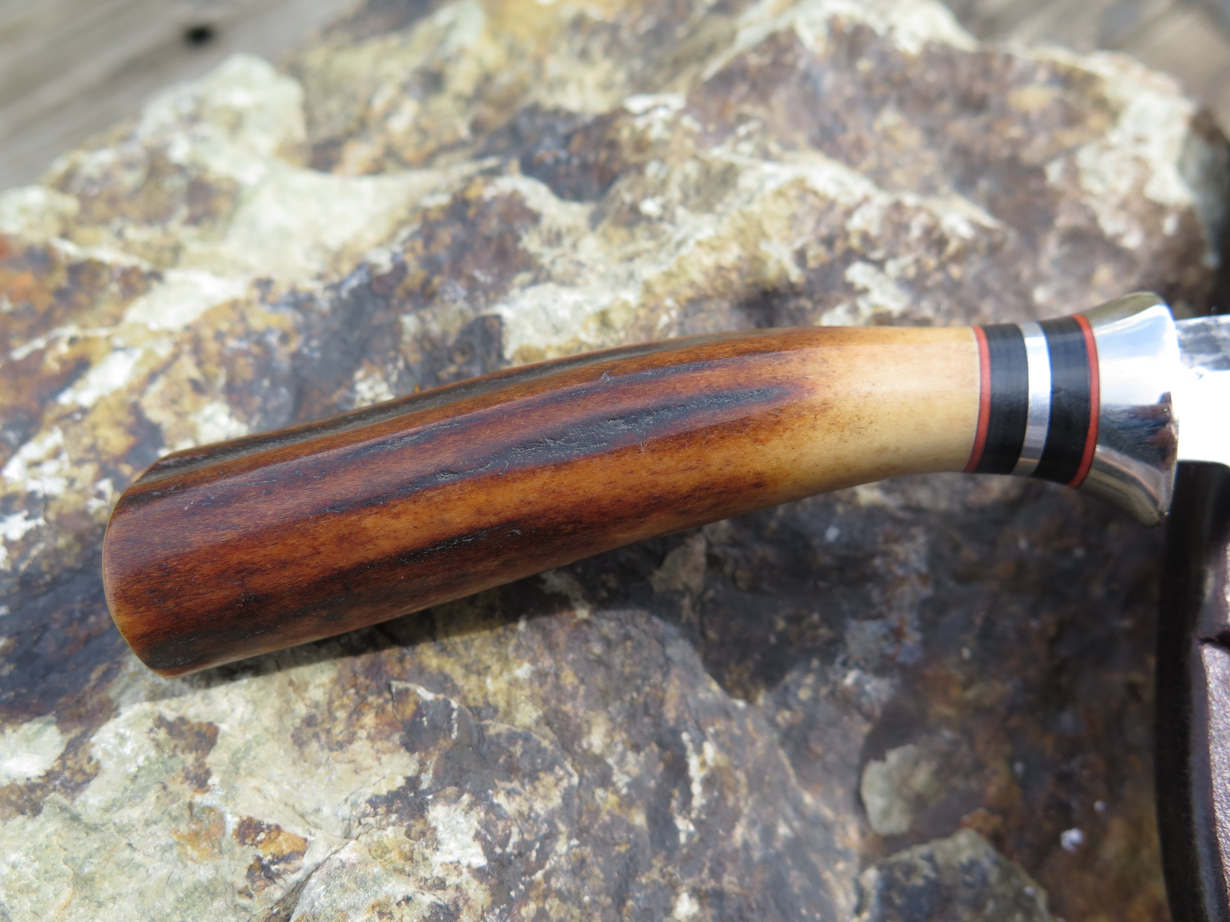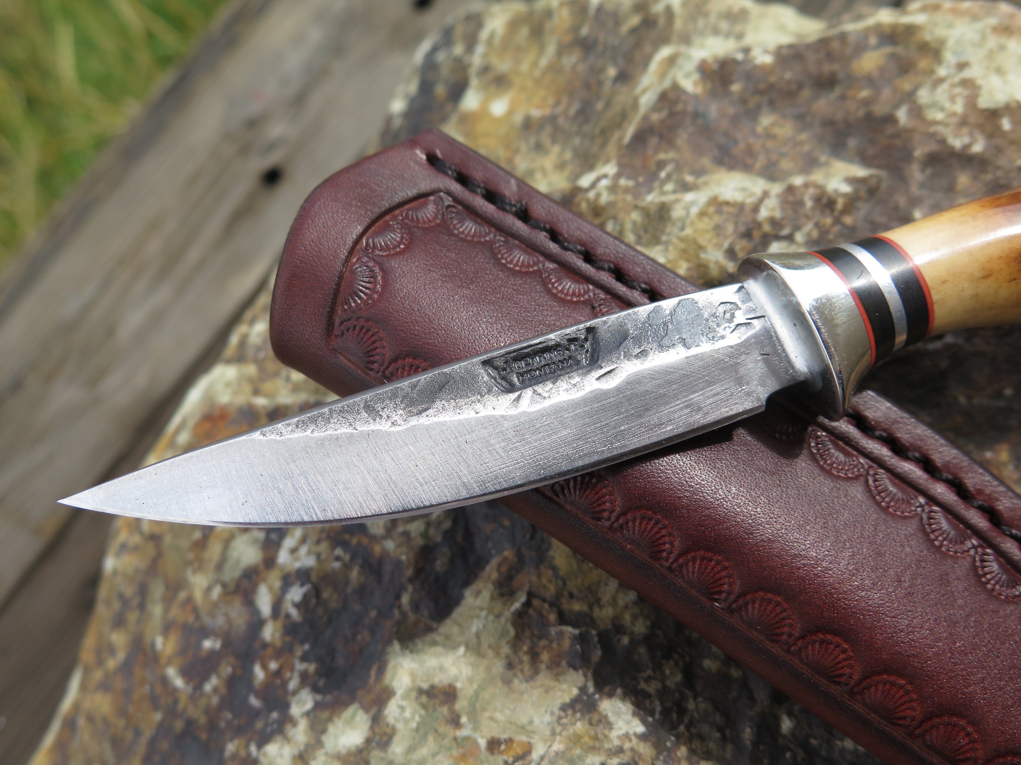 This beautiful new Pocket Knife from Behring Made© is hand forged from 1/8" thick high carbon 01 tool steel and it measures just shy of 3 1/4" from tip to guard with a razor sharp hollow grind and our hammermark finish. The nickel silver guard is soldered in place above black and maroon fiber and aluminum spacers which offer a classic transition to the premium sambar stag handle. The overall length measures 6 5/8" and it comes in a Warlander Leather pocket clip sheath designed to wear in the right hand pocket of your jeans.