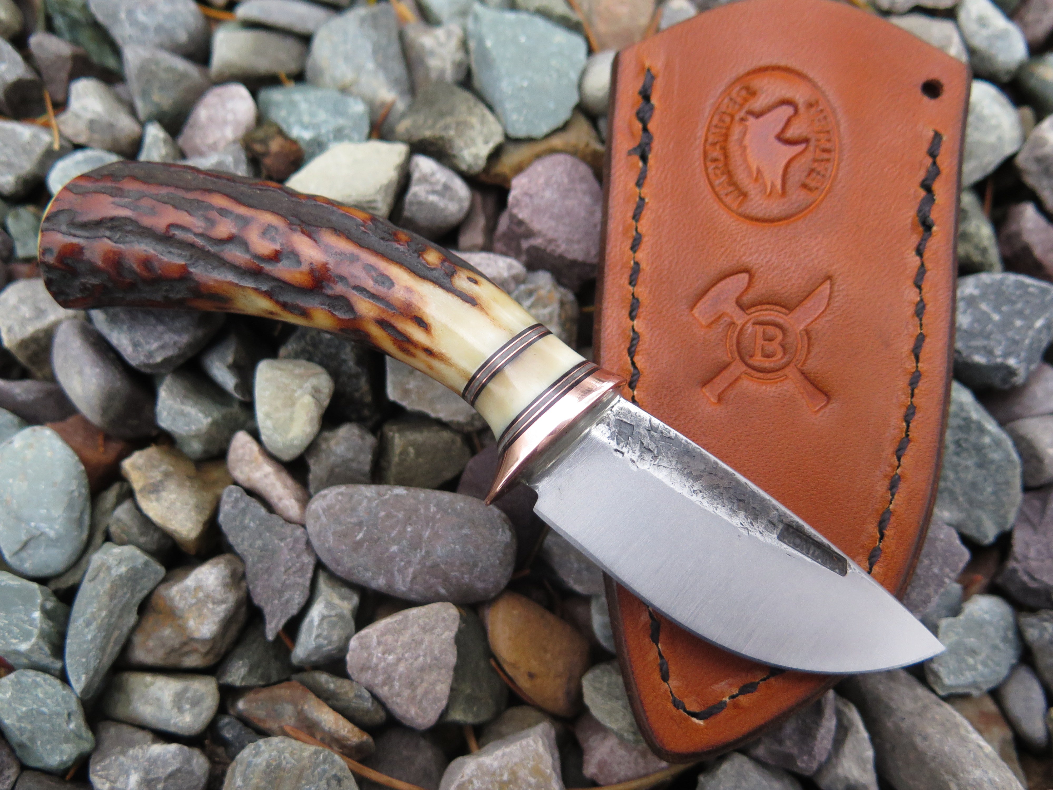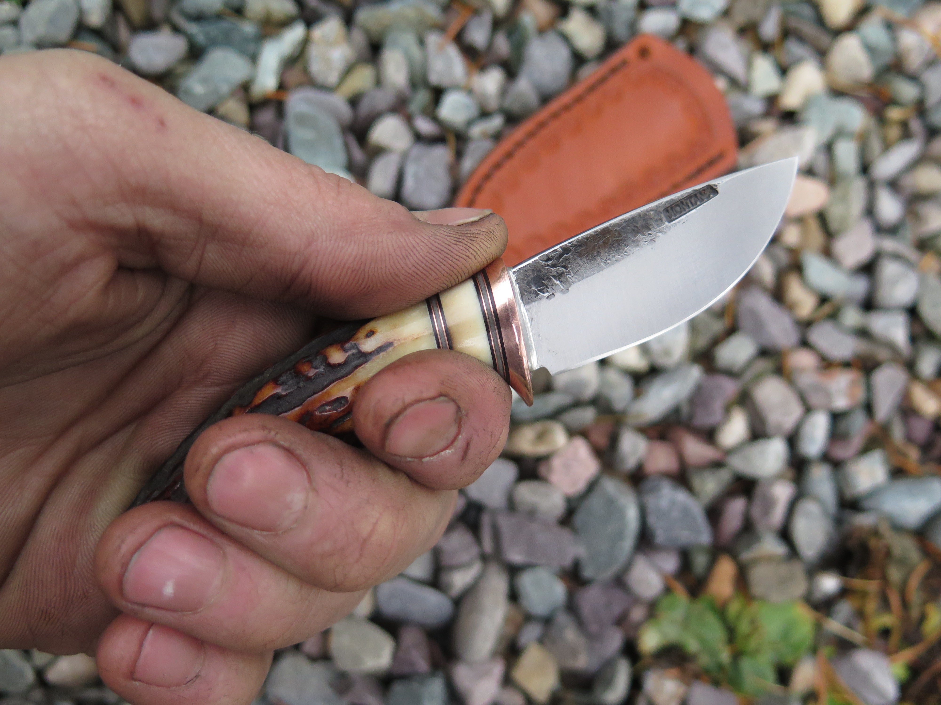 This new 5th pocket from Behring Made© is hand forged from 1/8" thick high carbon 01 tool steel and it measures 2" from tip to guard with a razor sharp hollow grind and our hammermark finish. The copper guard is soldered in place above black and grey fiber, copper and fossil walrus ivory spacers with a beautiful sambar stag handle as well. The overall length measures 5" and it comes in a simple 5th pocket leather sleeve.