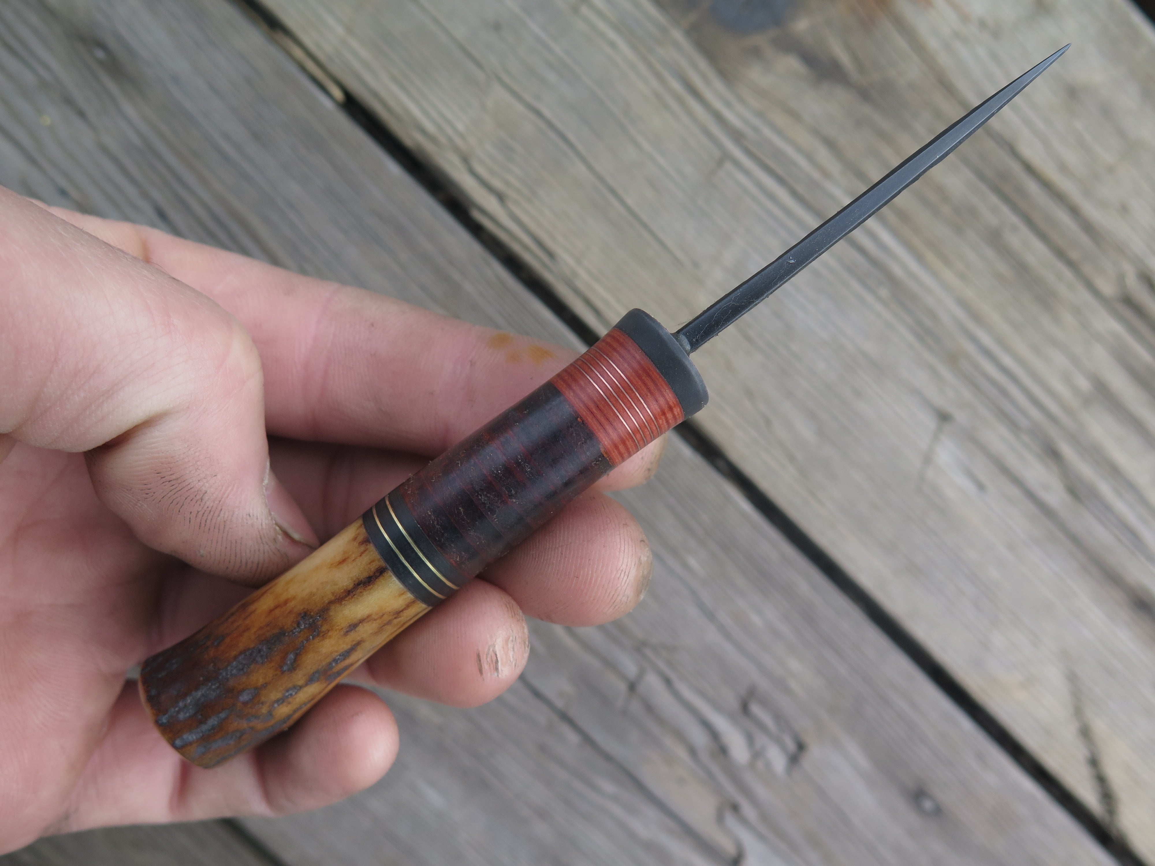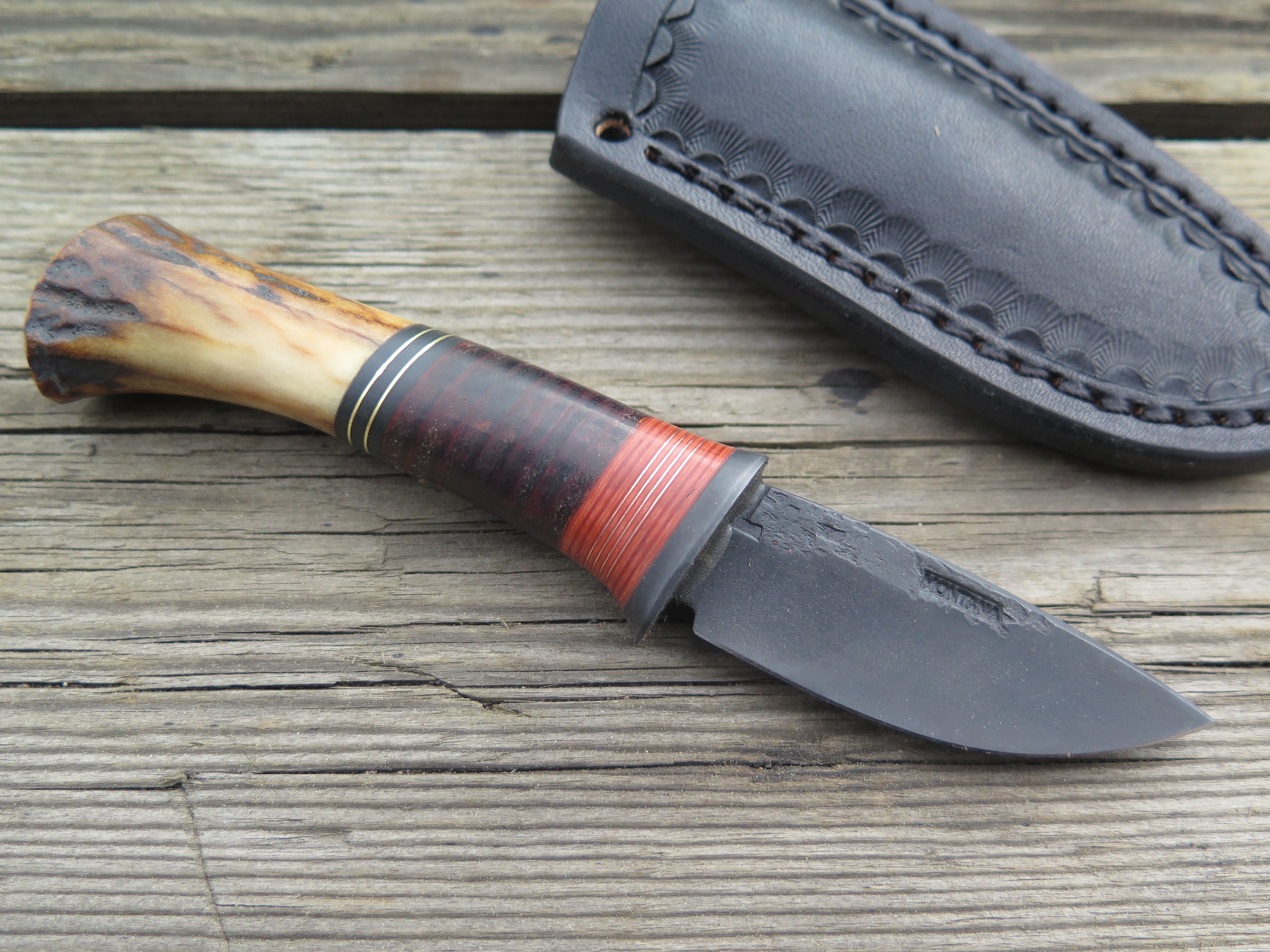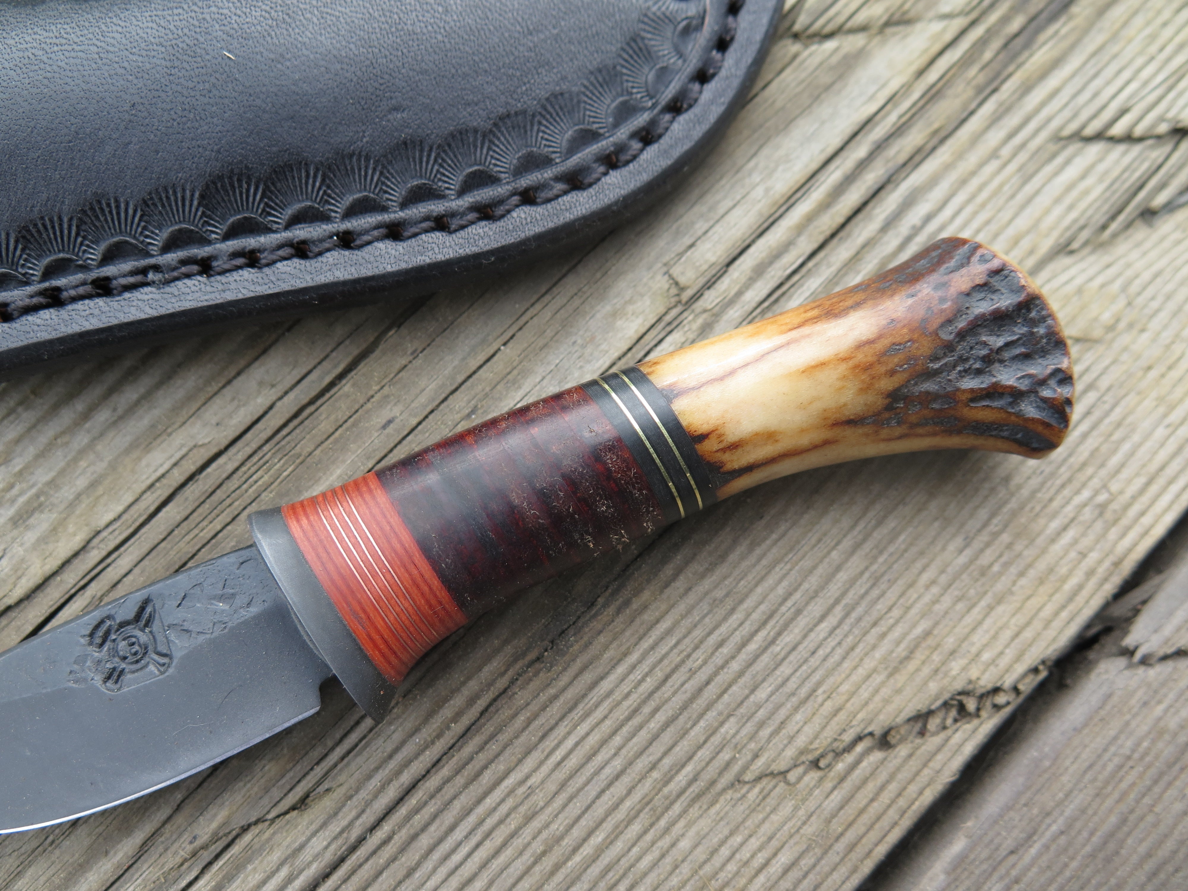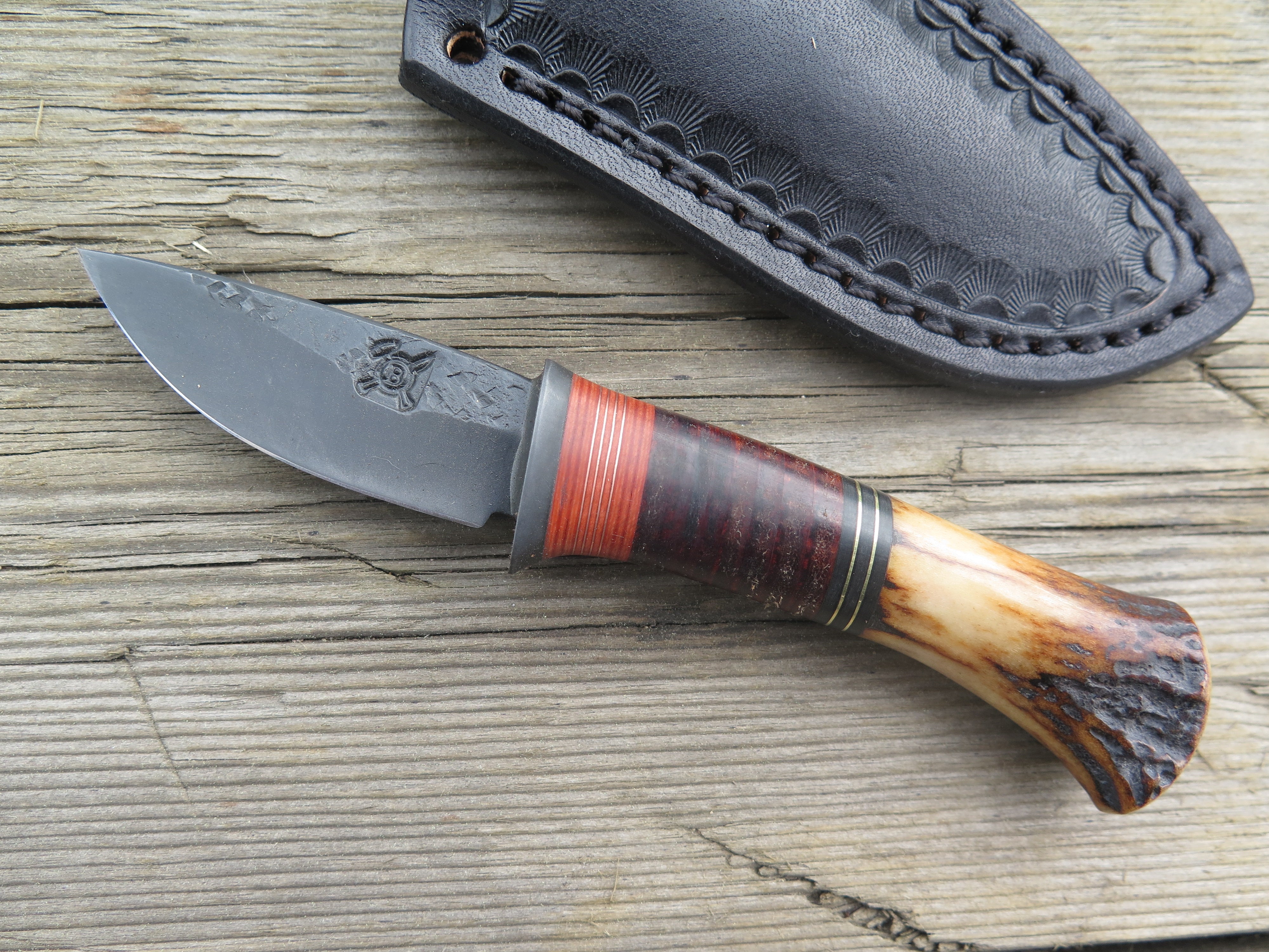 This bad ass new 5th pocket from Behring Made© is hand forged from 1/8" thick high carbon 01 tool steel and it measures 2 1/4" from tip to guard with a razor sharp hollow grind, hammermarks and our forced patina blued finish. The blued steel guard is soldered in place above black and maroon fiber, copper, brass and horsehide leather spacers as well as a premium sambar stag butt. The overall length measures 5 1/4" and it comes in a simple 5th pocket leather sleeve.