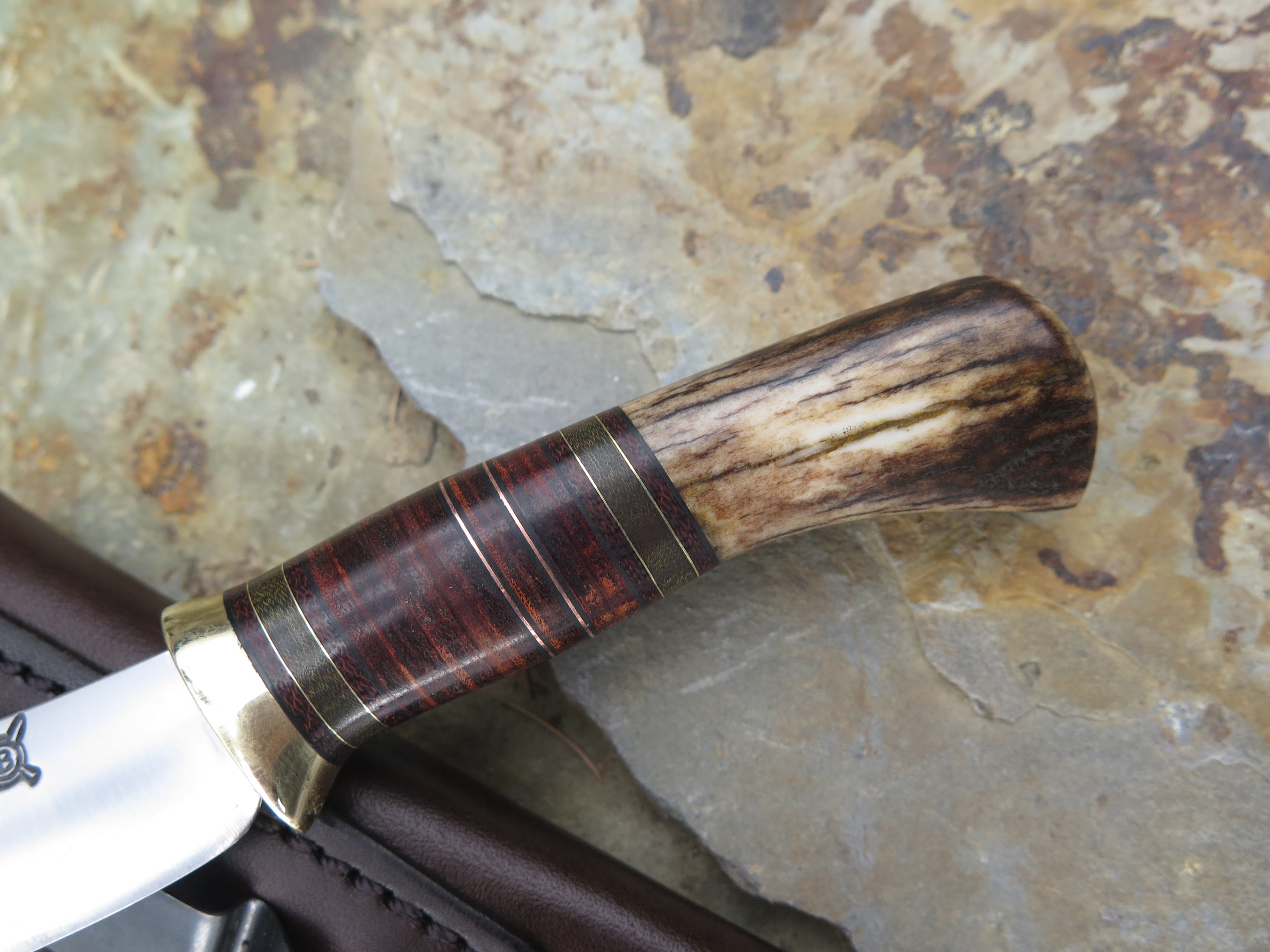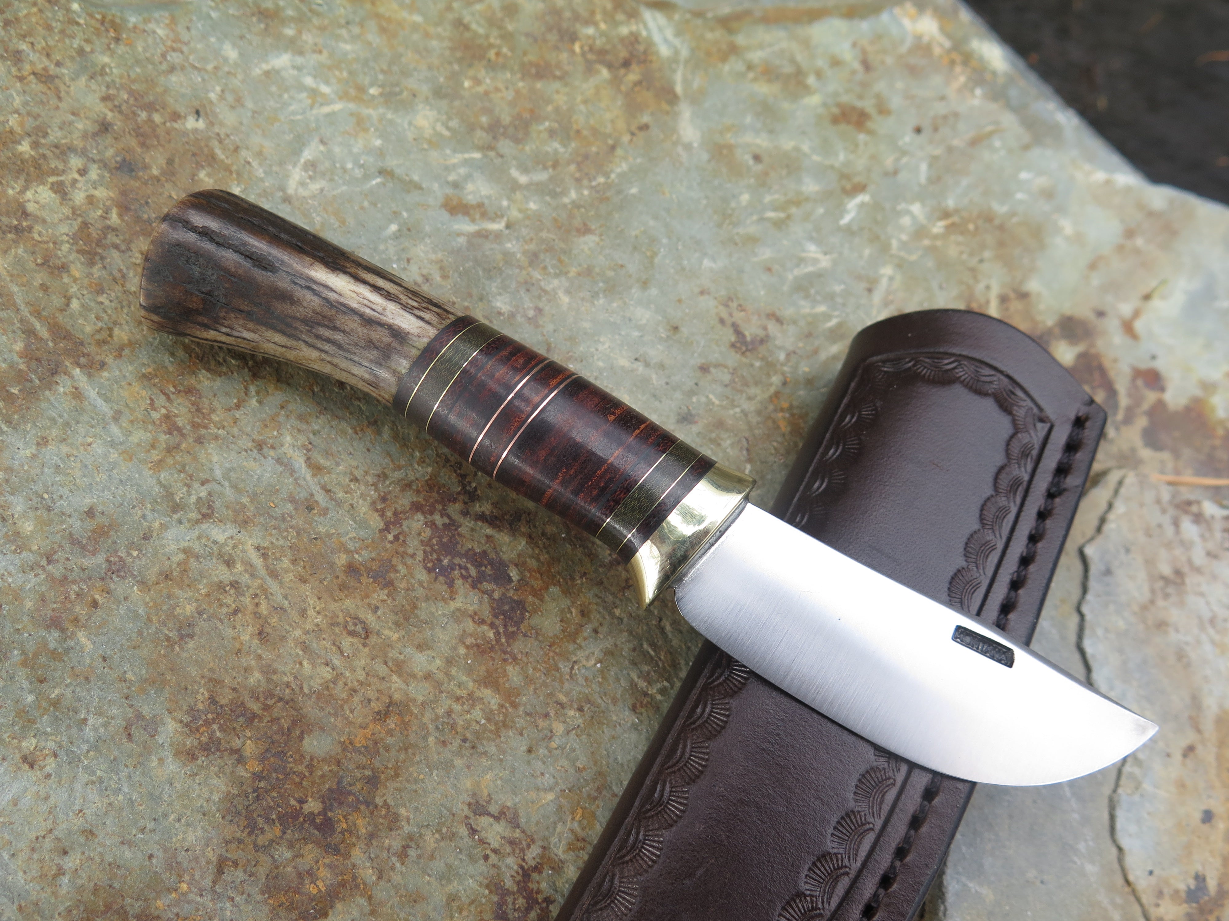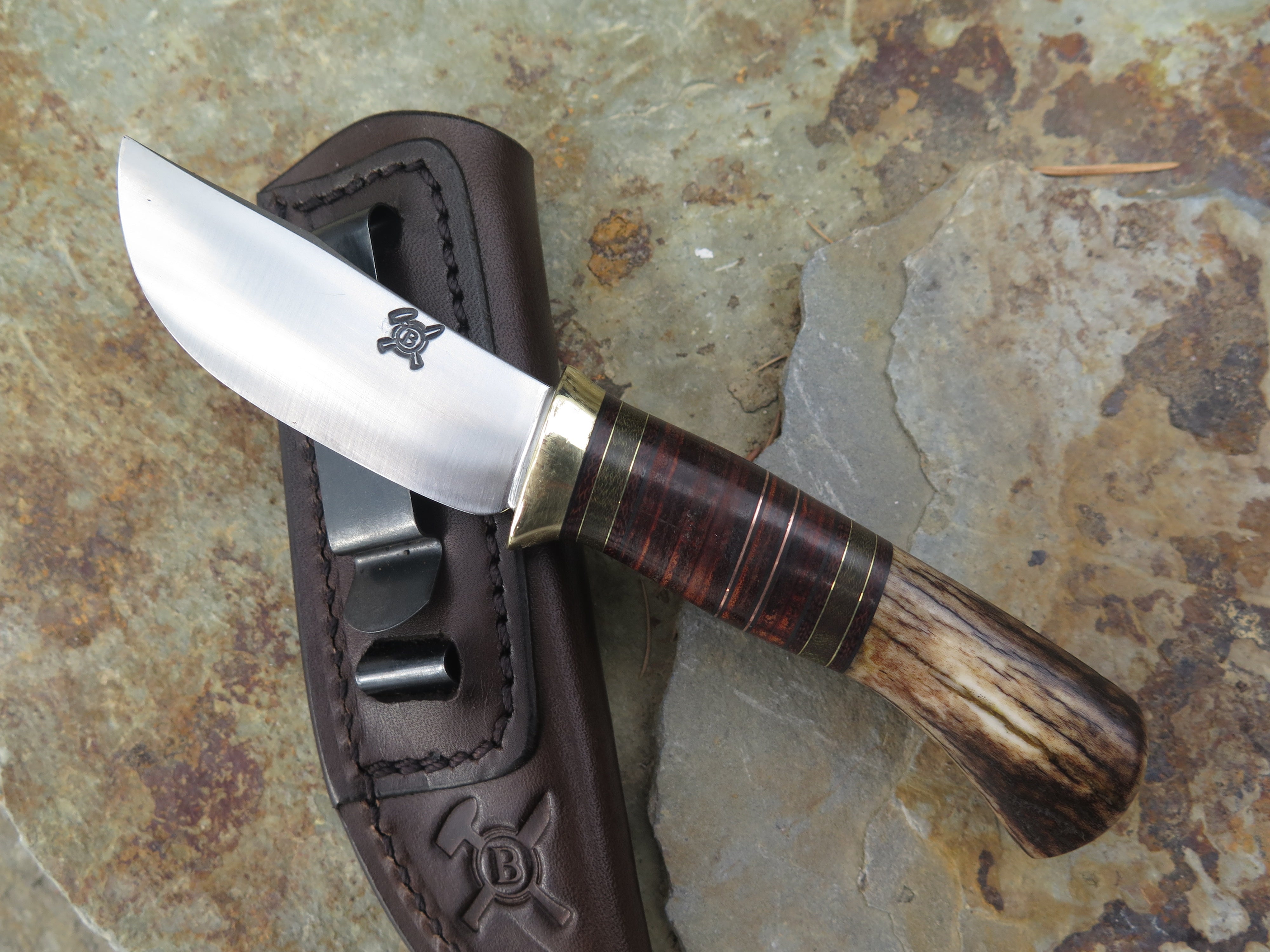 This new Behring Made© Pocket knife is hand forged from 1/8" thick high carbon 01 tool steel and it measures 2 3/4" from tip to guard with a razor sharp convex grind. The brass guard is soldered in place above black fiber, brown and green micarta, horsehide, copper and brass spacers with a whitetail stag butt that brings the overall length out to 6 1/4". This one comes in a right hand clip sheath, designed to ride in the pocket of your jeans.
