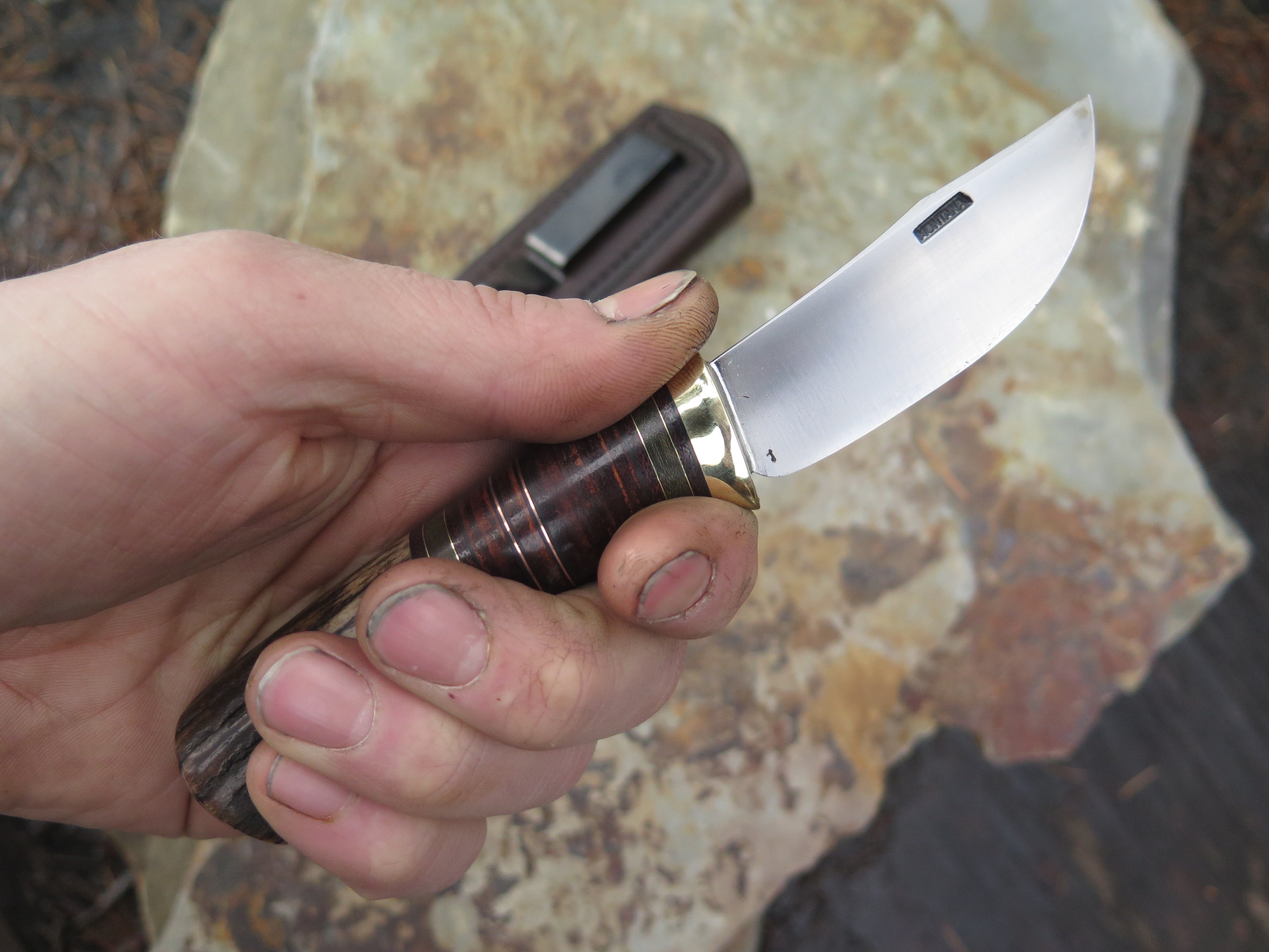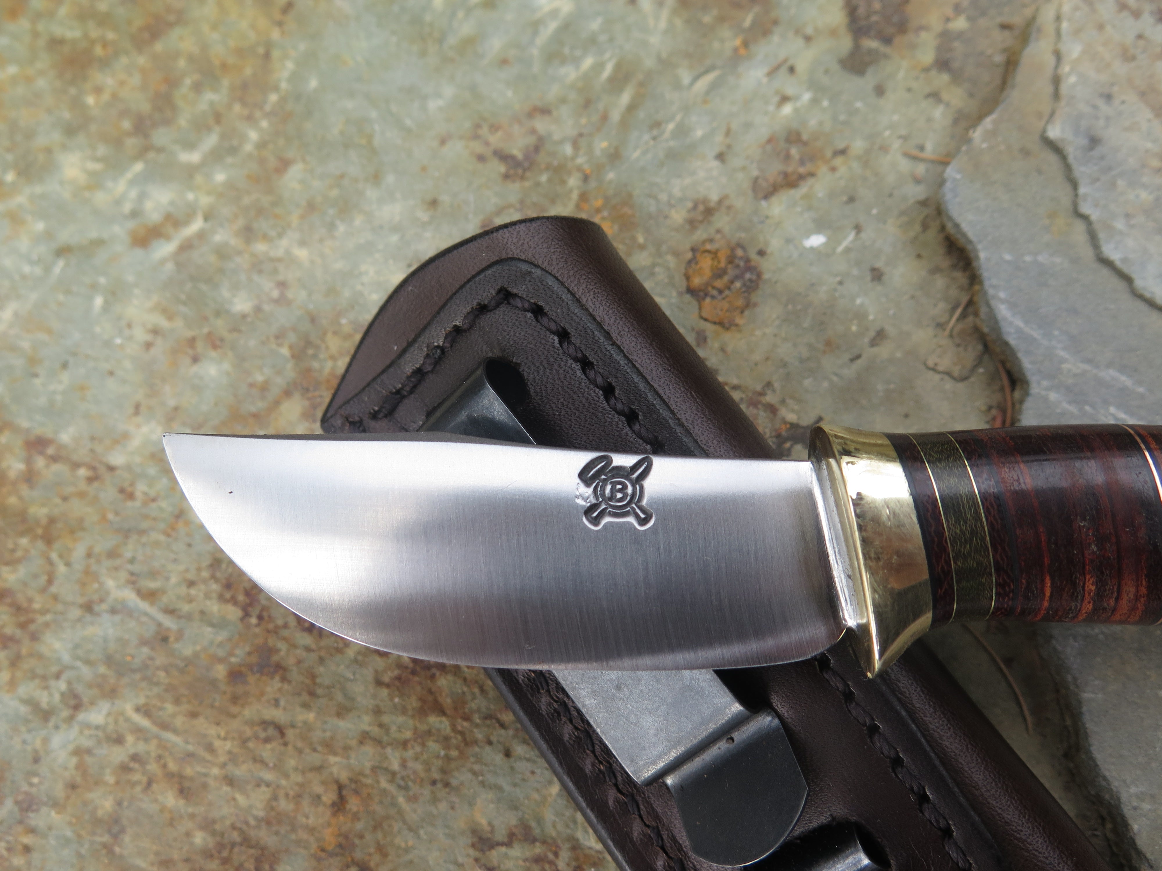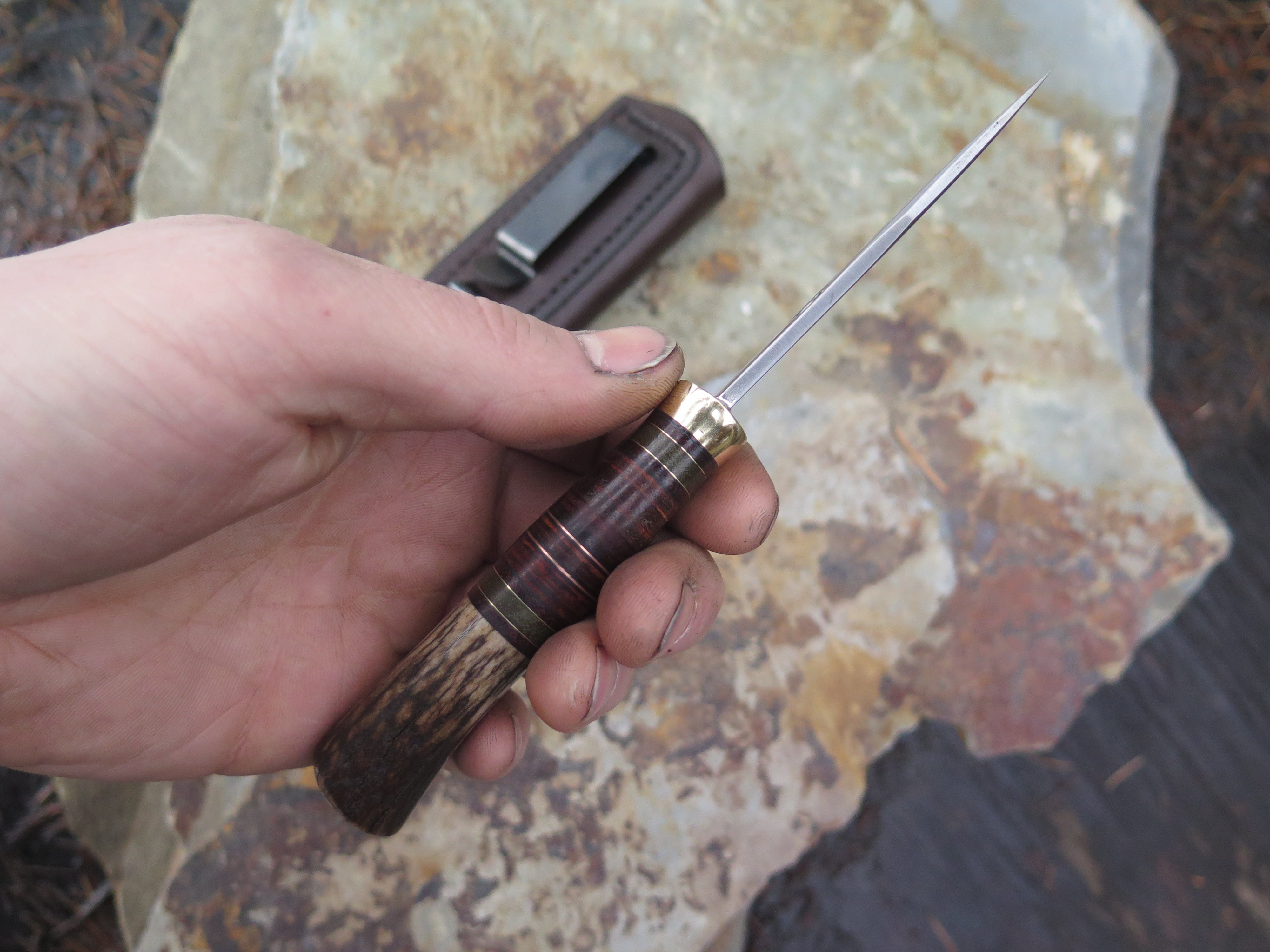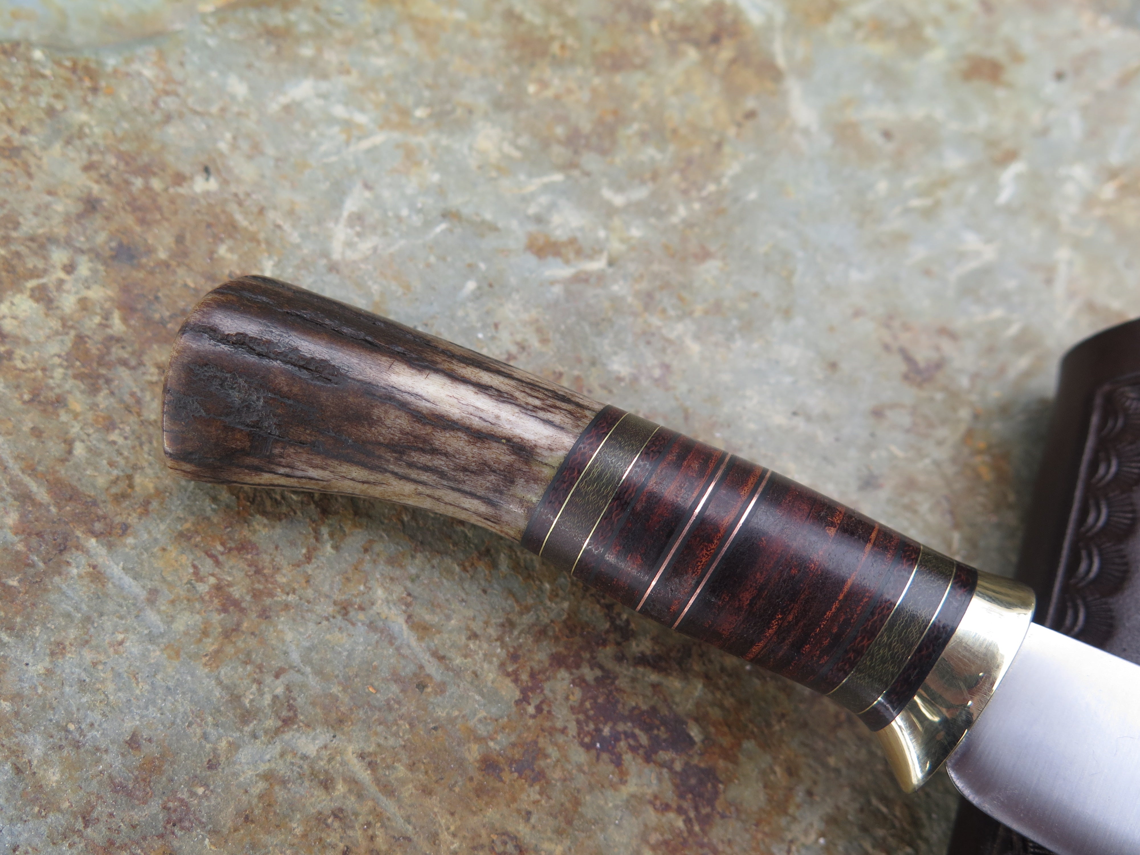 This new Behring Made© Pocket knife is hand forged from 1/8" thick high carbon 01 tool steel and it measures 2 3/4" from tip to guard with a razor sharp convex grind. The brass guard is soldered in place above black fiber, brown and green micarta, horsehide, copper and brass spacers with a whitetail stag butt that brings the overall length out to 6 1/4". This one comes in a right hand clip sheath, designed to ride in the pocket of your jeans.