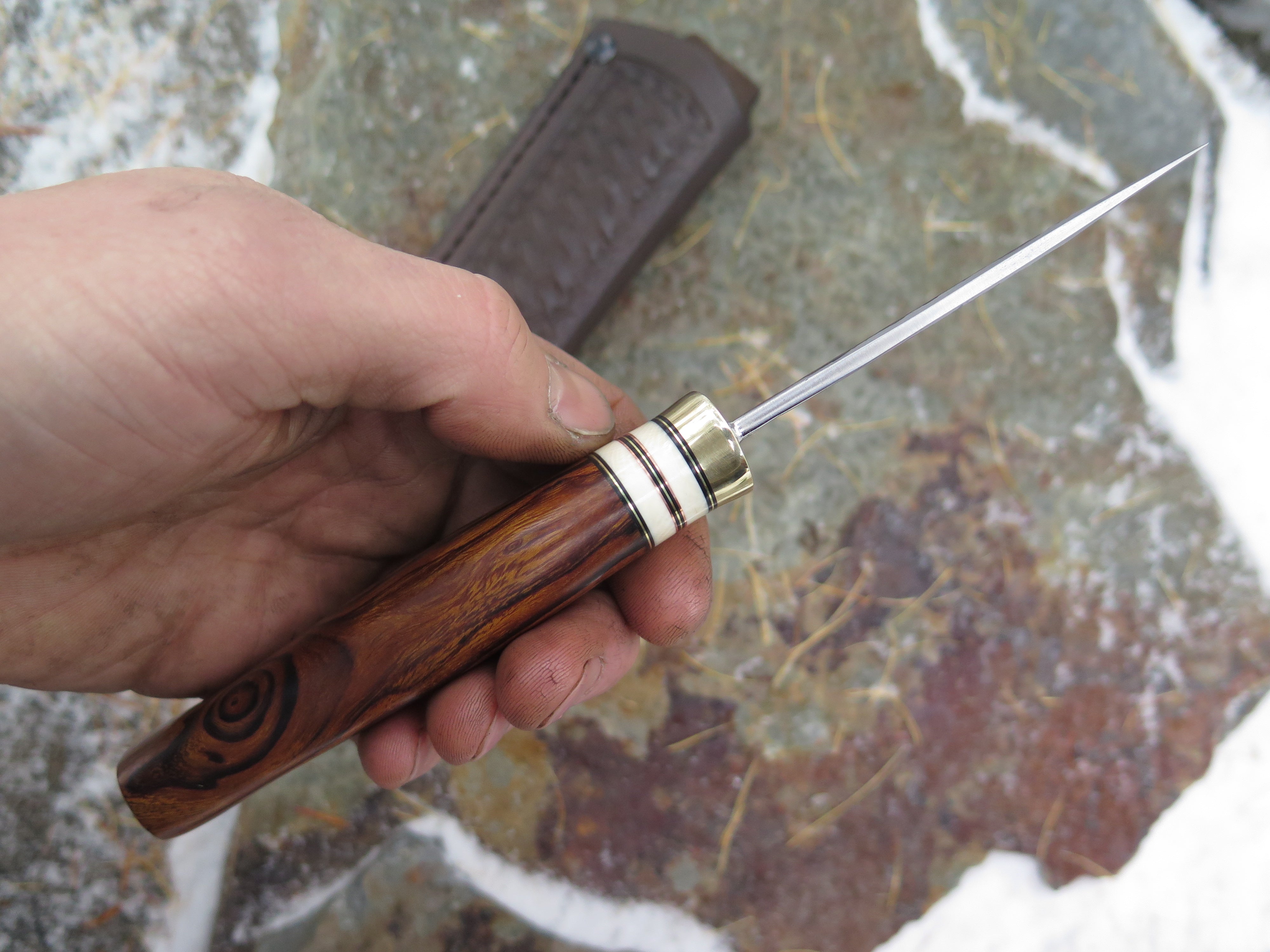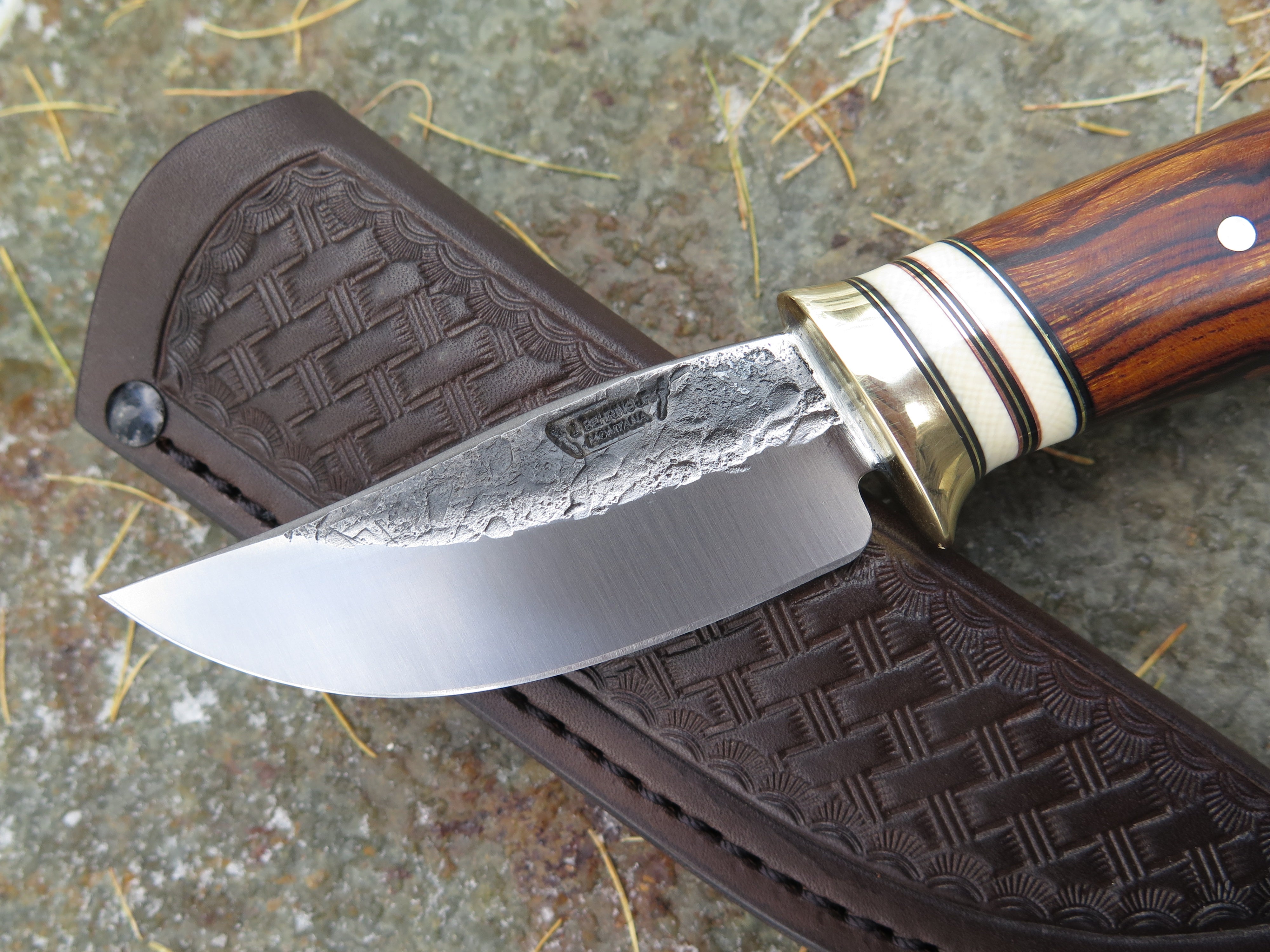 This beautiful new Sharptail from Behring Made© is hand forged from 1/8" thick high carbon 01 tool steel and measures 3 1/4" from tip to guard with a razor sharp hollow grind and our hammermark finish. The brass guard is soldered in place above black, brass, copper and two ancient mammoth ivory spacers as well as a  premium desert ironwood handle that is pinned through the tang with brass. The overall length measures 7" and it comes in the shown leather belt pouch sheath, though substitutions are available upon request.