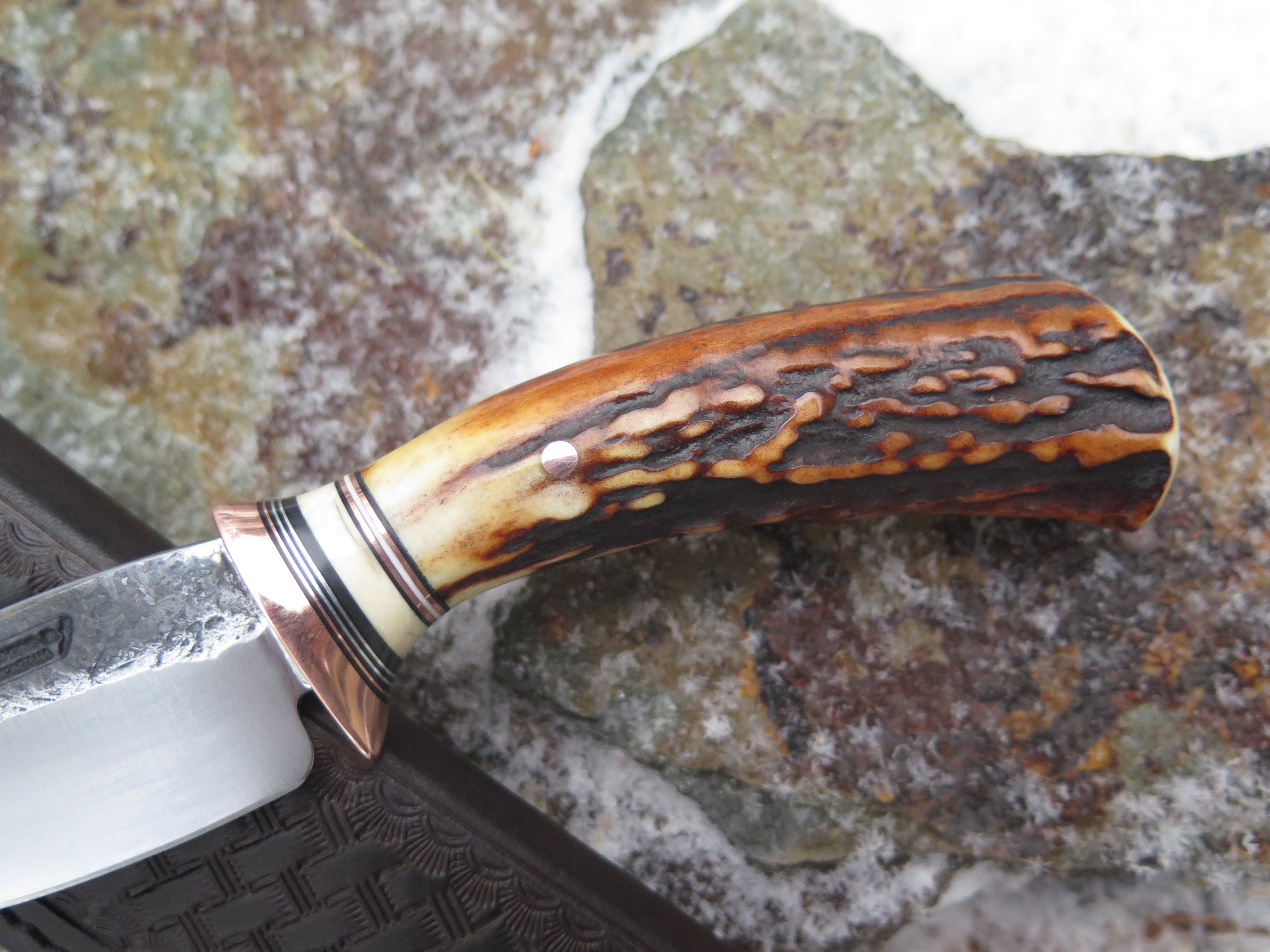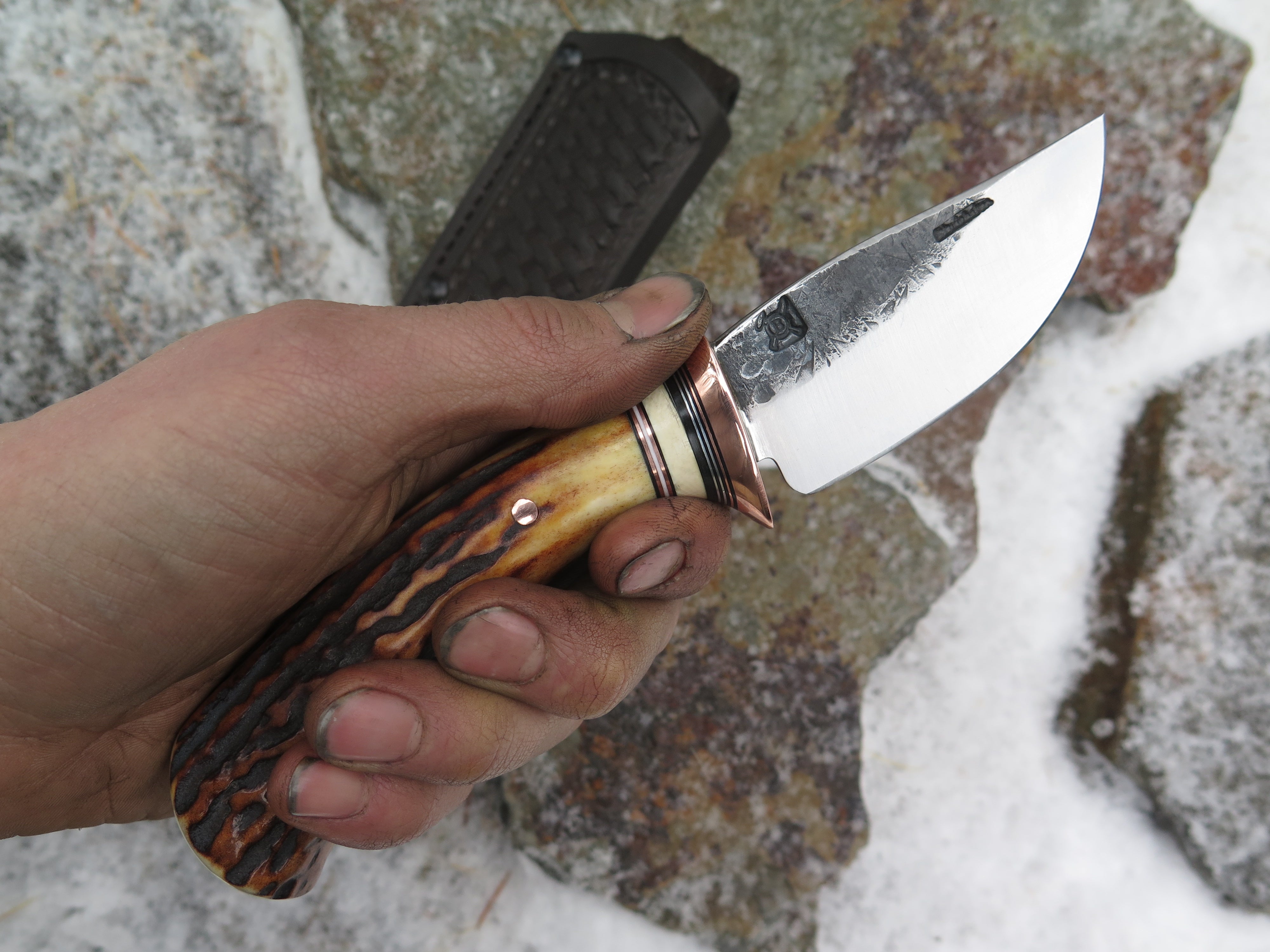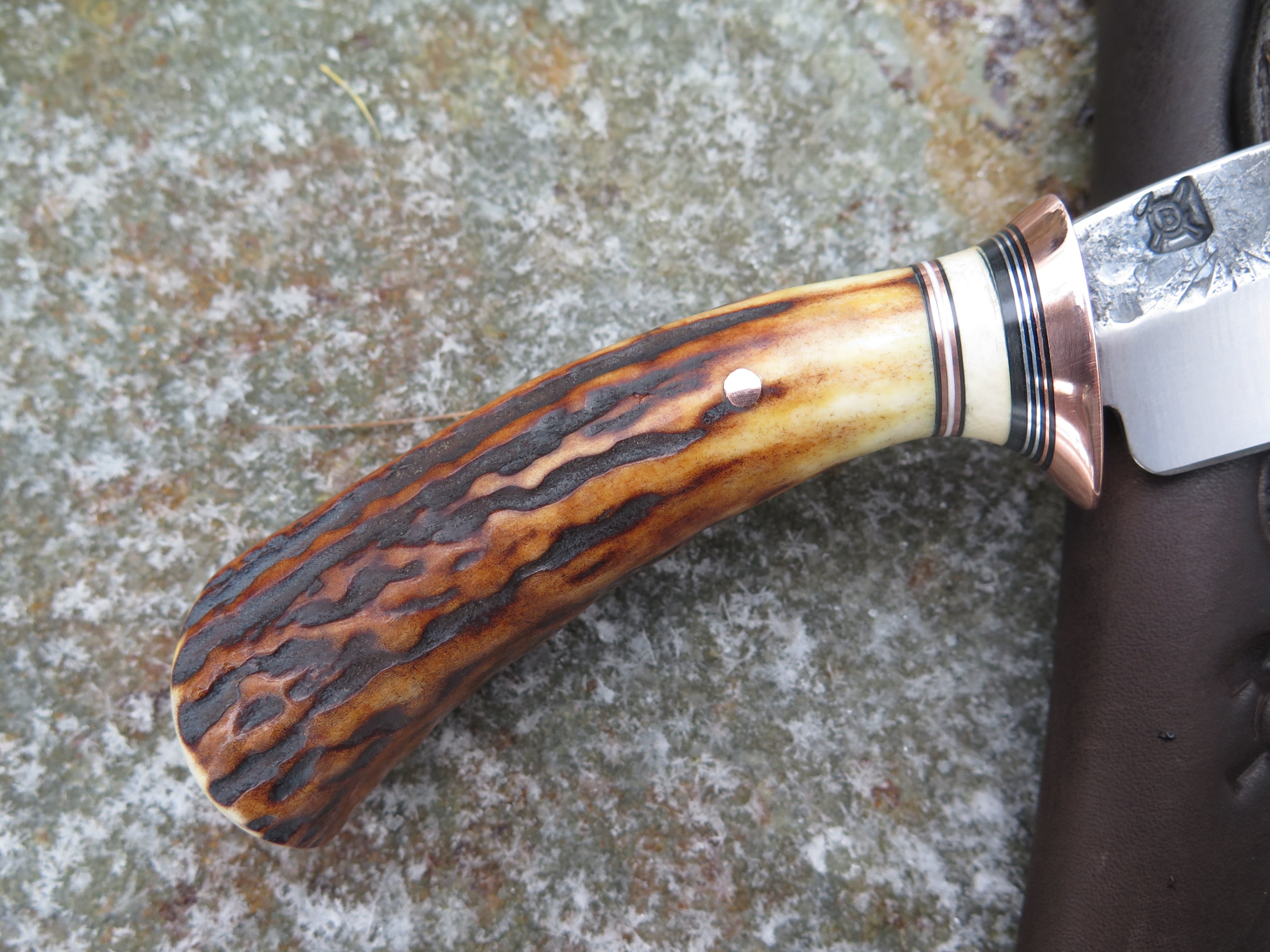 This beautiful new Sharptail from Behring Made© is hand forged from pre-WWII Studebaker leaf spring steel and measures 3 1/4" from tip to guard with a razor sharp hollow grind and our hammermark finish. The copper guard is soldered in place above black and white fiber, copper, aluminum and ancient mammoth ivory spacers as well as a premium sambar stag handle that's pinned through the tang with copper. The overall length measures 7 1/2" and it comes in the shown premium leather belt pouch sheath, though substitutions are available upon request.
