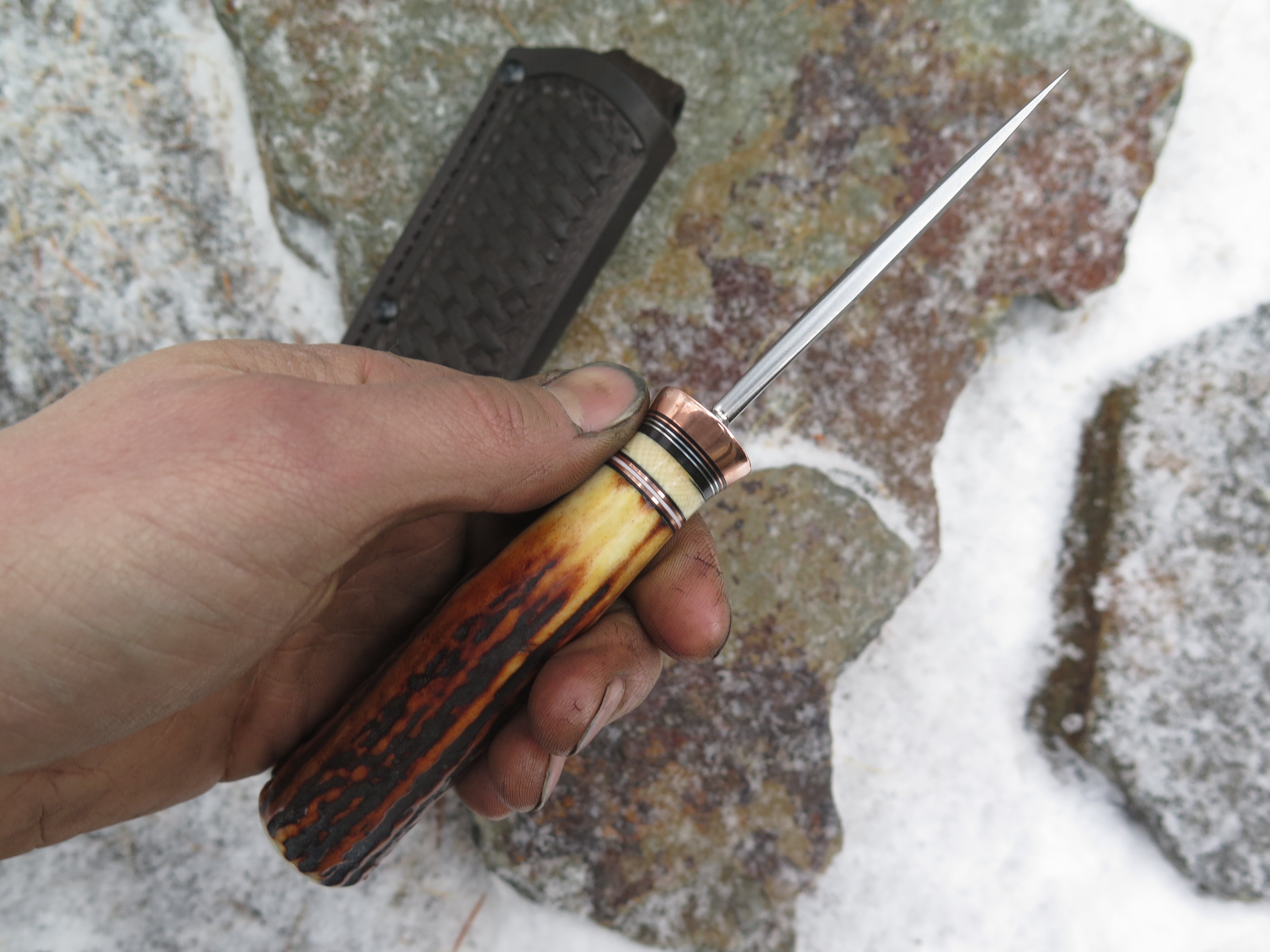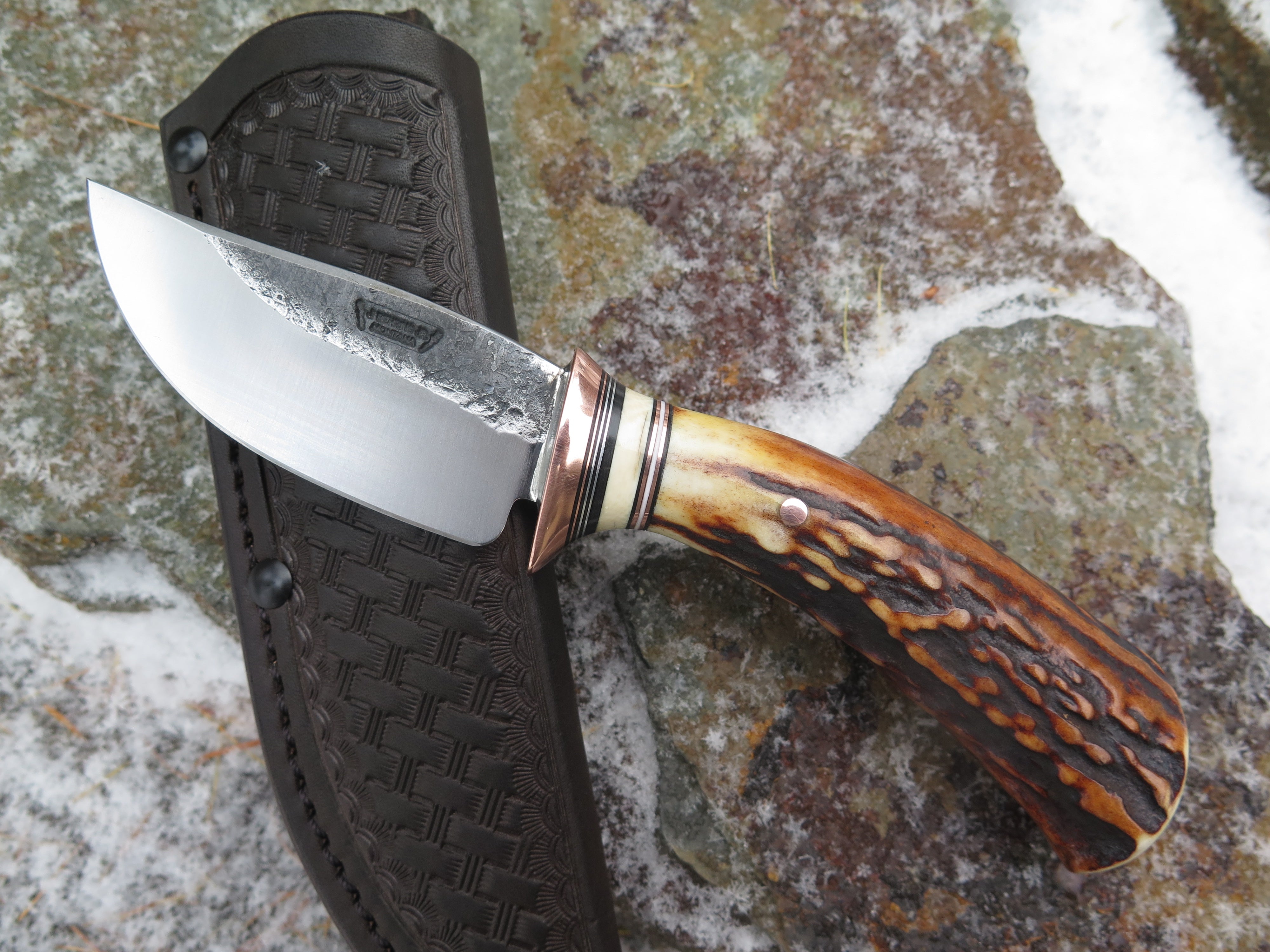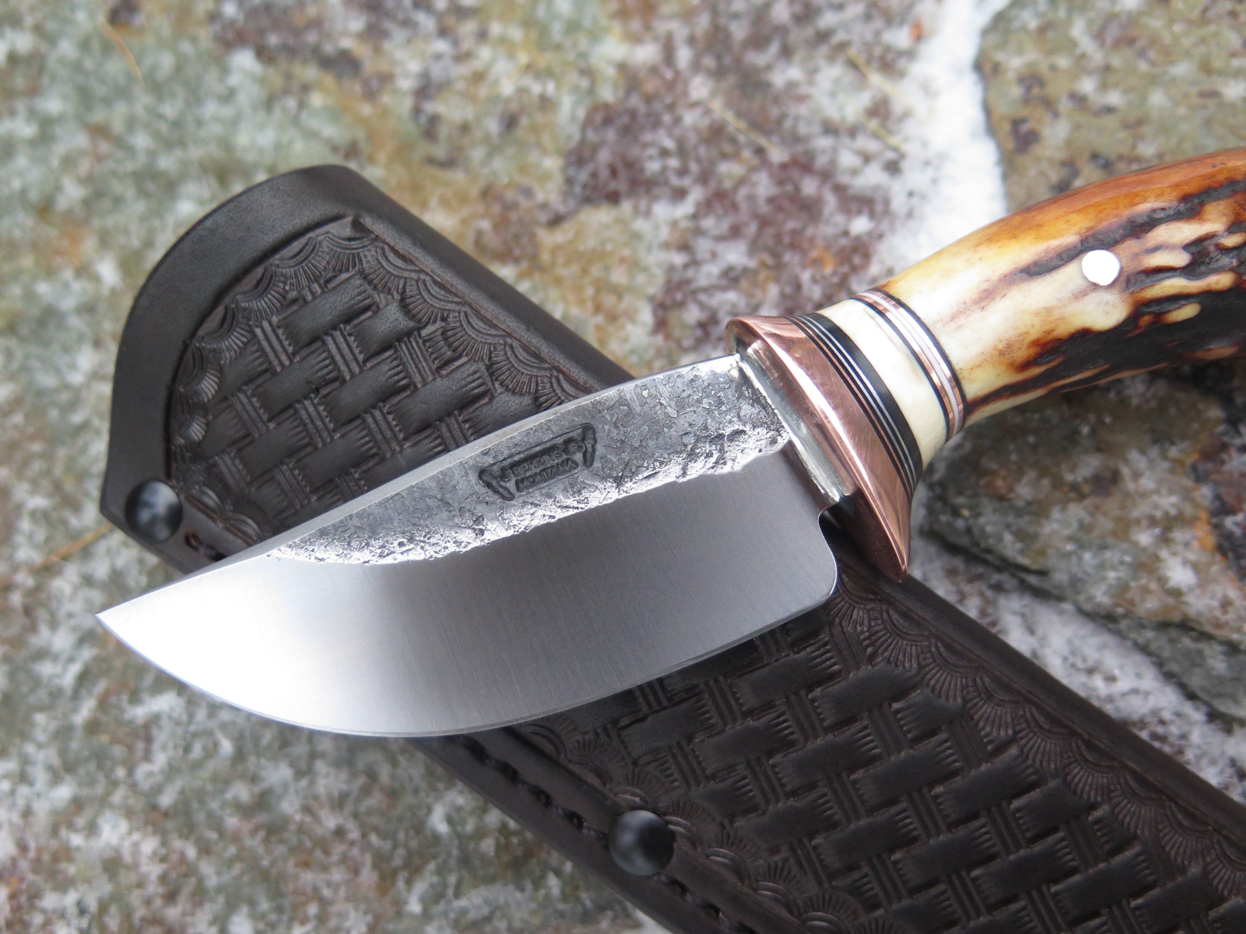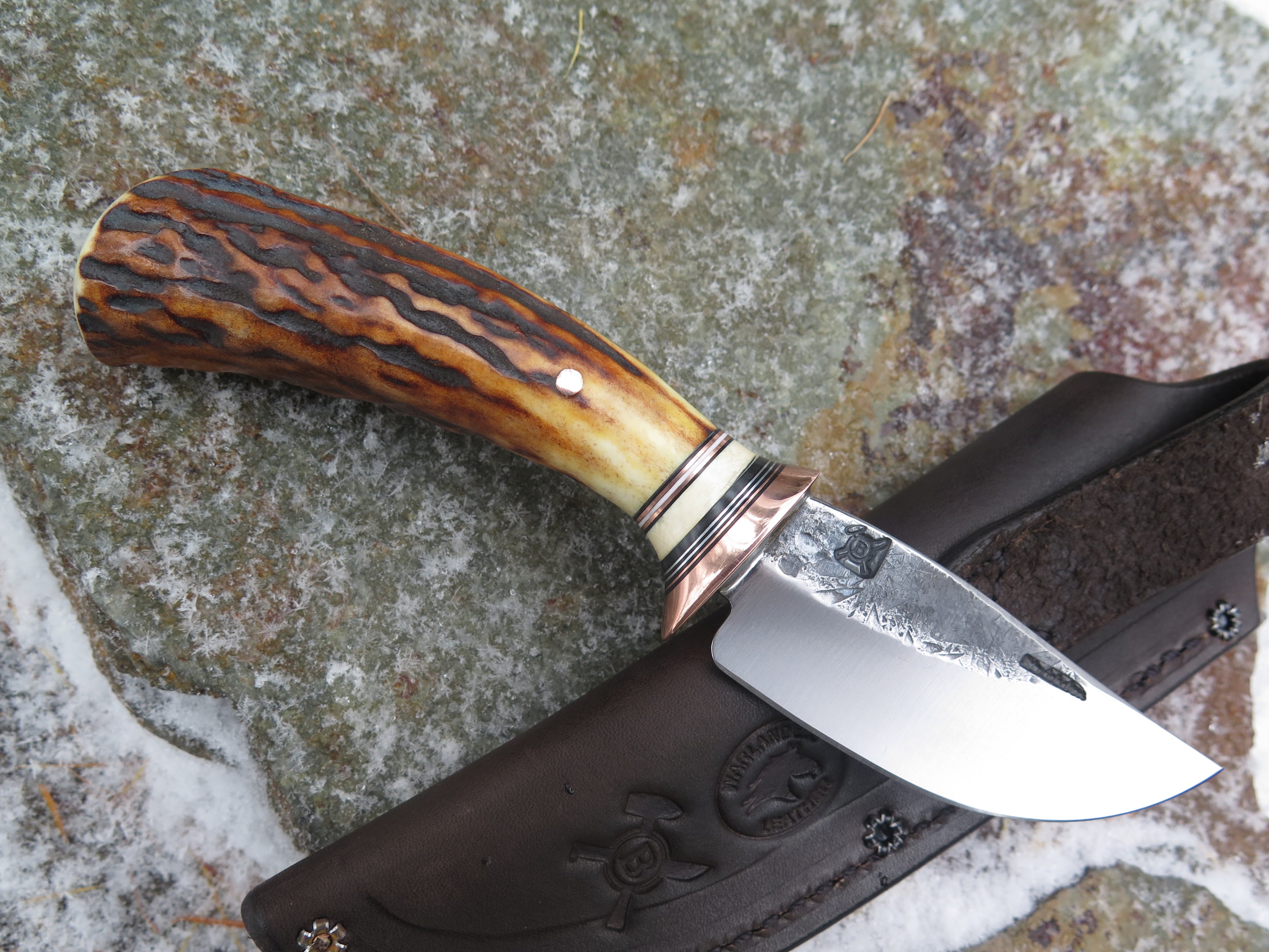 This beautiful new Sharptail from Behring Made© is hand forged from pre-WWII Studebaker leaf spring steel and measures 3 1/4" from tip to guard with a razor sharp hollow grind and our hammermark finish. The copper guard is soldered in place above black and white fiber, copper, aluminum and ancient mammoth ivory spacers as well as a premium sambar stag handle that's pinned through the tang with copper. The overall length measures 7 1/2" and it comes in the shown premium leather belt pouch sheath, though substitutions are available upon request.