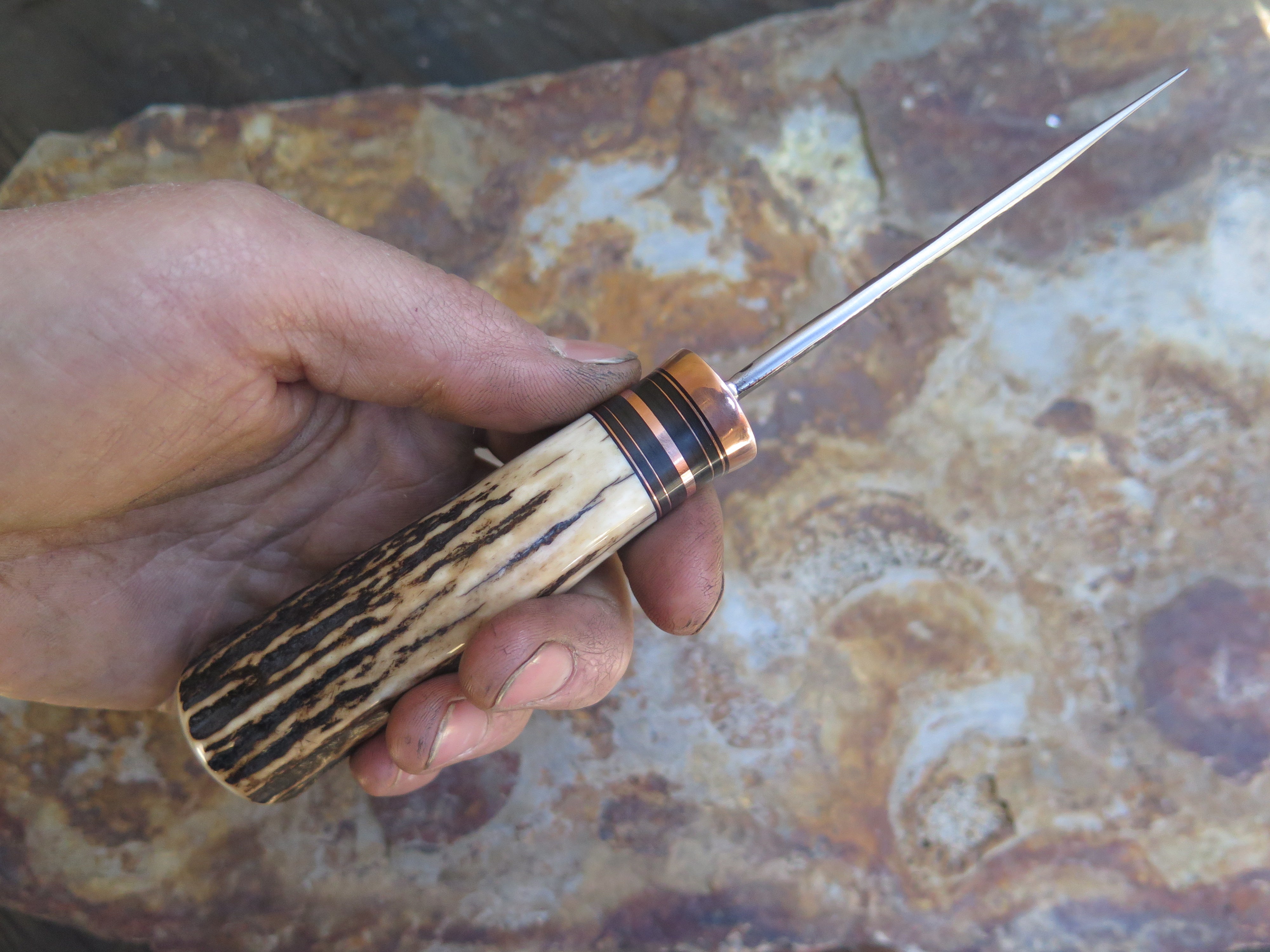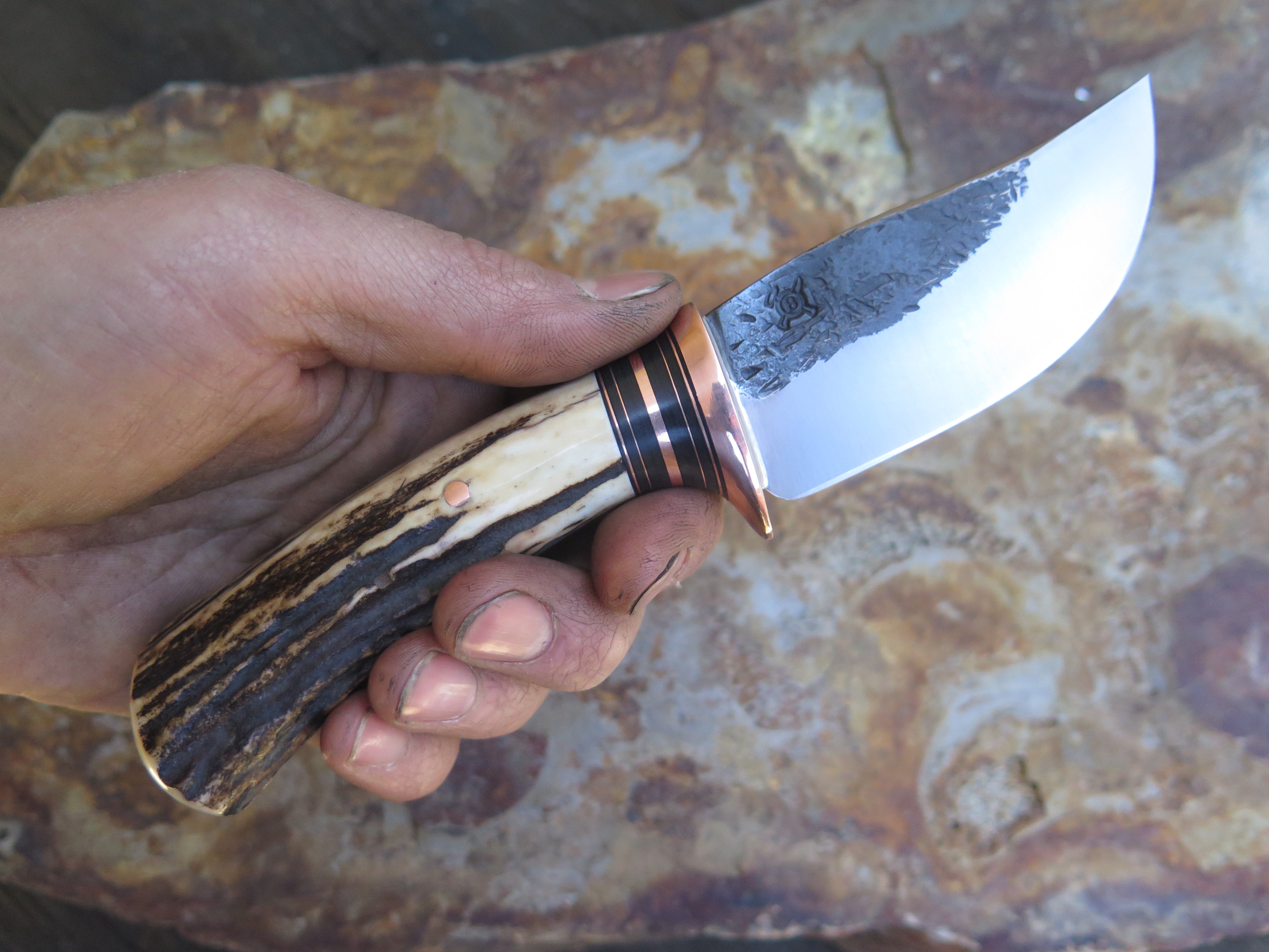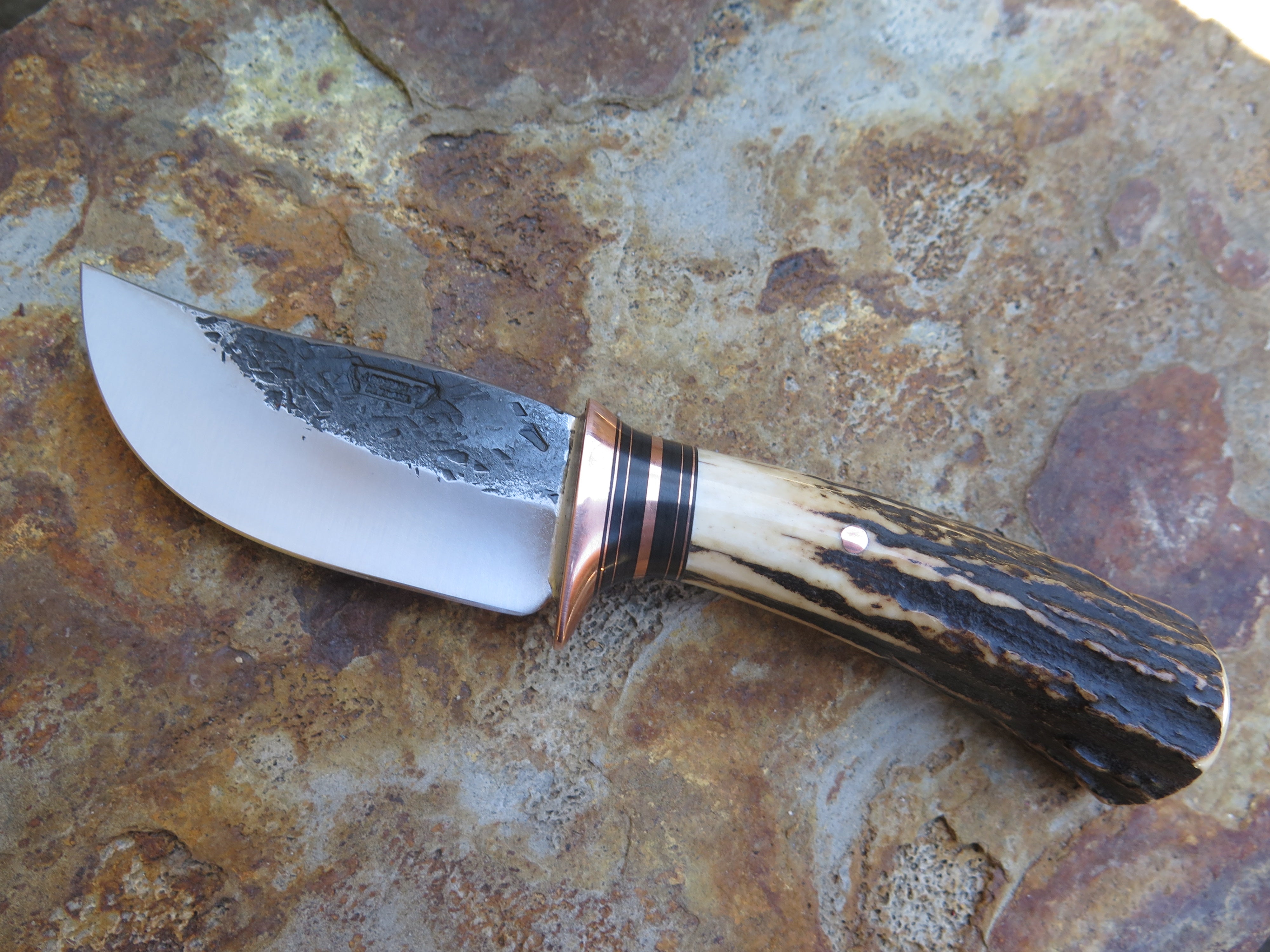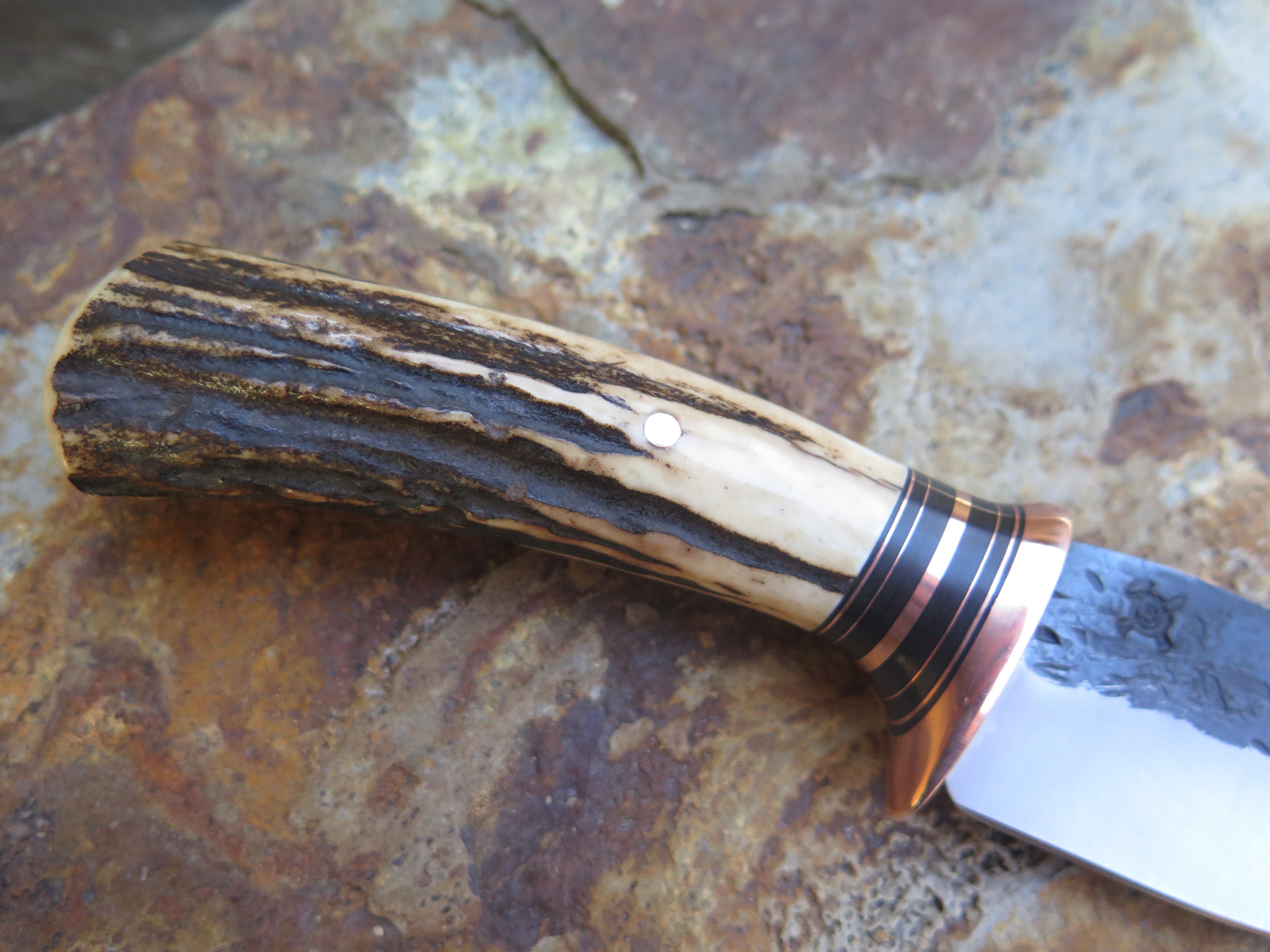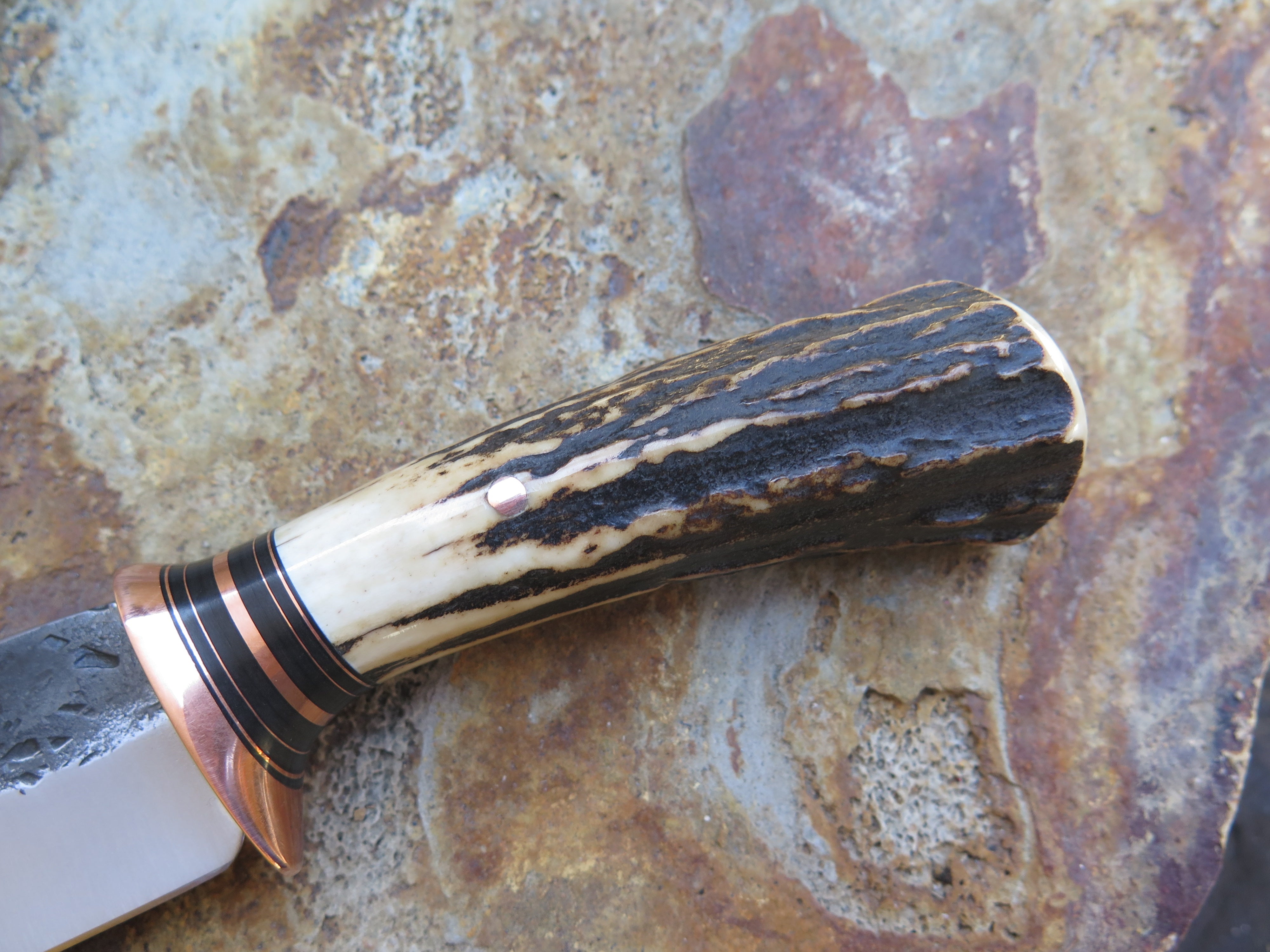 This new Sharptail from Behring Made© is hand forged from 1/8" thick high carbon 01 tool steel and it measures 3 1/2" from tip to guard with a razor sharp hollow grind and our hammermark finish. The copper guard is soldered in place above black fiber and copper spacers that top a beautiful sambar stag handle is pinned through the tang with copper and the overall length measures 7 3/8". This one will go to Warlander Leather for a perfect fitting pouch sheath.
