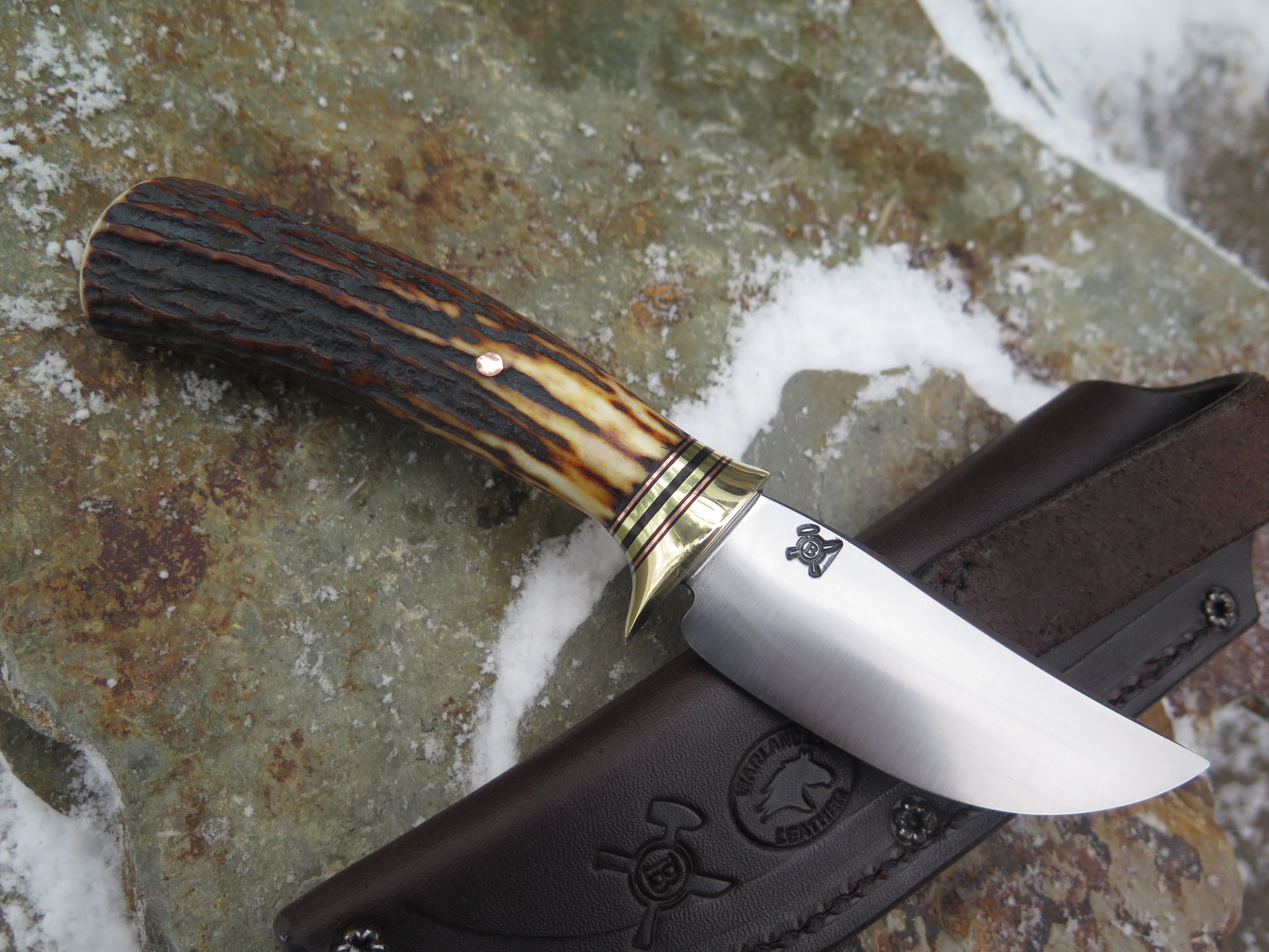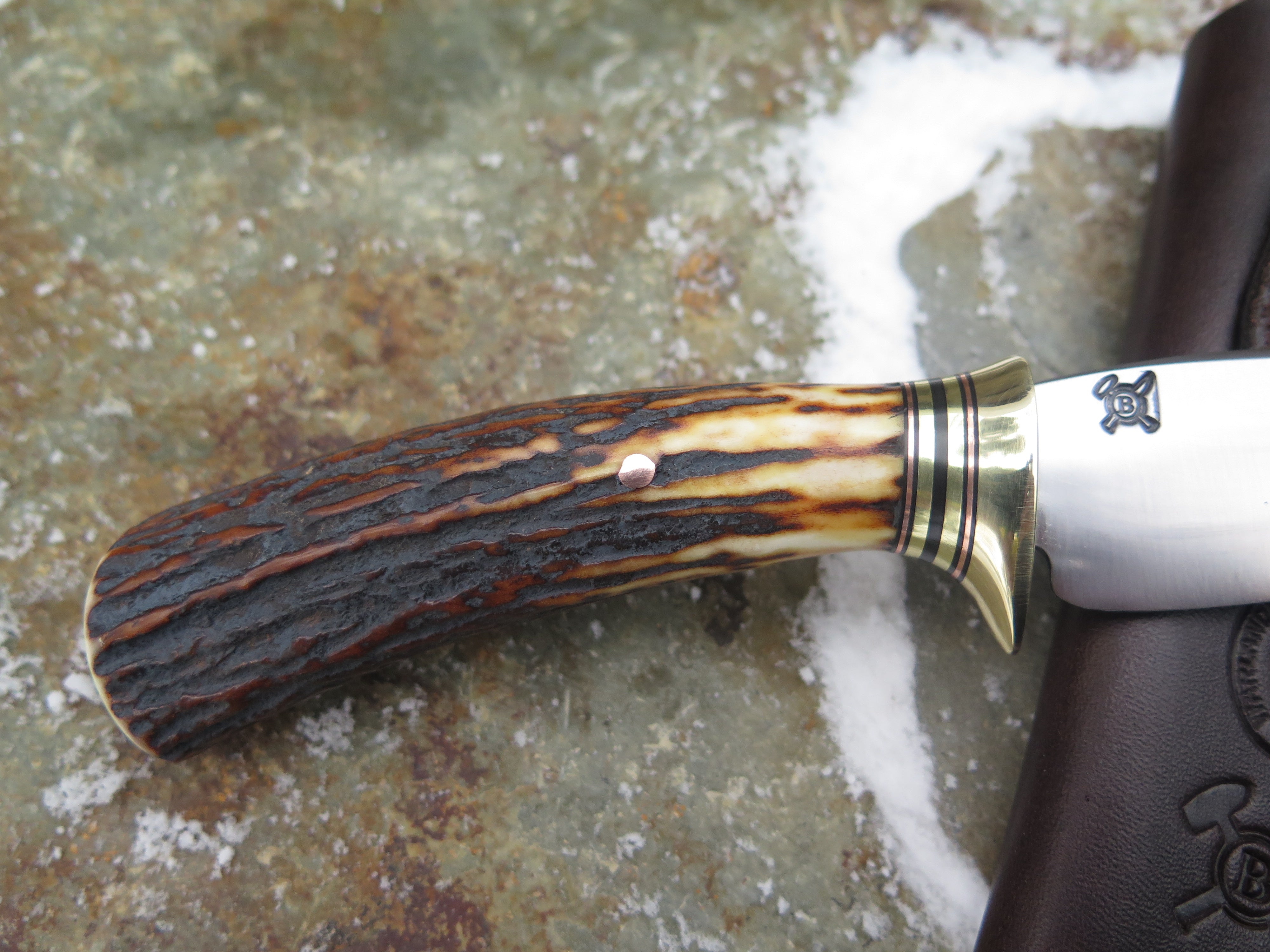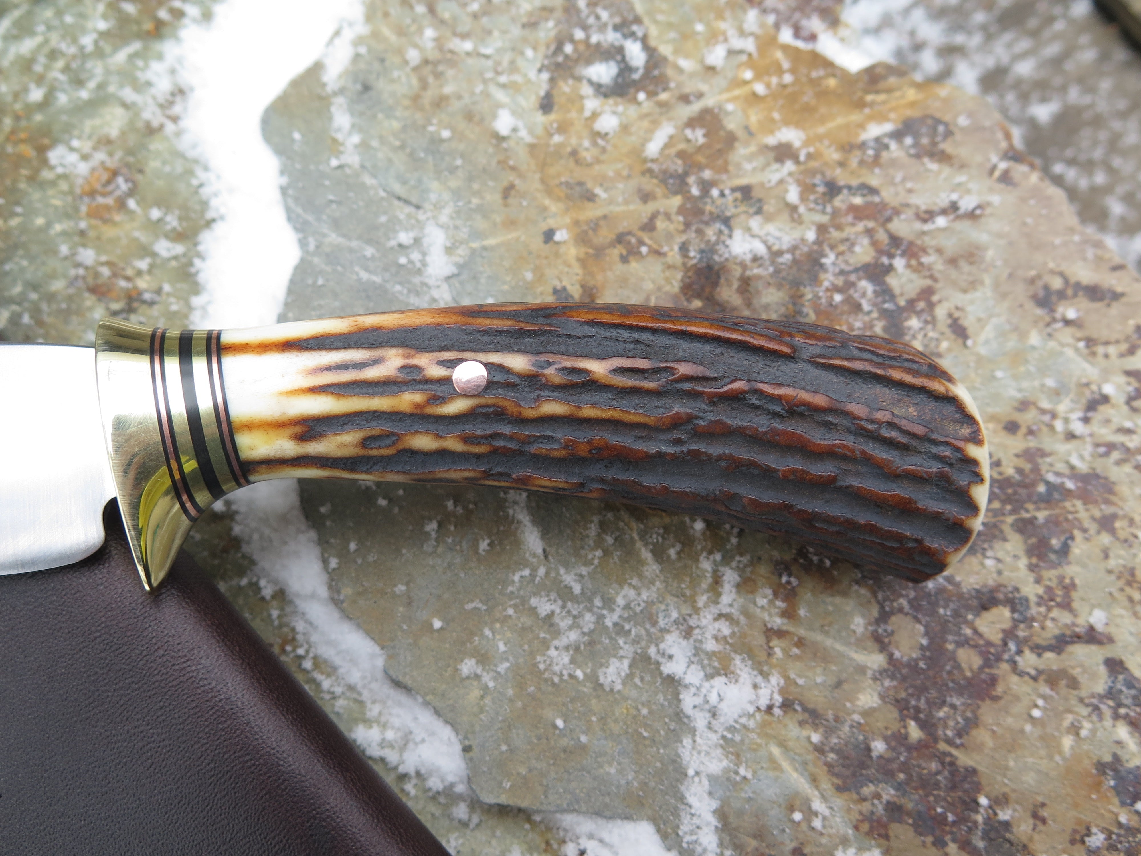 This incredible new Sharptail from Behring Made© is hand forged from 3/16" thick high carbon 01 tool steel and it measures 3 1/2" from tip to guard with a razor sharp convex grind. The brass guard is soldered in place above black fiber, brass and copper spacers with a premium sambar stag handle that James pinned through the tang with copper. The overall length measures 7 3/4" and this one comes in a classic leather belt pouch sheath.