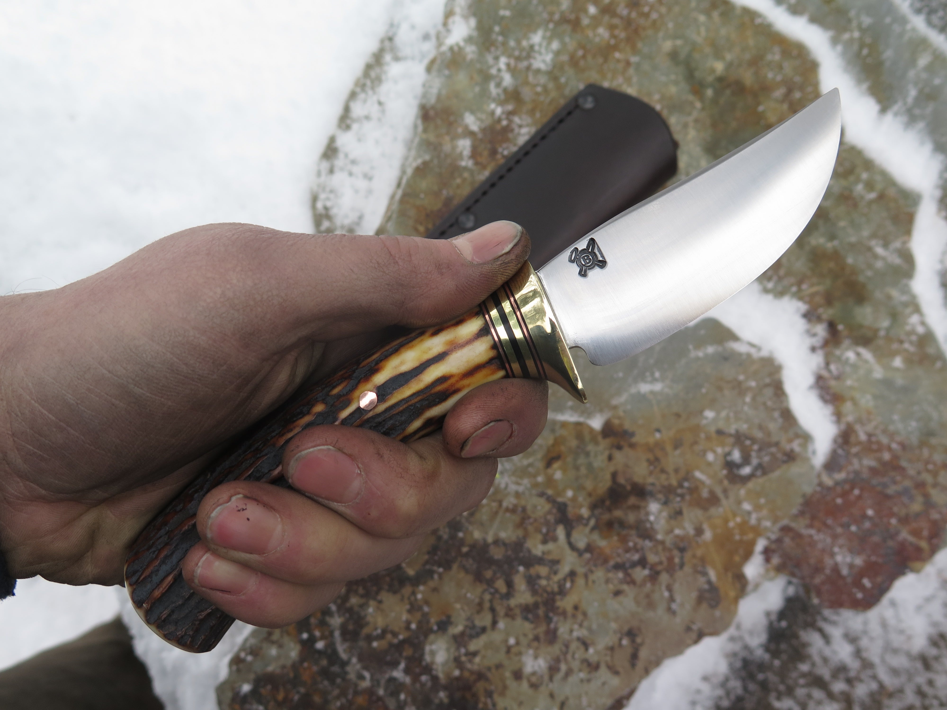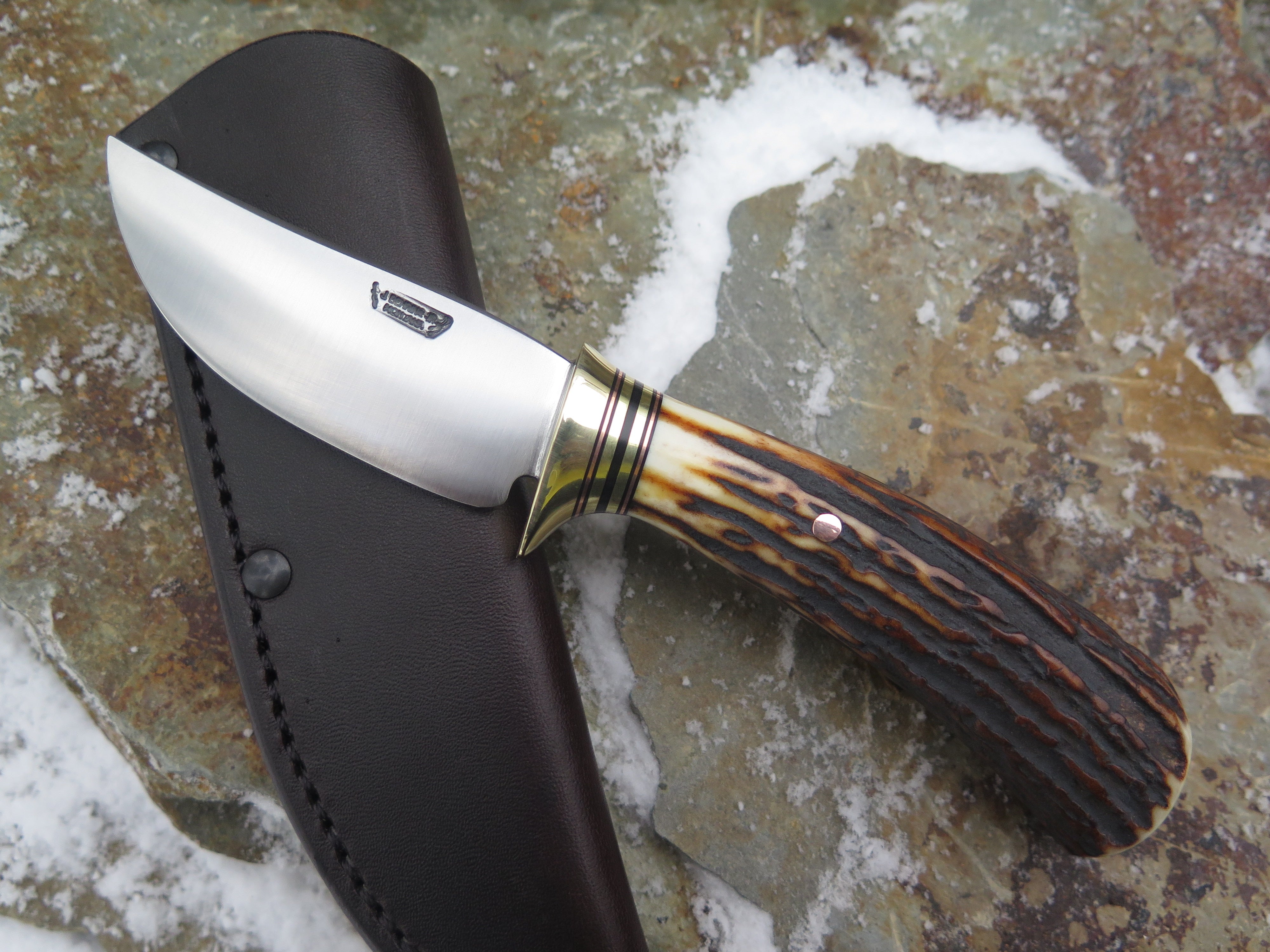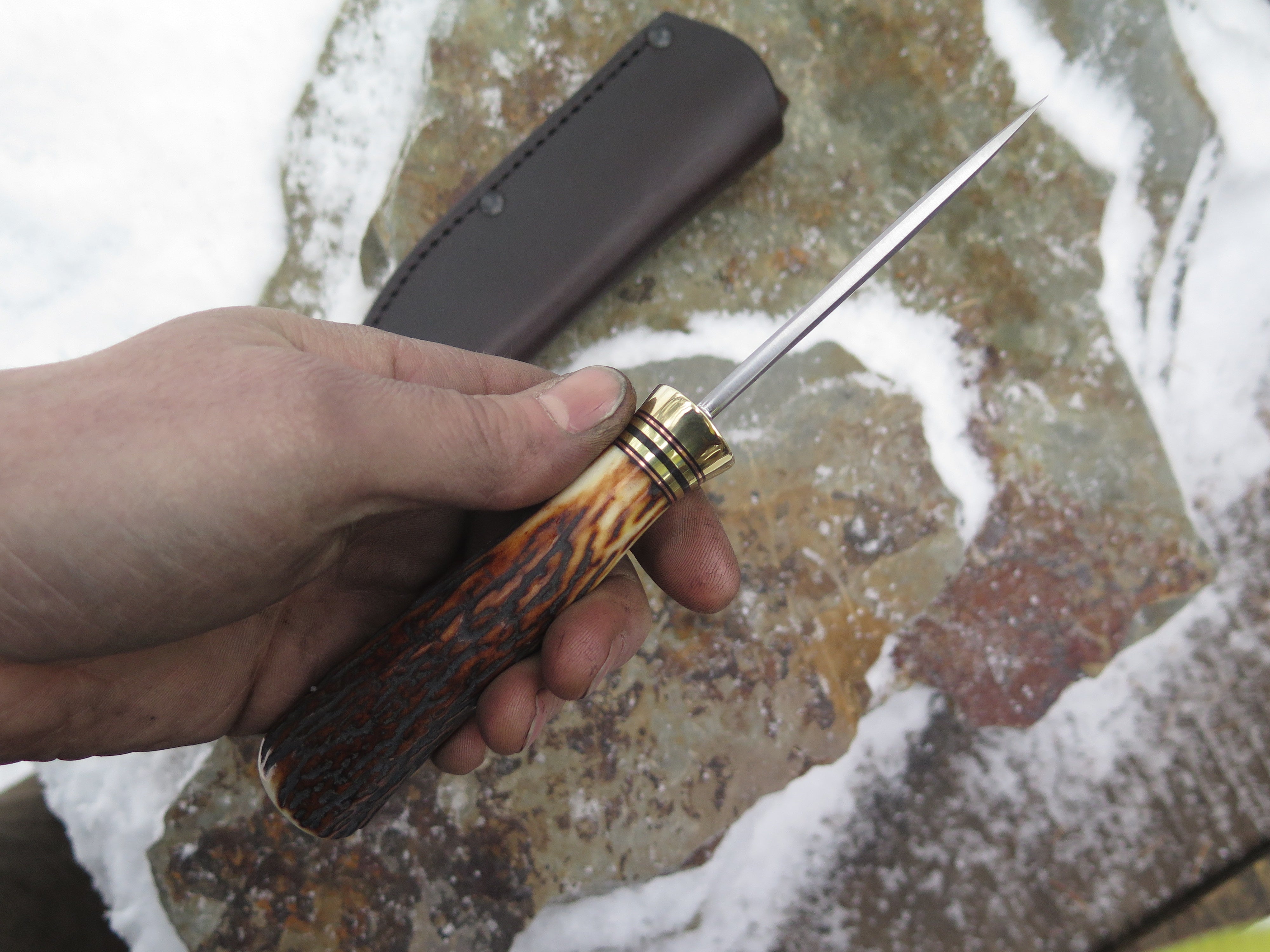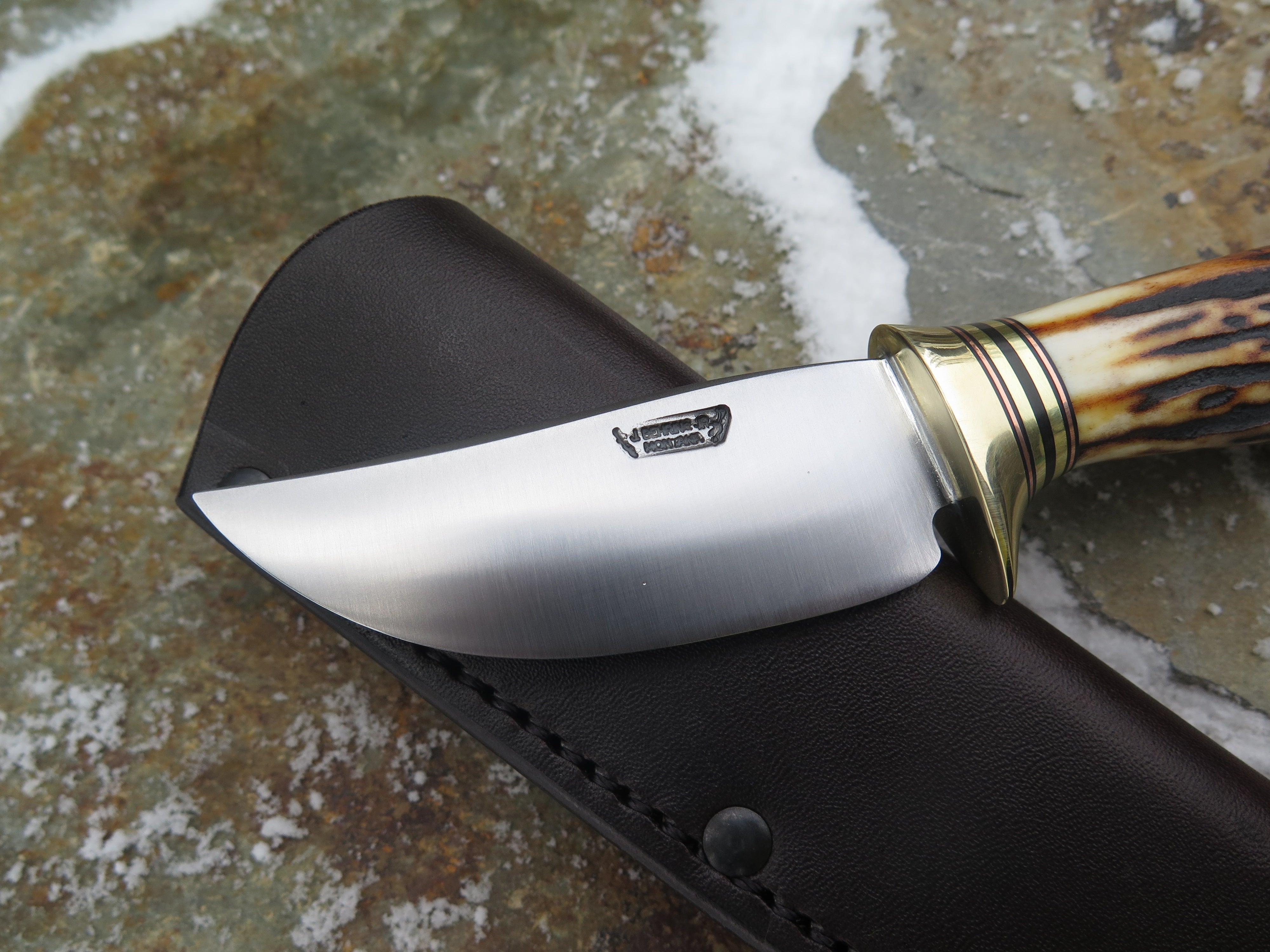 This incredible new Sharptail from Behring Made© is hand forged from 3/16" thick high carbon 01 tool steel and it measures 3 1/2" from tip to guard with a razor sharp convex grind. The brass guard is soldered in place above black fiber, brass and copper spacers with a premium sambar stag handle that James pinned through the tang with copper. The overall length measures 7 3/4" and this one comes in a classic leather belt pouch sheath.