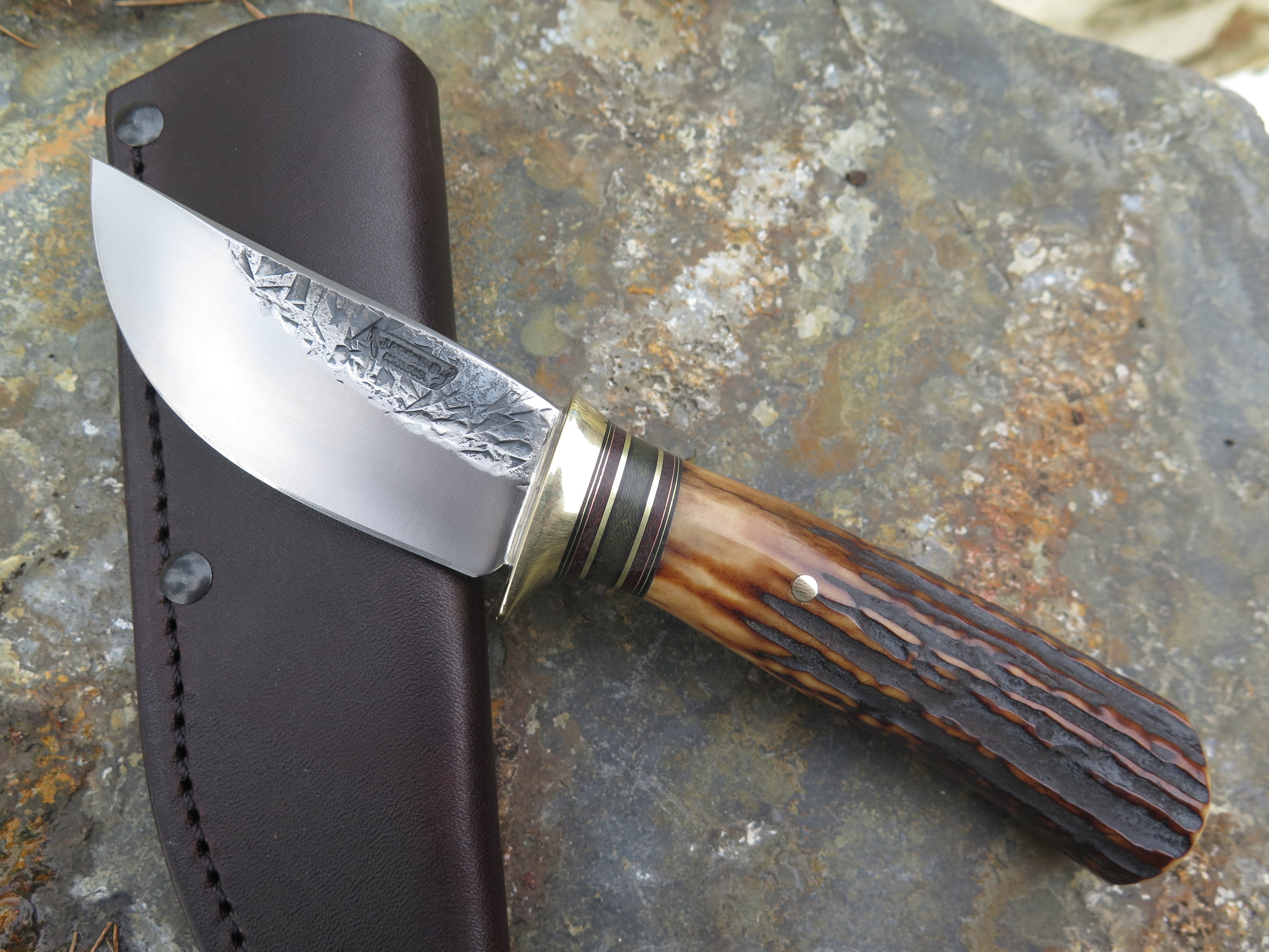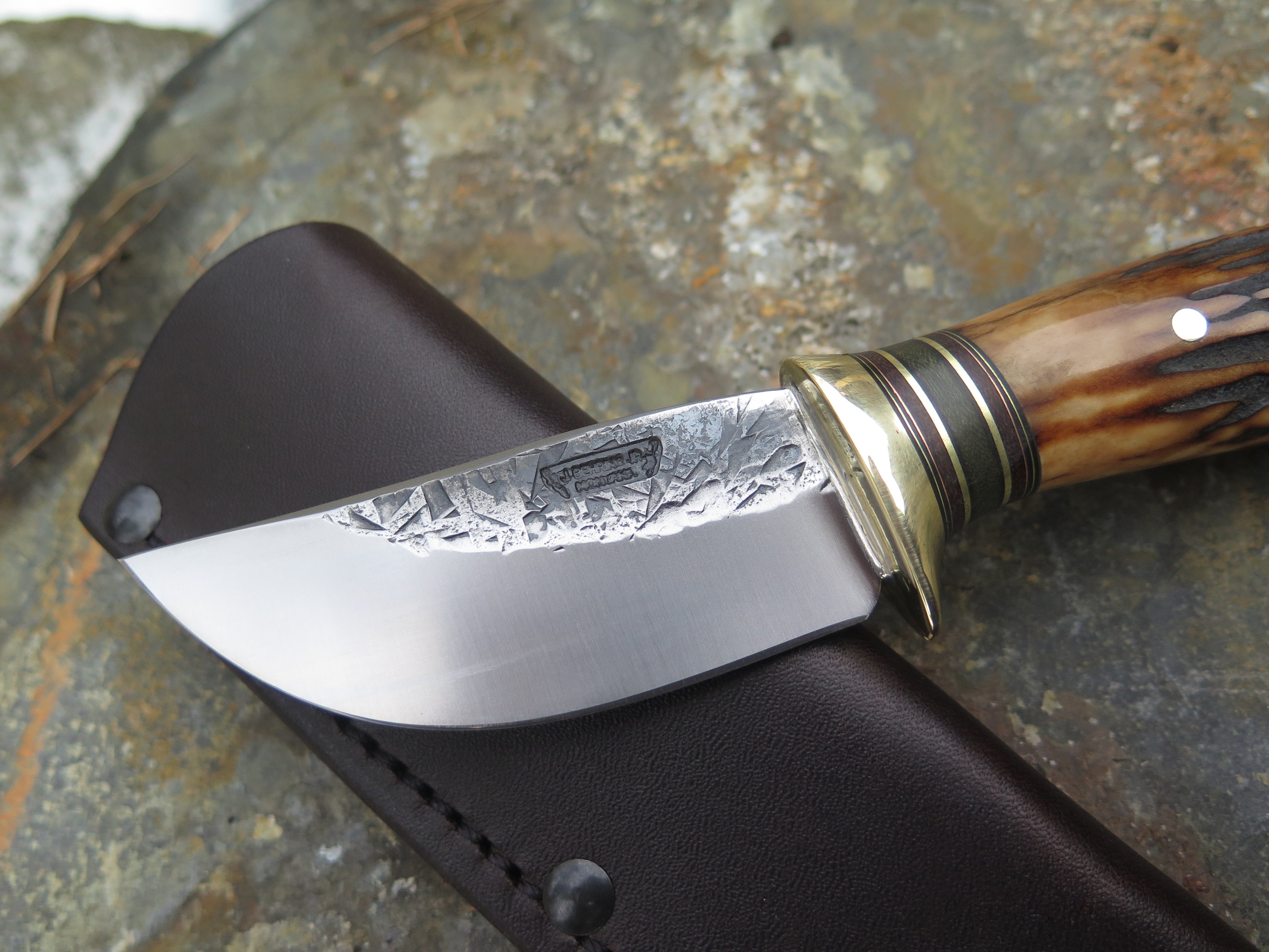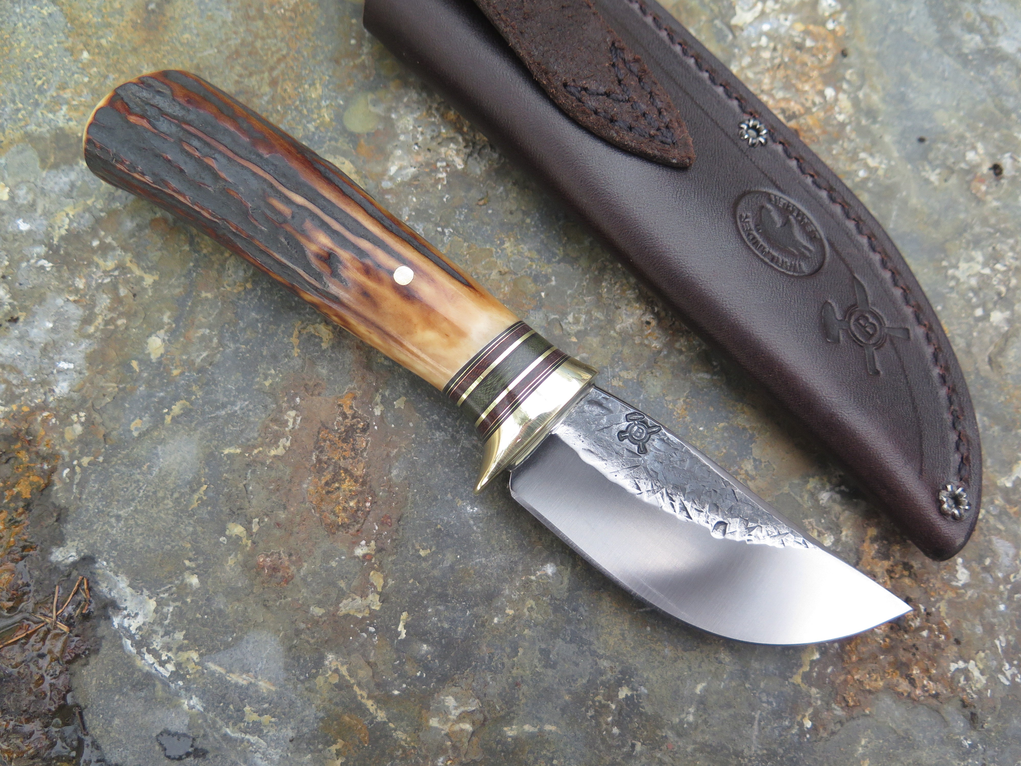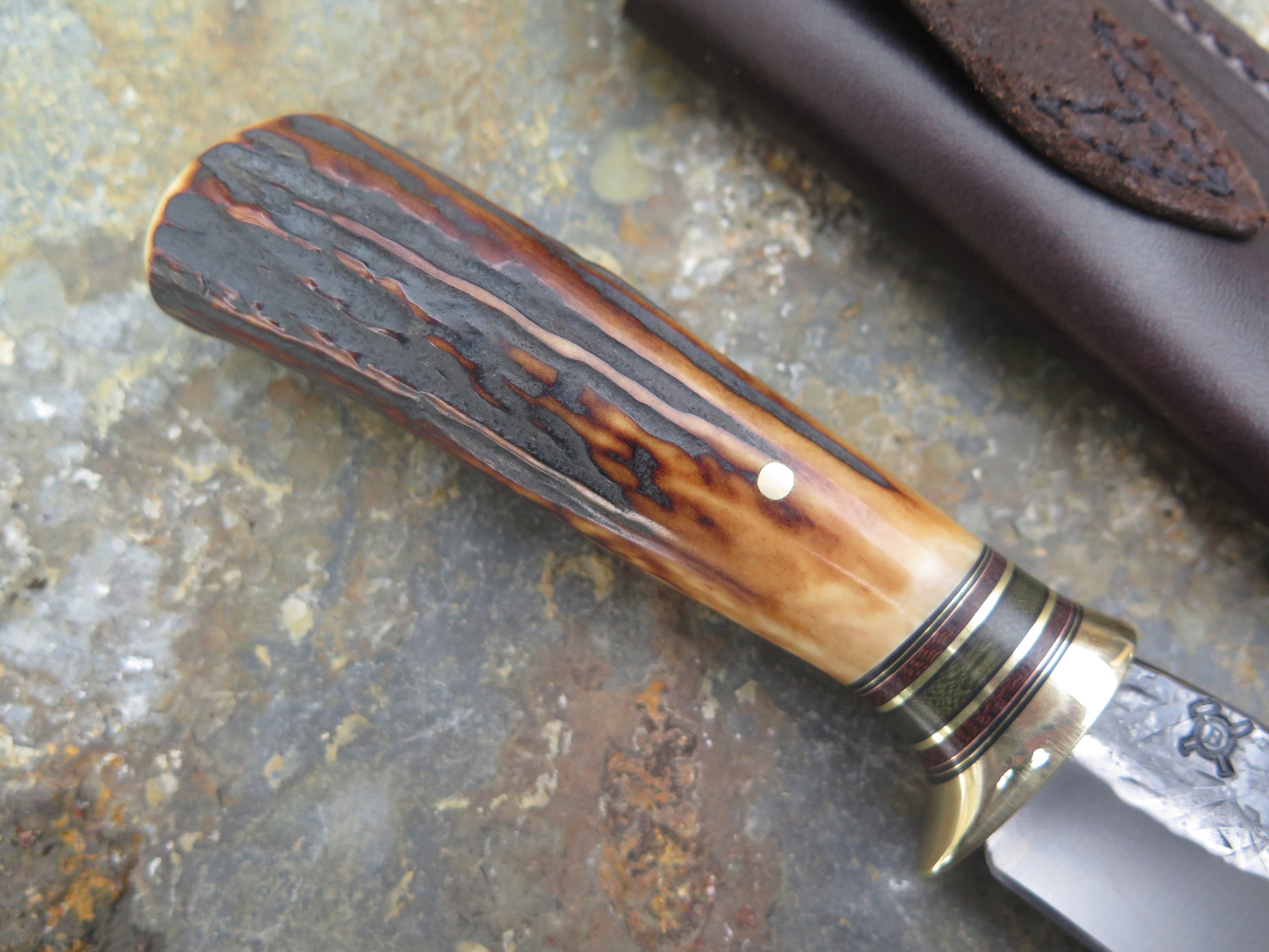 This handsome new Behring Made© Sharptail is hand forged from 3/16" thick high carbon 01 tool steel and it measures 3 1/4" from tip to guard with a razor sharp hollow grind and our hammermark finish. The brass guard is soldered in place above black, green, brown, brass and copper spacers as well as a premium sambar stag handle that's pinned through the tang with brass and overall the length measures 7 3/4". Ready for the field, this one is outfitted with a classic leather belt pouch sheath.