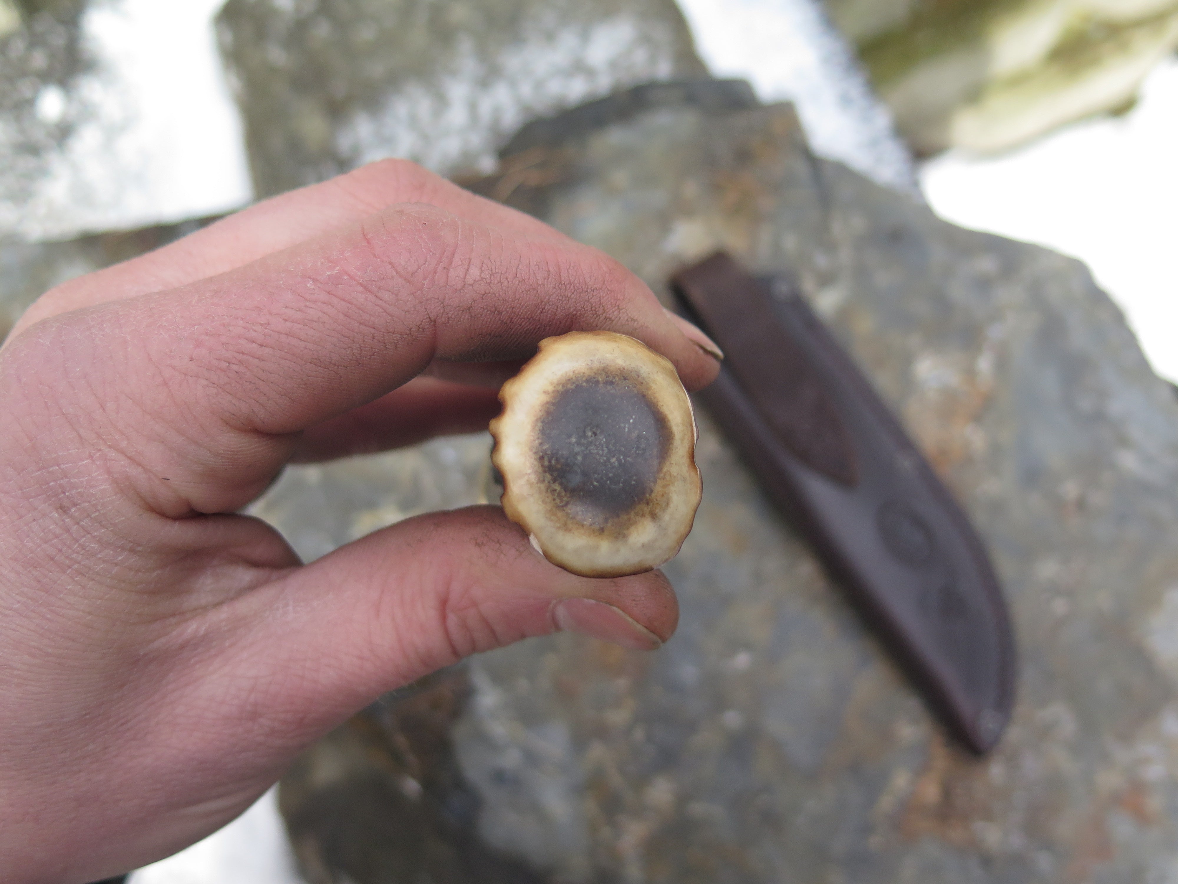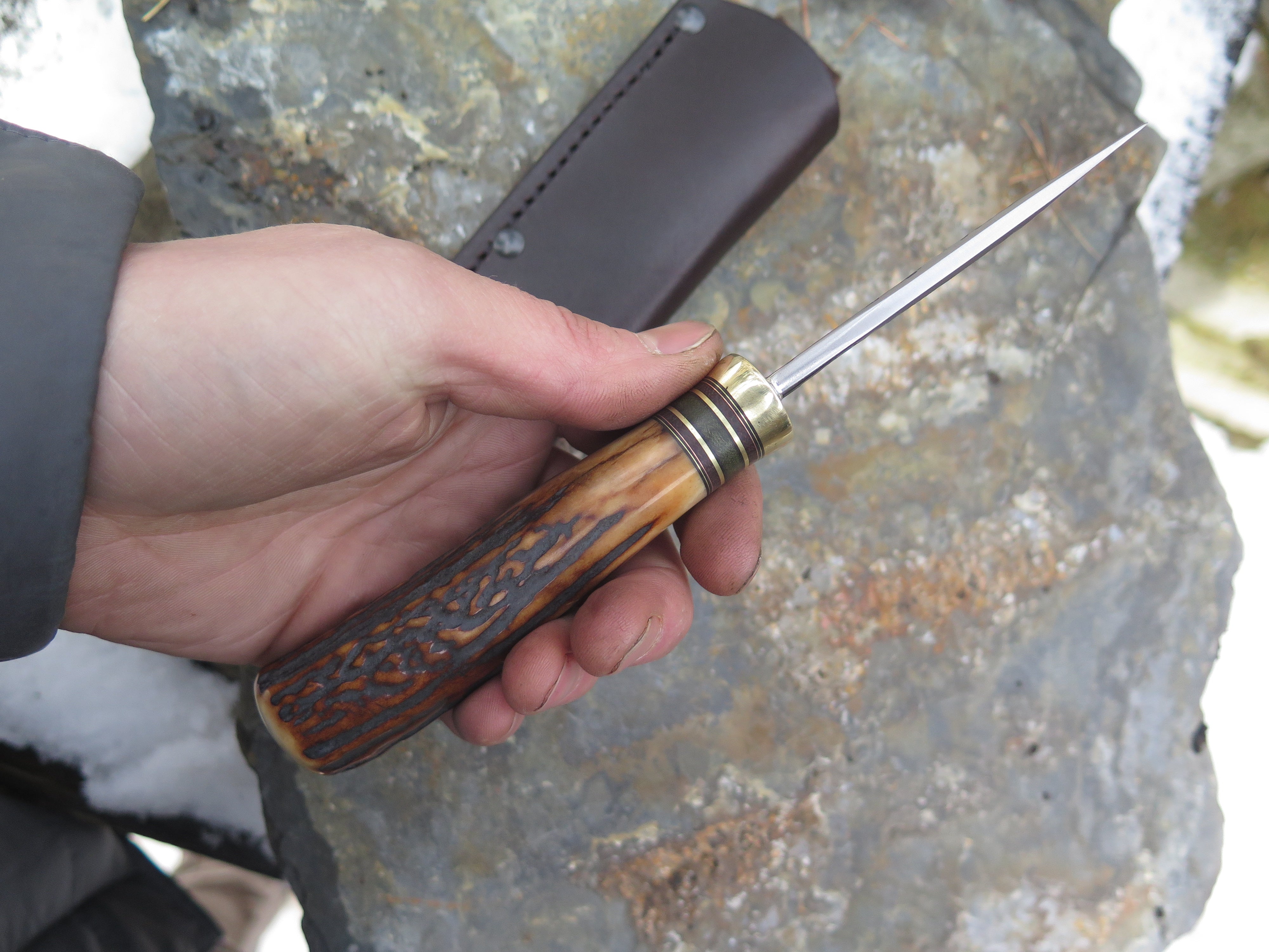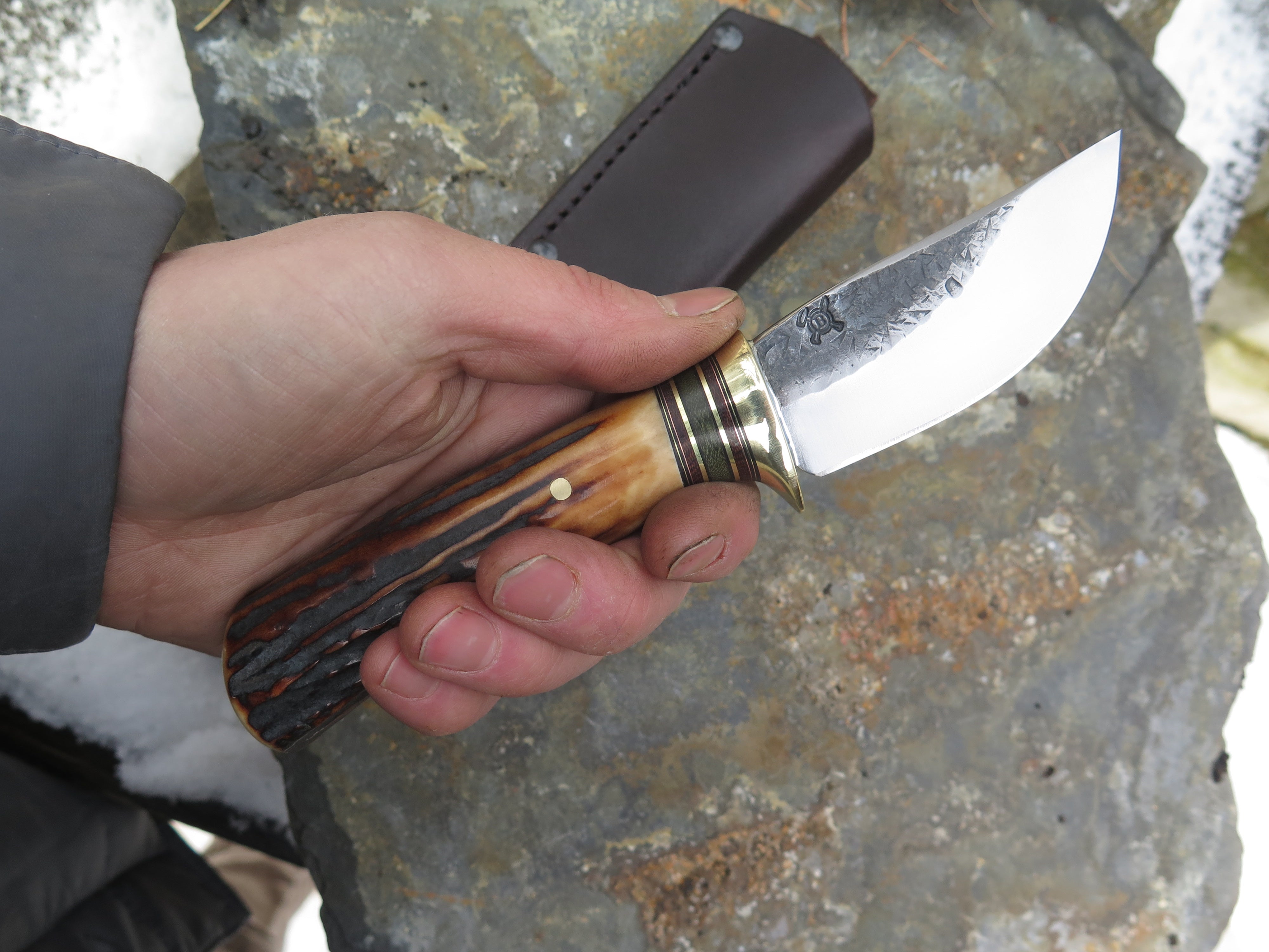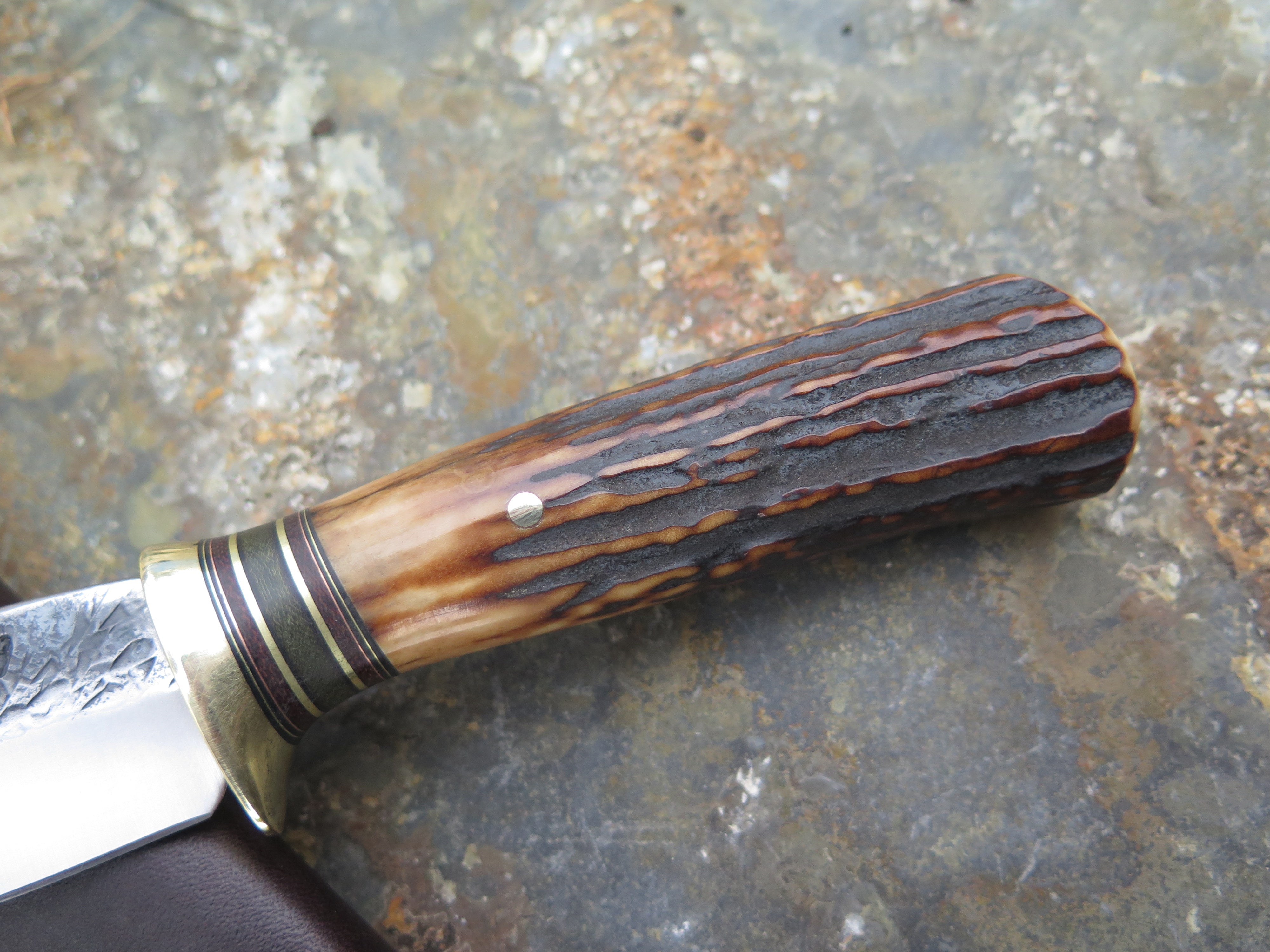This handsome new Behring Made© Sharptail is hand forged from 3/16" thick high carbon 01 tool steel and it measures 3 1/4" from tip to guard with a razor sharp hollow grind and our hammermark finish. The brass guard is soldered in place above black, green, brown, brass and copper spacers as well as a premium sambar stag handle that's pinned through the tang with brass and overall the length measures 7 3/4". Ready for the field, this one is outfitted with a classic leather belt pouch sheath.