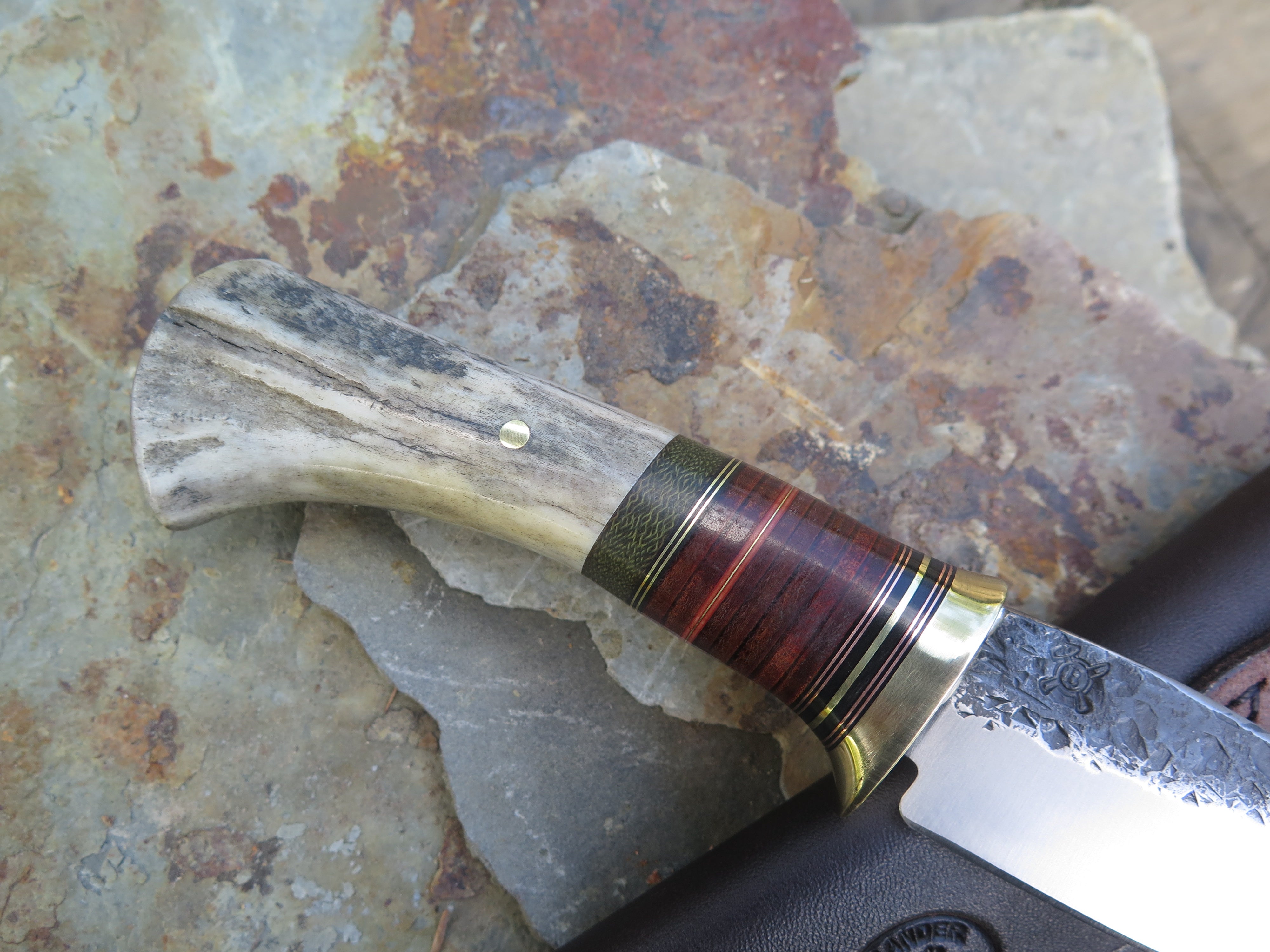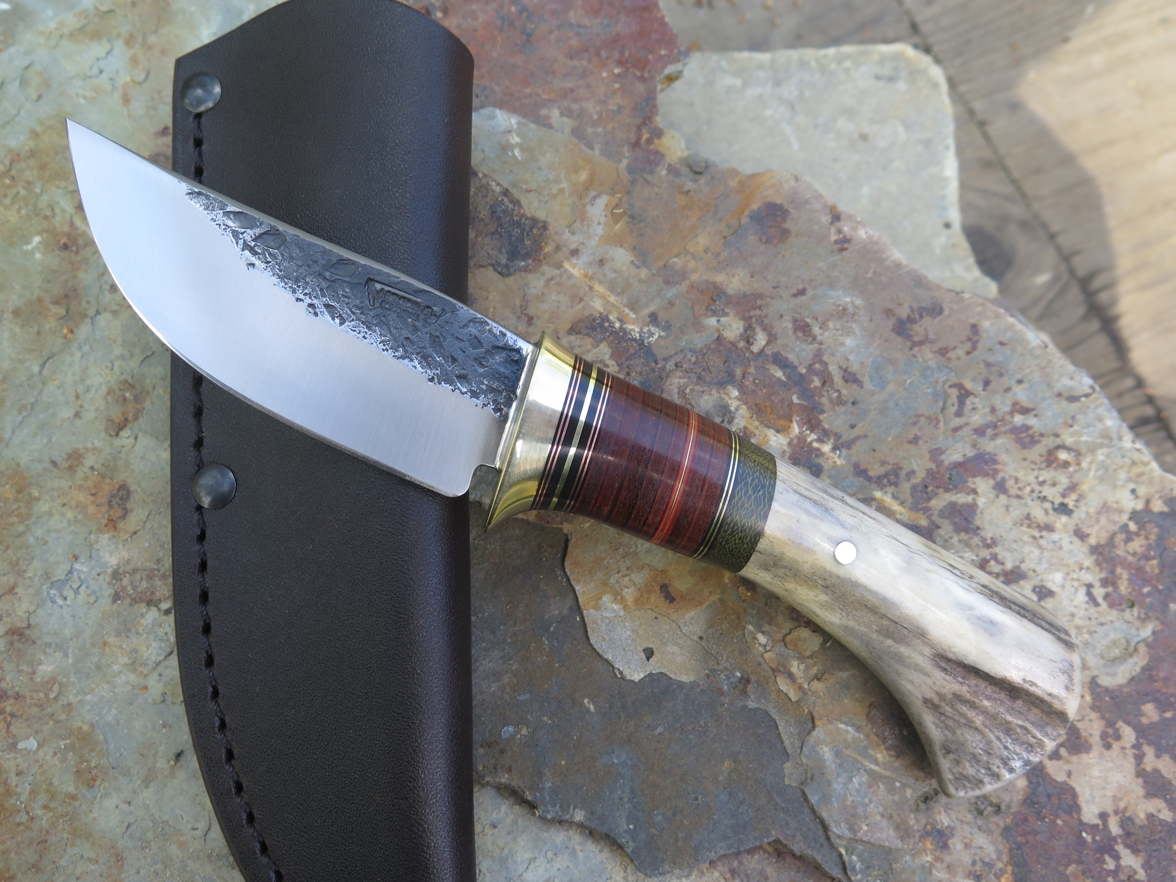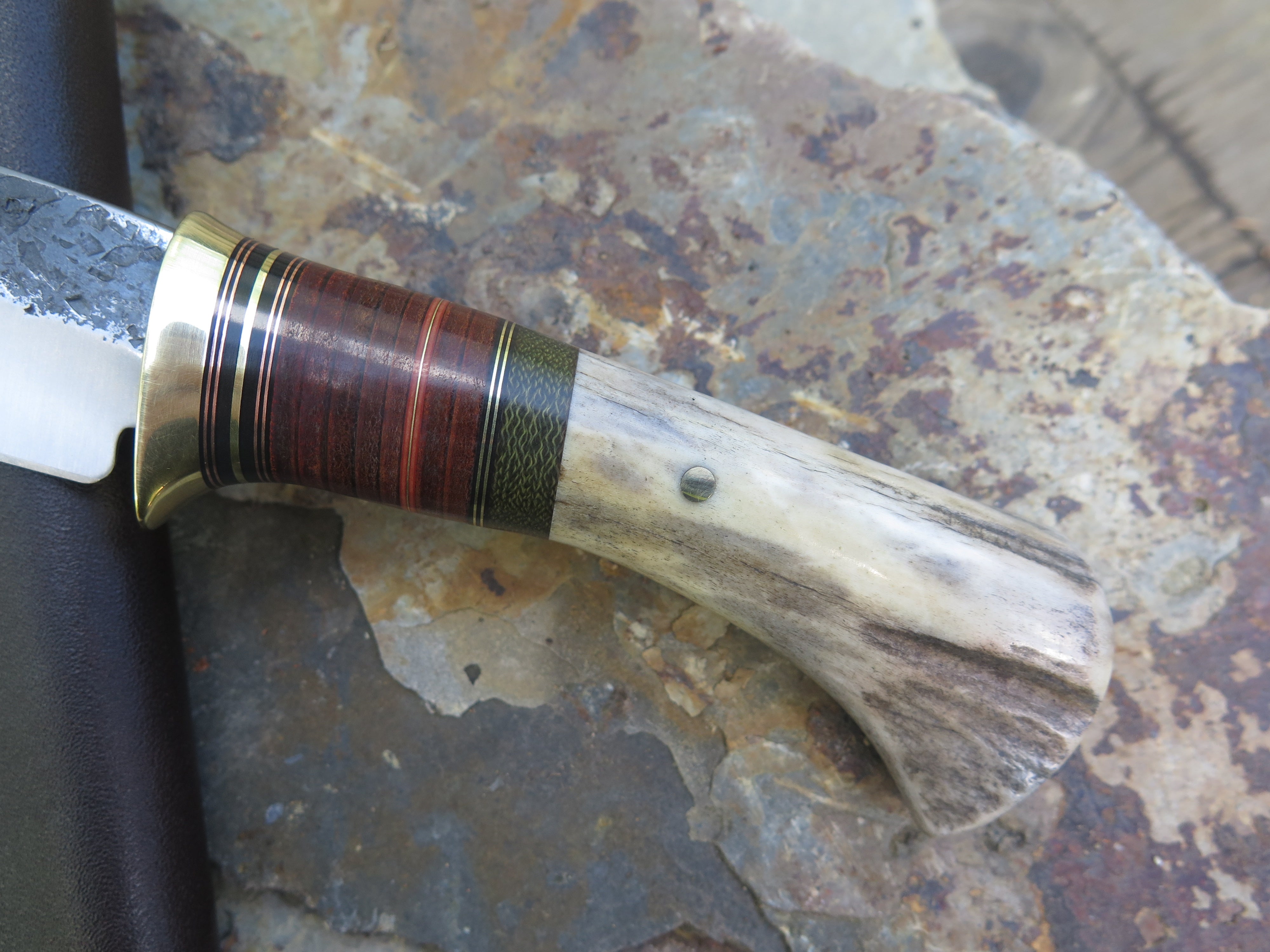 This outstanding new Behring Made© Sharptail is hand forged from 3/16" thick high carbon 01 tool steel and it measures 3 1/2" from tip to guard with a razor sharp hollow grind and our hammermark finish. The brass guard is soldered in place above black and maroon fiber, green micarta, brass and horsehide leather spacers as well as a premium shiras moose antler butt that is pinned through the tang with brass. The overall length measures 7 3/4" and it comes in a classic leather belt pouch sheath.