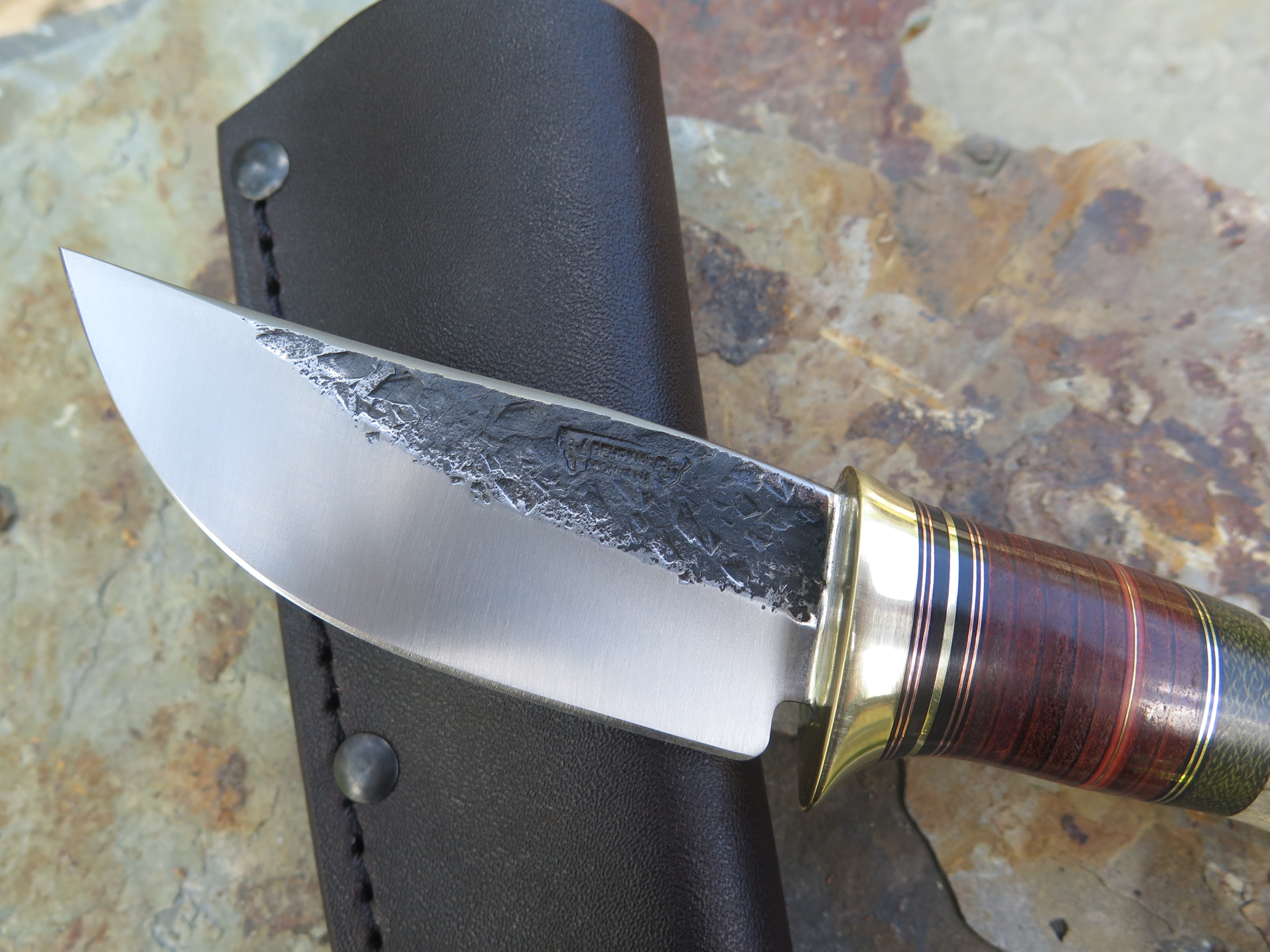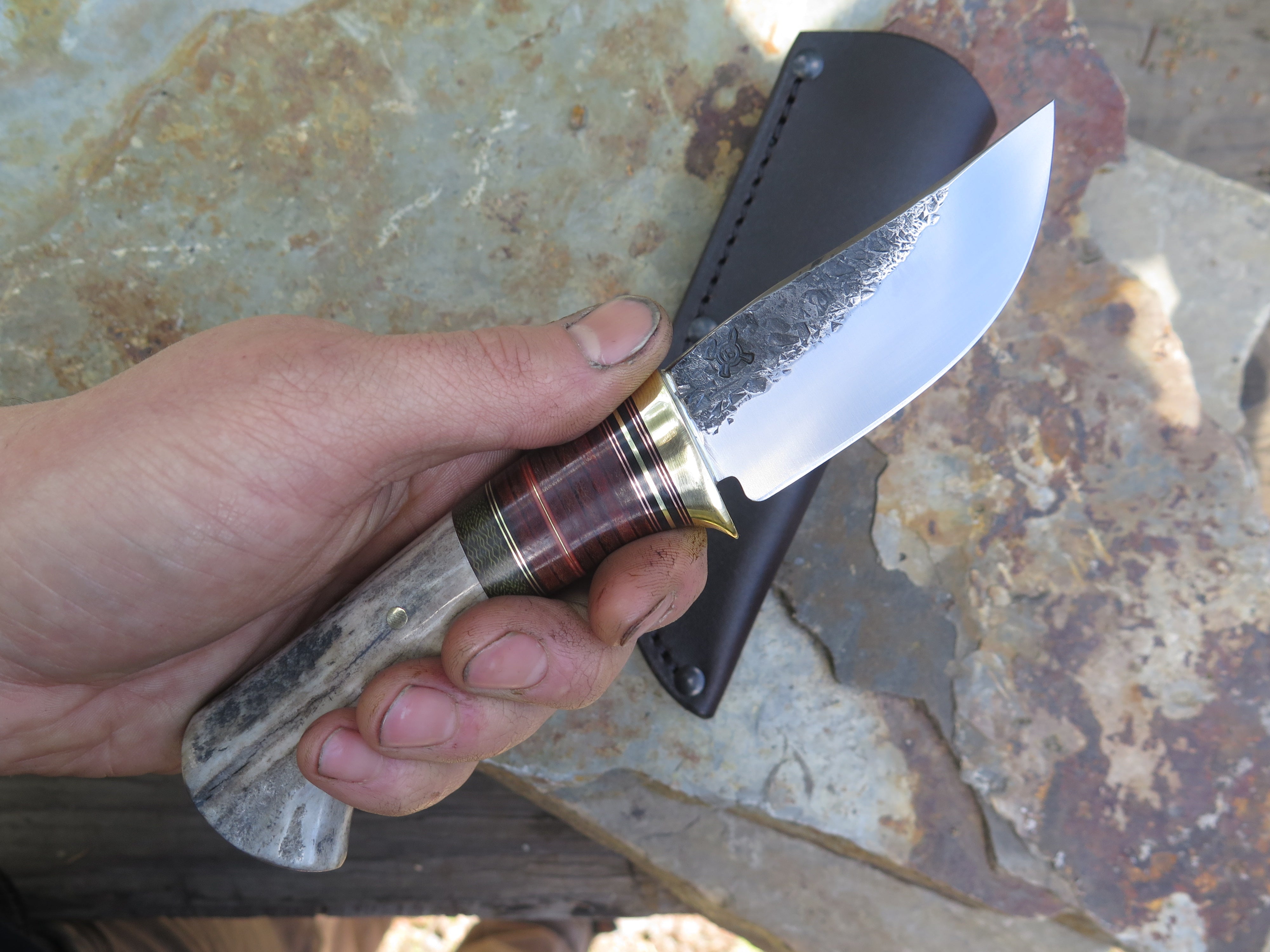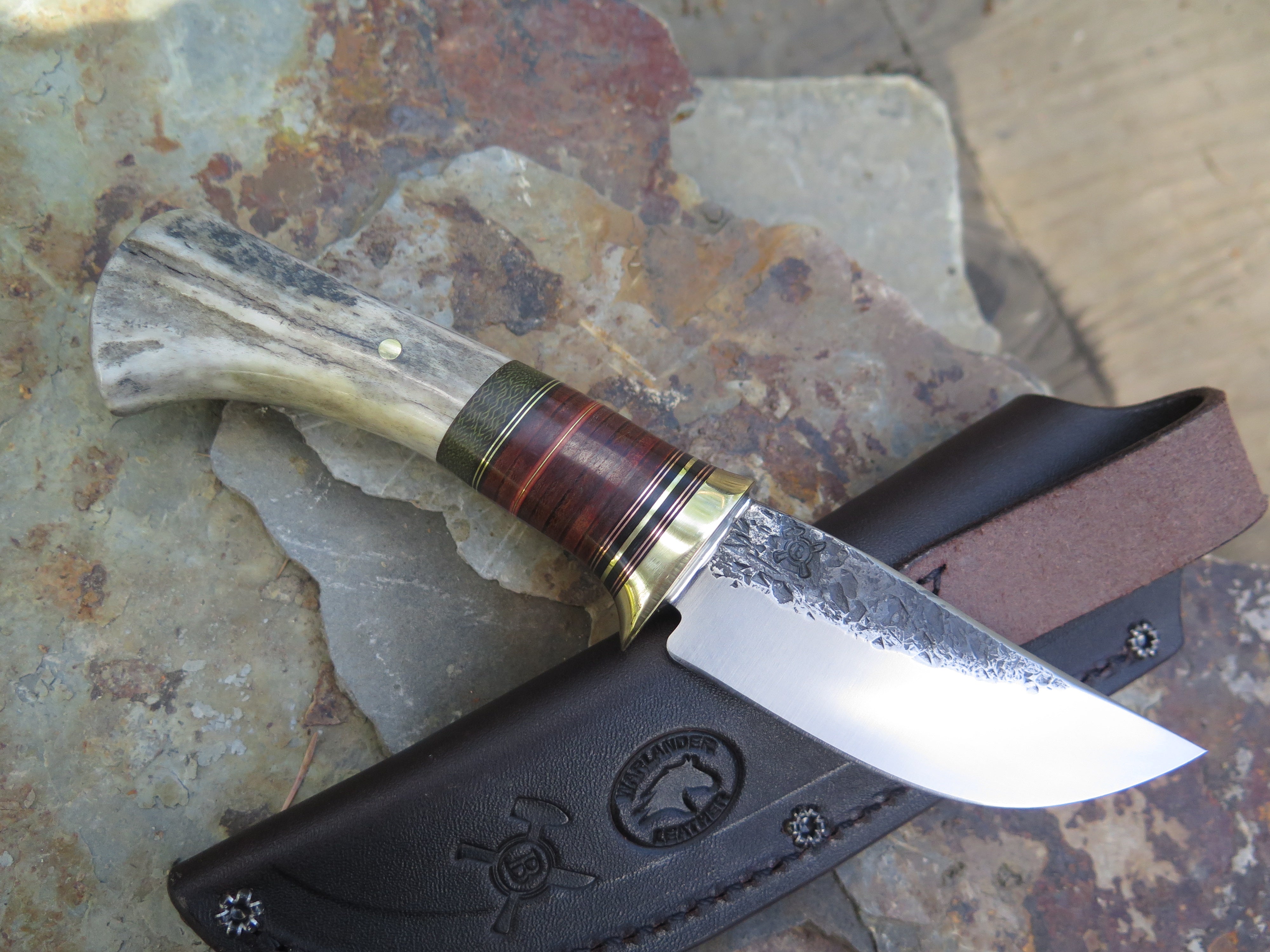 This outstanding new Behring Made© Sharptail is hand forged from 3/16" thick high carbon 01 tool steel and it measures 3 1/2" from tip to guard with a razor sharp hollow grind and our hammermark finish. The brass guard is soldered in place above black and maroon fiber, green micarta, brass and horsehide leather spacers as well as a premium shiras moose antler butt that is pinned through the tang with brass. The overall length measures 7 3/4" and it comes in a classic leather belt pouch sheath.