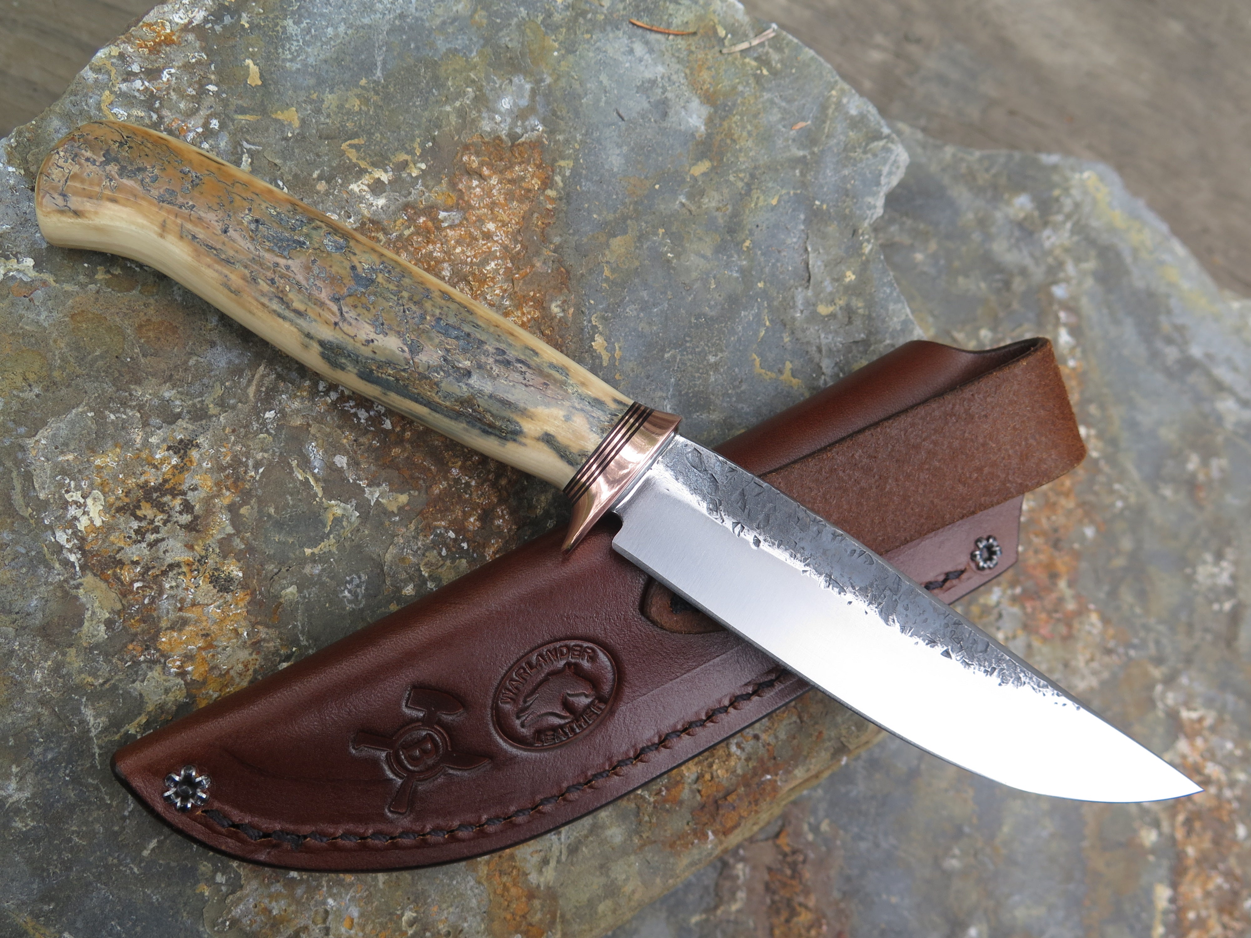 This beautiful Trout & Bird from Behring Made© is hand forged from 1/8" thick high carbon 01 tool steel and it measures 4 1/2" from tip to guard with a razor sharp hollow grind and our hammermark finish. The copper guard is soldered in place above black fiber and copper spacers as well as a premium mammoth ivory handle with a contrast ranging from light creams to deep blues- you will be astounded! Overall length measures 8 7/8" and it comes with a premium tooled pouch sheath.