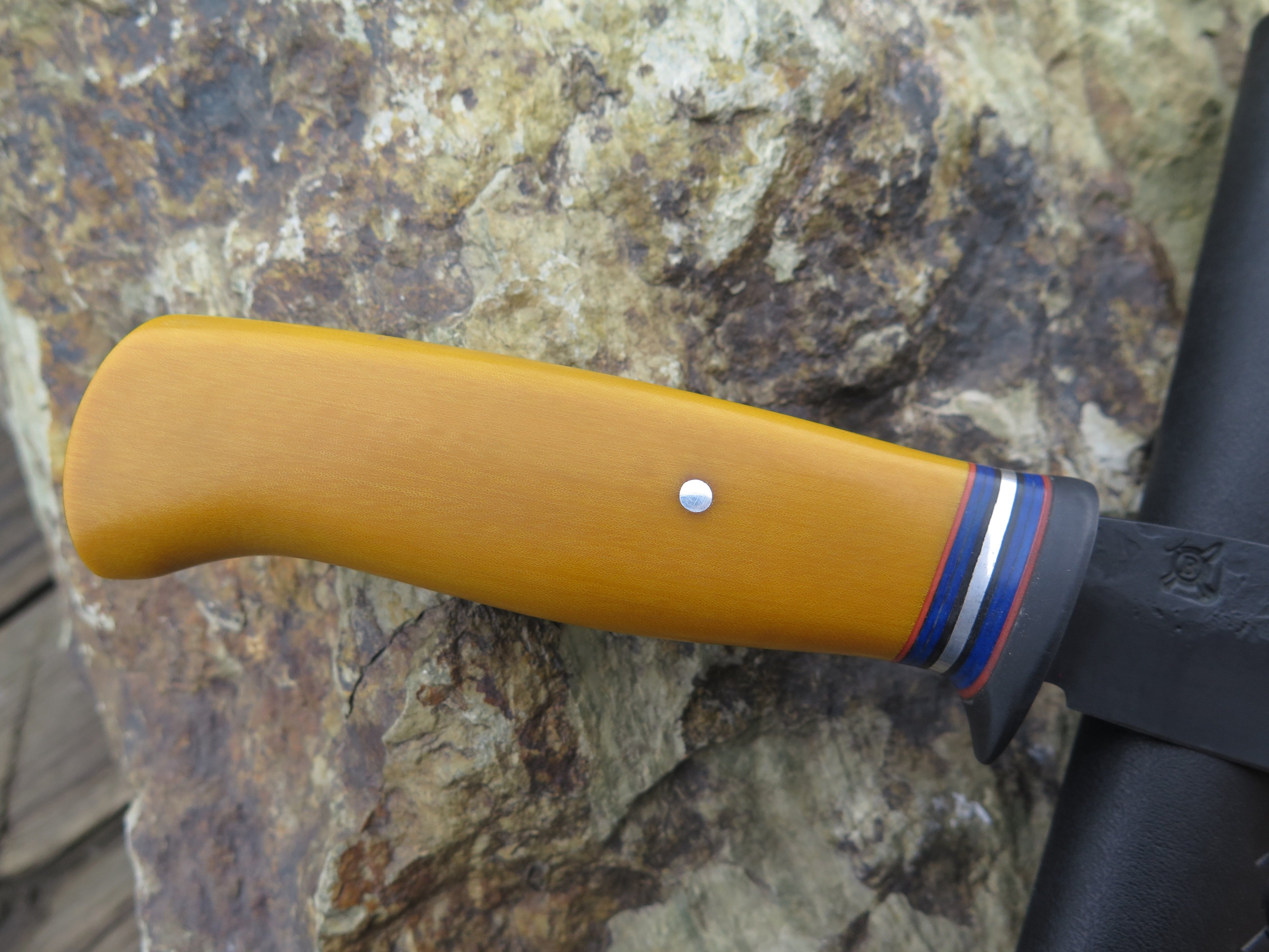 This new Trout & Bird from Behring Made© is a straight forward ultra user that excels in all things hunting, fishing, and steakhouse show-boatin'. The blade is hand forged from 1/8" thick high carbon 01 tool steel and measures 4 3/4" from tip to guard with a razor sharp hollow grind and our forced patina blued finish. The blued steel guard is soldered in place above black, maroon and blue fiber with aluminum spacers atop a classic westinghouse yellow micarta handle that's pinned through the tang with aluminum. Overall length measures 9" and it comes in a Warlander Leather pouch sheath.
