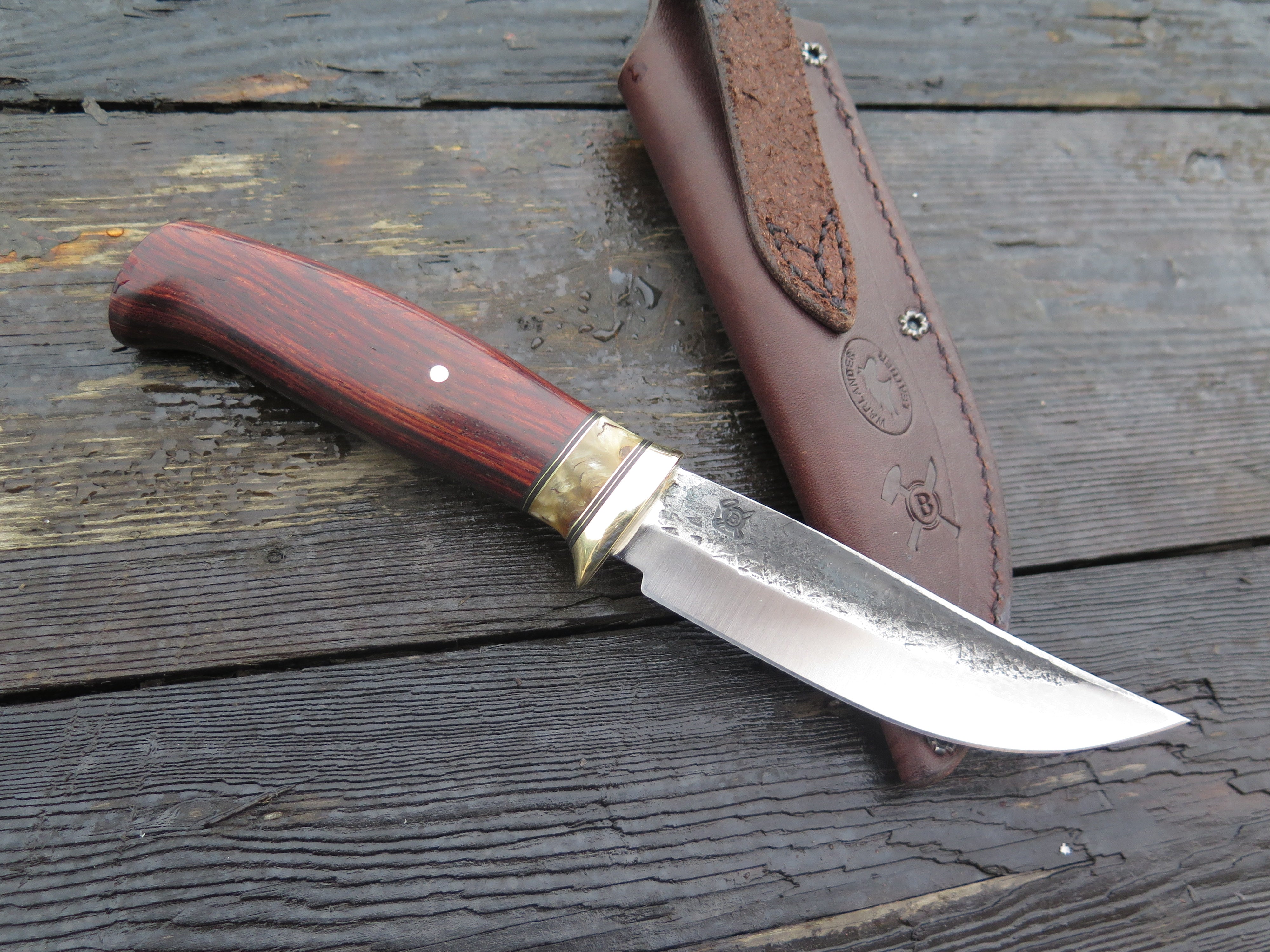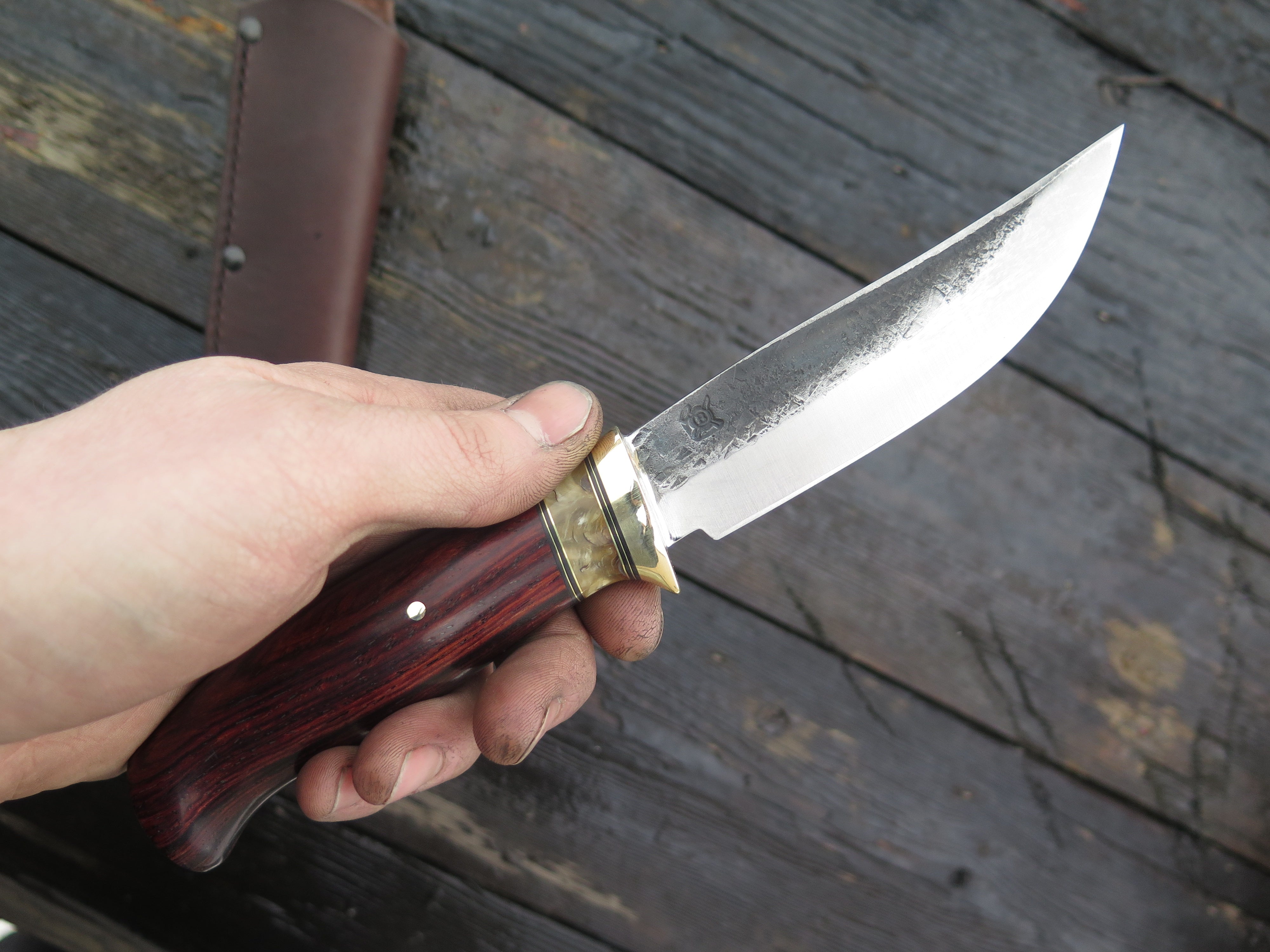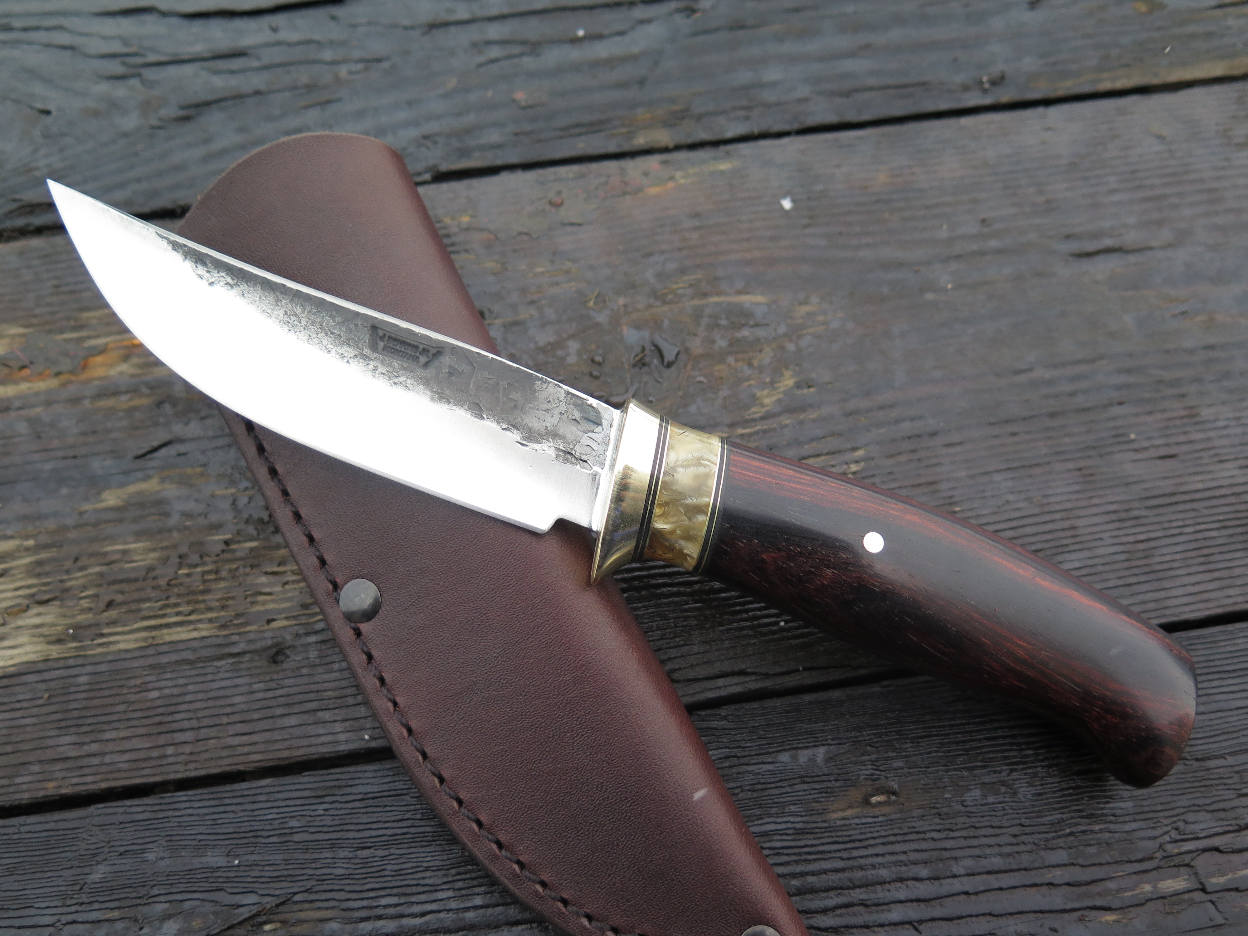 This new Trout & Bird from Behring Made© needs no explanation- it will simply do it all. The blade is hand forged from 1/8" thick high carbon 01 tool steel and it measures 4 1/2" from tip to guard with a razor sharp hollow grind and our hammermark finish. The brass guard is soldered in place above black fiber, brass and musk ox boss spacers. The cocobolo wood handle is pinned through the tang with brass and the overall length measures 8 7/8", plus it comes in a classic belt pouch sheath and is guaranteed for life.