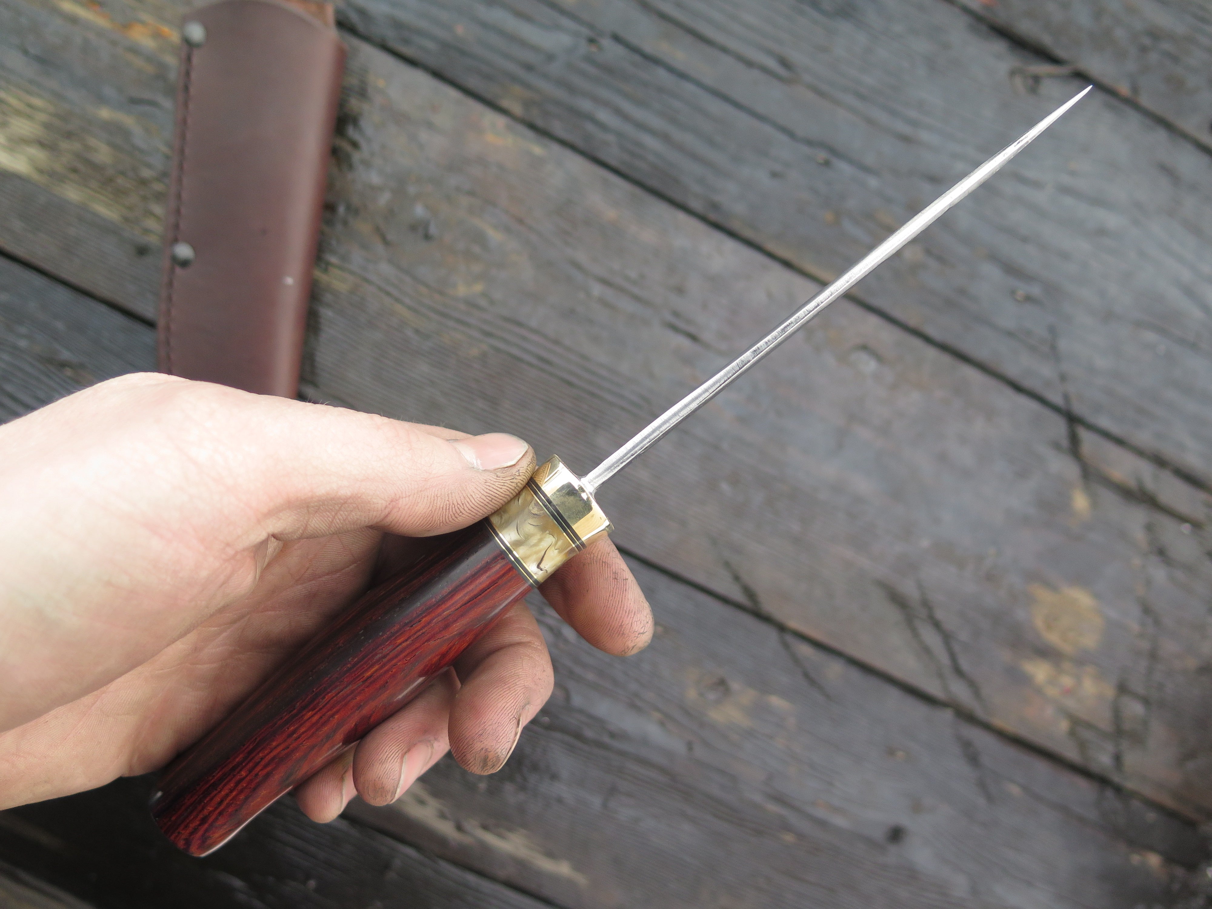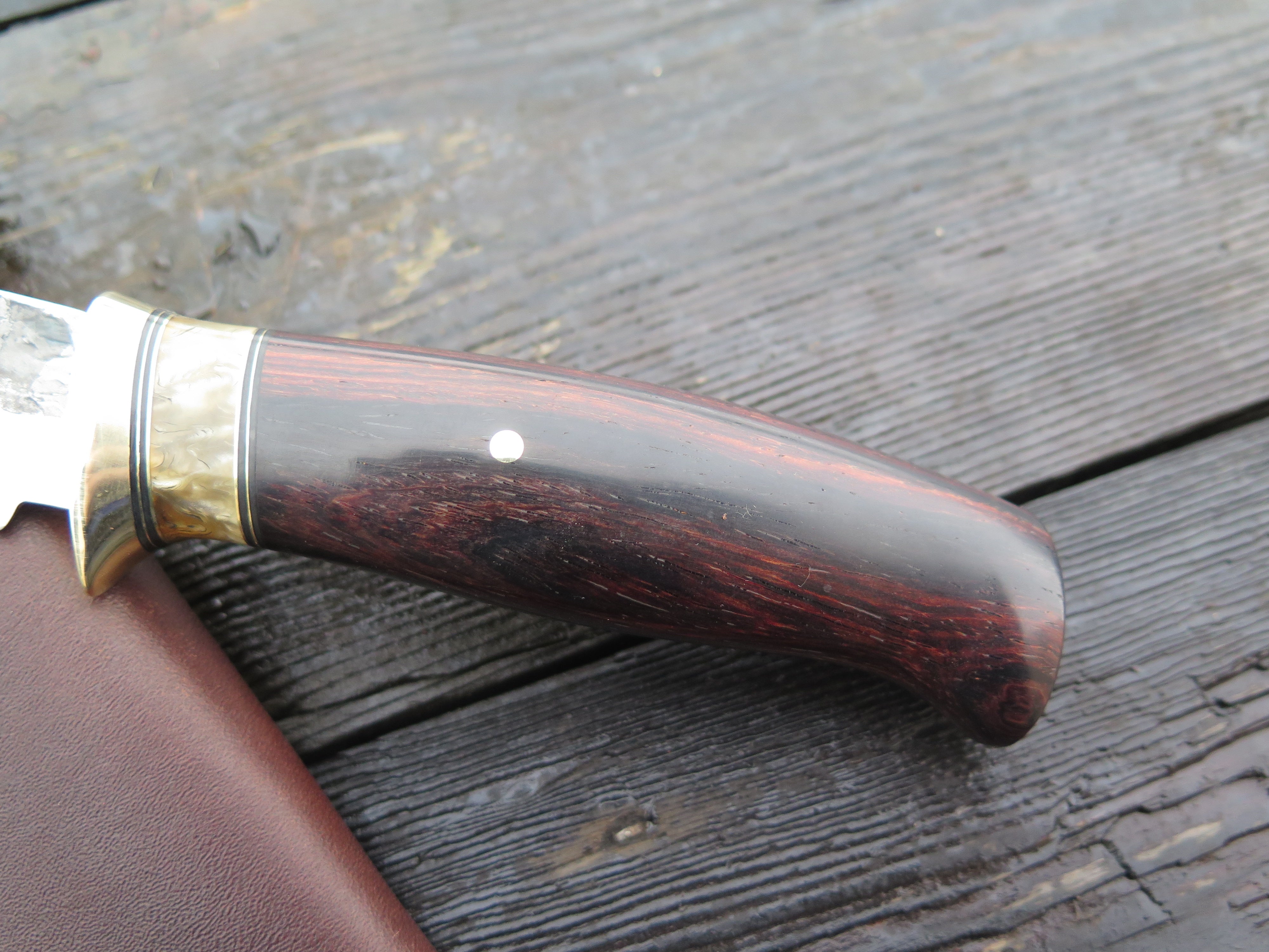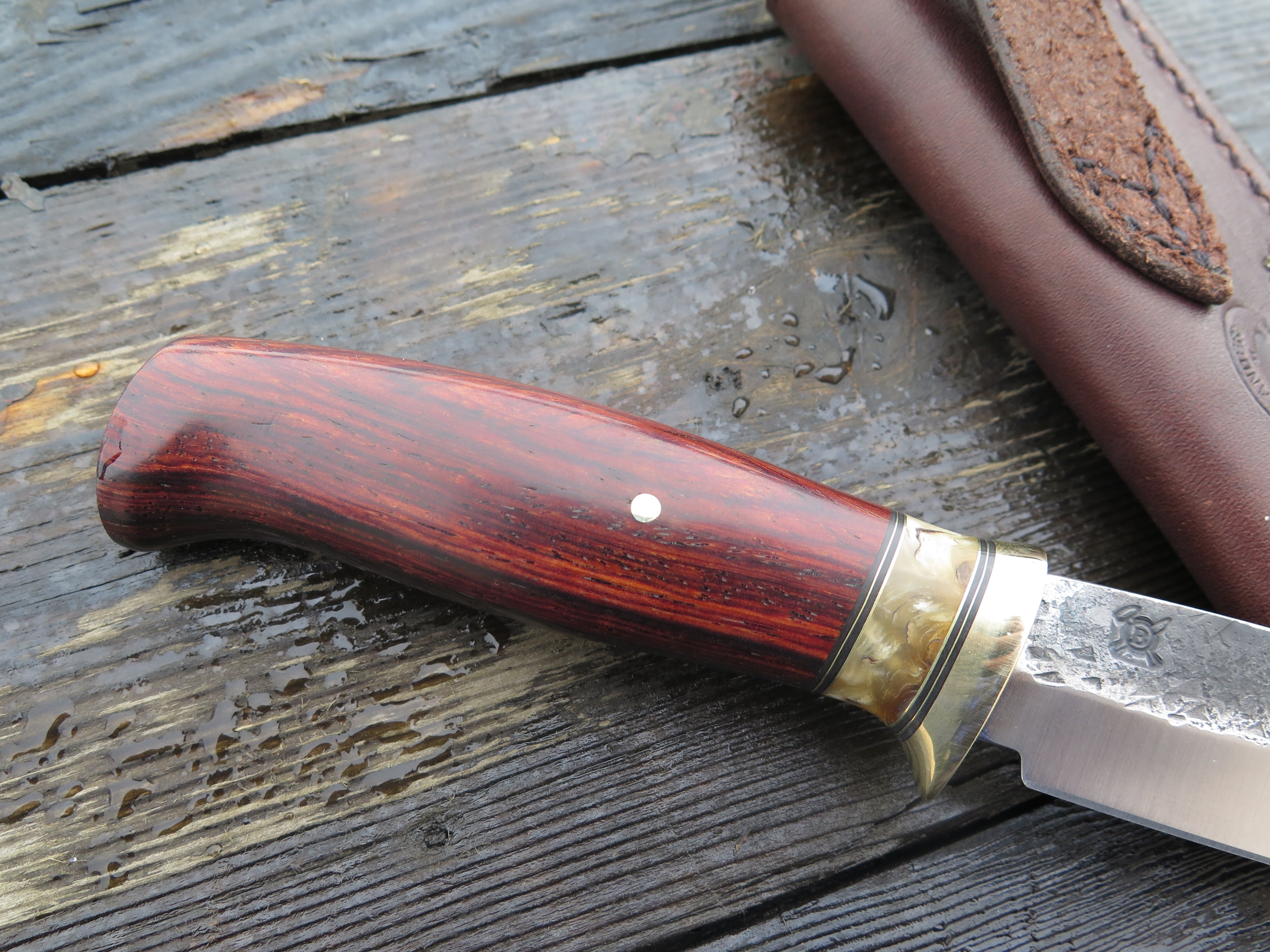 This new Trout & Bird from Behring Made© needs no explanation- it will simply do it all. The blade is hand forged from 1/8" thick high carbon 01 tool steel and it measures 4 1/2" from tip to guard with a razor sharp hollow grind and our hammermark finish. The brass guard is soldered in place above black fiber, brass and musk ox boss spacers. The cocobolo wood handle is pinned through the tang with brass and the overall length measures 8 7/8", plus it comes in a classic belt pouch sheath and is guaranteed for life.