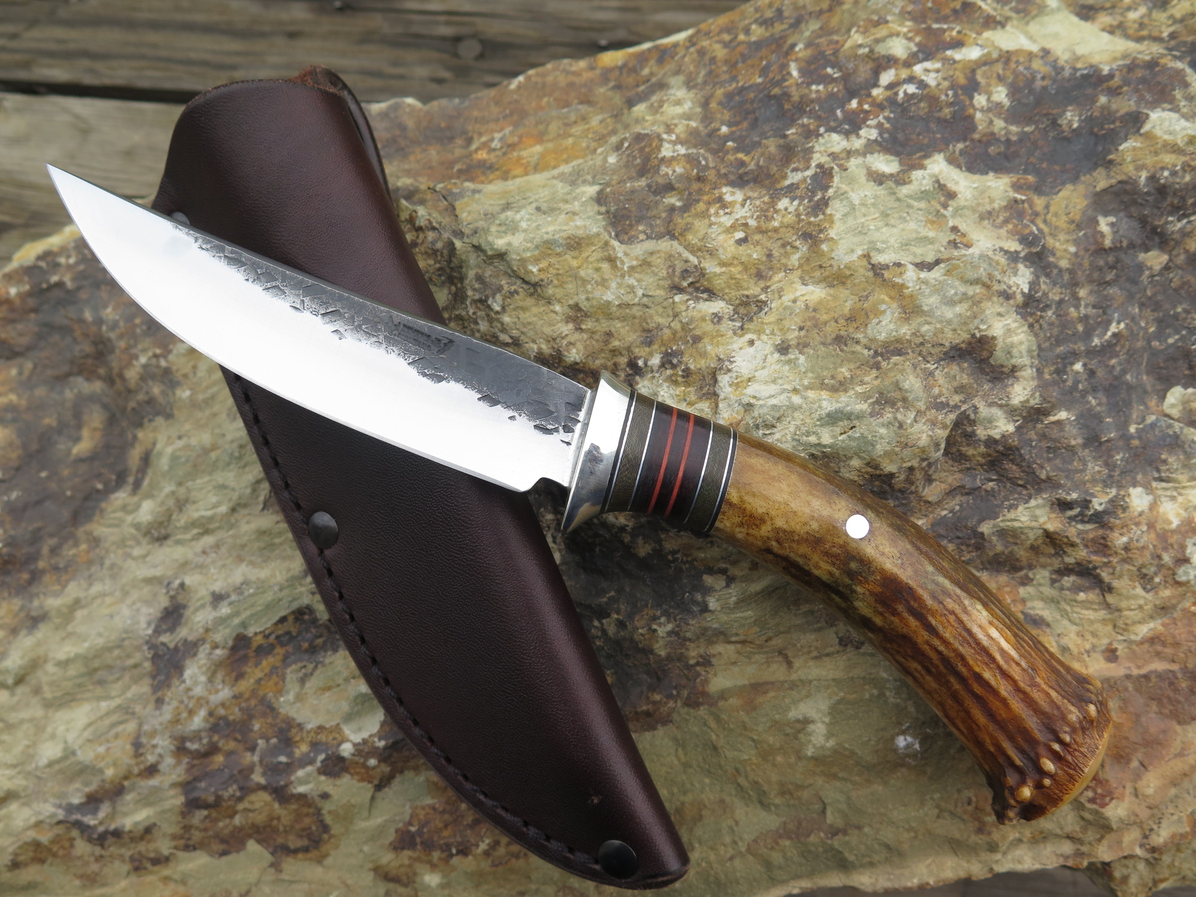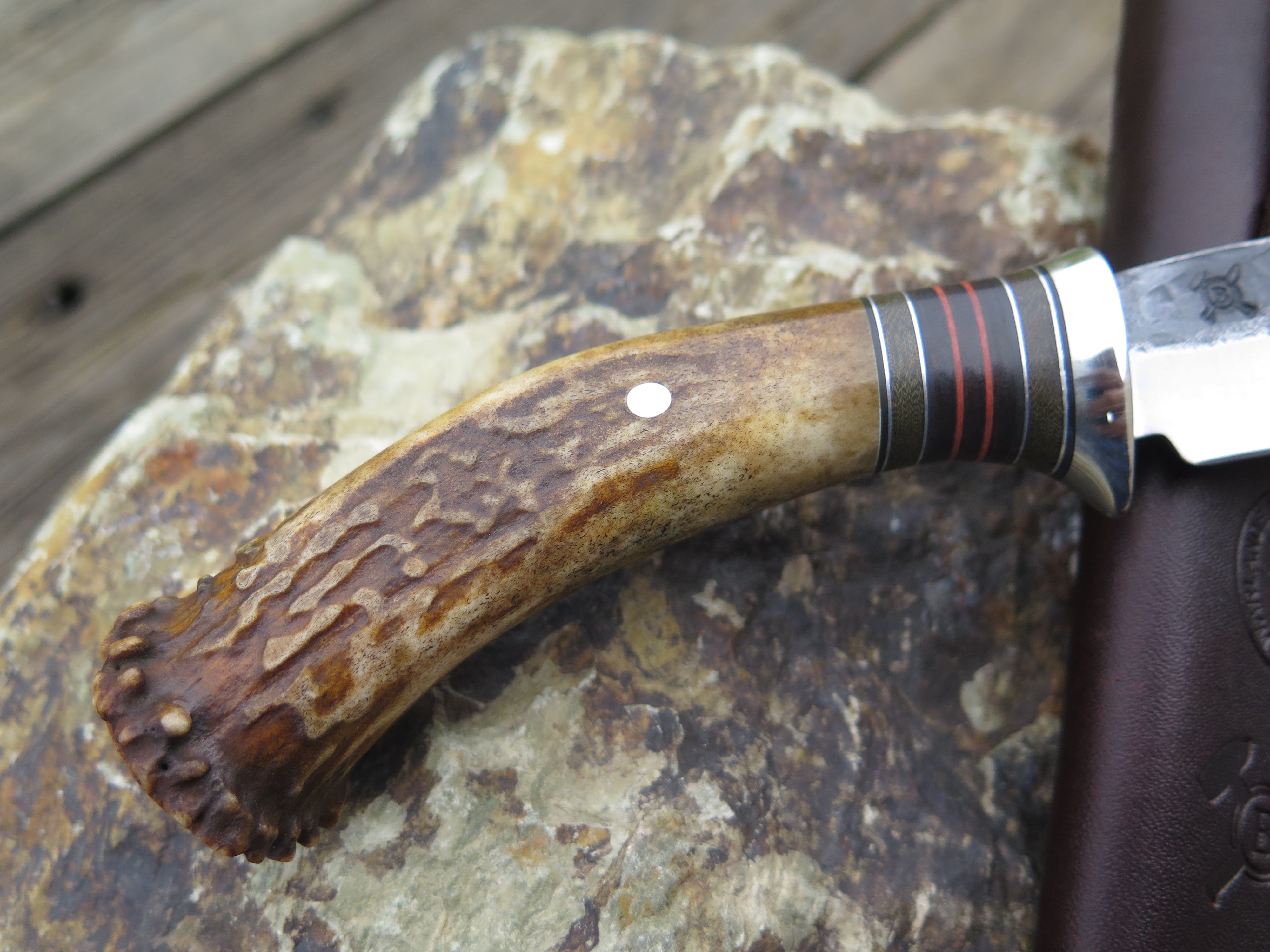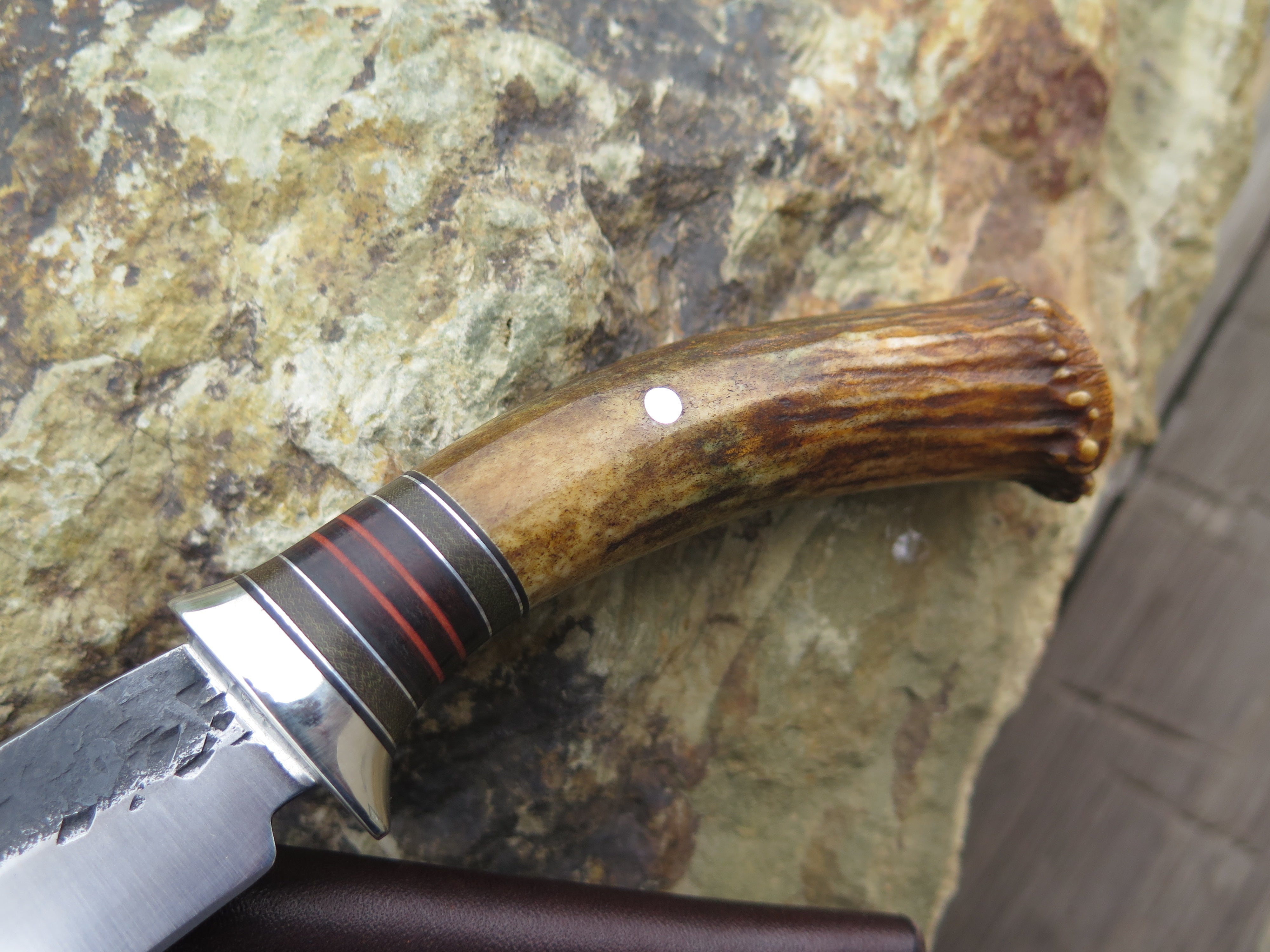 This classic Trout and Bird from Behring Made© is hand forged from 1/8" thick high carbon 01 tool steel and it measures 4 1/2" from tip to guard with a razor sharp hollow grind and our hammermark finish. The nickel silver guard is soldered in place above black, maroon, green, aluminum and horsehide leather spacers while the handle is a premium crown stag carver that we pinned through the tang with aluminum. The overall length measures 9" and it comes in a simple belt pouch sheath, ready for action.