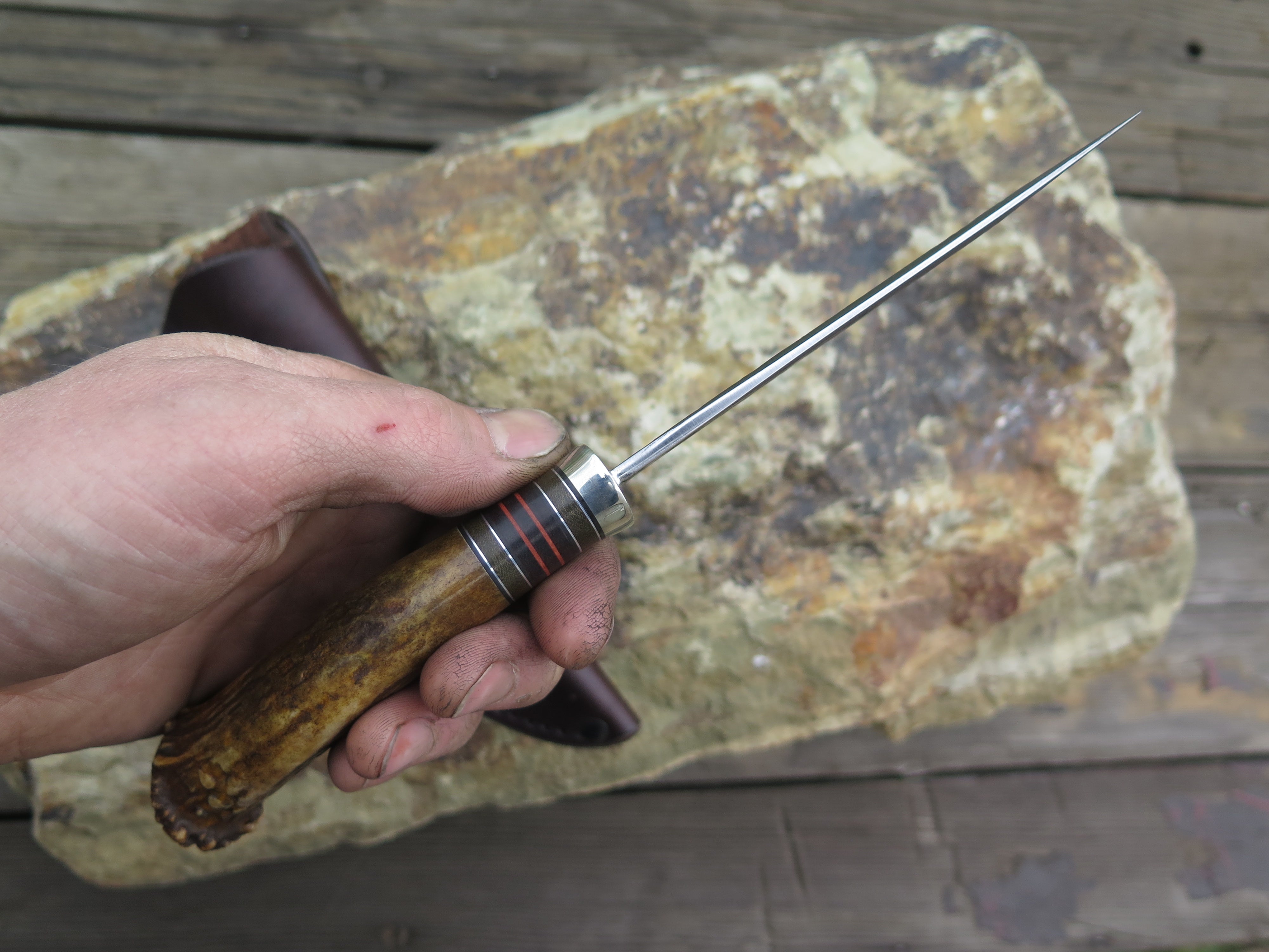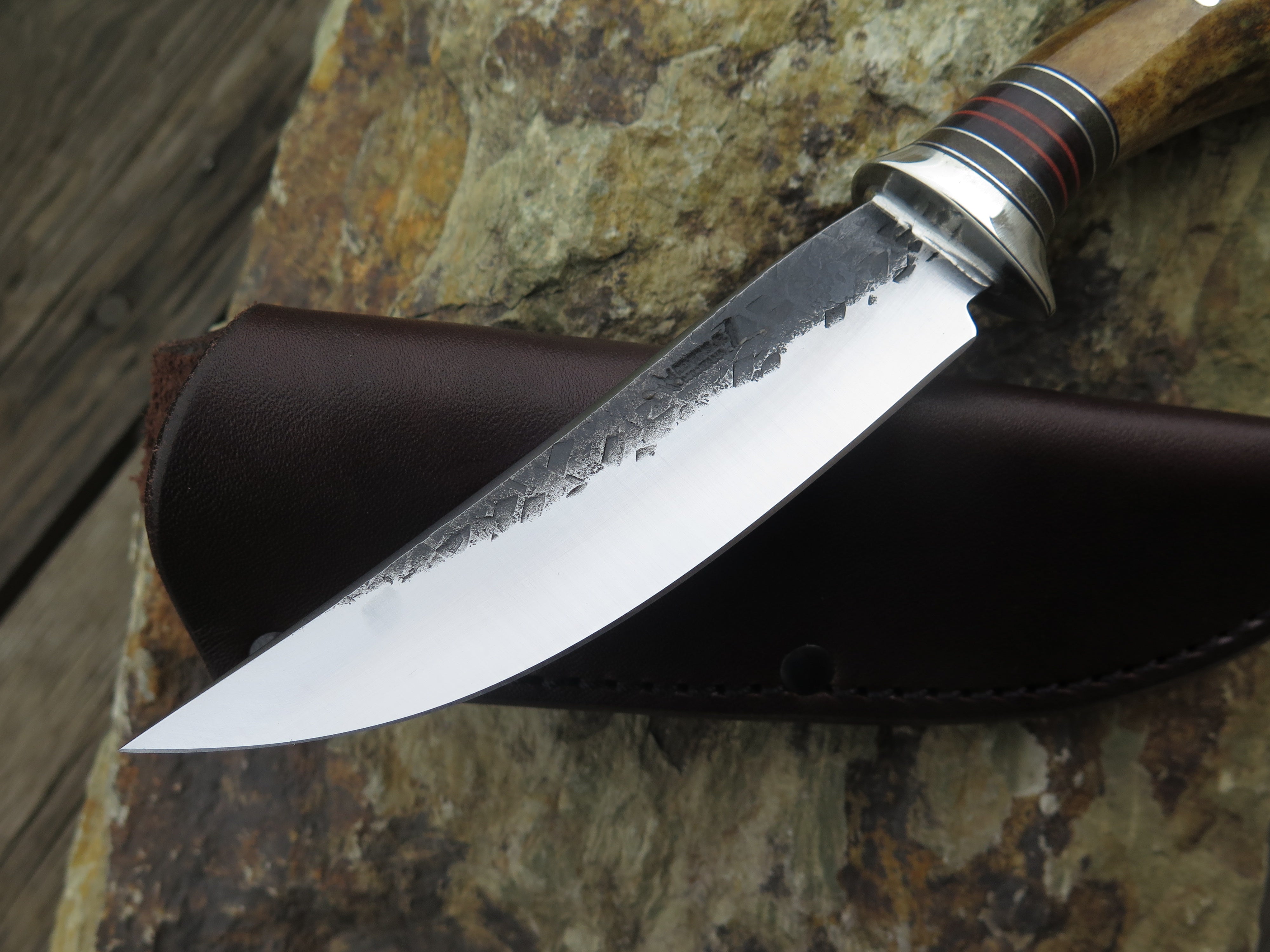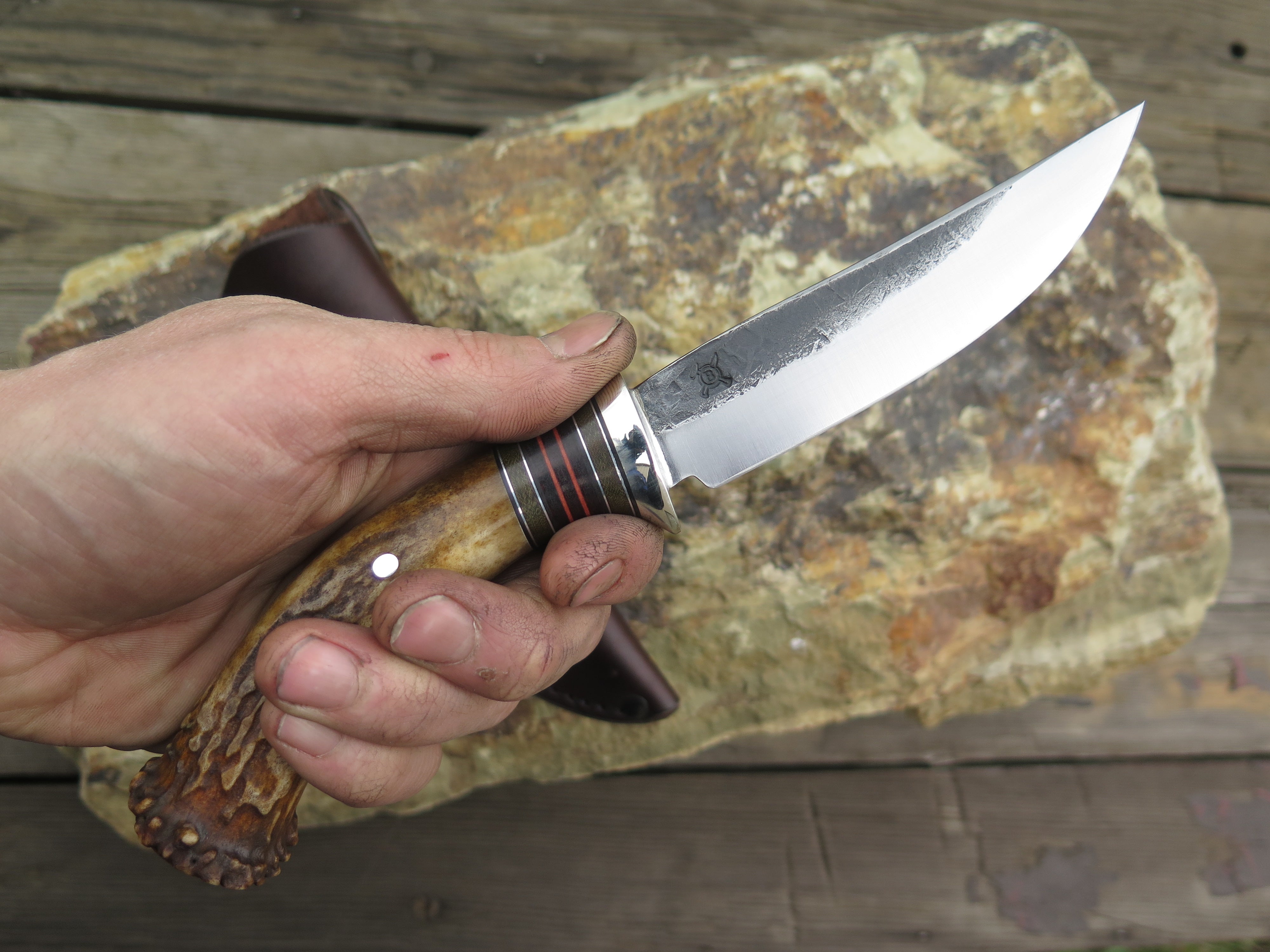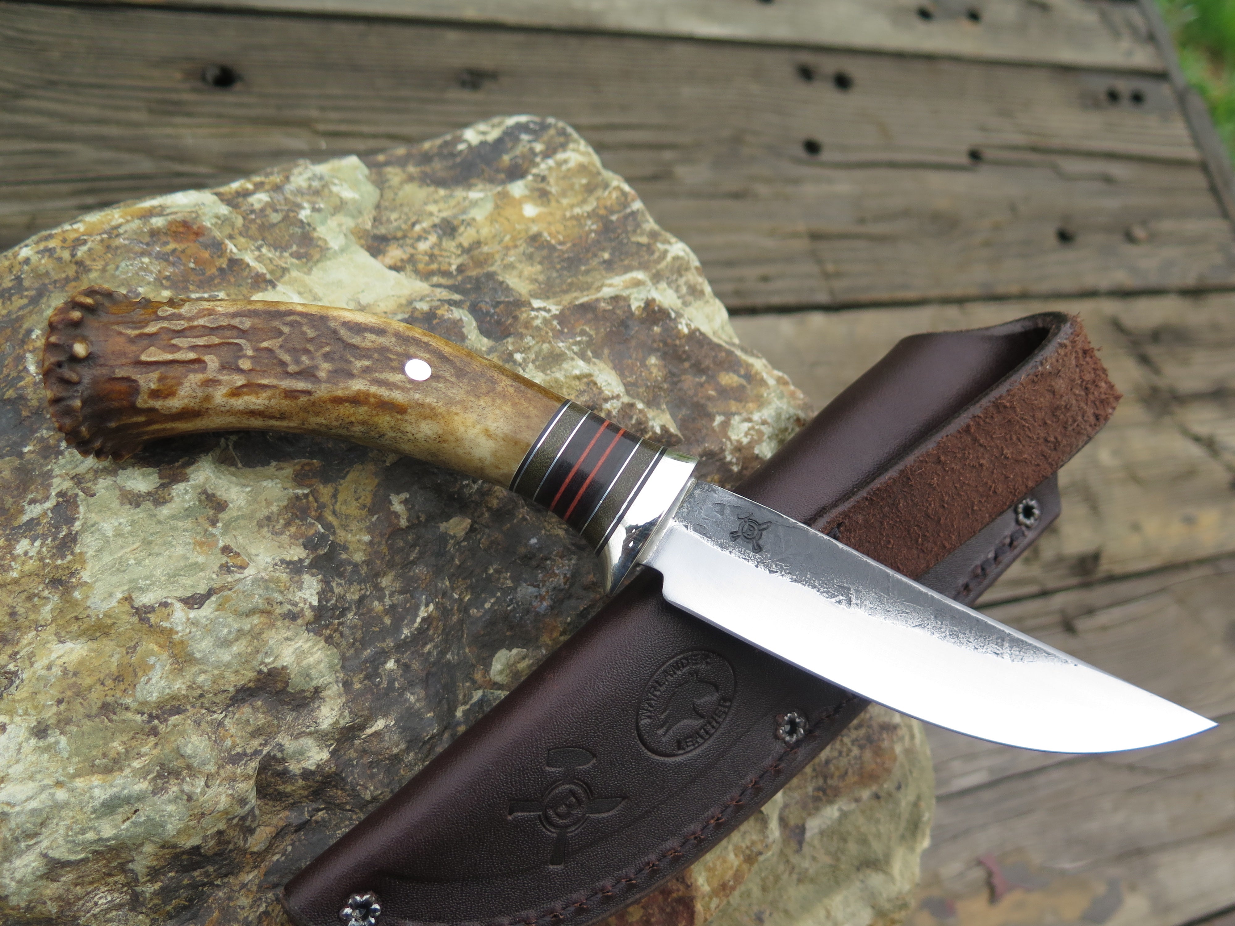 This classic Trout and Bird from Behring Made© is hand forged from 1/8" thick high carbon 01 tool steel and it measures 4 1/2" from tip to guard with a razor sharp hollow grind and our hammermark finish. The nickel silver guard is soldered in place above black, maroon, green, aluminum and horsehide leather spacers while the handle is a premium crown stag carver that we pinned through the tang with aluminum. The overall length measures 9" and it comes in a simple belt pouch sheath, ready for action.