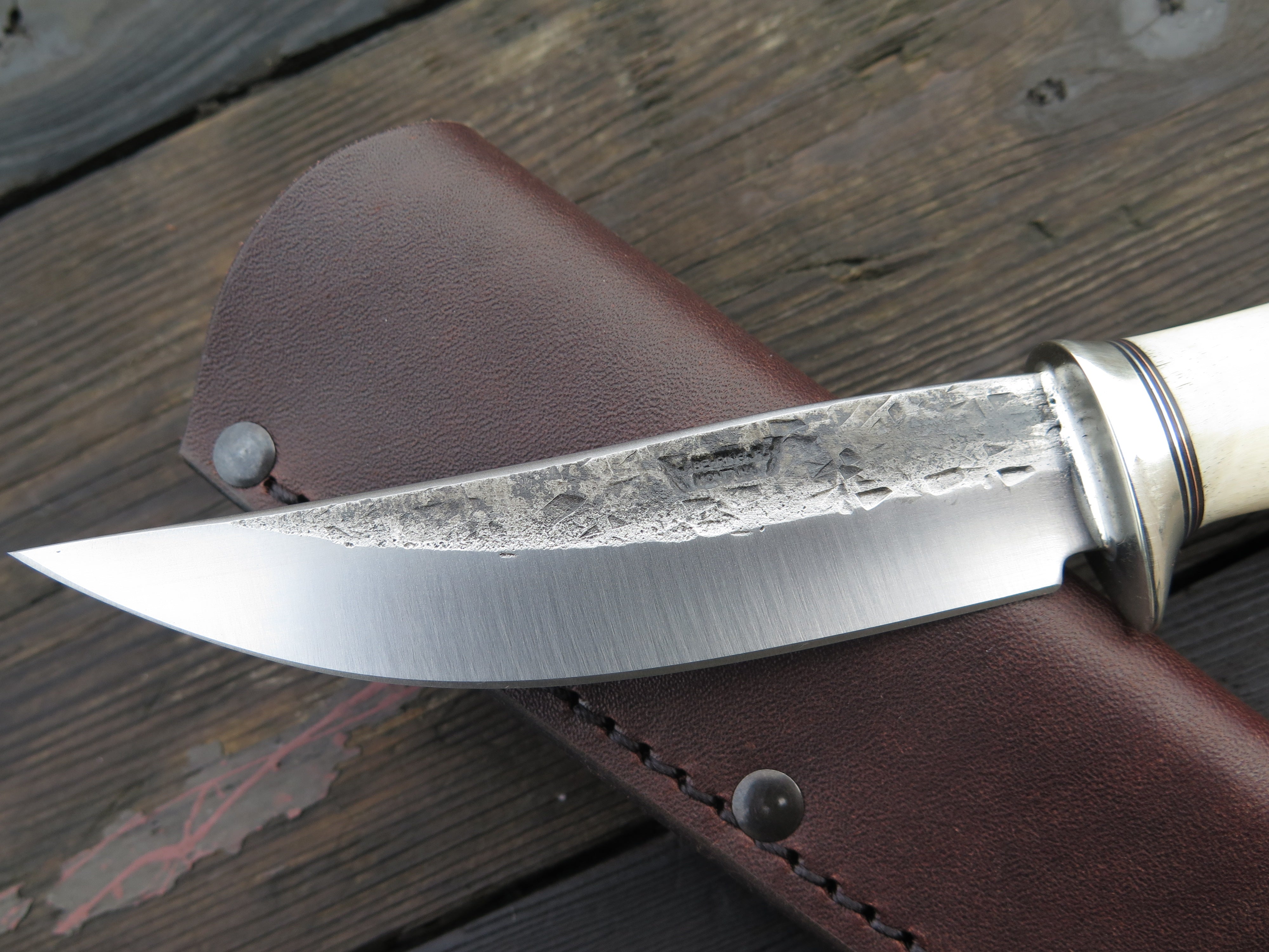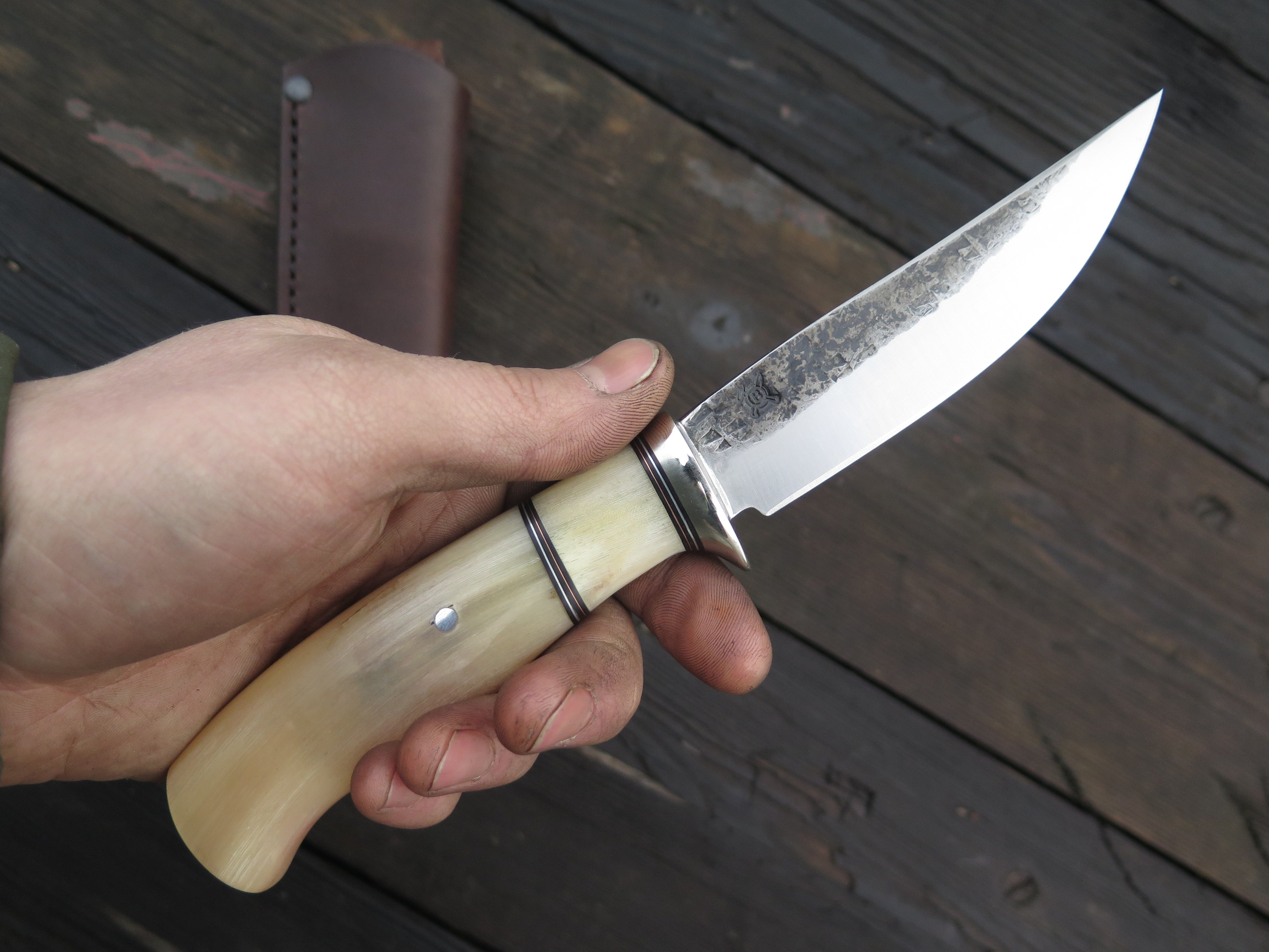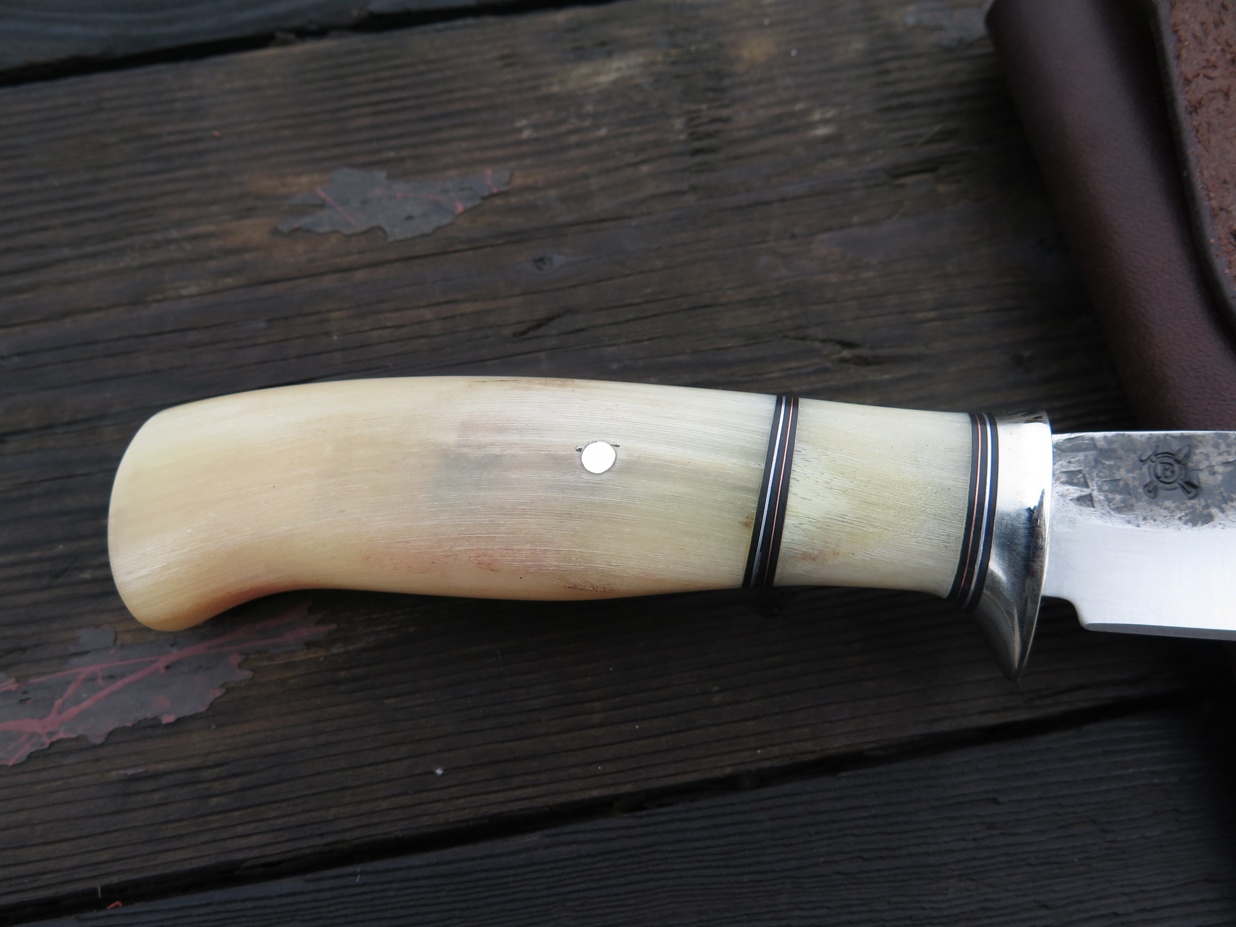 This beautiful Trout & Bird from Behring Made© is hand forged from 1/8" thick high carbon 01 tool steel and it measures 4 1/2" from tip to guard with a razor sharp hollow grind and our hammermark finish. The nickel silver guard is soldered in place above black fiber, aluminum and copper spacers with a Dall sheep horn spacer in the center as well as the remainder of the handle. The texture and contrasts are simply remarkable! The overall length measures 9" and this one comes in a classic brown pouch sheath.