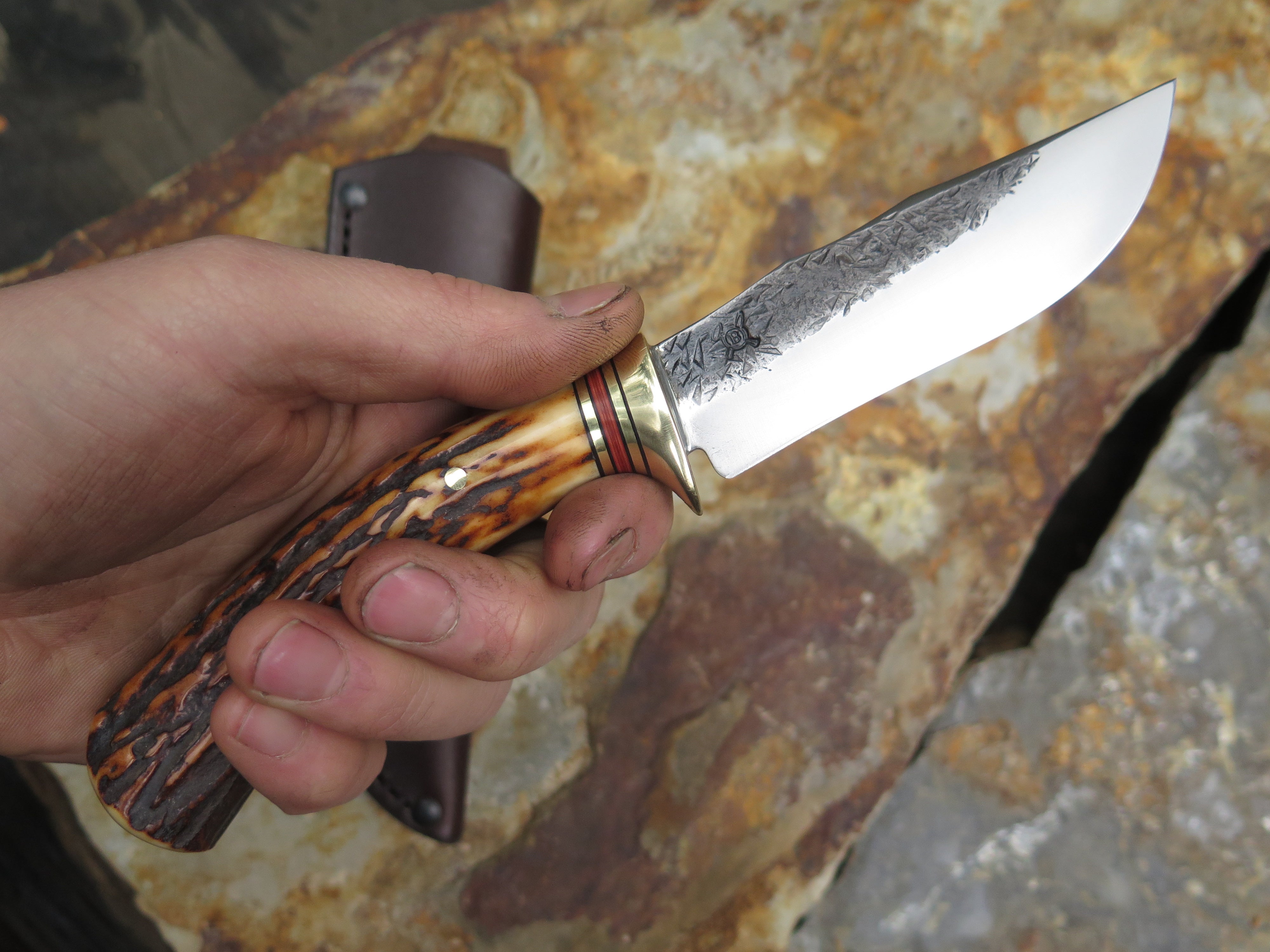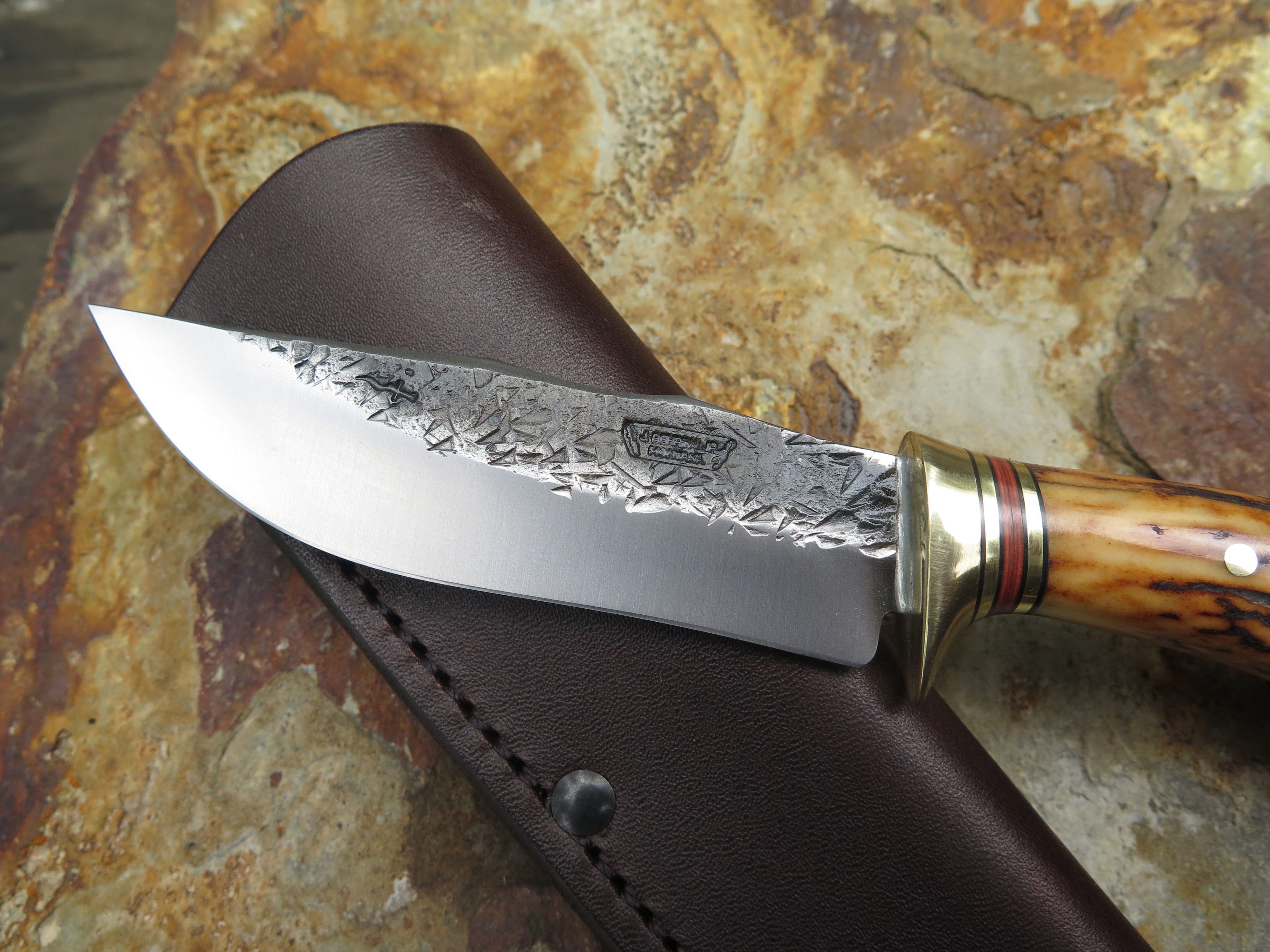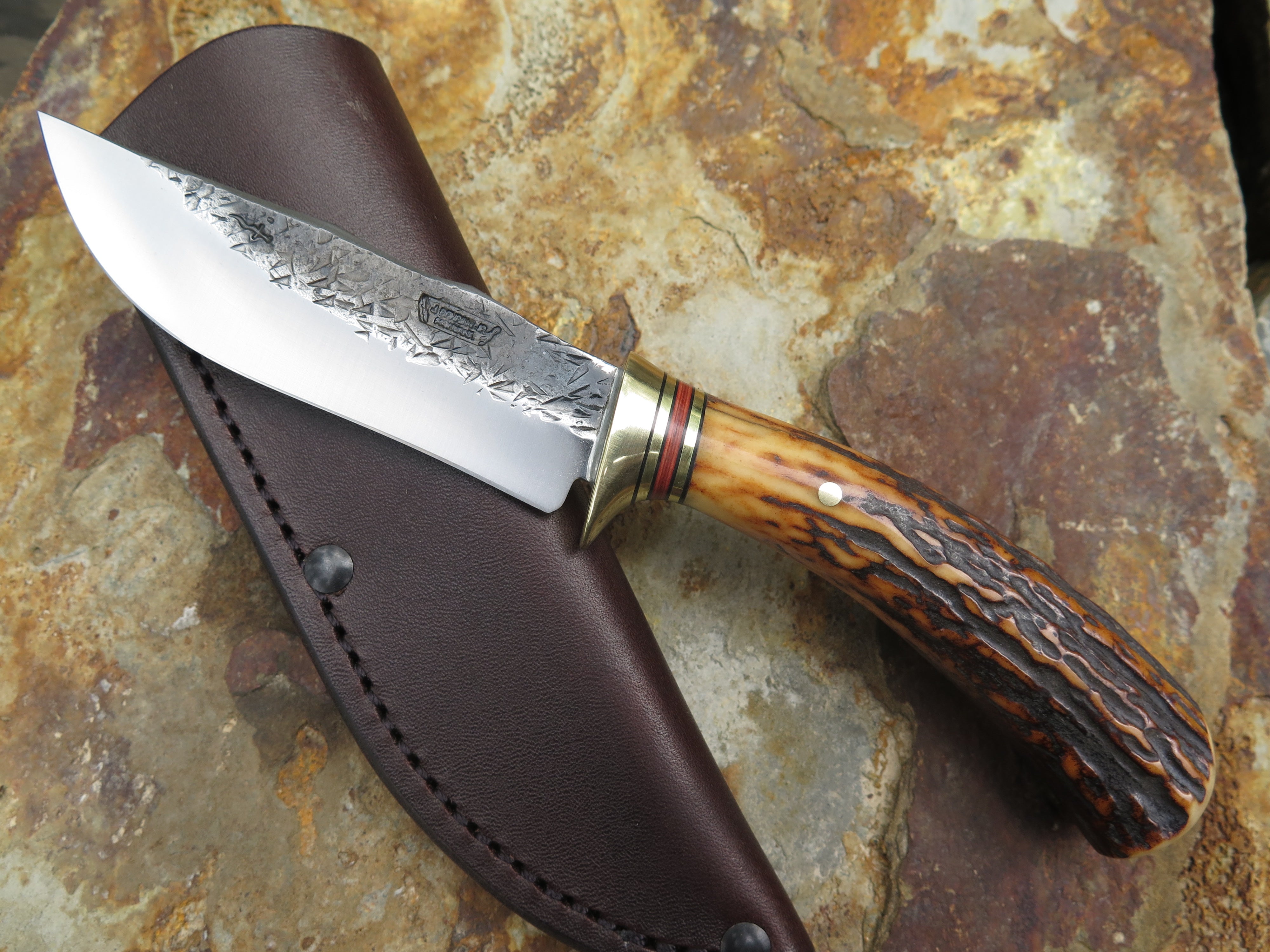 This Scagel Tribute from Behring Made© is hand forged from 1/8" thick high carbon 01 tool steel and it measures 4 1/4" from tip to guard with a razor sharp hollow grind and our hammermark finish. The brass guard is soldered in place above a classic stack of black and maroon fiber with brass spacers as well as a premium sambar stag handle that's pinned through the tang with brass. The overall length measures 8 1/2" and it comes in a classic leather belt pouch sheath.