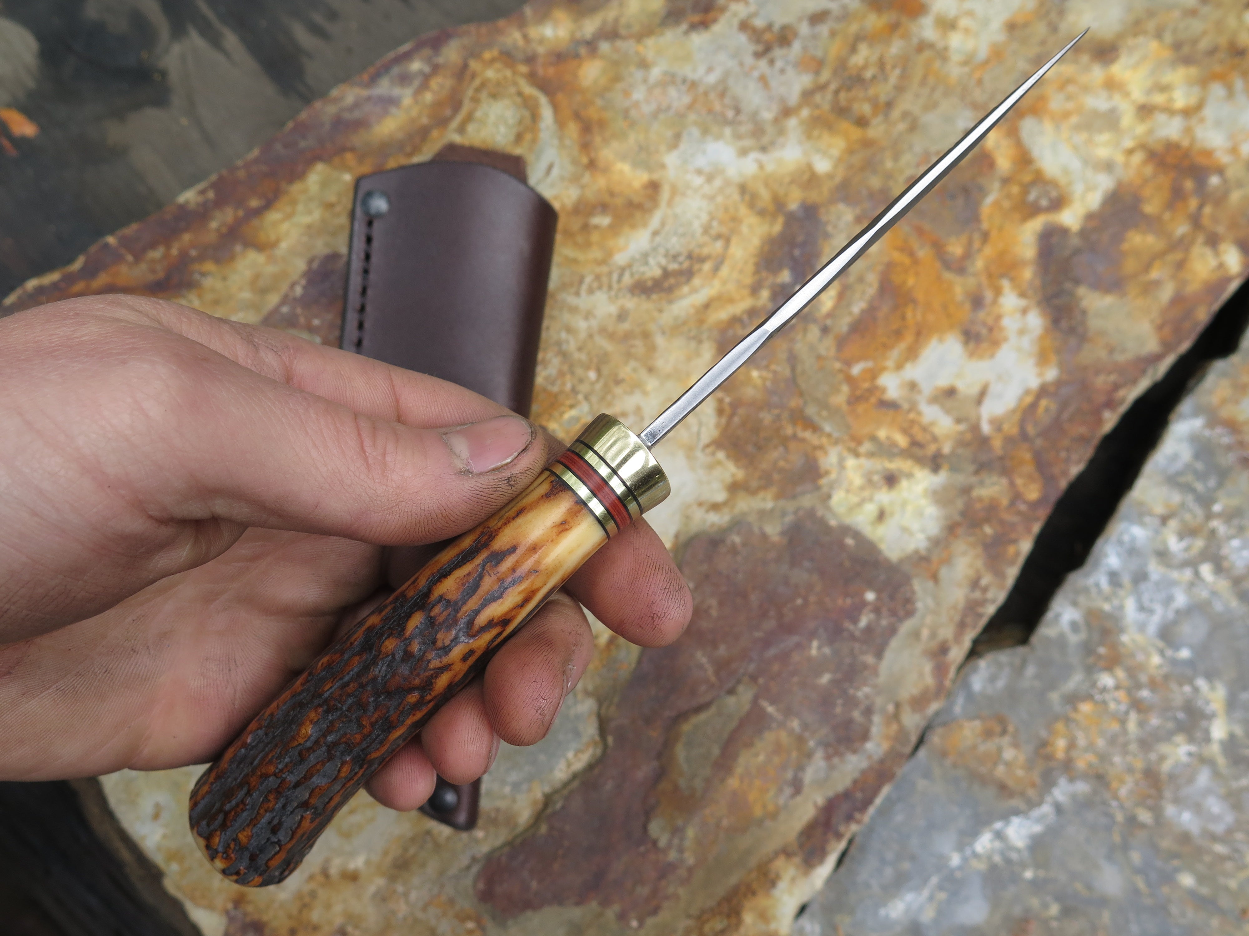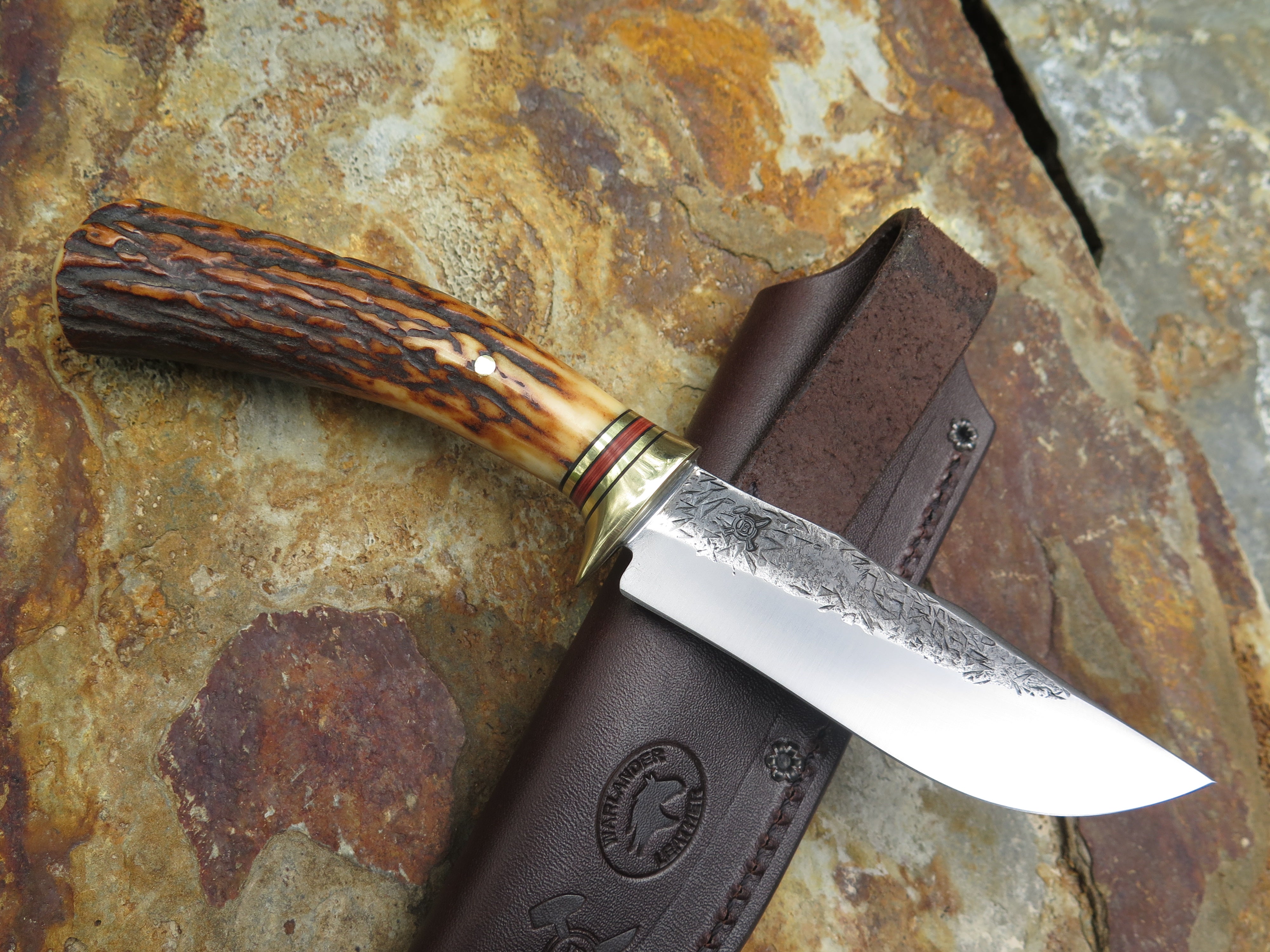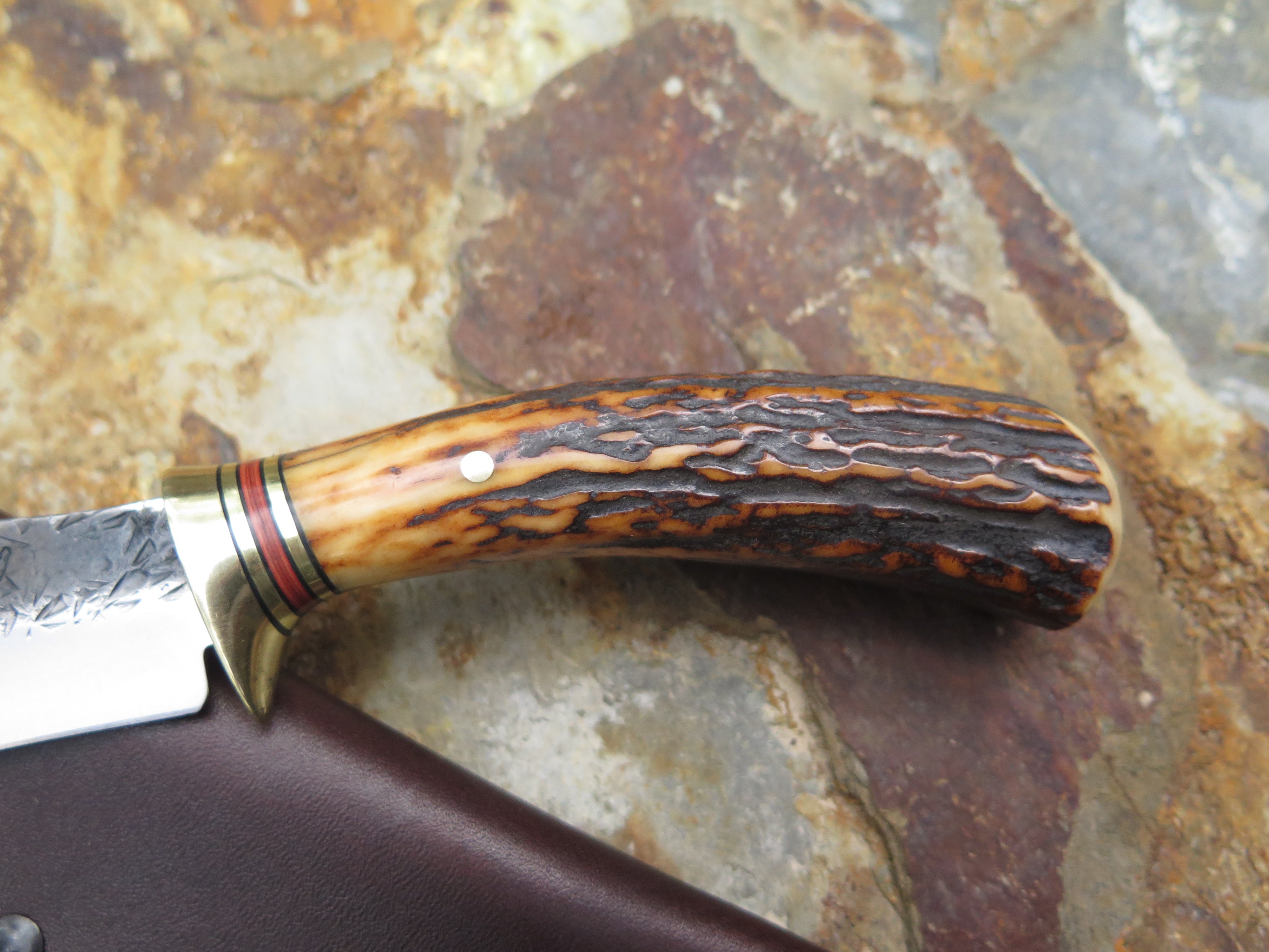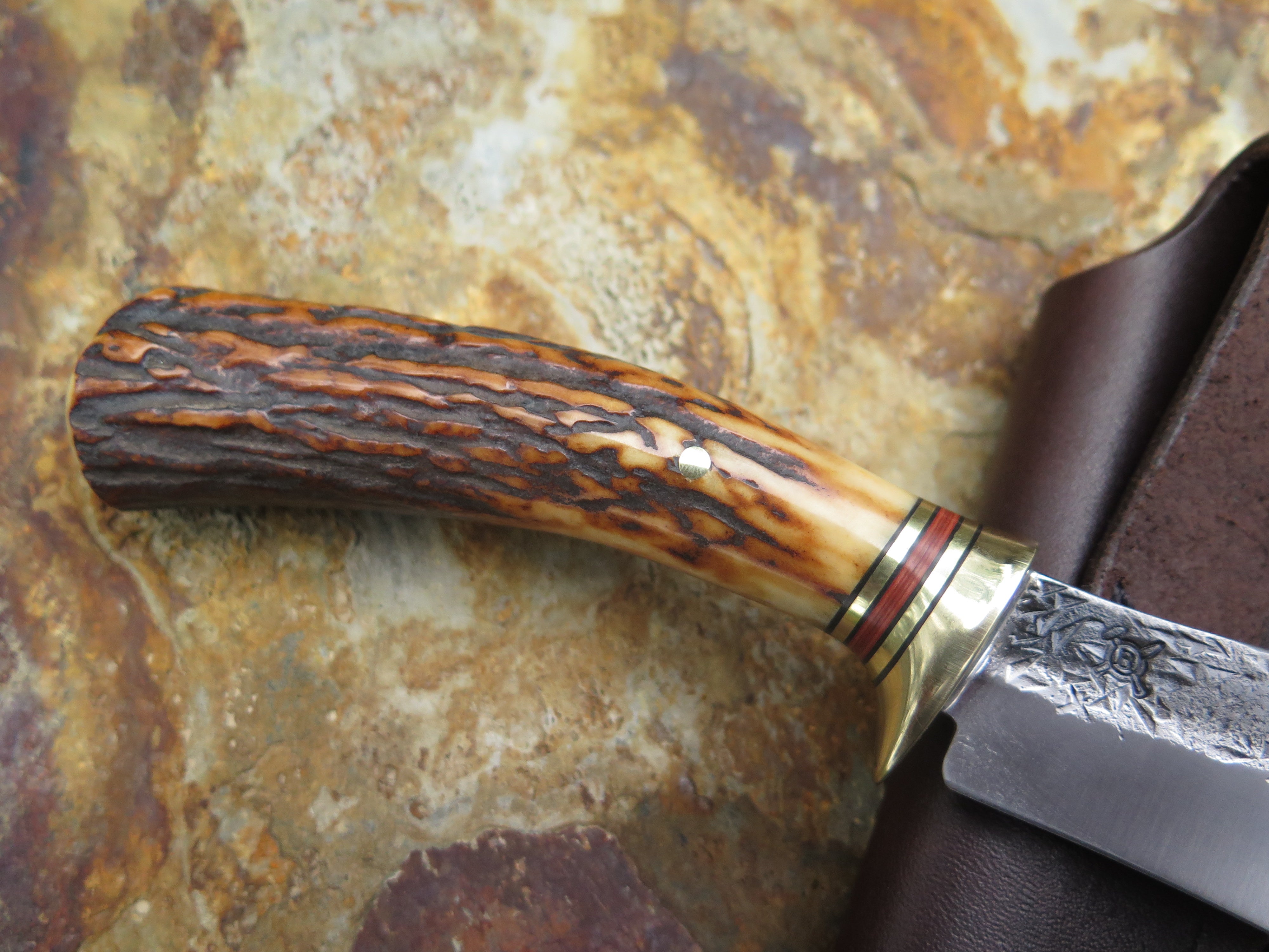 This Scagel Tribute from Behring Made© is hand forged from 1/8" thick high carbon 01 tool steel and it measures 4 1/4" from tip to guard with a razor sharp hollow grind and our hammermark finish. The brass guard is soldered in place above a classic stack of black and maroon fiber with brass spacers as well as a premium sambar stag handle that's pinned through the tang with brass. The overall length measures 8 1/2" and it comes in a classic leather belt pouch sheath.