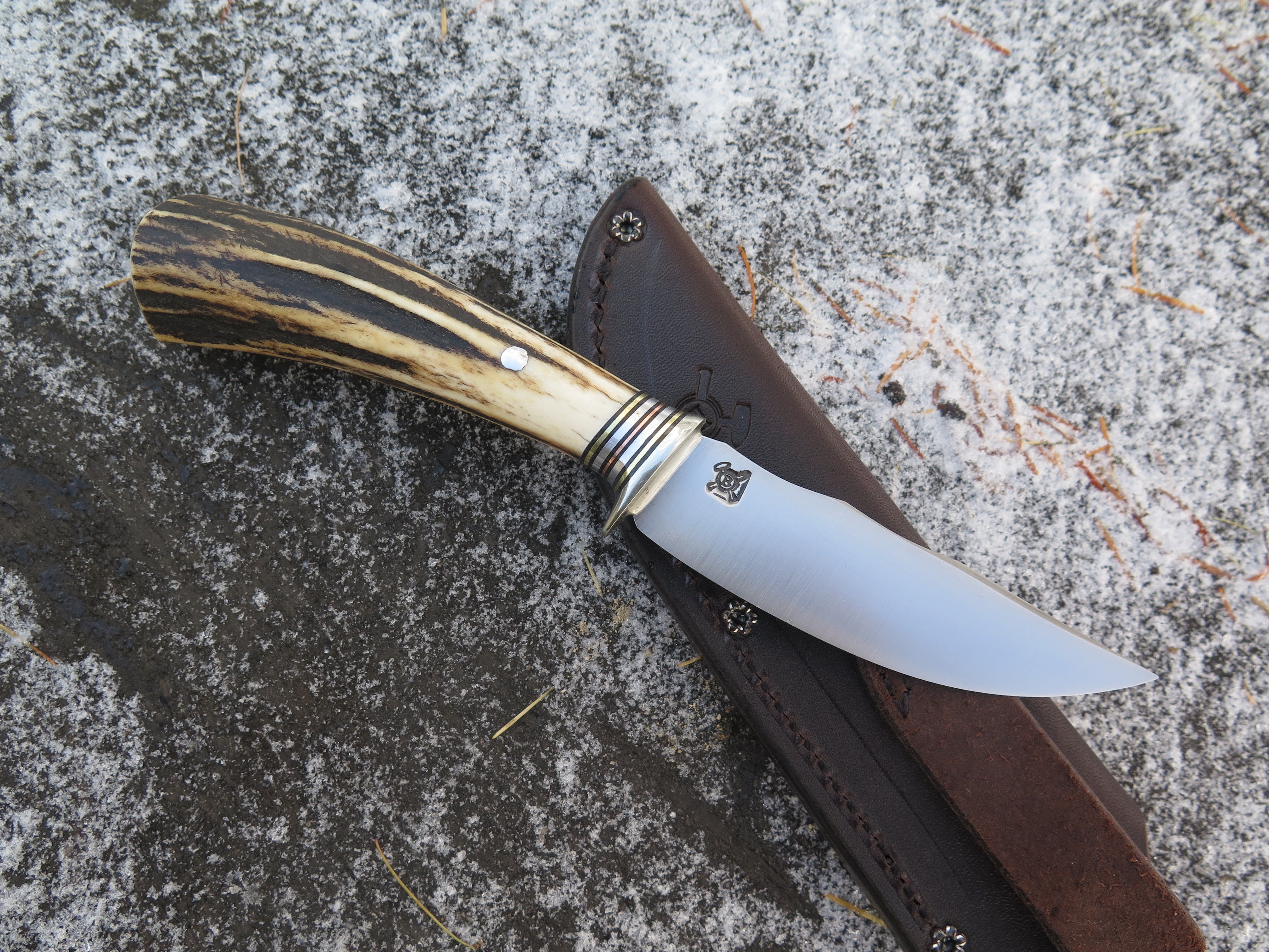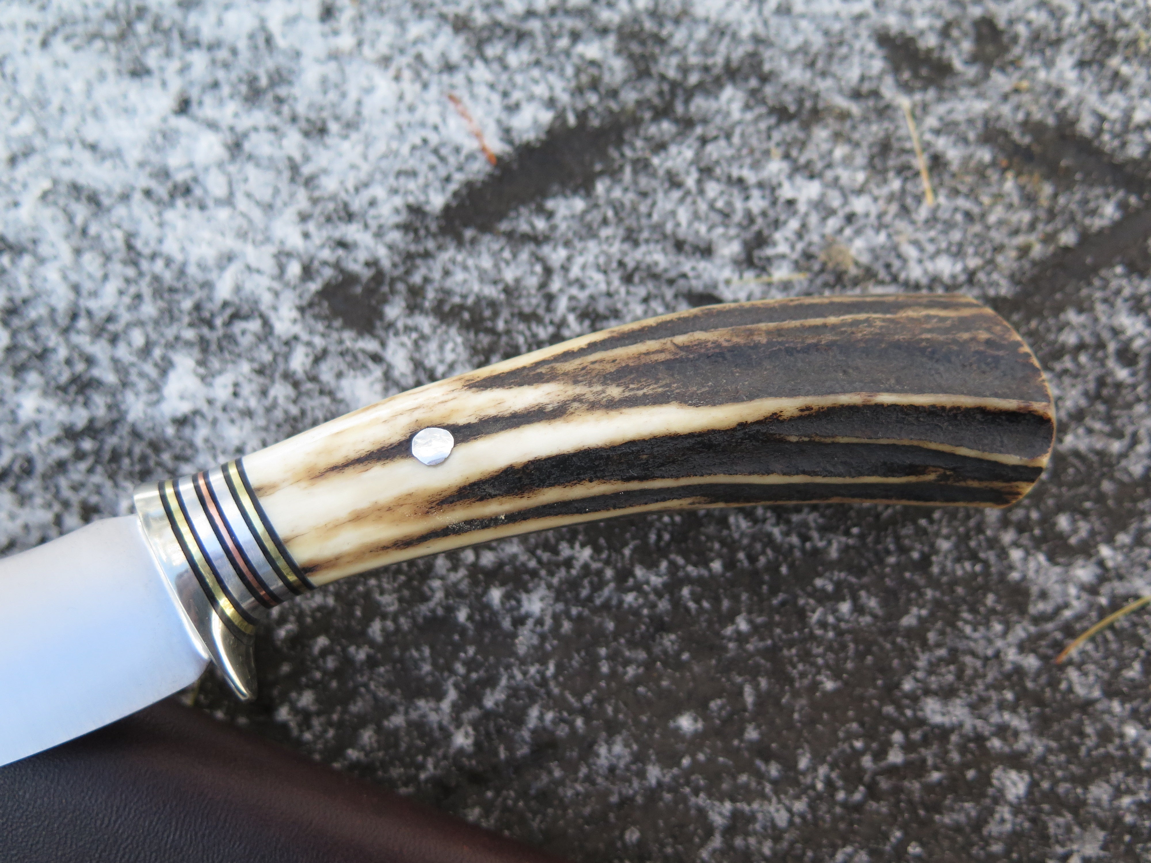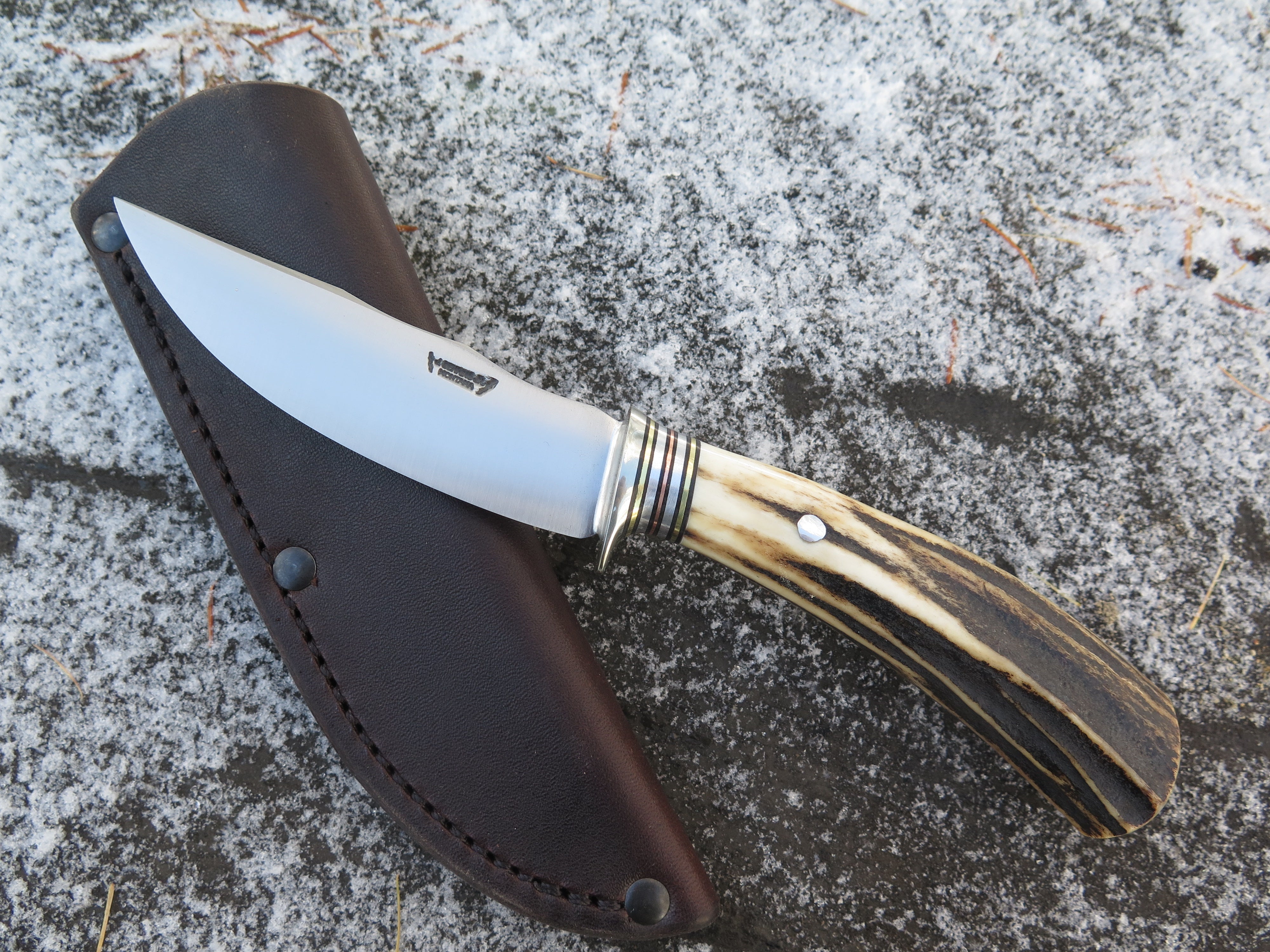 This new one from Behring Made© is inspired by the great Bill Scagel and some of his clip point designs. It is hand forged from 1/8" thick high carbon 01 tool steel and measures 4" from tip to guard with a razor sharp convex grind. The nickel silver guard is soldered in place above black fiber, copper, aluminum and brass spacers with a premium sambar stag handle that we pinned through the tang with aluminum. The overall length rings in at 8 1/2" and it comes in a classic leather belt pouch sheath, guaranteed for life!