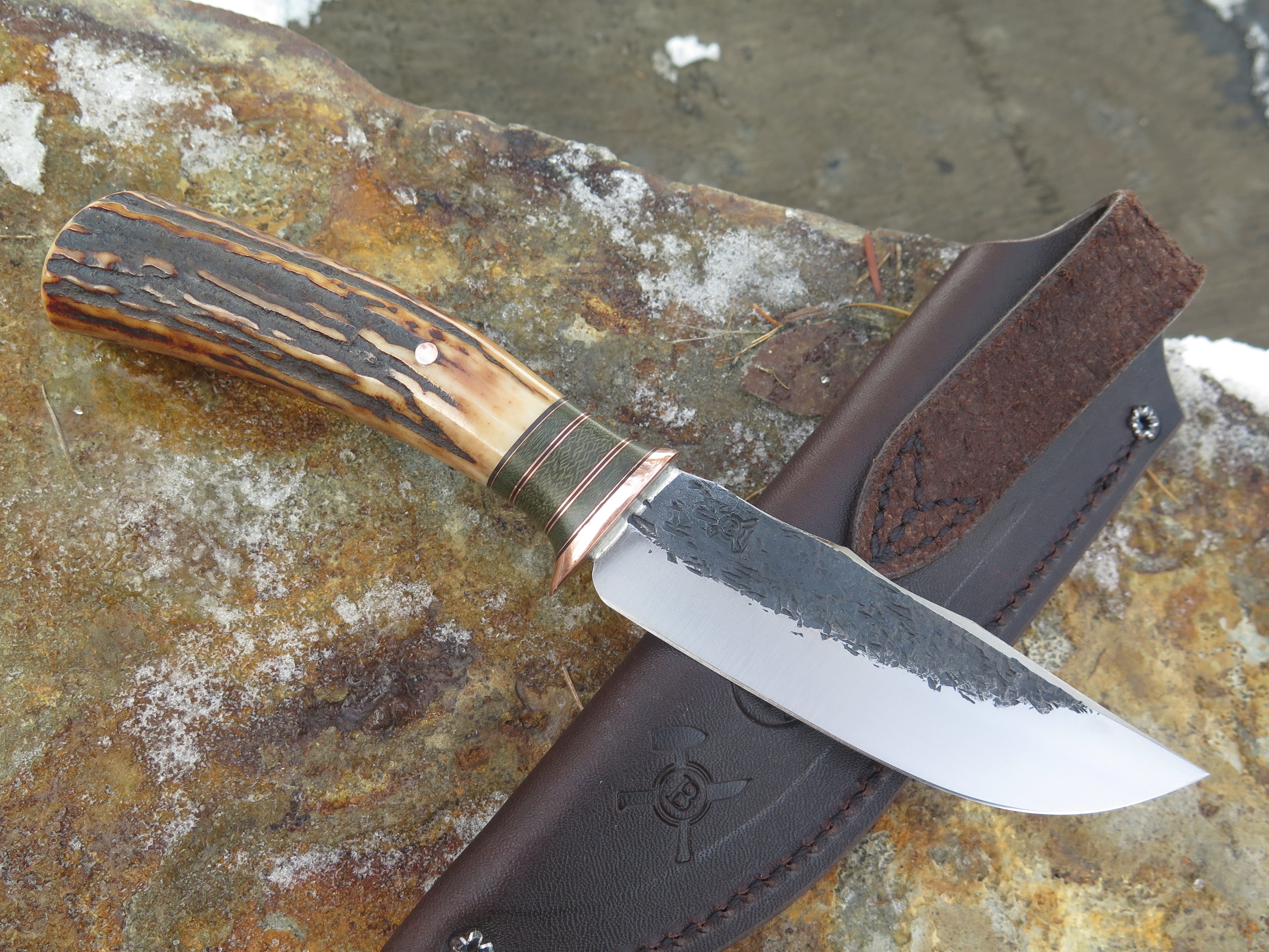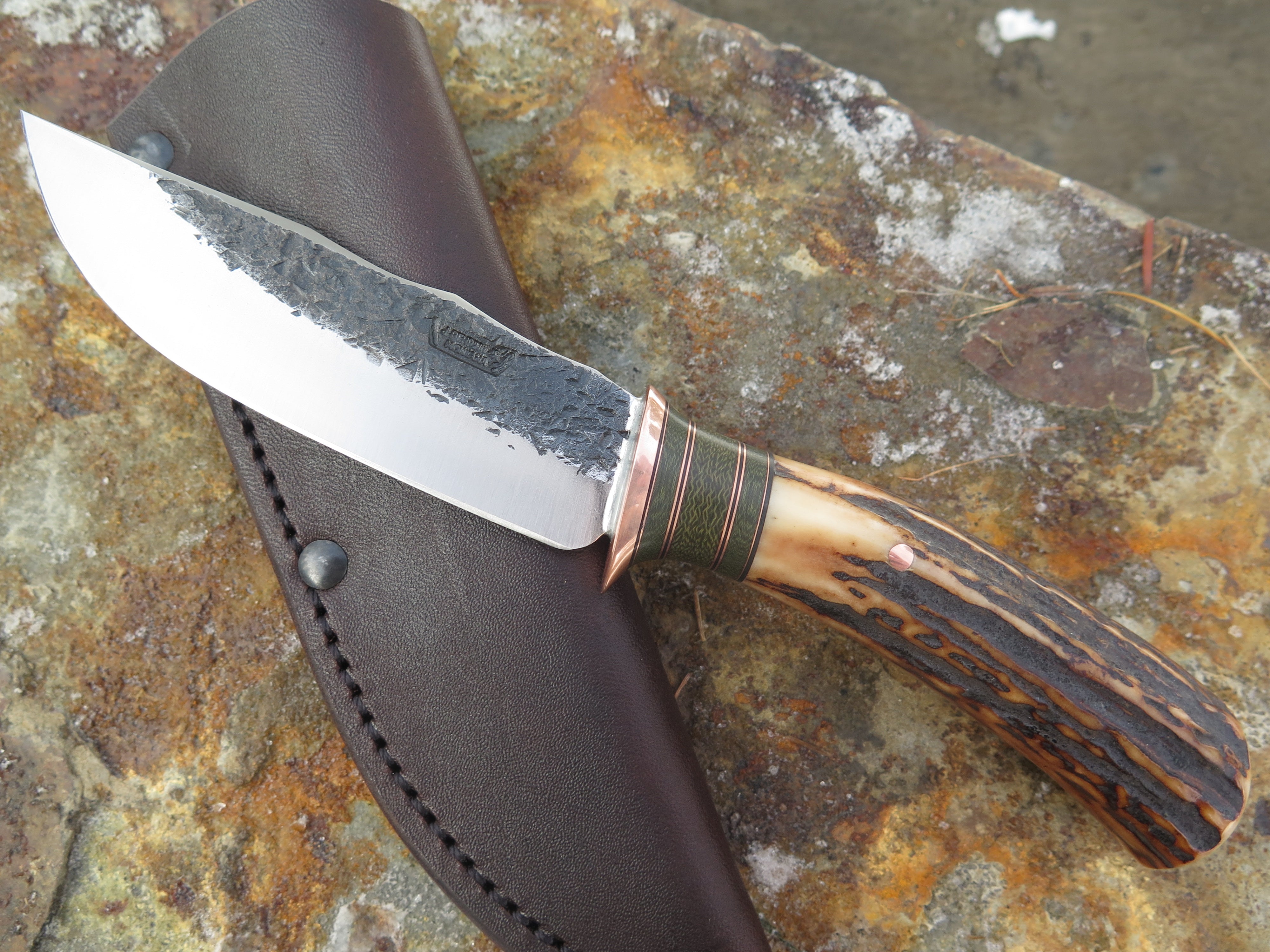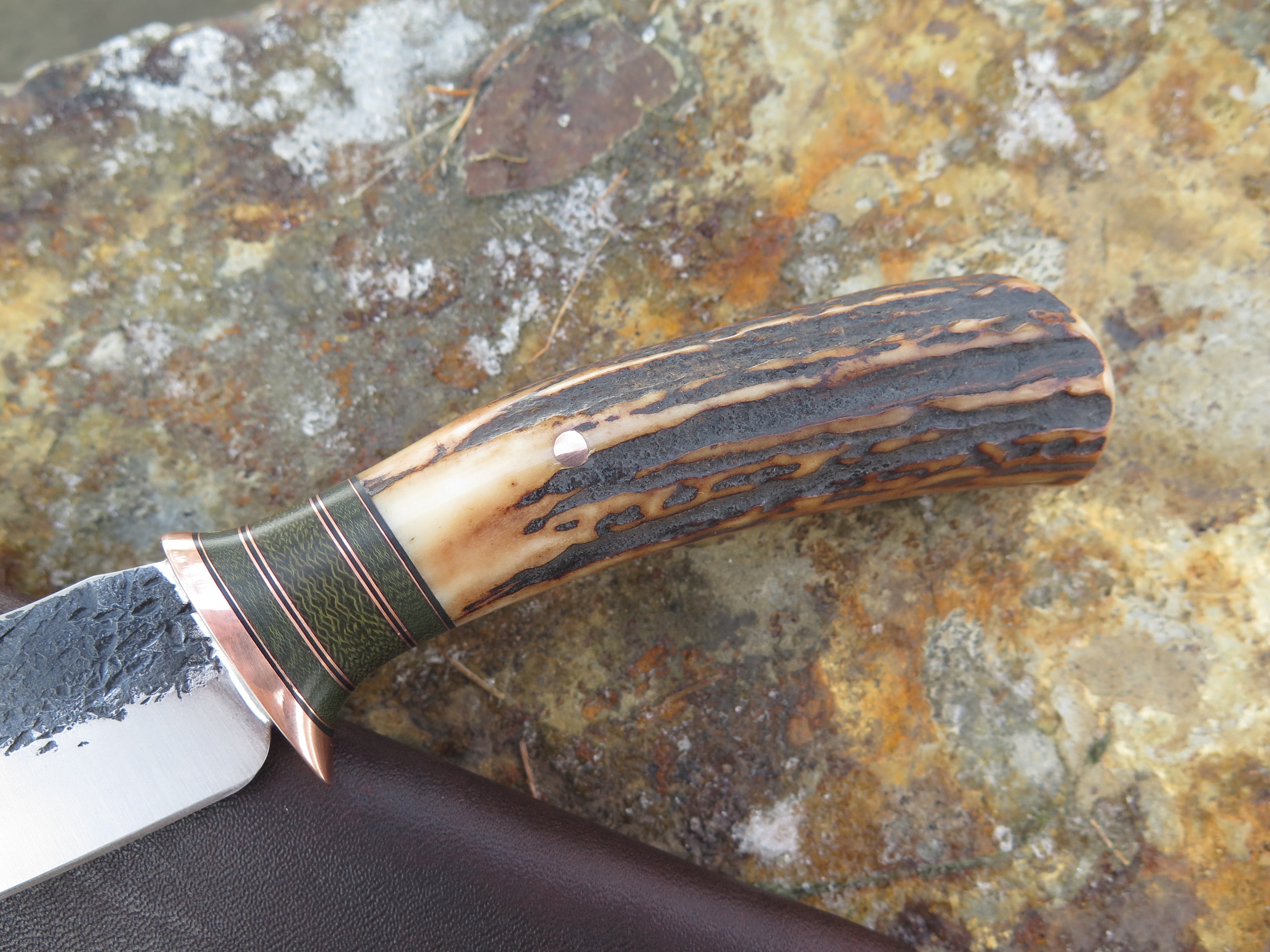 This awesome new offering from Behring Made© is a sized-down version of the Great Bill Scagel's personal hunting, with a James Behring twist. We hand forged the 1/8" thick high carbon 01 tool steel which features a razor sharp hollow grind and our hammermark finish. The copper guard is soldered in place above black fiber, green micarta and copper spacers which top a gorgeous sambar stag handle that's pinned through the tang with copper. The overall length measures 8 3/8" and it comes in a classic leather belt pouch sheath, all of which are guaranteed for life.