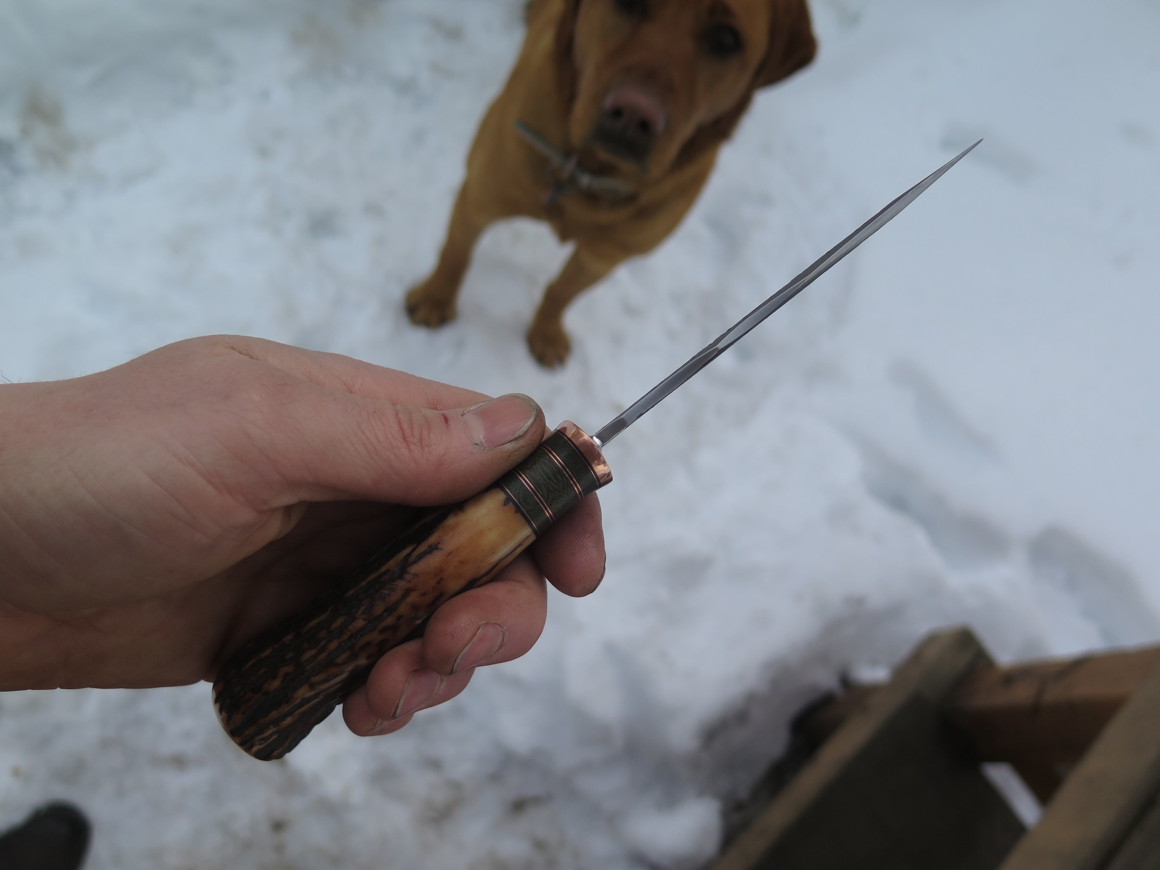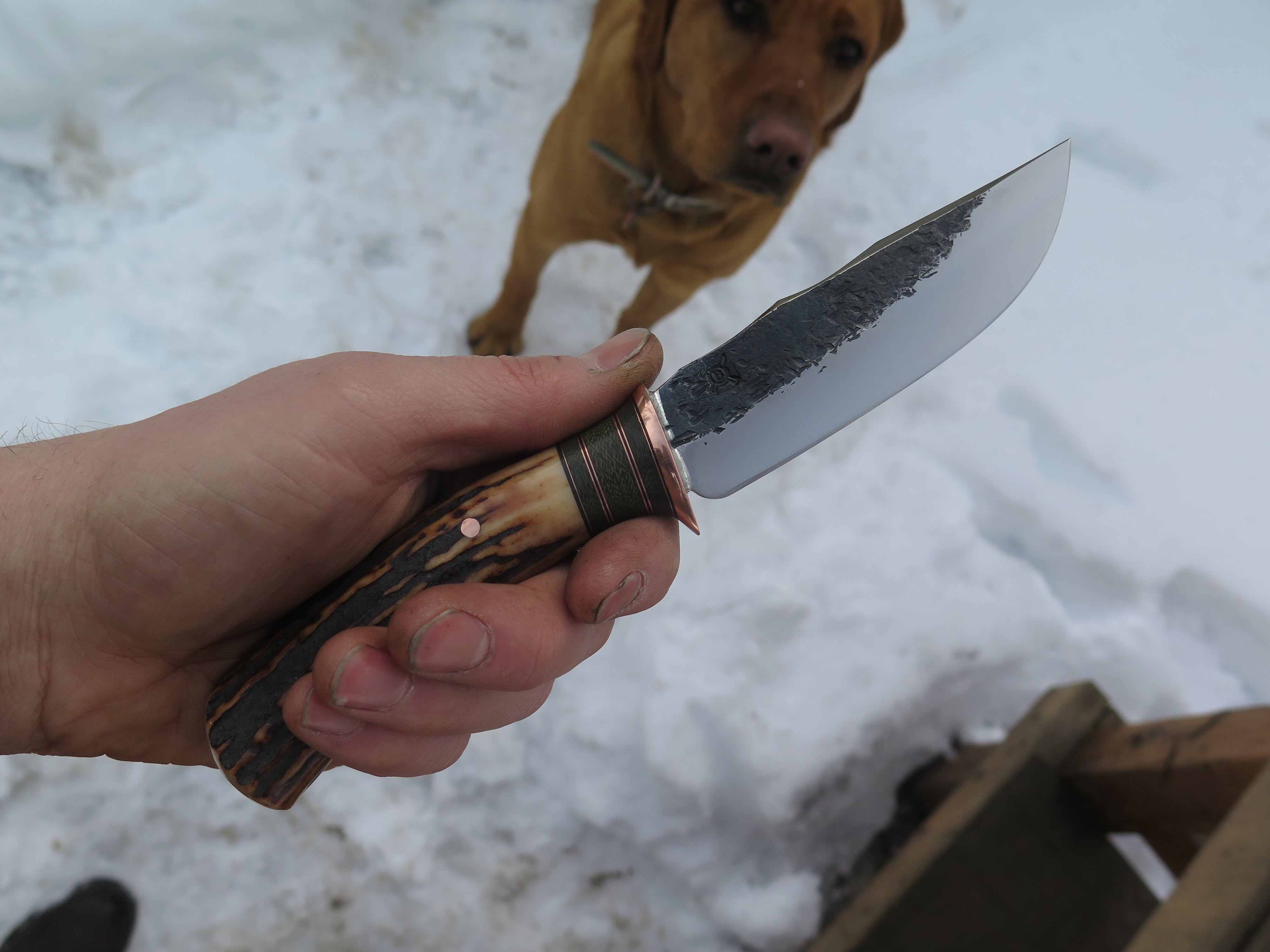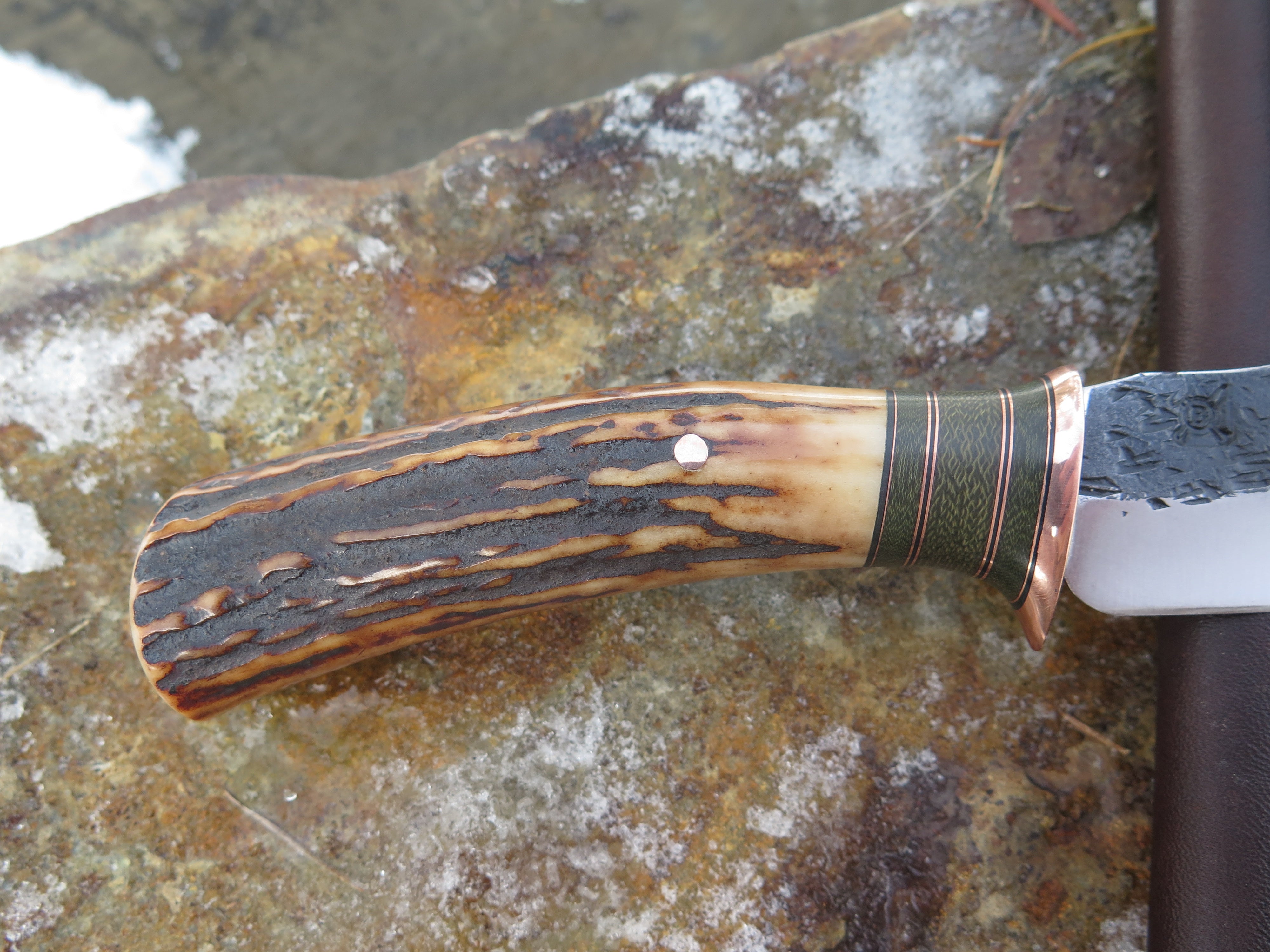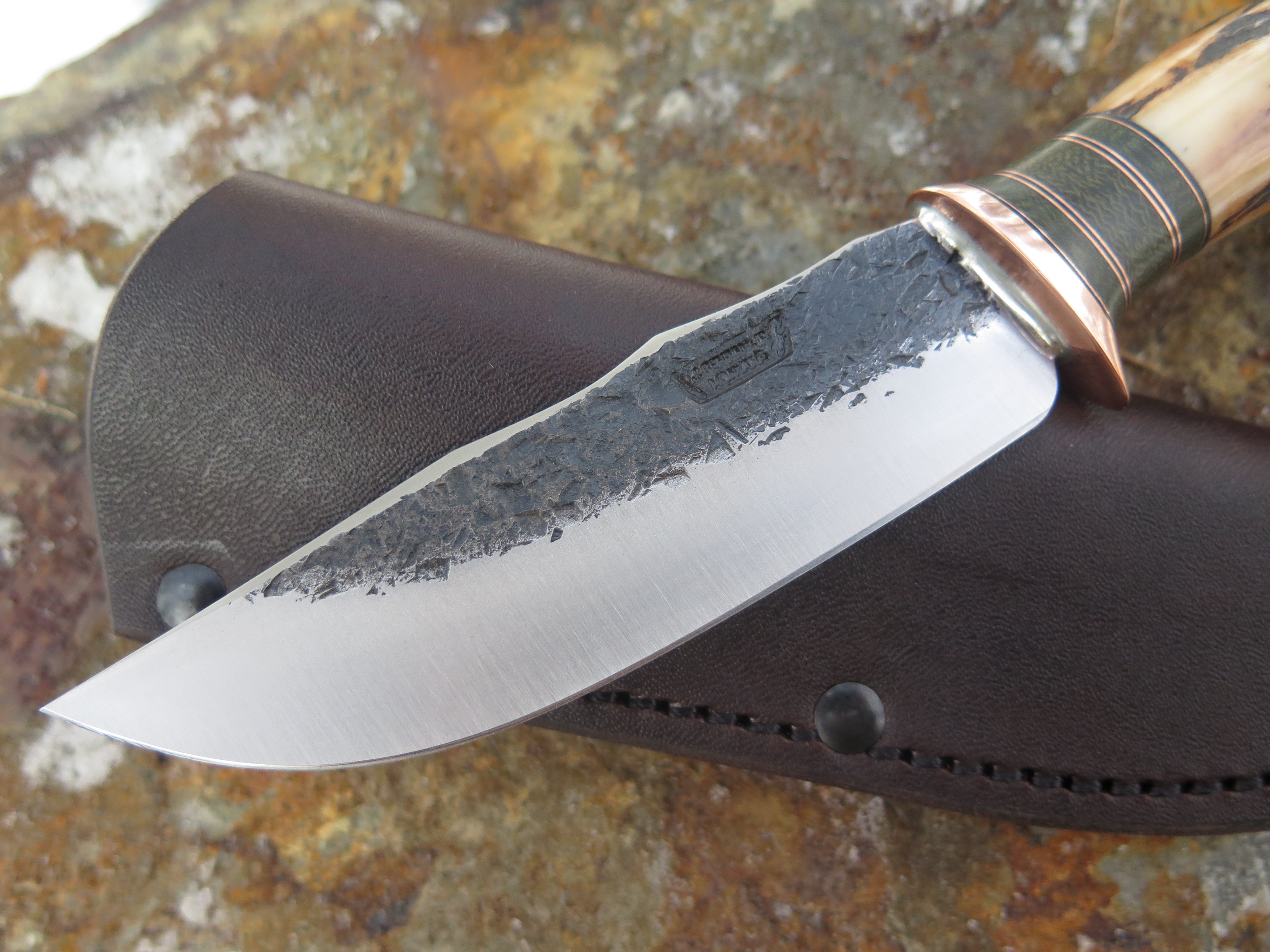 This awesome new offering from Behring Made© is a sized-down version of the Great Bill Scagel's personal hunting, with a James Behring twist. We hand forged the 1/8" thick high carbon 01 tool steel which features a razor sharp hollow grind and our hammermark finish. The copper guard is soldered in place above black fiber, green micarta and copper spacers which top a gorgeous sambar stag handle that's pinned through the tang with copper. The overall length measures 8 3/8" and it comes in a classic leather belt pouch sheath, all of which are guaranteed for life.