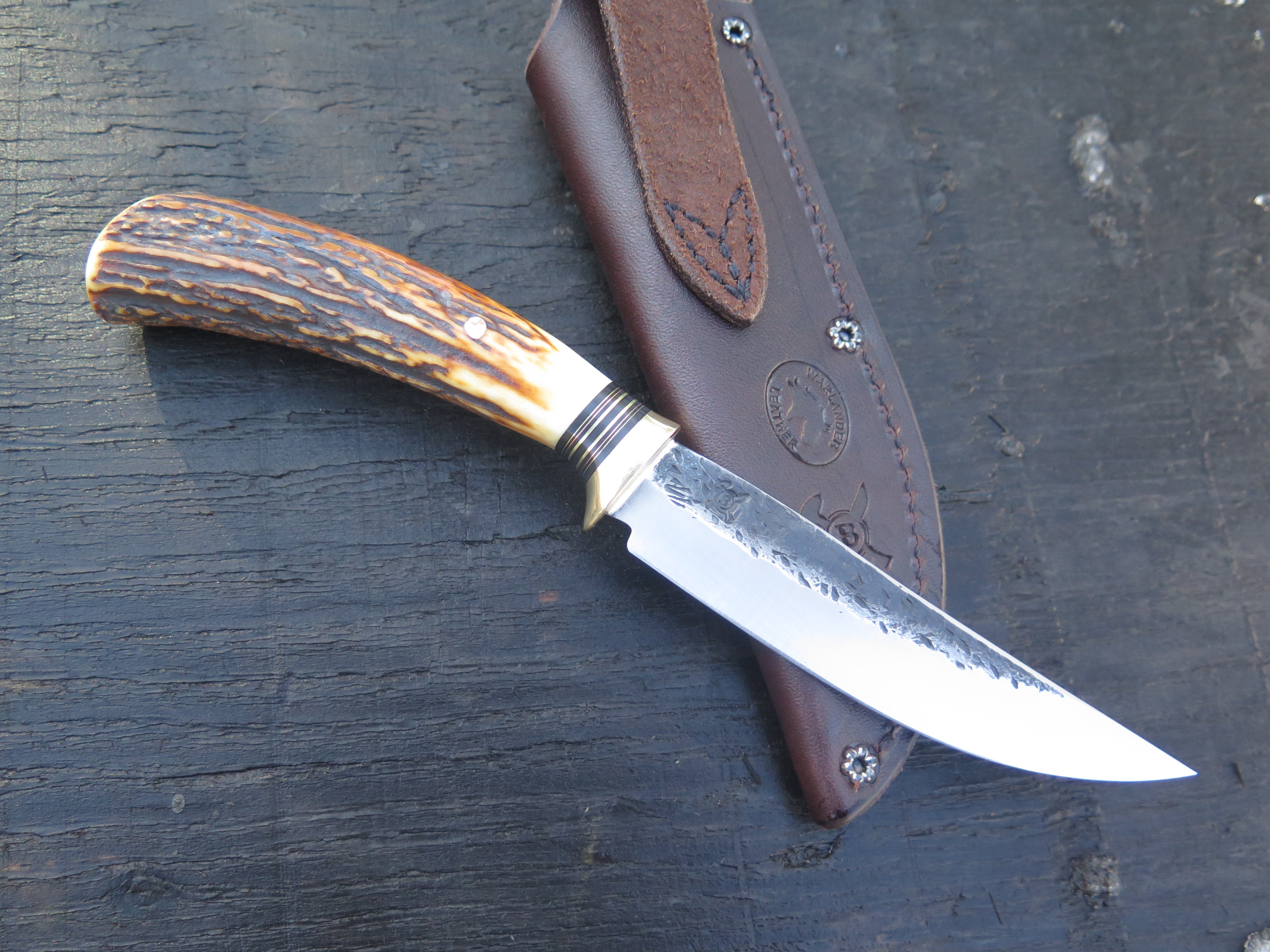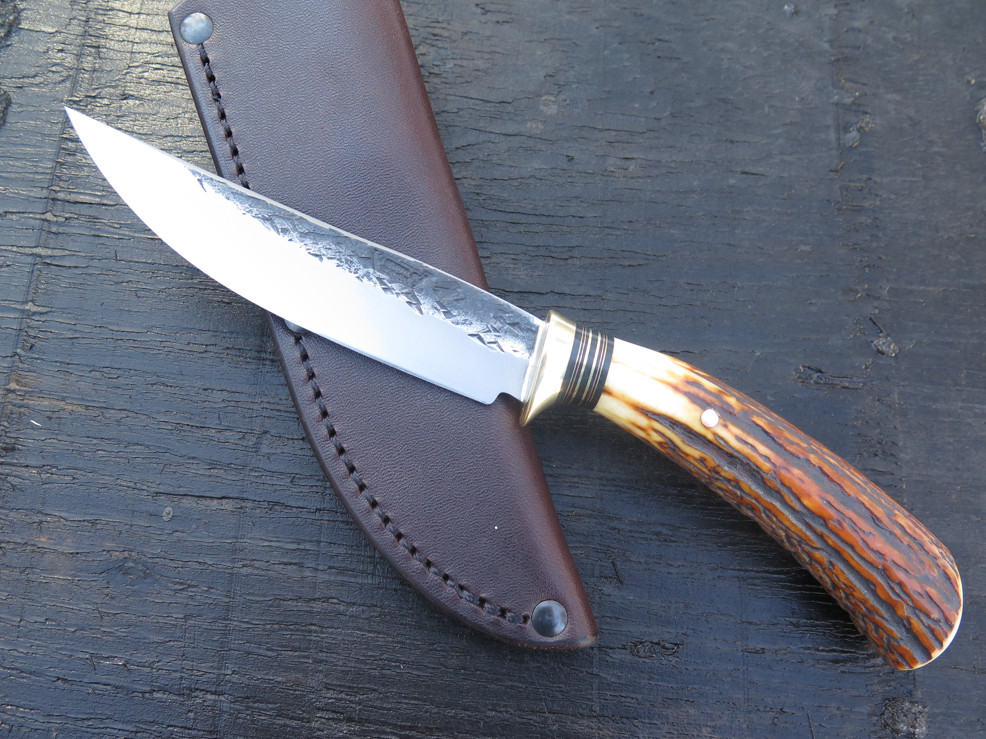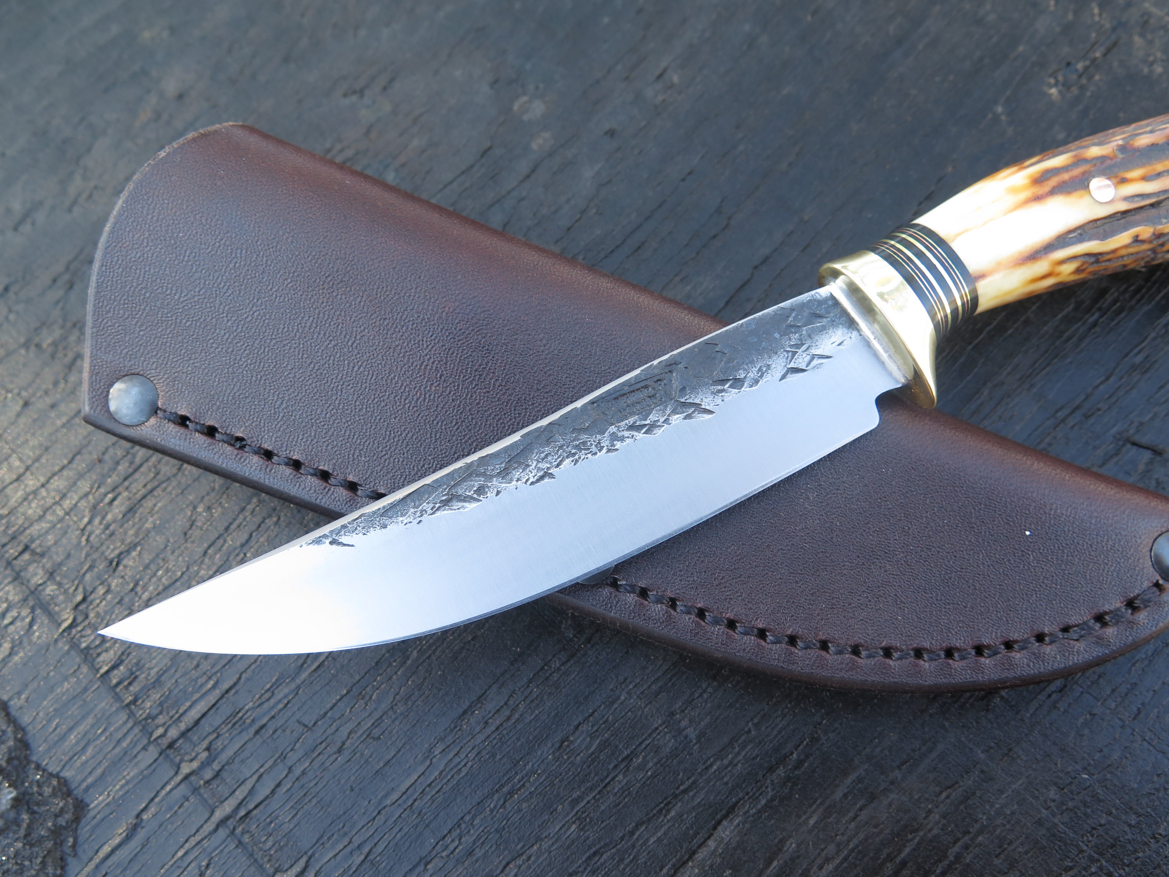 This beautiful new Trout & Bird from Behring Made© is hand forged from 1/8" thick high carbon 01 tool steel and it measures 4 3/4" from tip to guard with a razor sharp hollow grind and our hammermark finish. The brass guard is soldered in place above black fiber, brass and copper spacers as well as a premium sambar stag handle that is pinned through the tang with copper. The overall length measures just under 9 1/4" and it comes in a classic belt pouch sheath. We guarantee this rig for life!