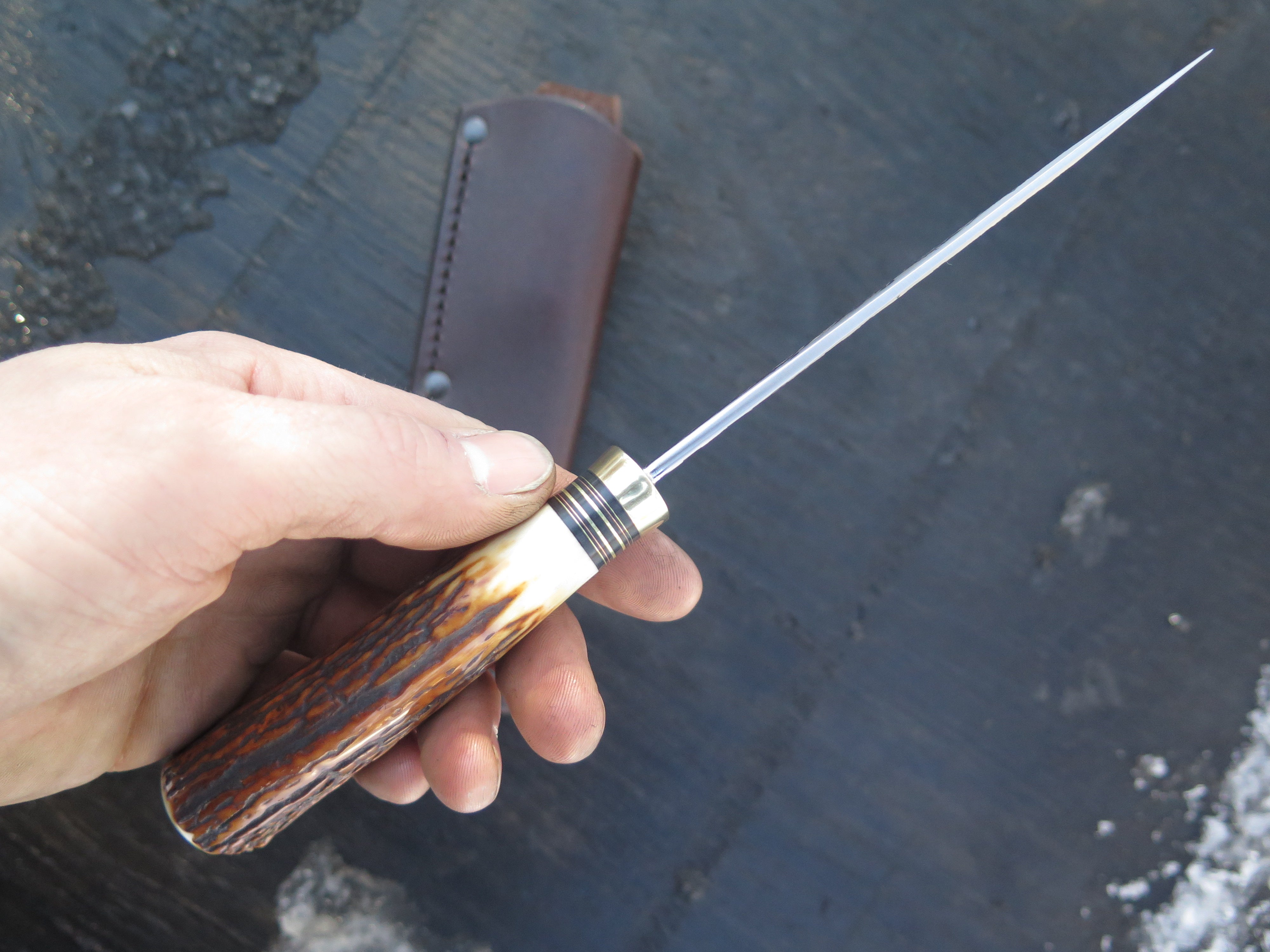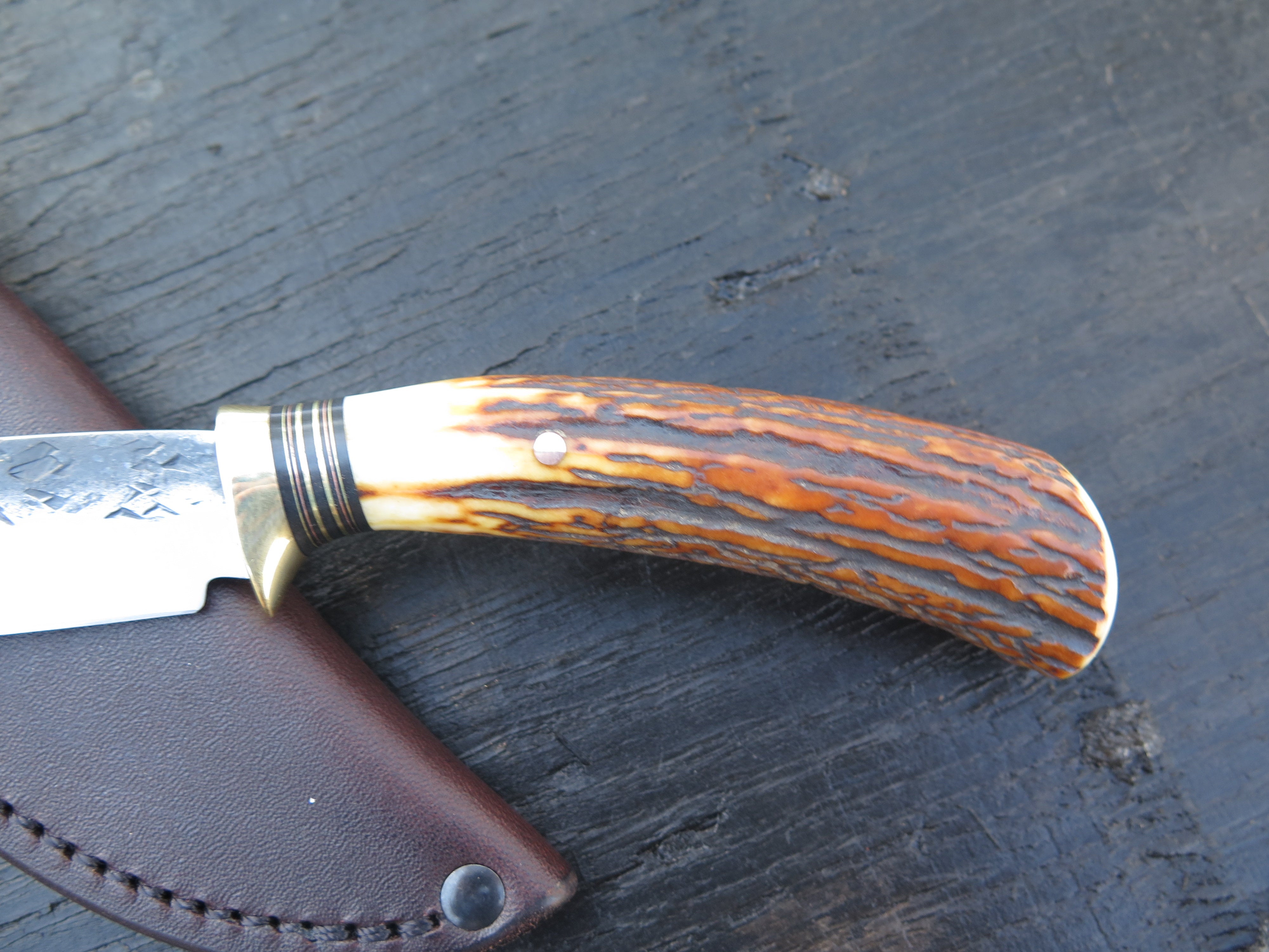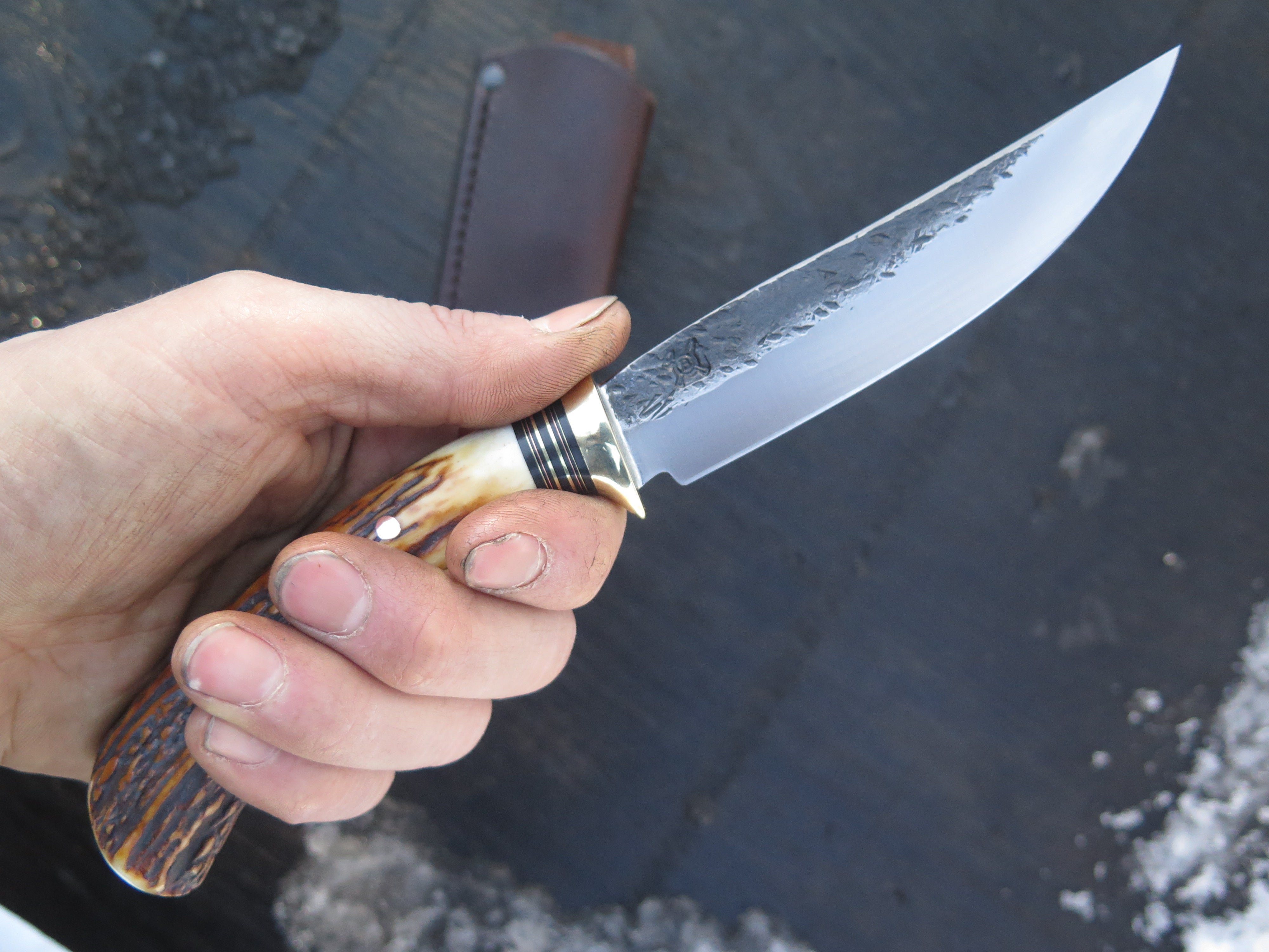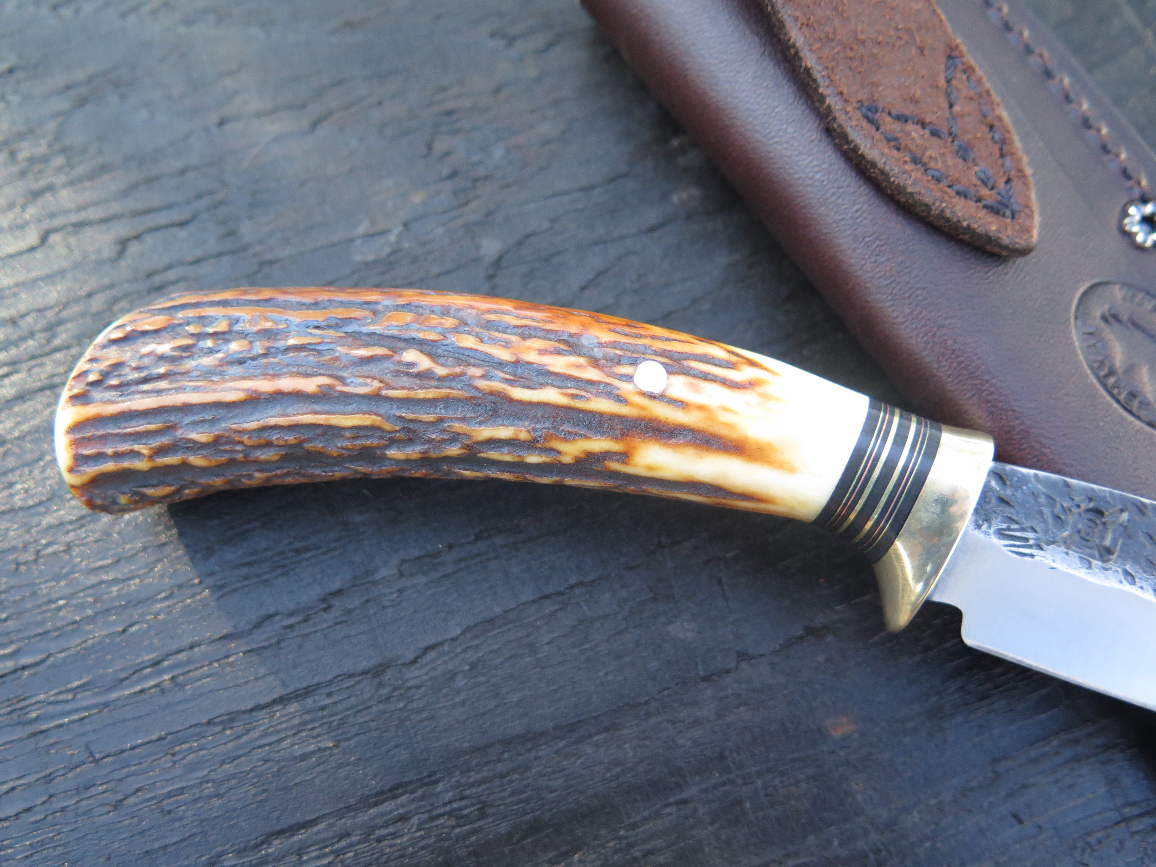 This beautiful new Trout & Bird from Behring Made© is hand forged from 1/8" thick high carbon 01 tool steel and it measures 4 3/4" from tip to guard with a razor sharp hollow grind and our hammermark finish. The brass guard is soldered in place above black fiber, brass and copper spacers as well as a premium sambar stag handle that is pinned through the tang with copper. The overall length measures just under 9 1/4" and it comes in a classic belt pouch sheath. We guarantee this rig for life!