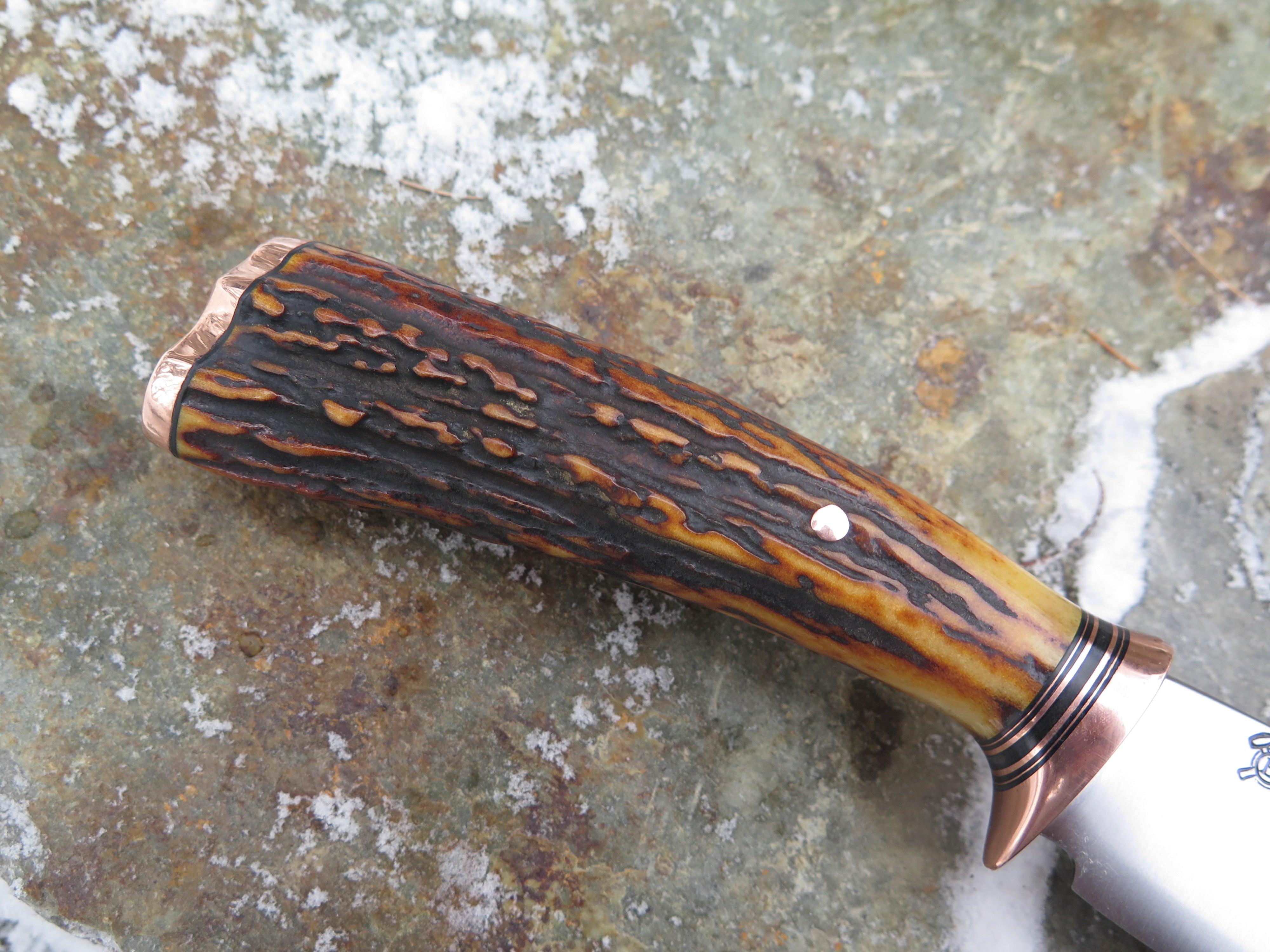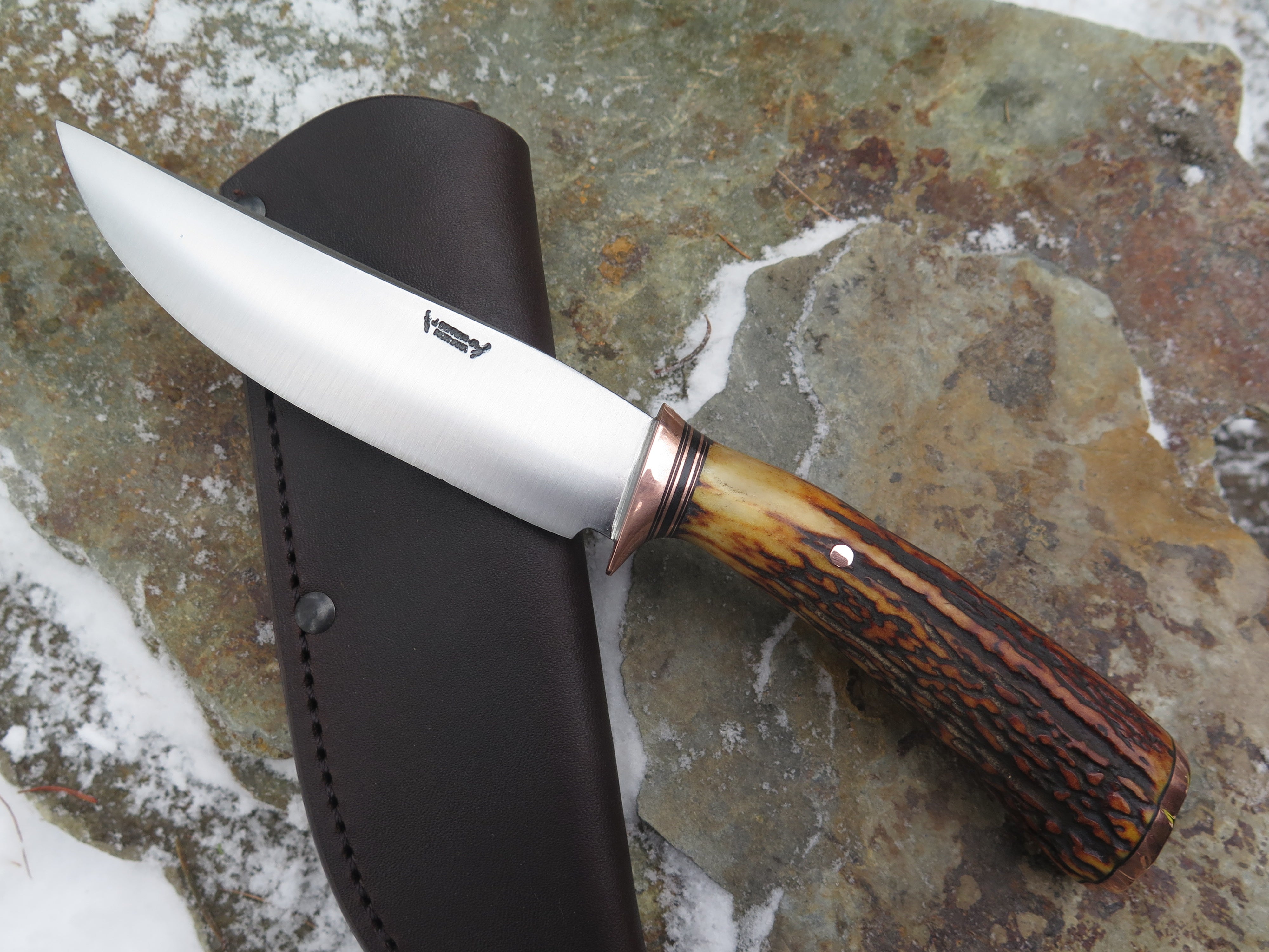 This classic Trout & Bird from Behring Made© is hand forged from 3/16" thick high carbon 01 tool steel and it measures 5" from tip to guard with a razor sharp convex grind. The copper guard is soldered in place above black fiber and copper spacers as well as a gorgeous premium sambar stag handle that's pinned and capped with copper. Overall length measures 9 1/2" and it comes in a classic leather belt pouch sheath.