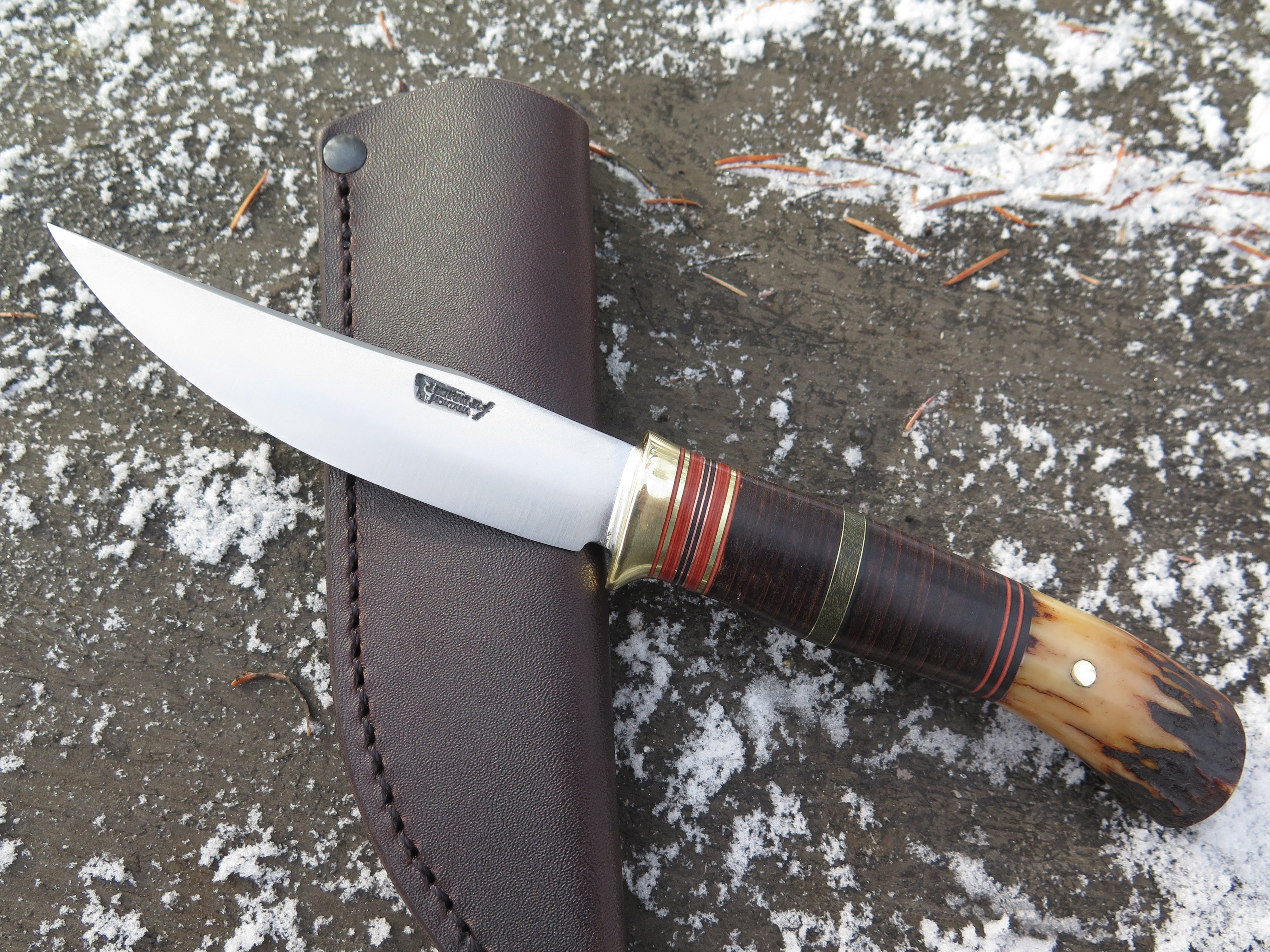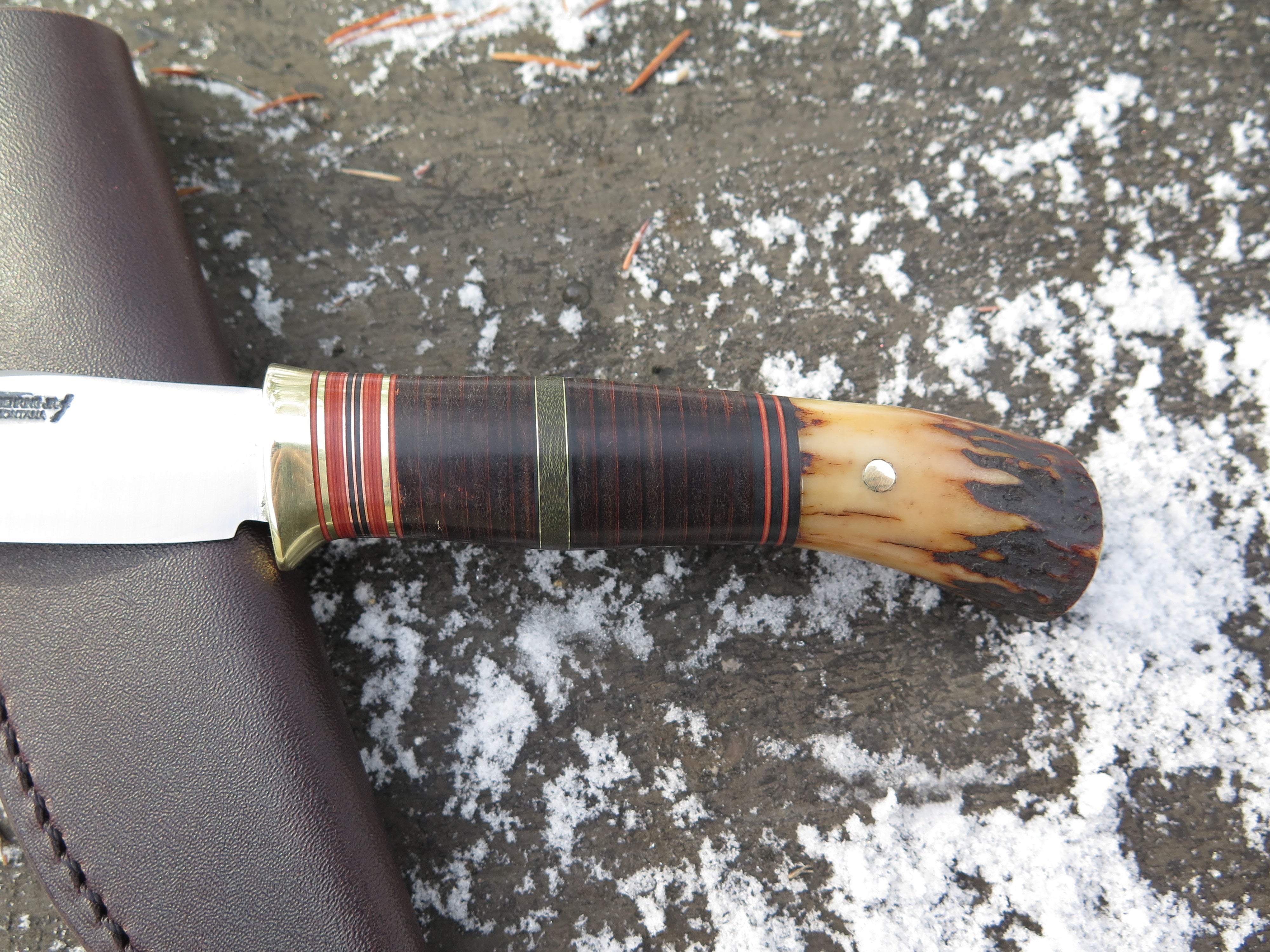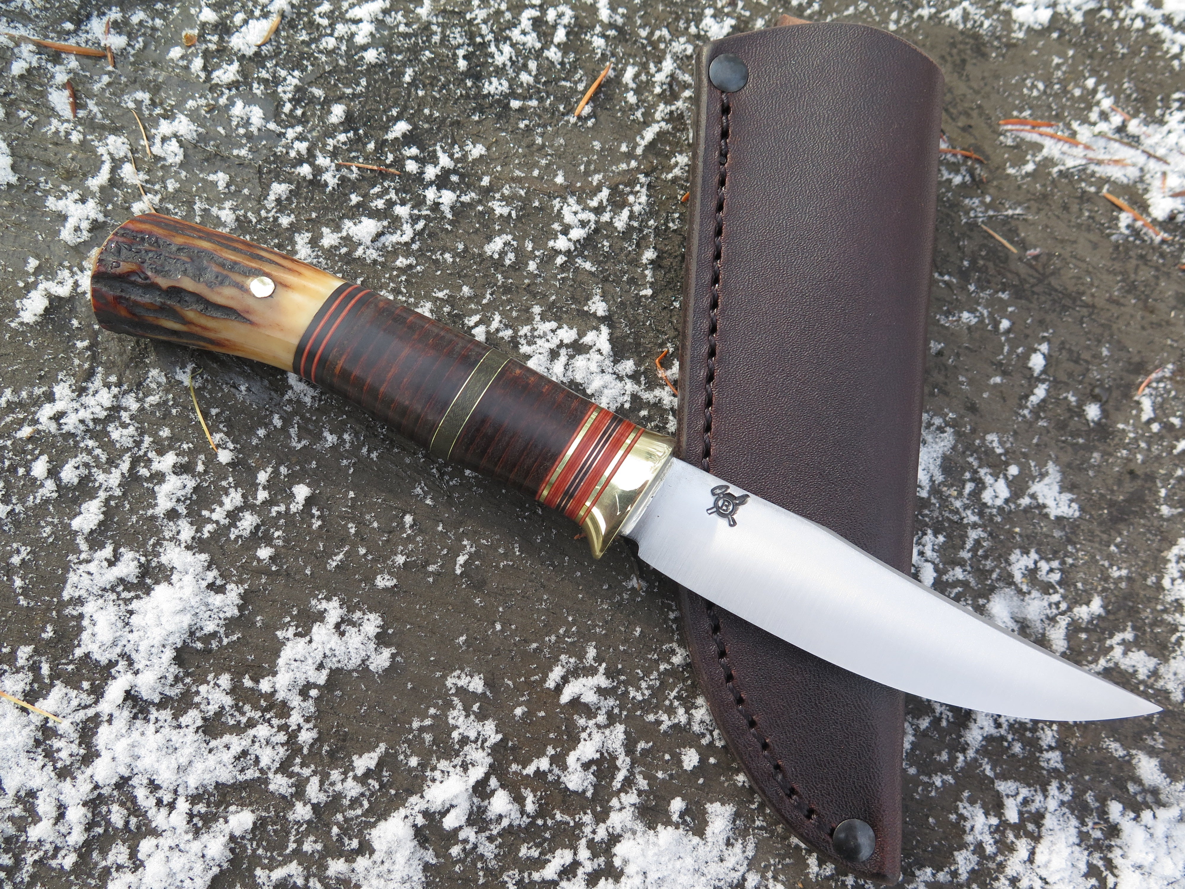 This classic Trout & Bird from Behring Made© is hand forged from 1/8" thick high carbon 01 tool steel and it measures 4" from tip to guard with a razor sharp convex grind. The brass guard is soldered in place above black and maroon fiber, green micarta, brass, copper, and horsehide spacers as well as a premium sambar stag butt that's pinned with brass. The overall length measures 8 1/2" and it comes in a well made leather belt pouch sheath- a setup we guarantee for life.