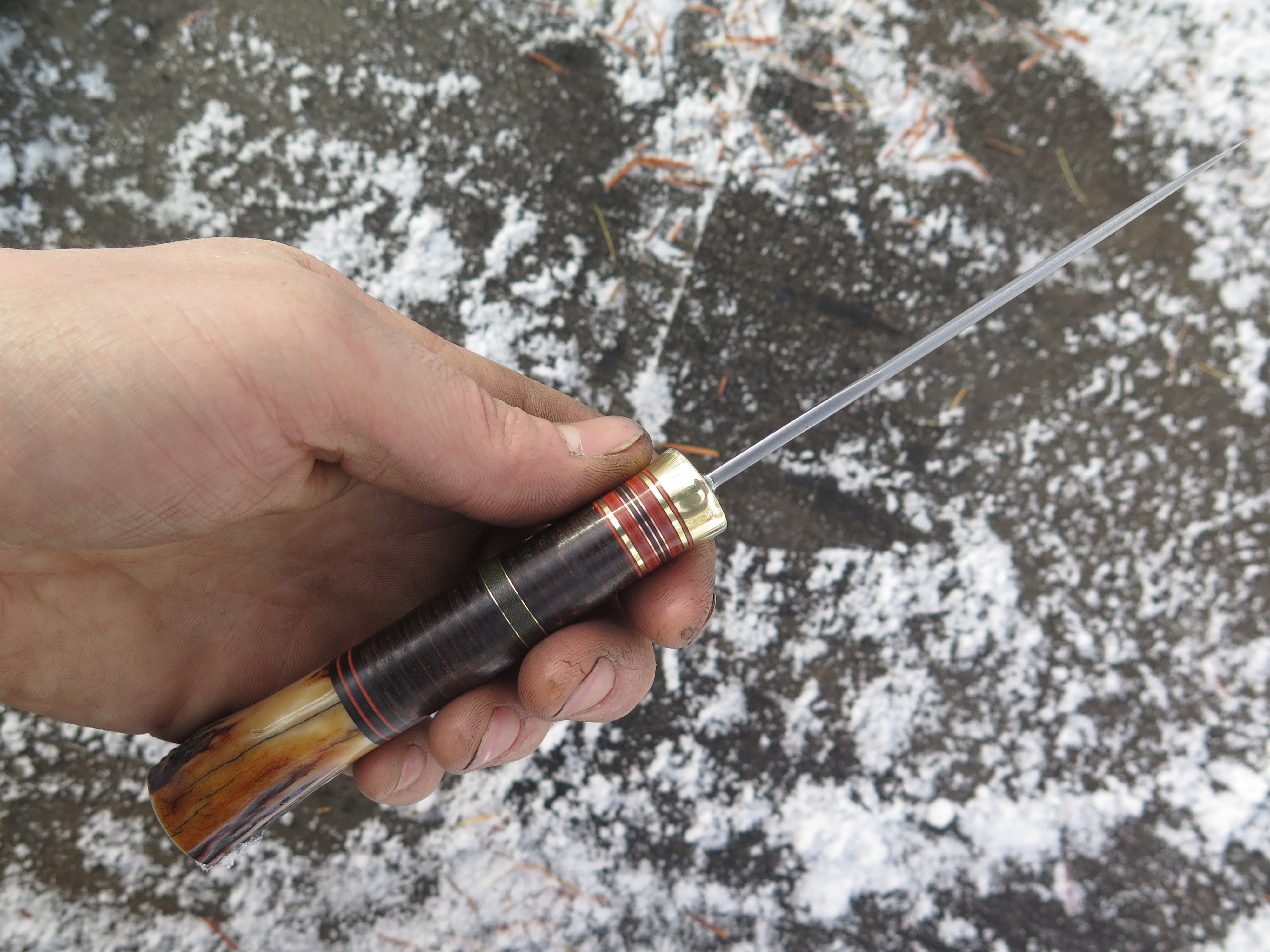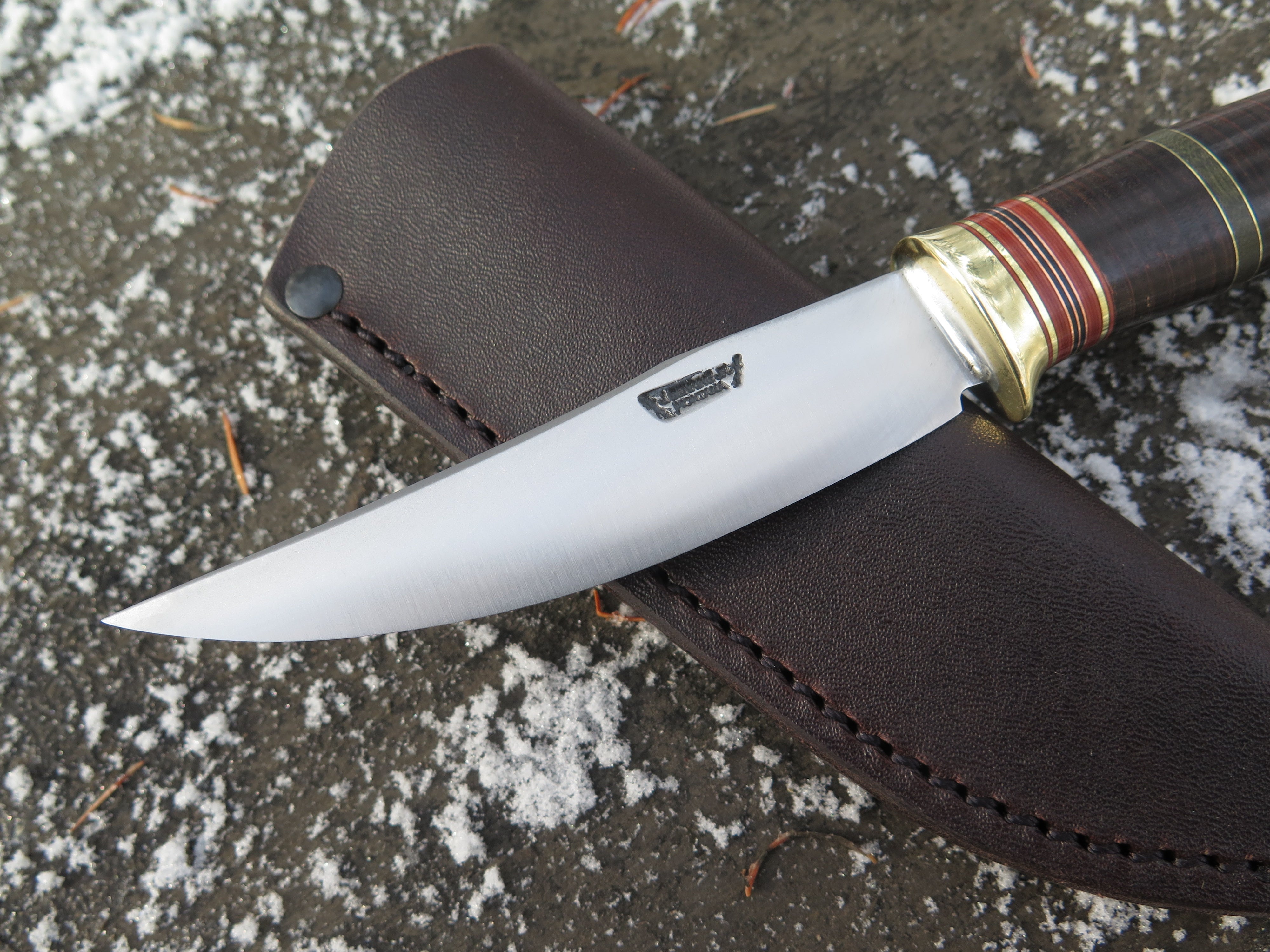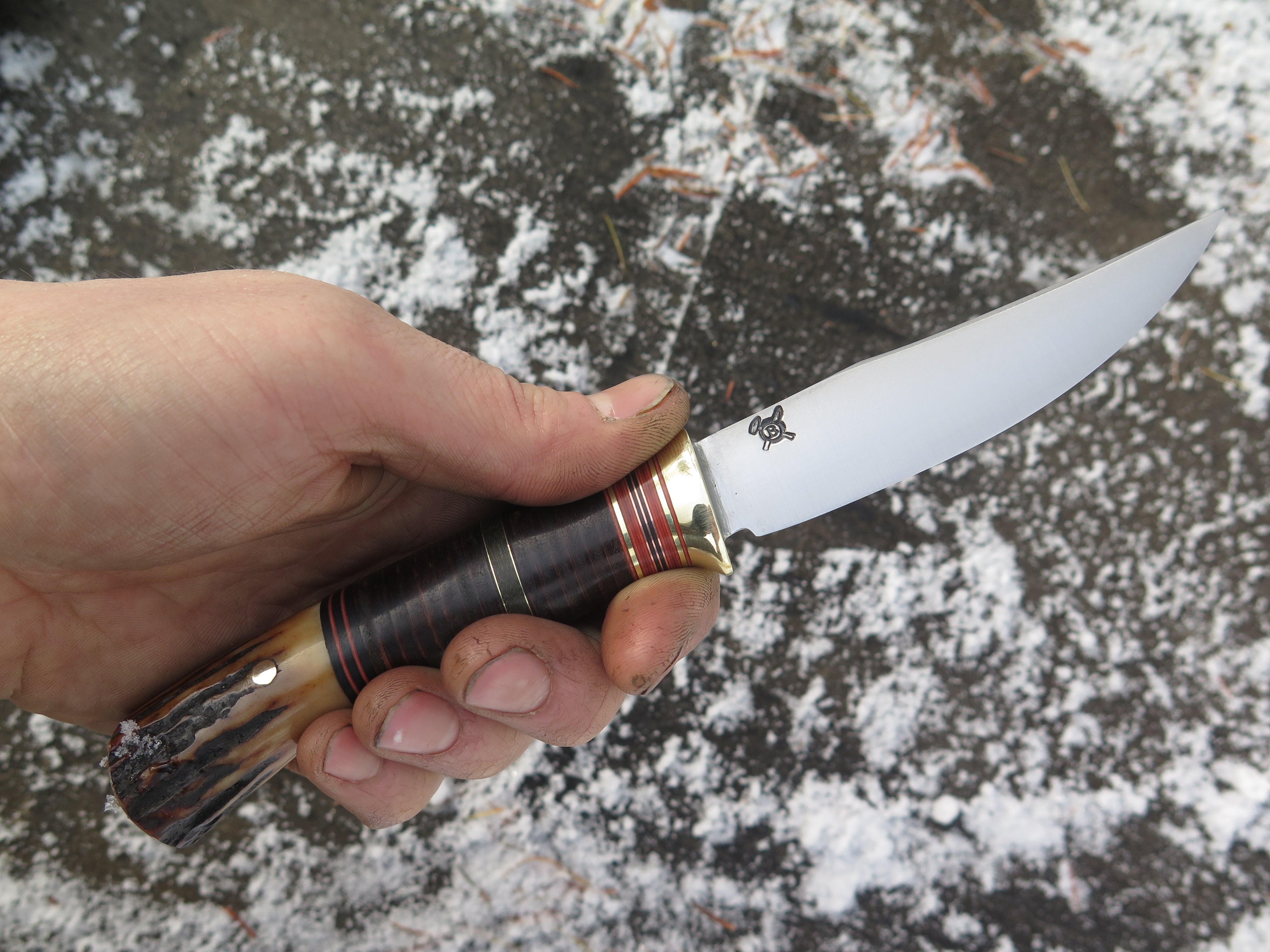 This classic Trout & Bird from Behring Made© is hand forged from 1/8" thick high carbon 01 tool steel and it measures 4" from tip to guard with a razor sharp convex grind. The brass guard is soldered in place above black and maroon fiber, green micarta, brass, copper, and horsehide spacers as well as a premium sambar stag butt that's pinned with brass. The overall length measures 8 1/2" and it comes in a well made leather belt pouch sheath- a setup we guarantee for life.