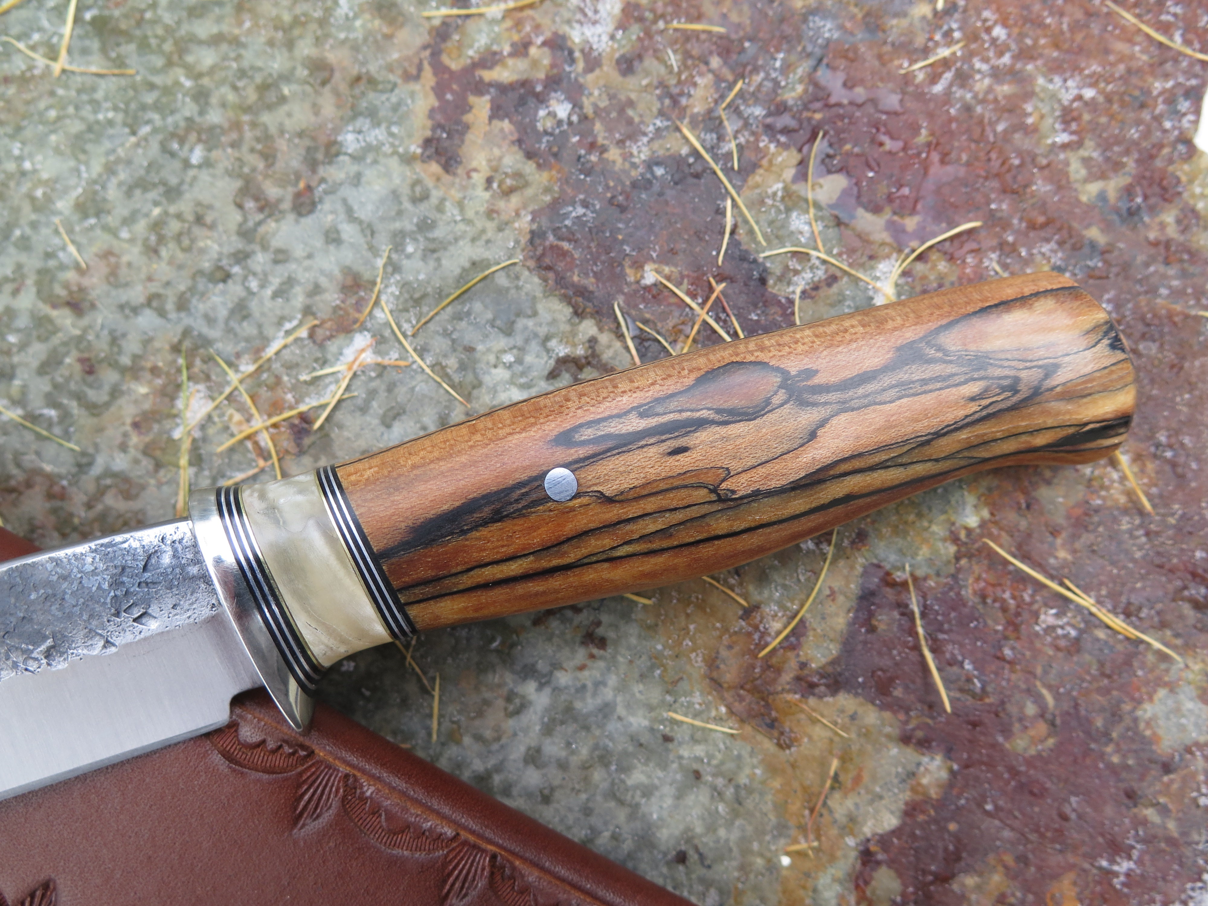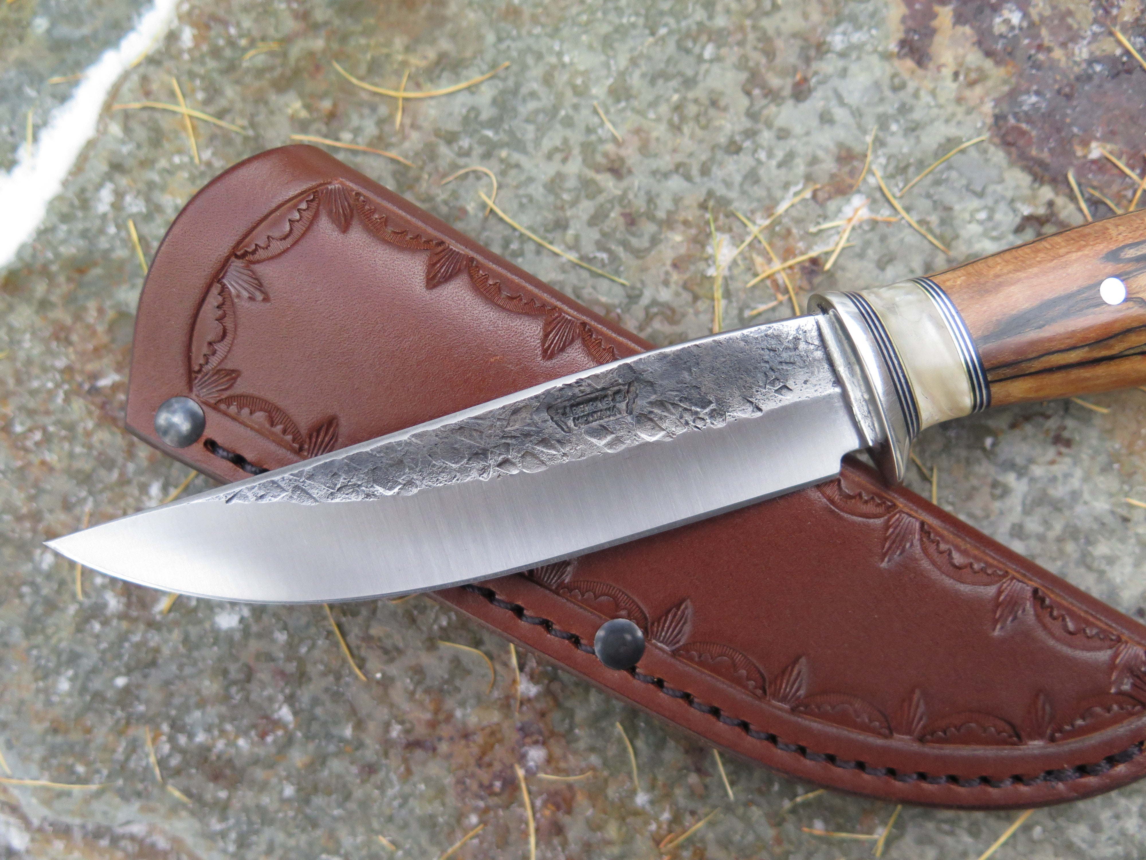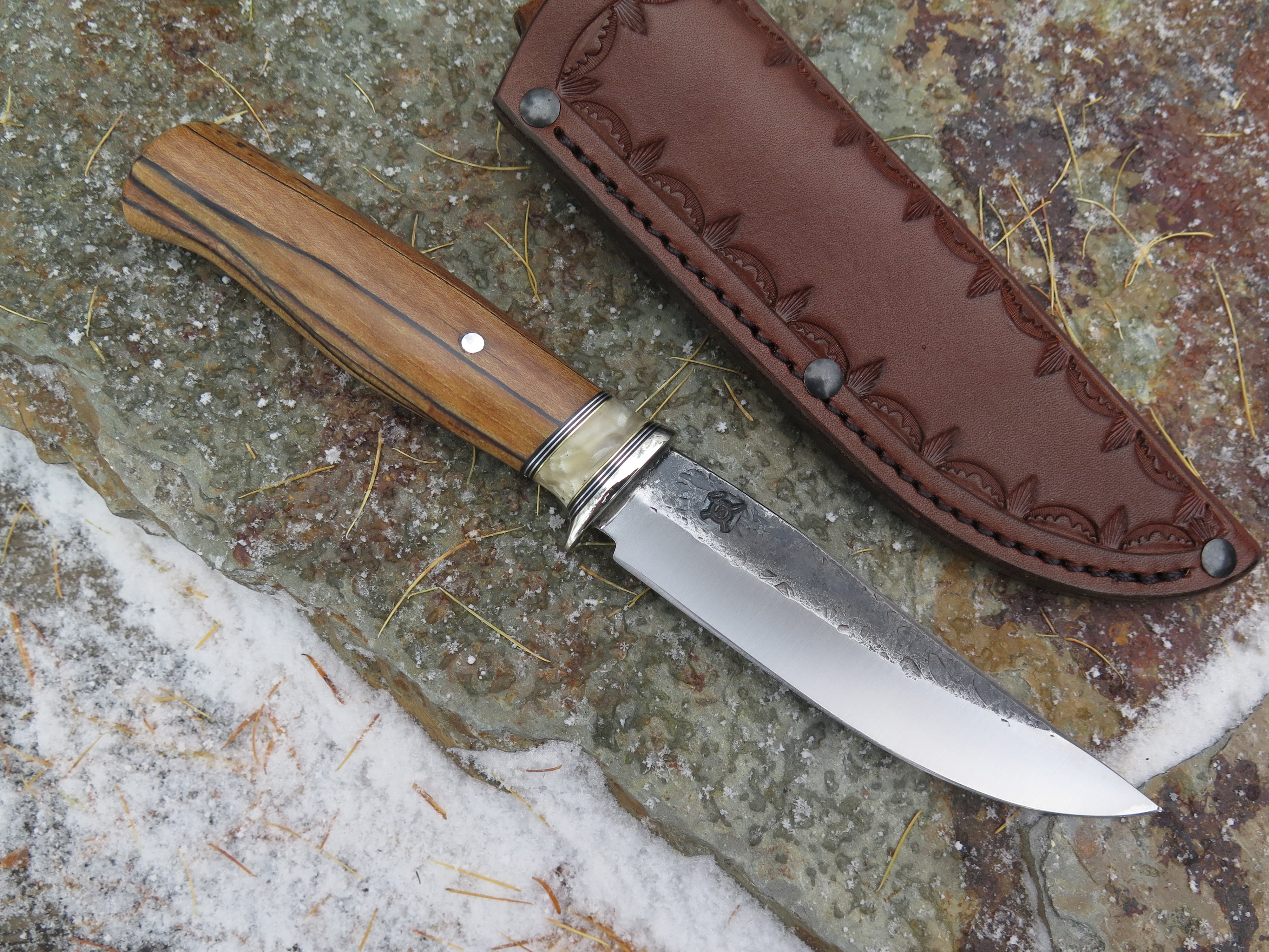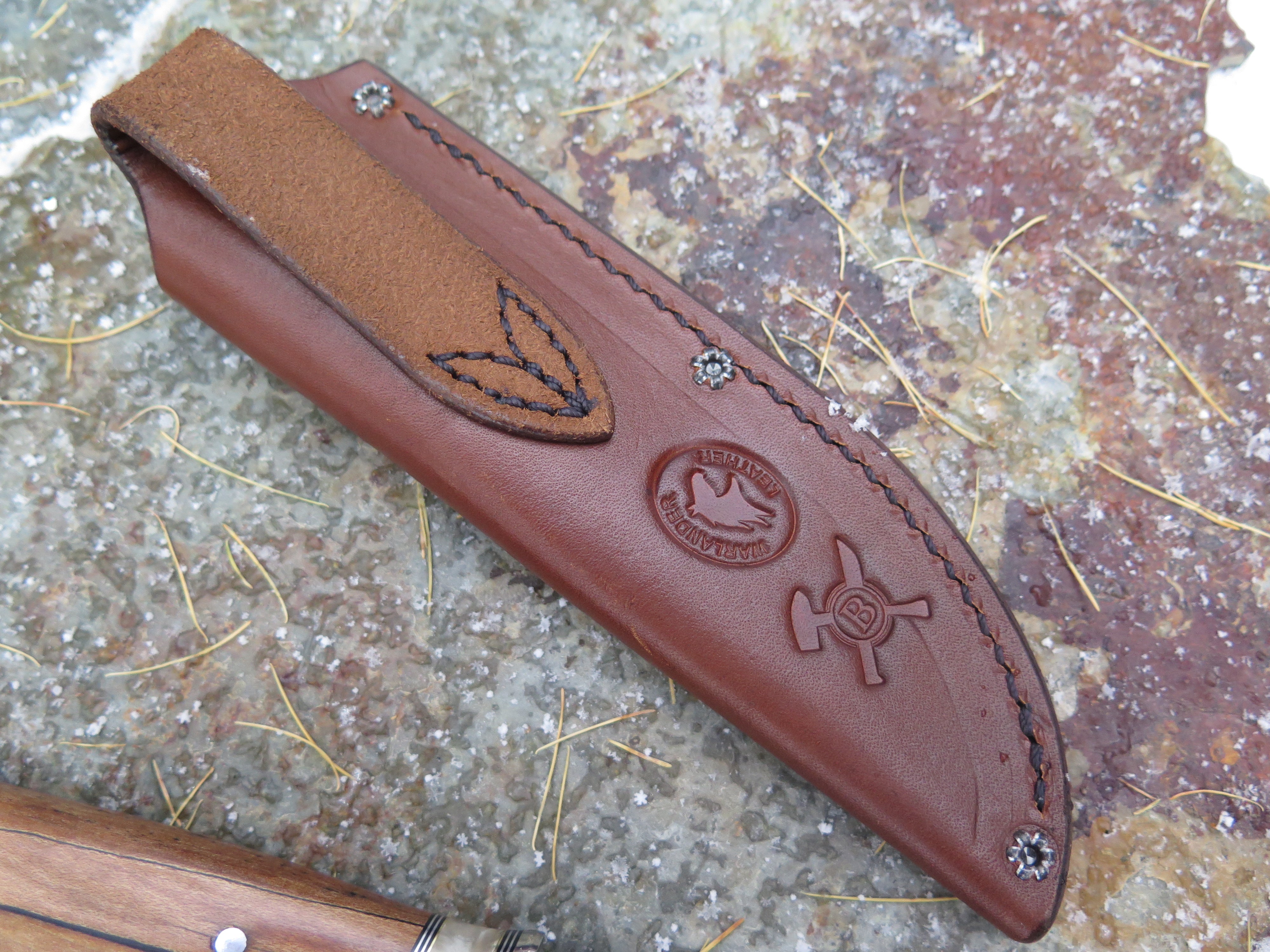 This beautiful new Trout &B Bird from Behring Made© is hand forged from 1/8" thick high carbon 01 tool steel and measures 4 3/4" from tip to guard with a razor sharp hollow grind and our hammermark finish. The nickel silver guard is soldered in place above black fiber, aluminum and musk ox boss spacers as well as a premium stabilized beech wood handle that is pinned through the tang with aluminum. The overall length measures 9 3/8" and it comes in the shown leather belt pouch sheath, though substitutions are available upon request.