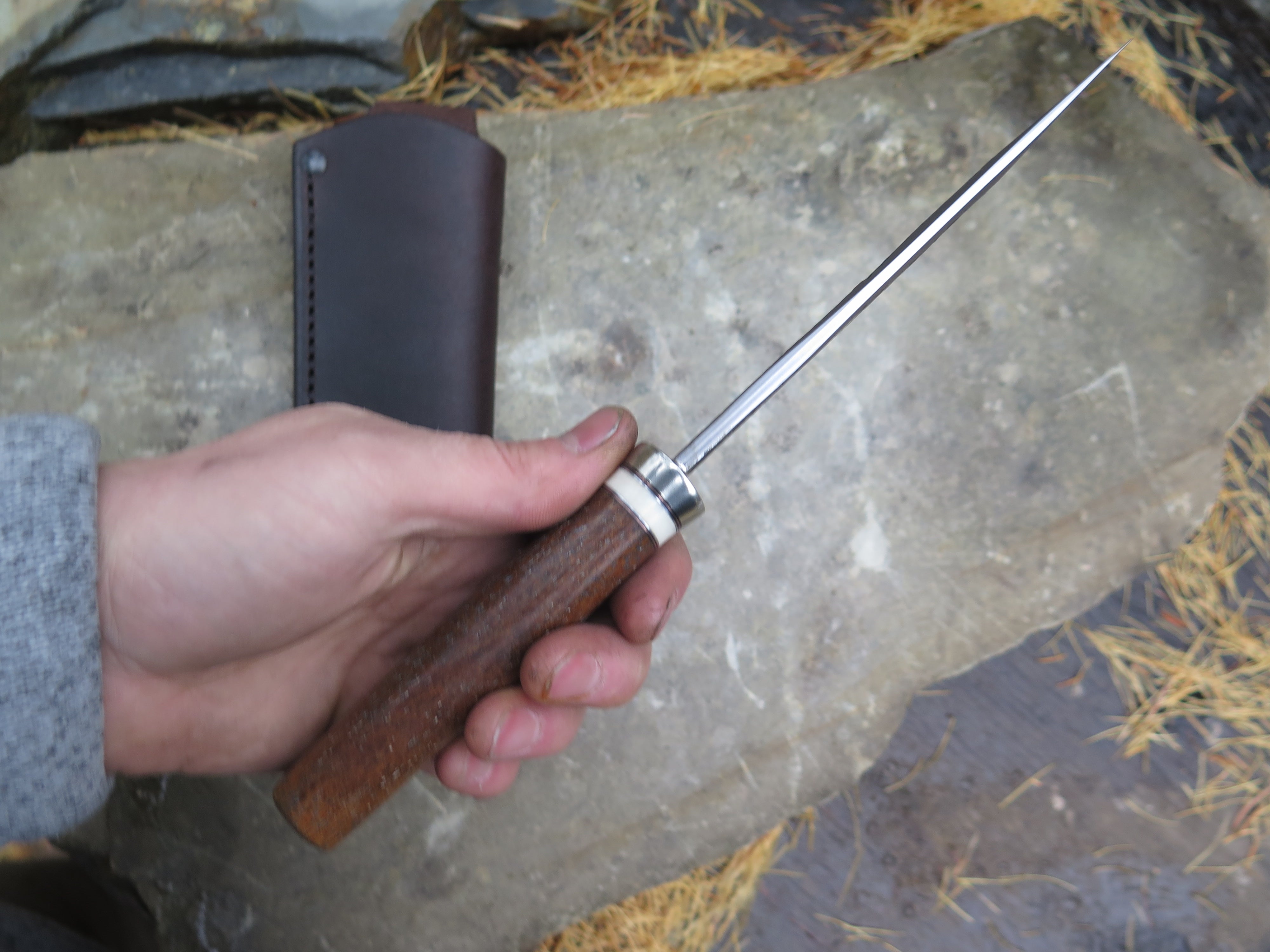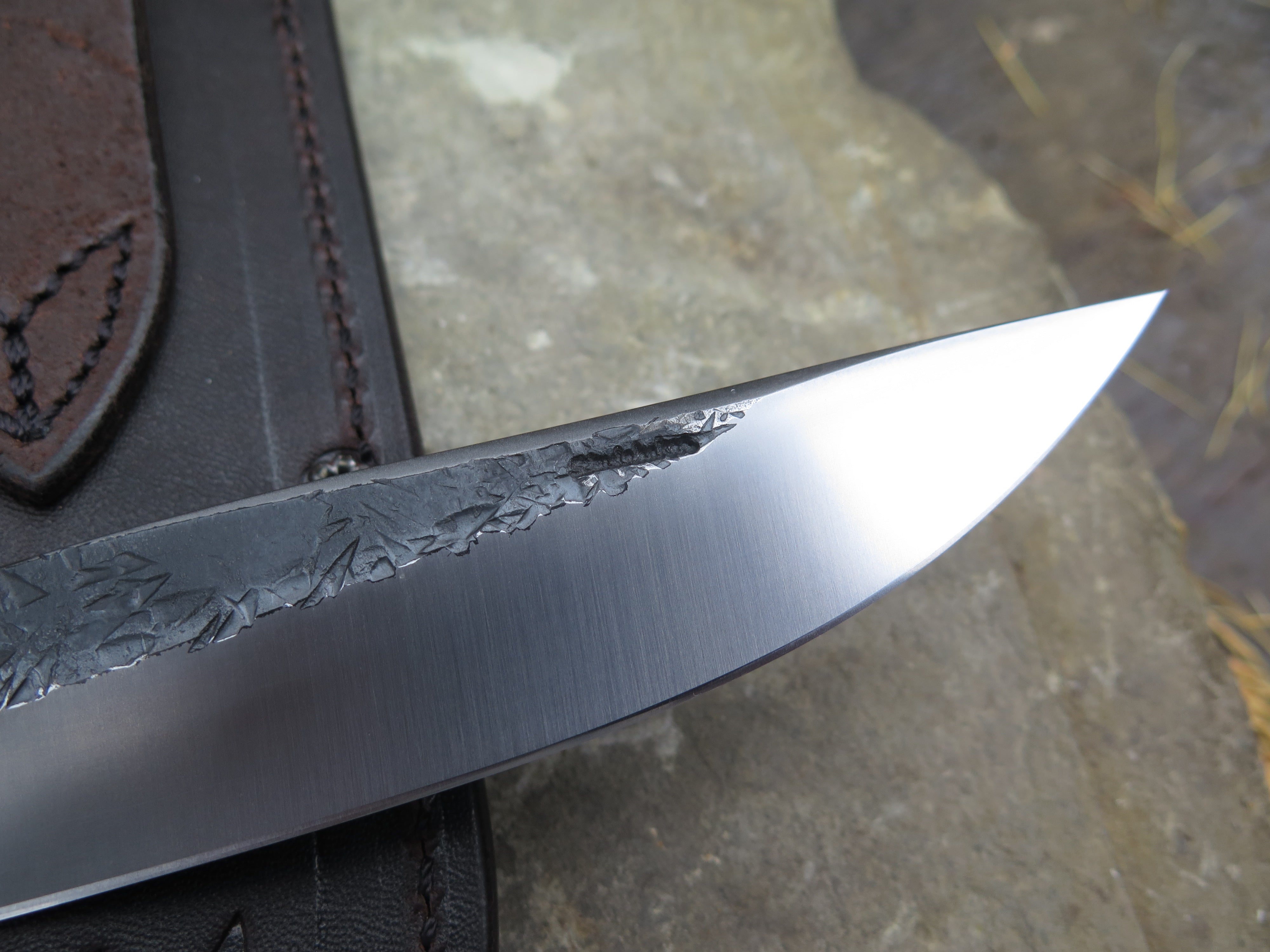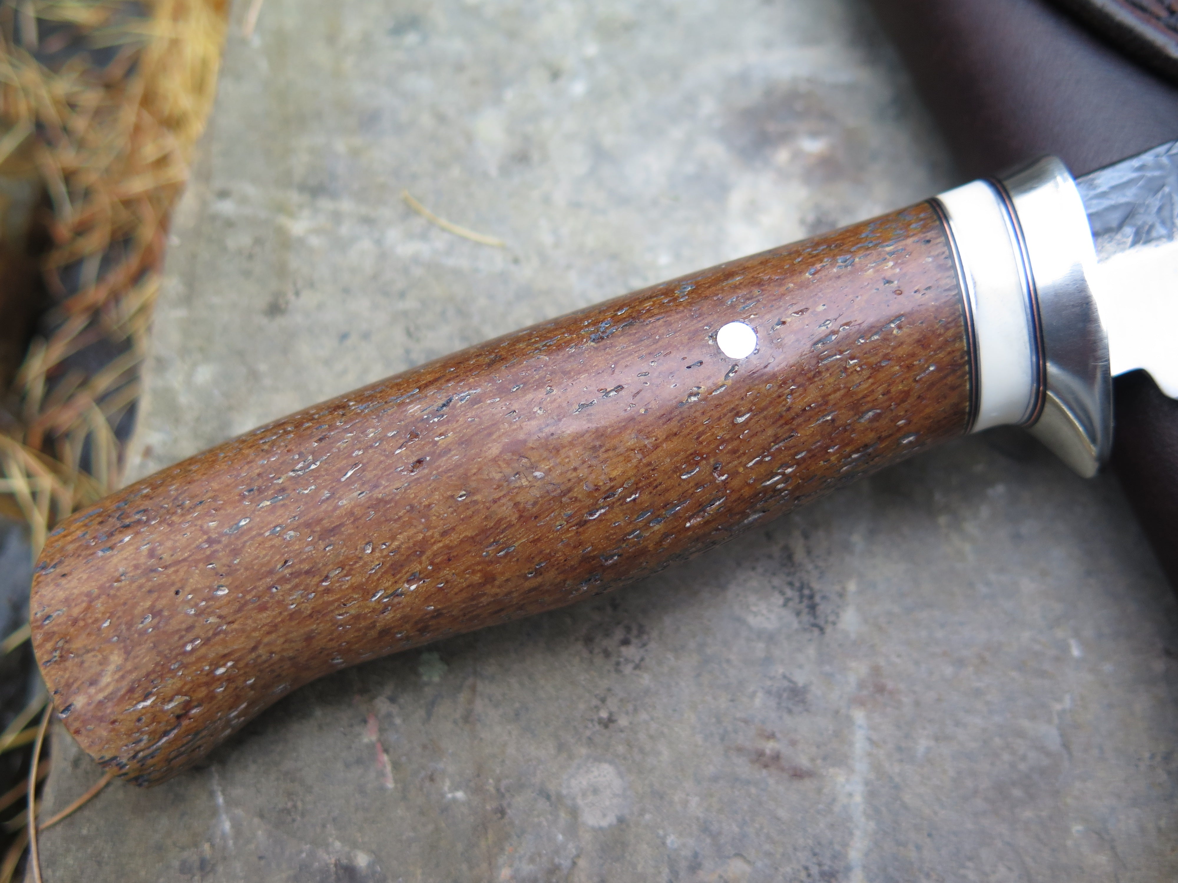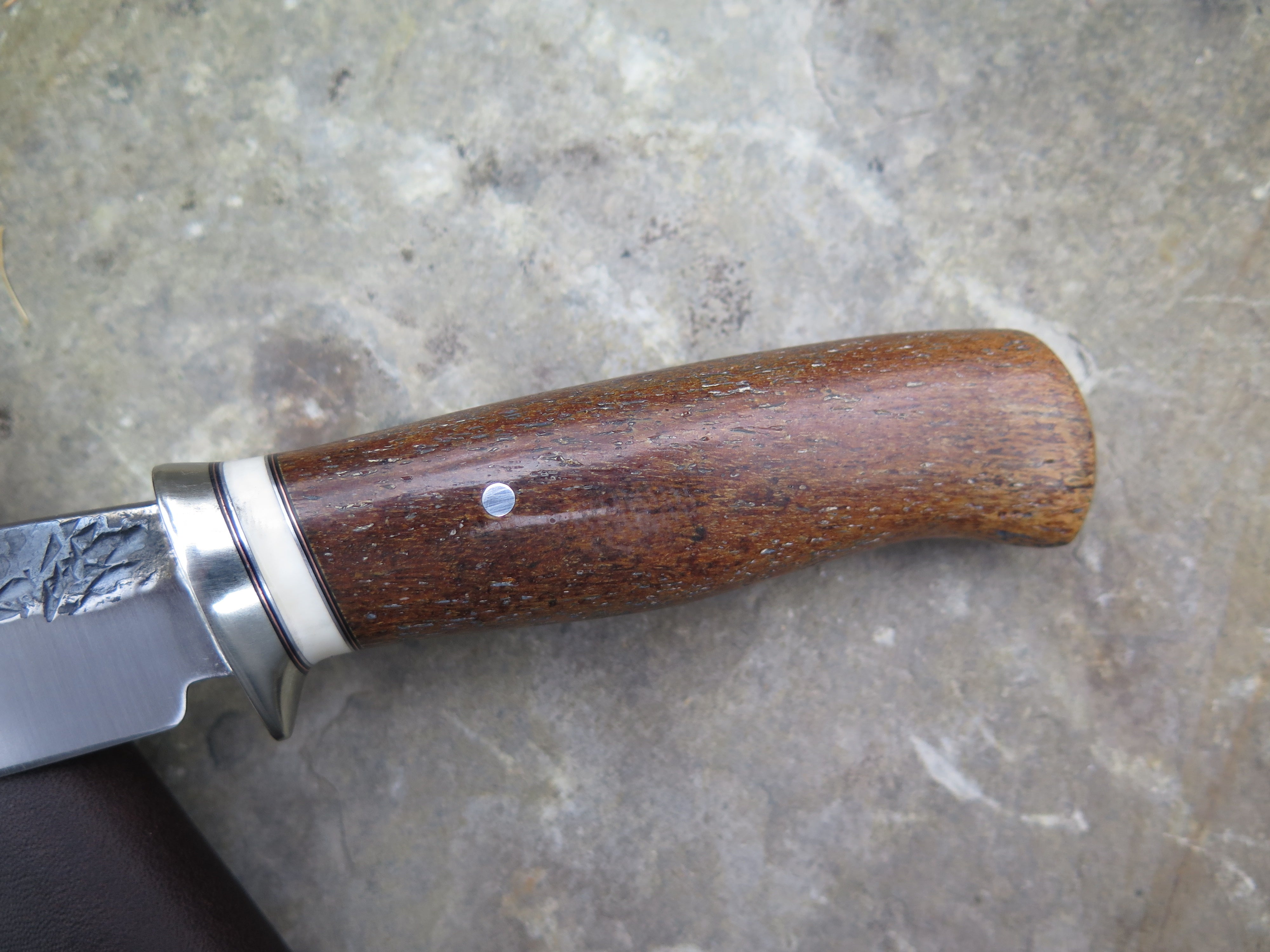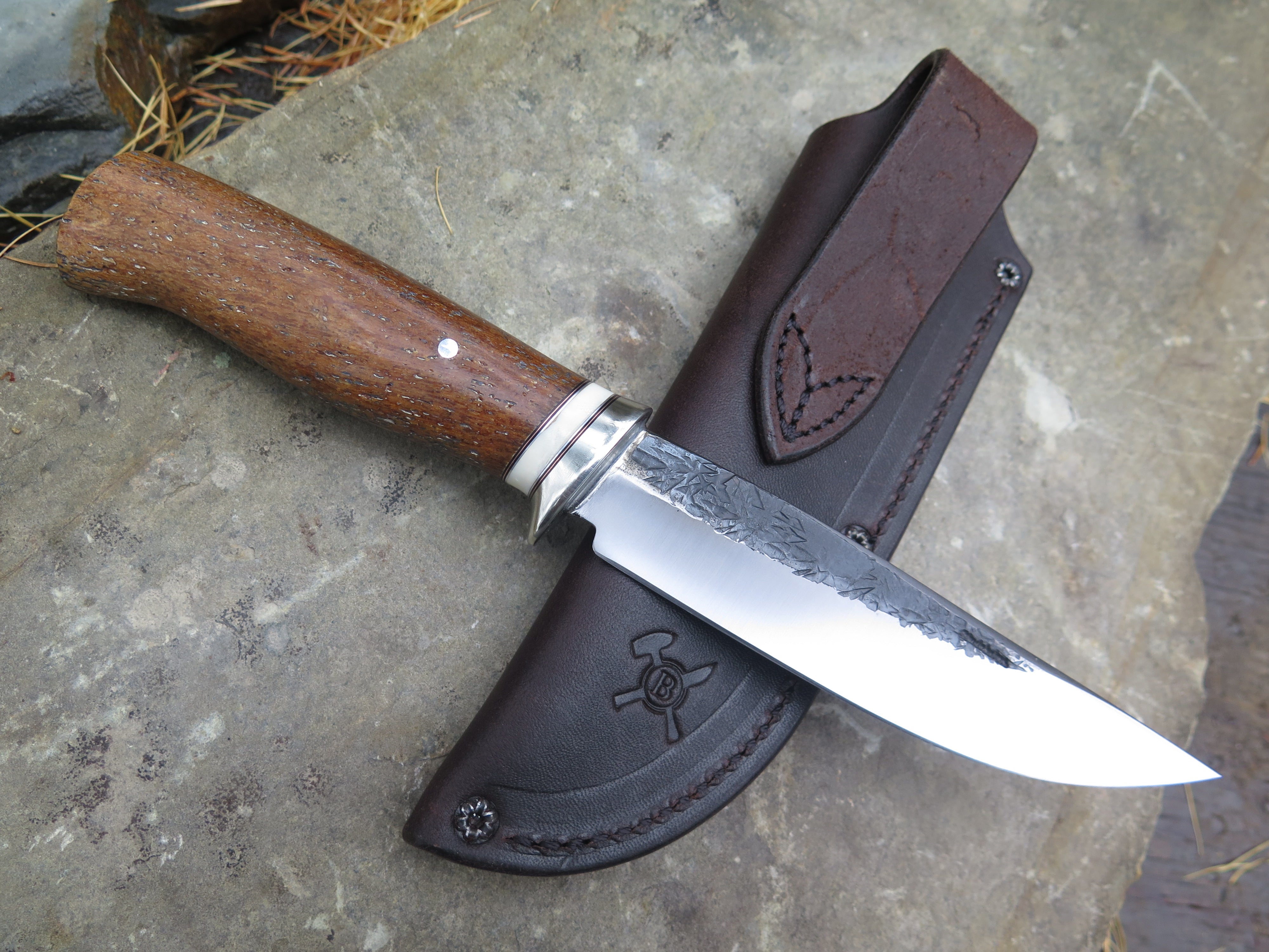 This new Trout & Bird from Behring Made© is hand forged from pre-WWII Studebaker truck leaf springs and it measures 5 1/2" from tip to guard with a razor sharp hollow grind and our hammermark finish. The nickel silver guard is soldered in place above black fiber, copper, aluminum and ancient mammoth ivory spacers. The handle is Stellar's sea cow rib bone, a species that went extinct in the Pleistocene period and not discovered by mariners until the later 1700's. The handle is pinned through the tang with aluminum and overall length measures 10", plus it comes in a classic leather belt pouch sheath.