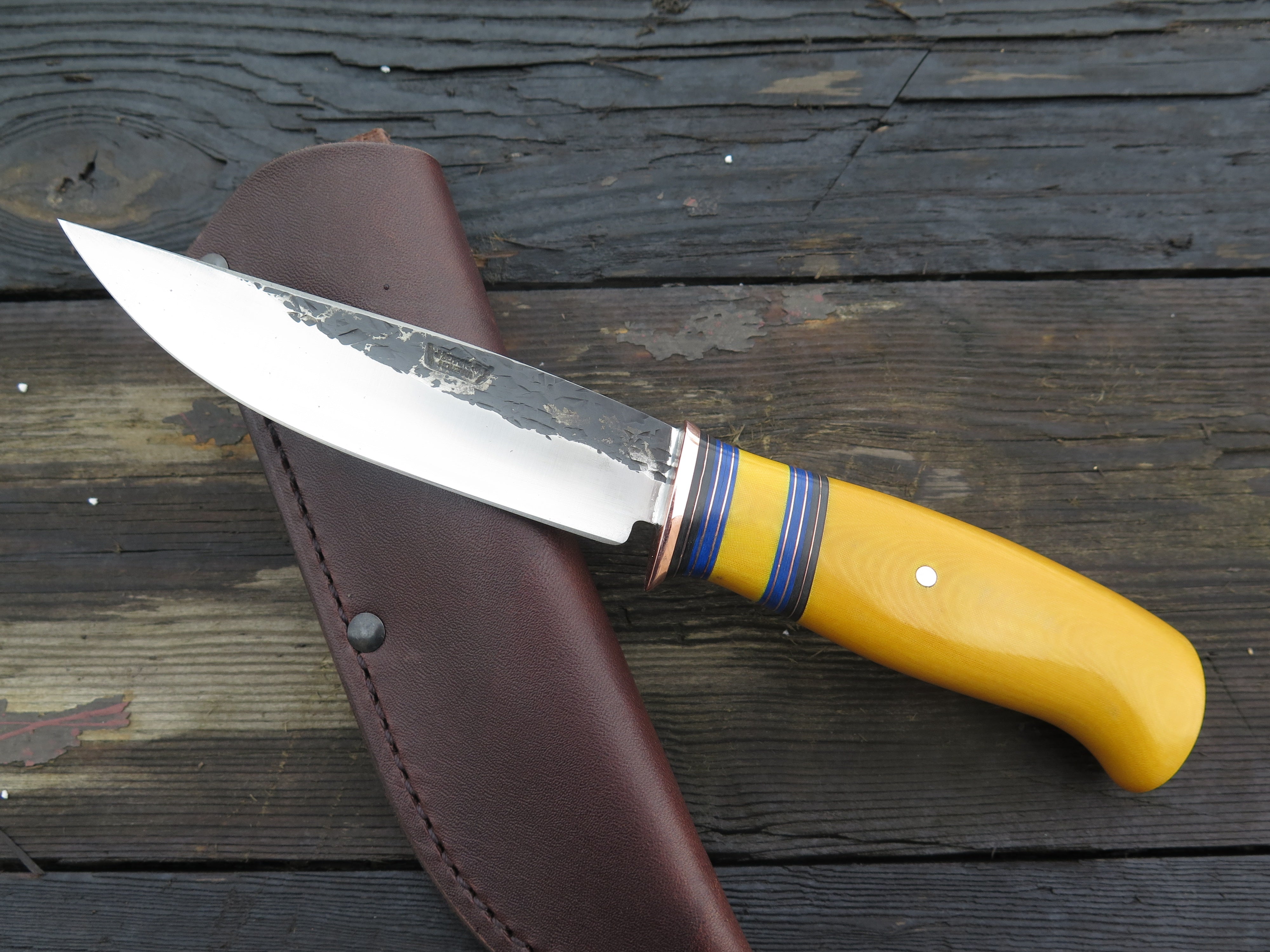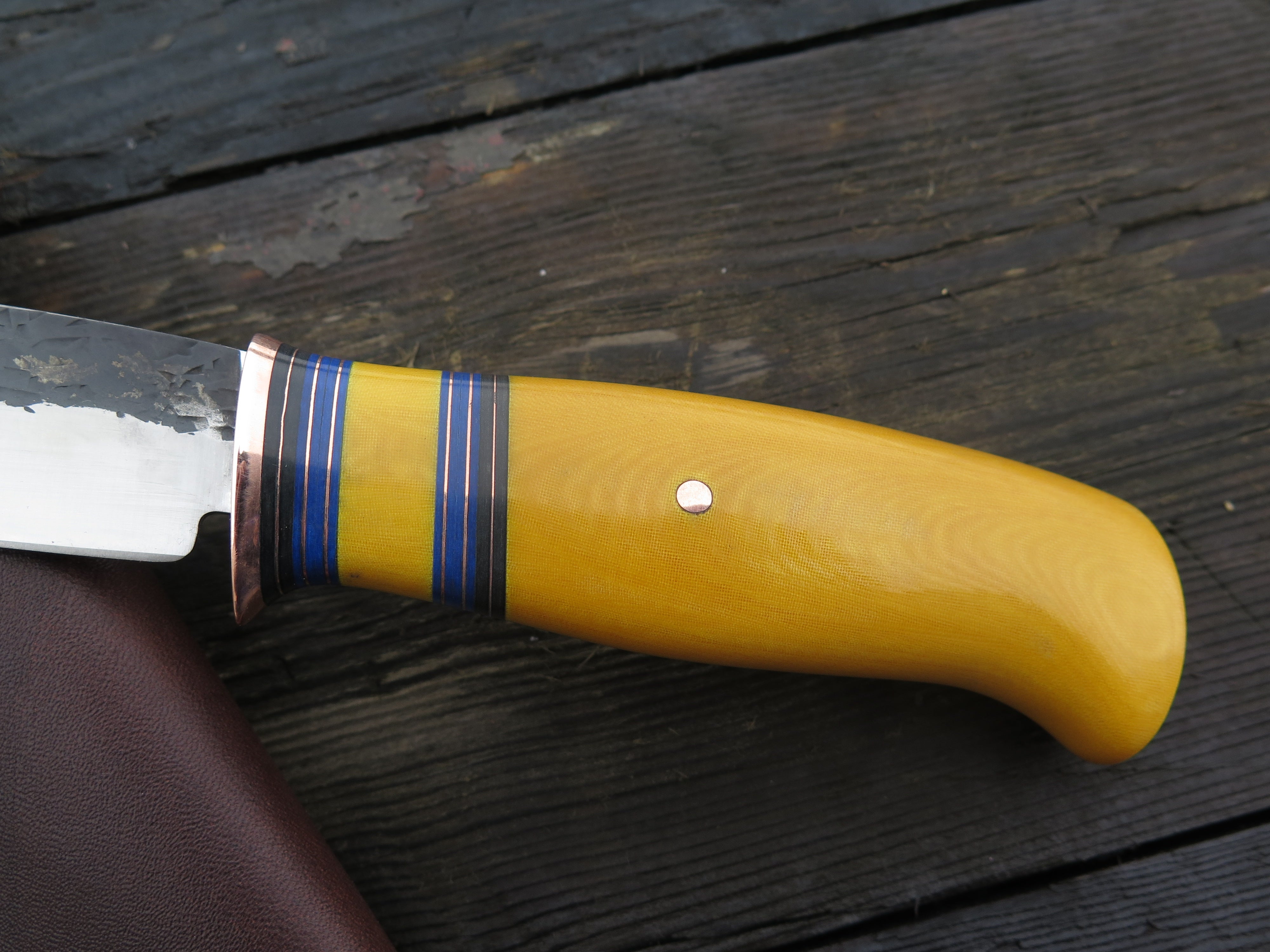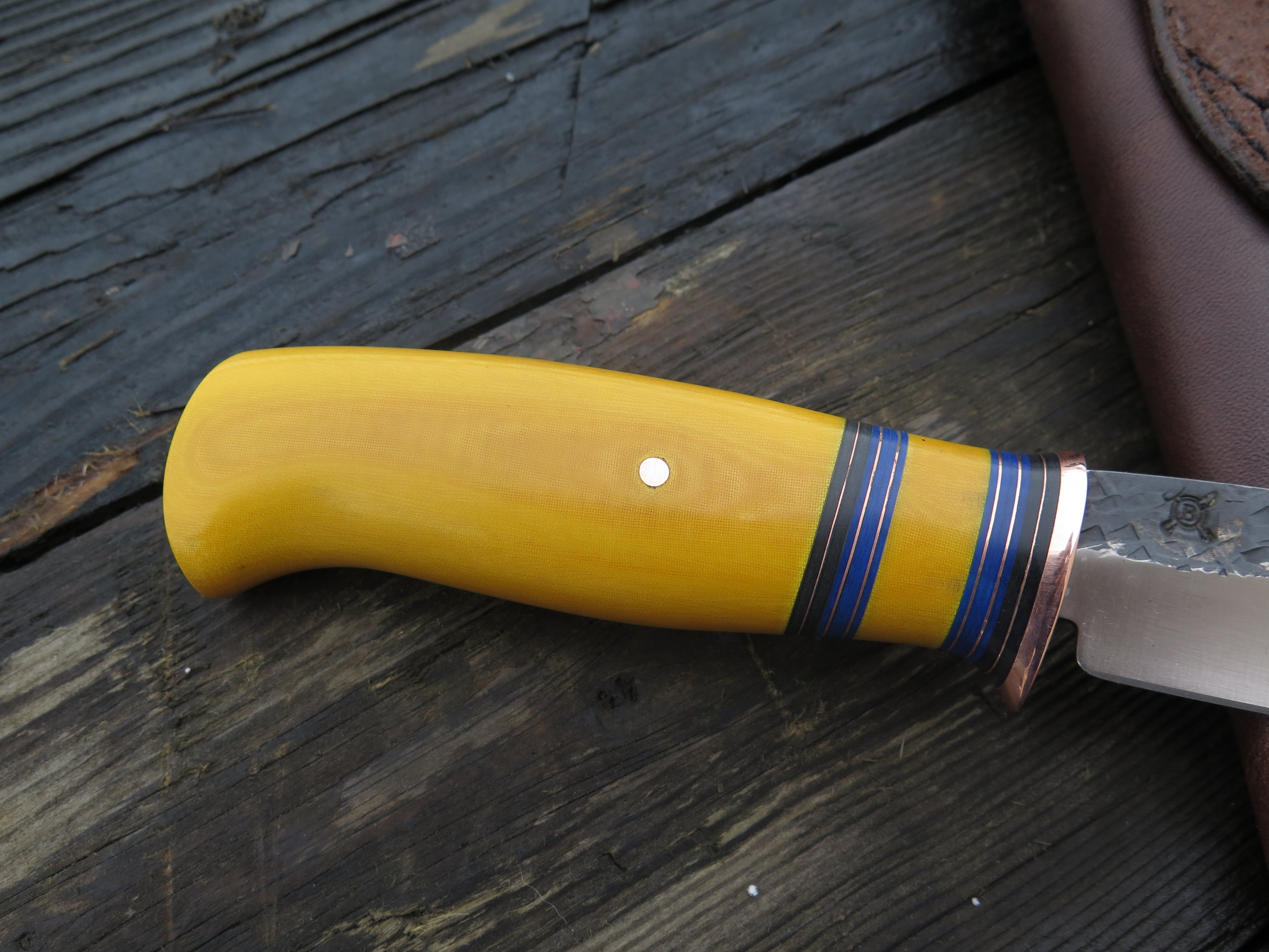 This beautiful new Trout and Bird from Behring Made© is 100% handmade starting with the 1/8" 440c stainless steel blade that measures 5" from tip to guard with a razor sharp hollow grind and our hammermark finish. The copper guard is silver soldered in place above black and blue fiber with copper spacers that pair perfectly with the yellow micarta handle. We've pinned through the tang with copper and the overall length comes to 9 3/8". This one also comes in a Warlander Leather pouch sheath and is guaranteed for life!