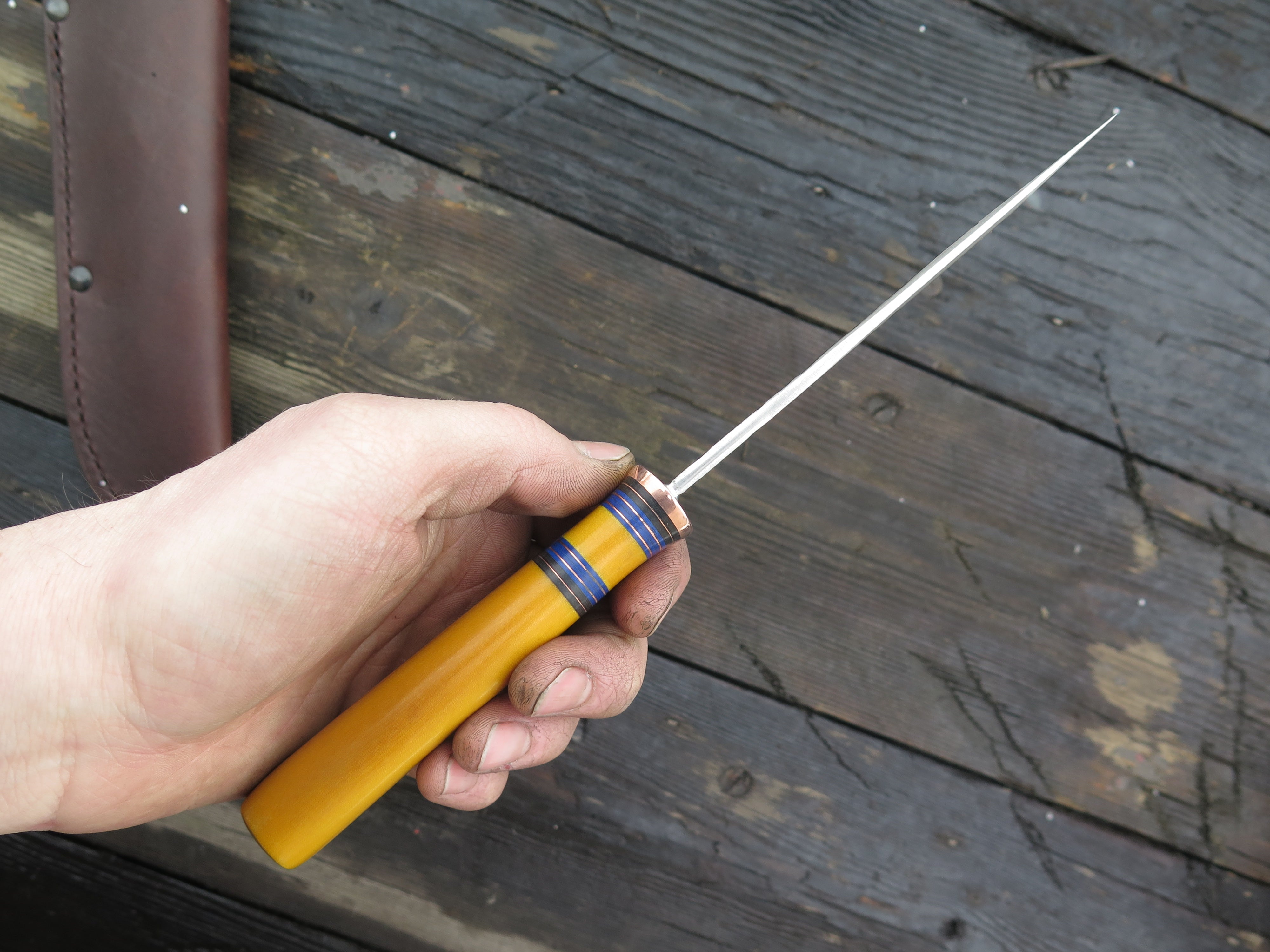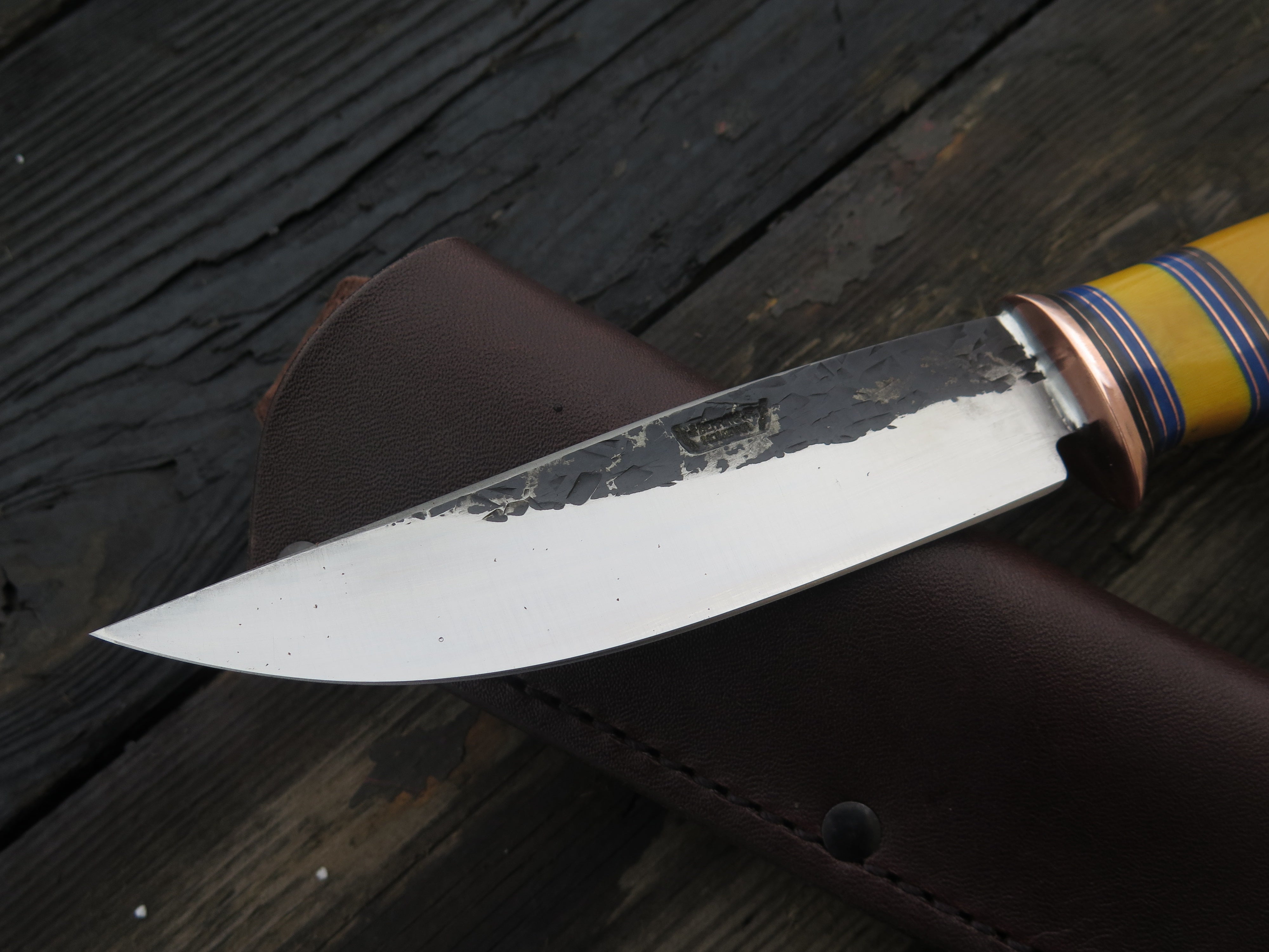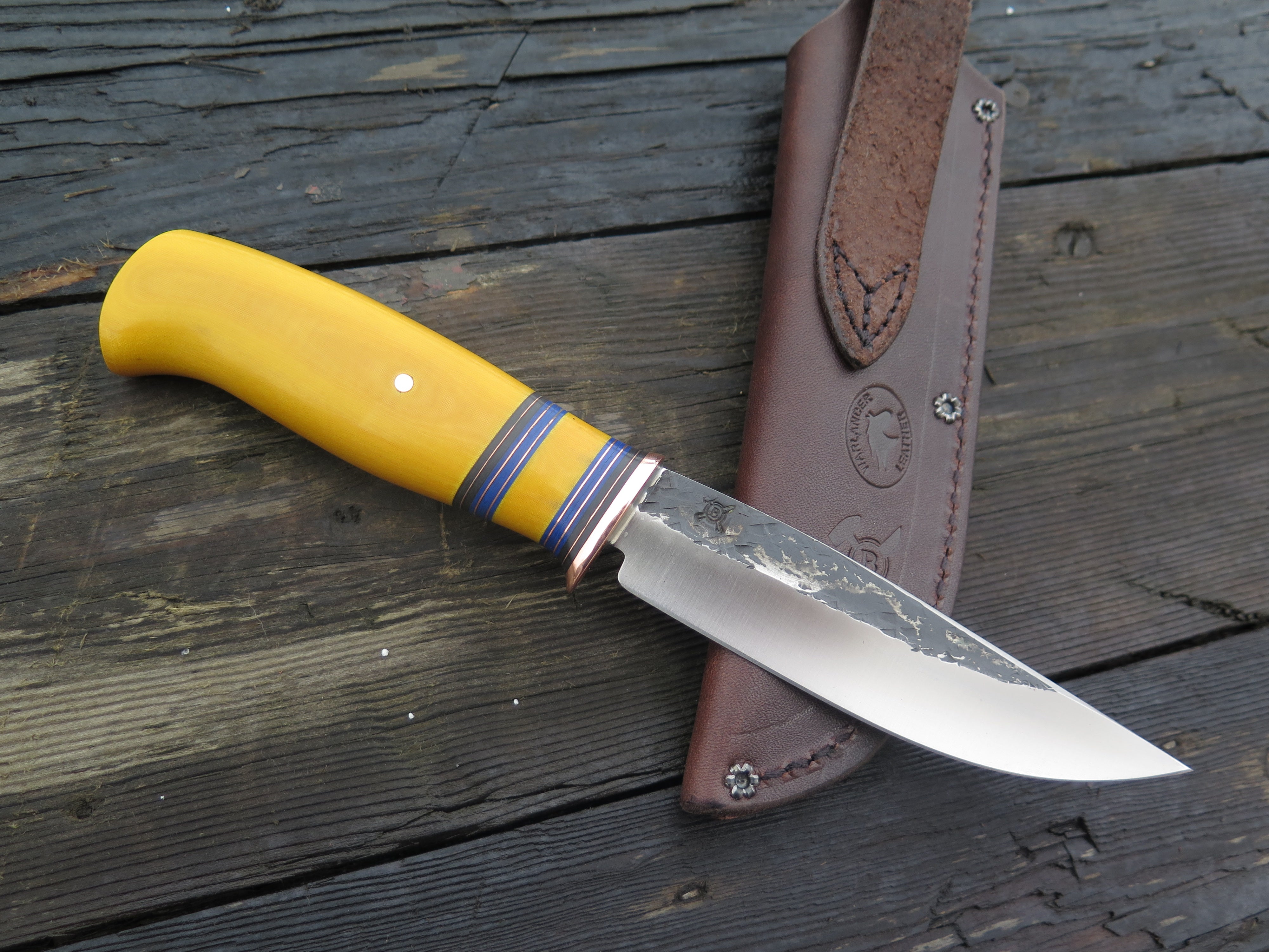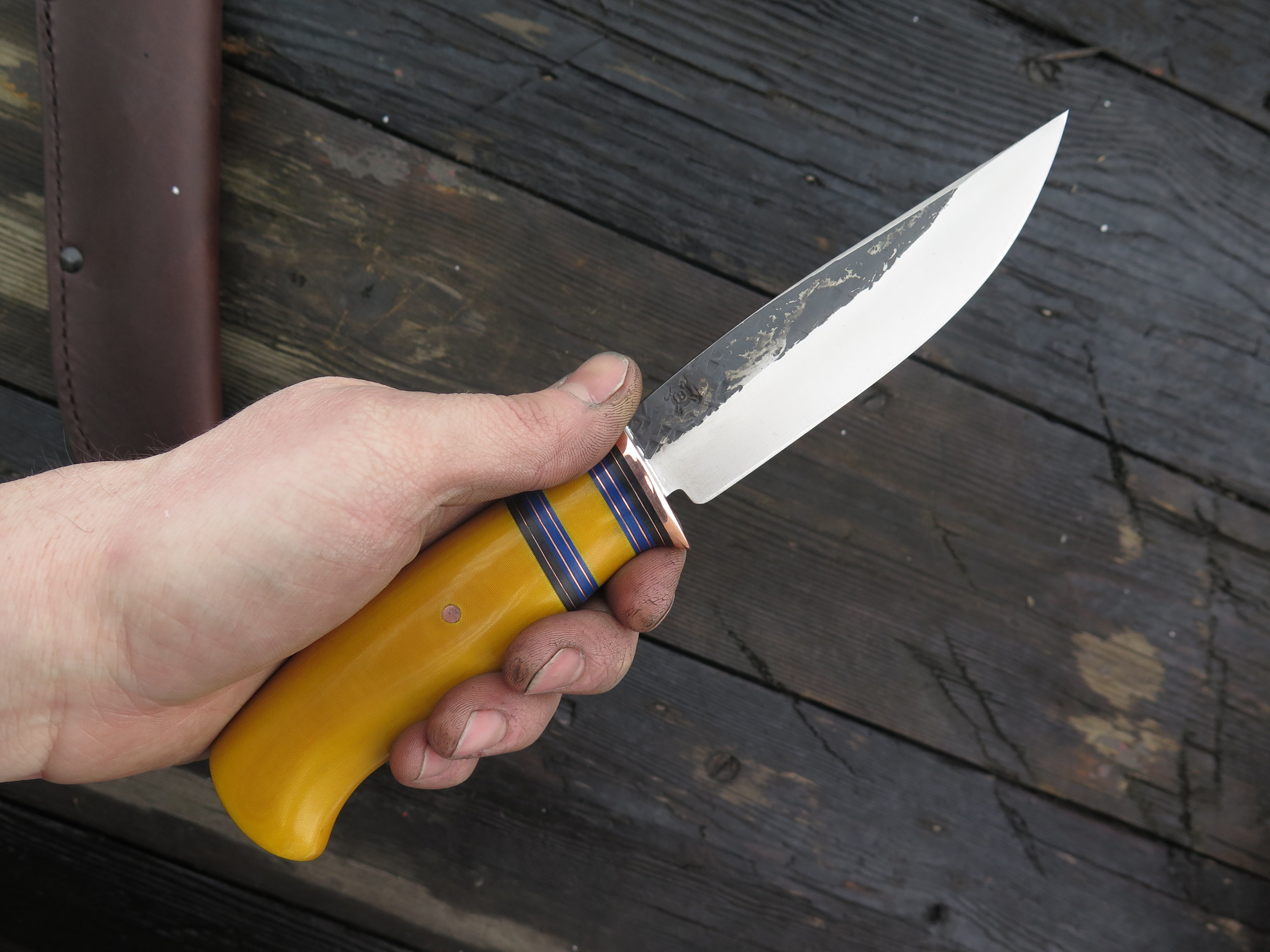 This beautiful new Trout and Bird from Behring Made© is 100% handmade starting with the 1/8" 440c stainless steel blade that measures 5" from tip to guard with a razor sharp hollow grind and our hammermark finish. The copper guard is silver soldered in place above black and blue fiber with copper spacers that pair perfectly with the yellow micarta handle. We've pinned through the tang with copper and the overall length comes to 9 3/8". This one also comes in a Warlander Leather pouch sheath and is guaranteed for life!