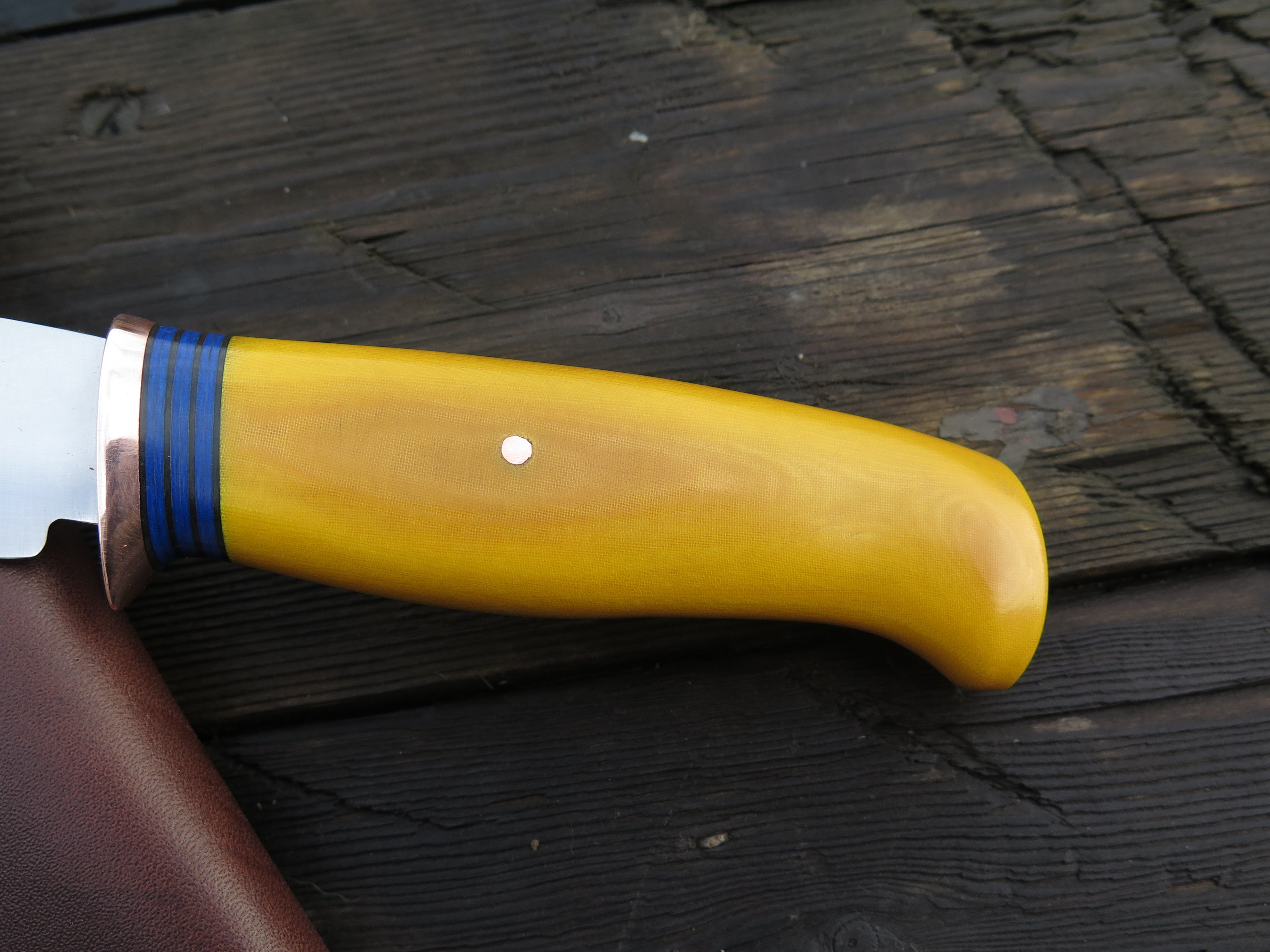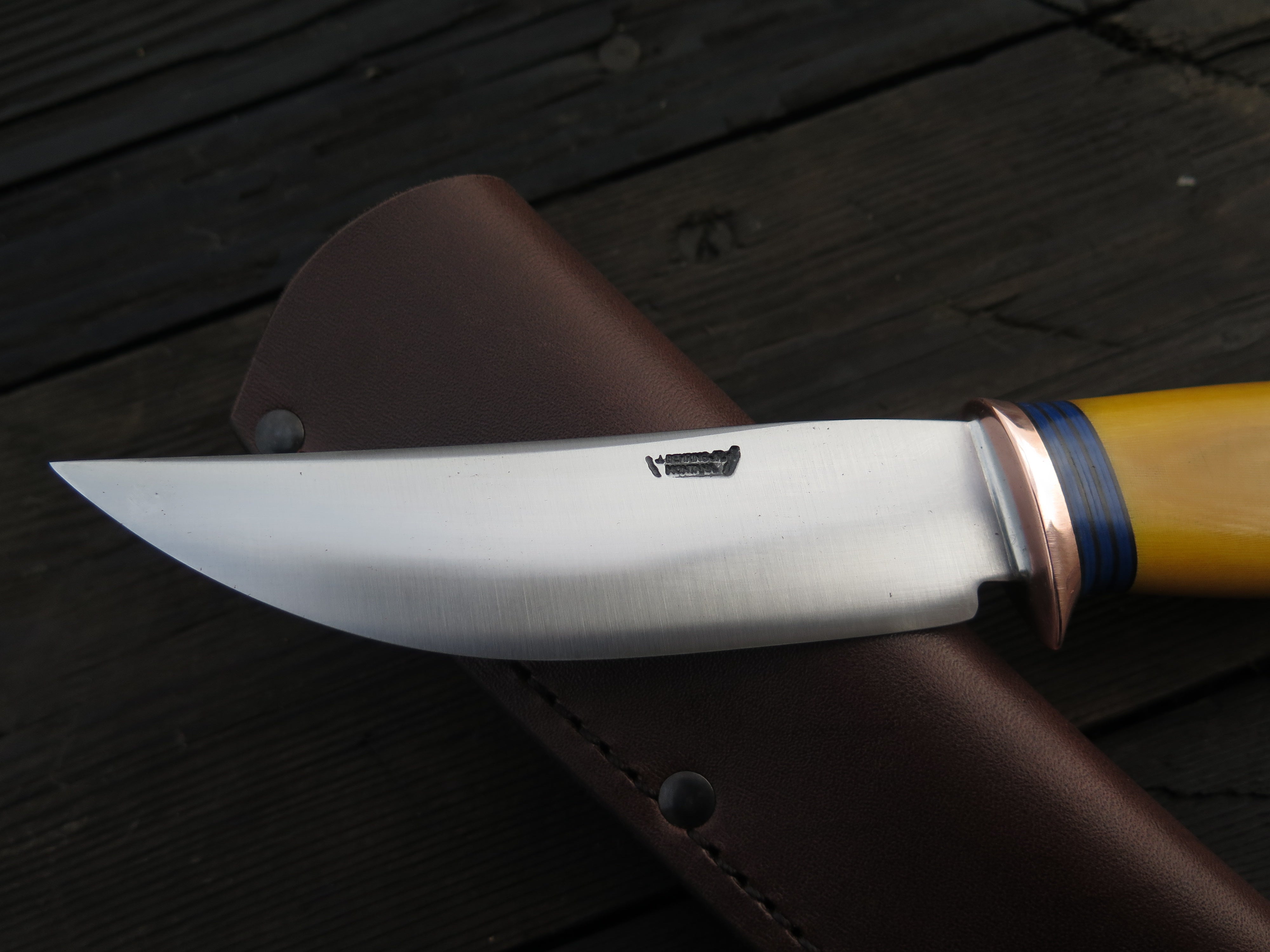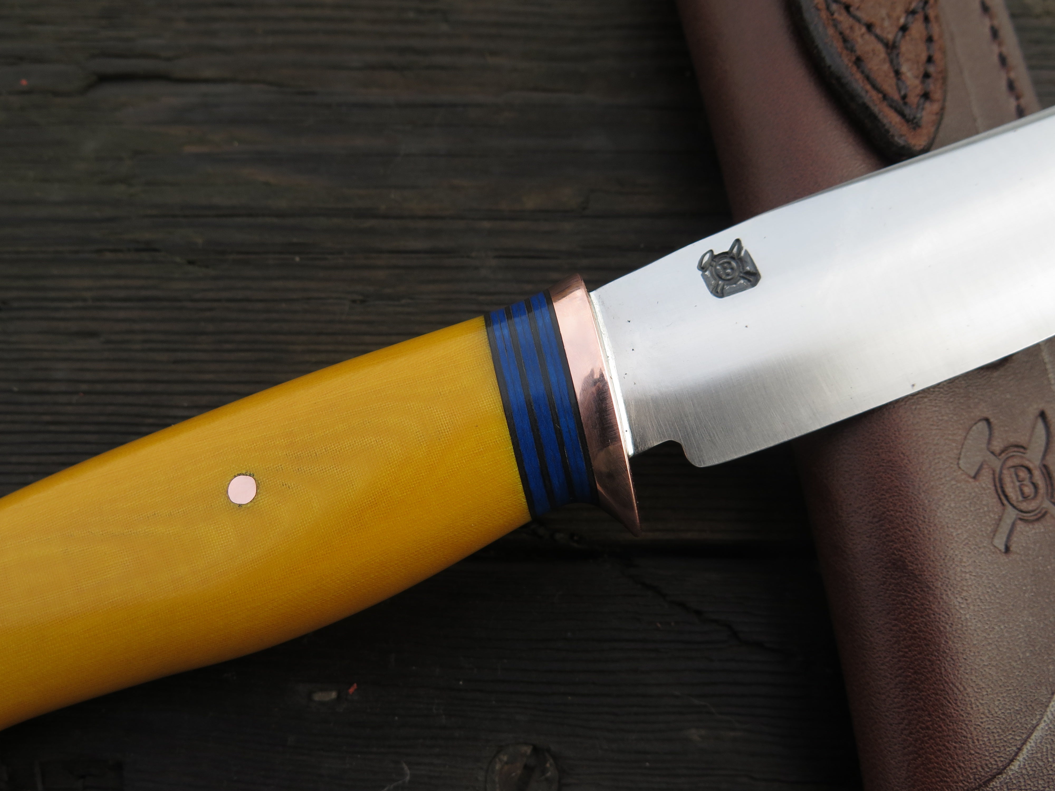 This beautiful Behring Made© Trout & Bird is hand forged from 3/16" thick high carbon 01 tool steel and it measures 5" from tip to guard with a razor sharp convex grind. The copper guard is soldered in place above black and blue fibre spacers as well as a classic yellow westinghouse micarta handle that's also pinned with copper. The overall length measures 9 5/8" and it also comes in a Warlander Leather pouch sheath.