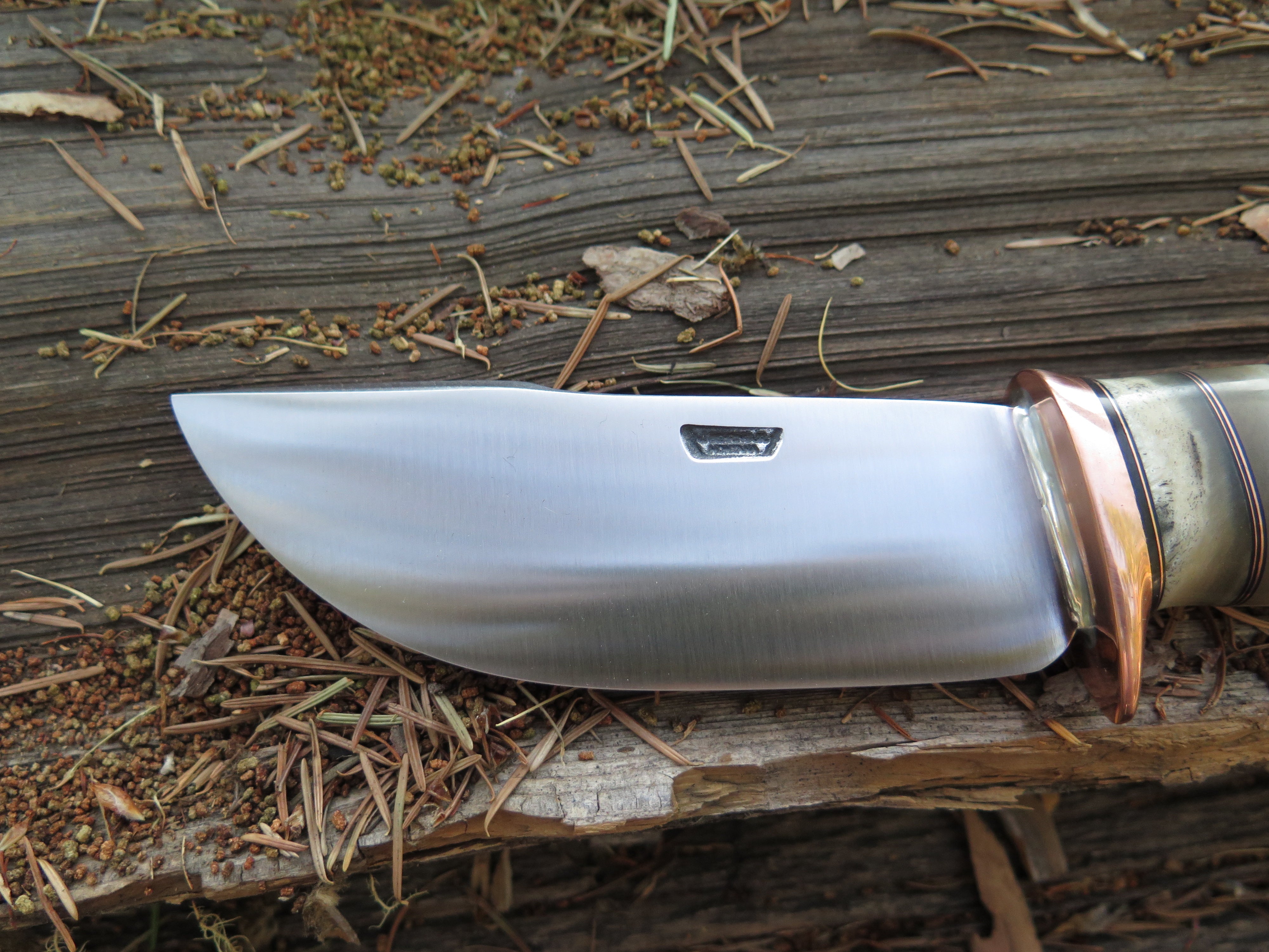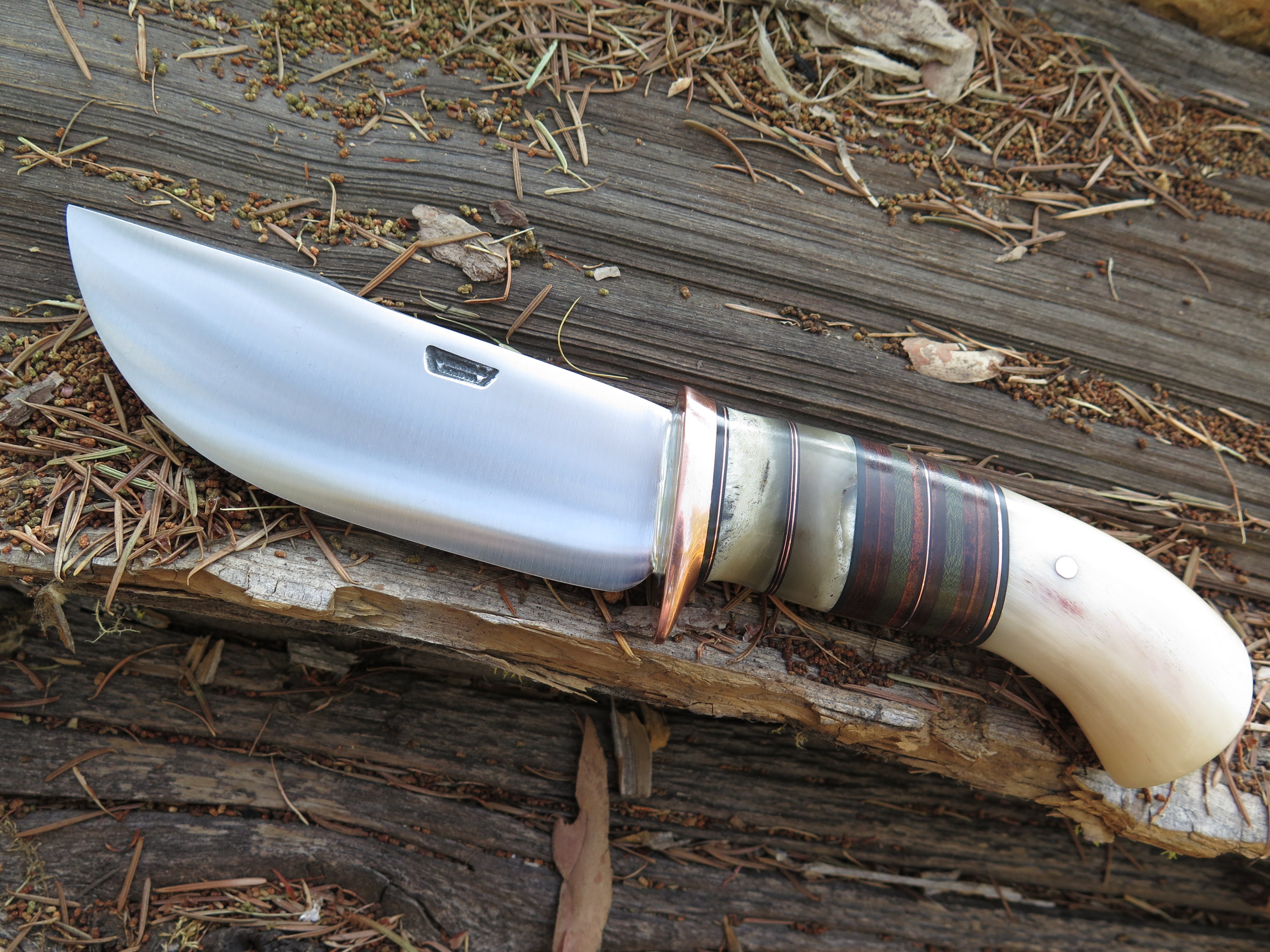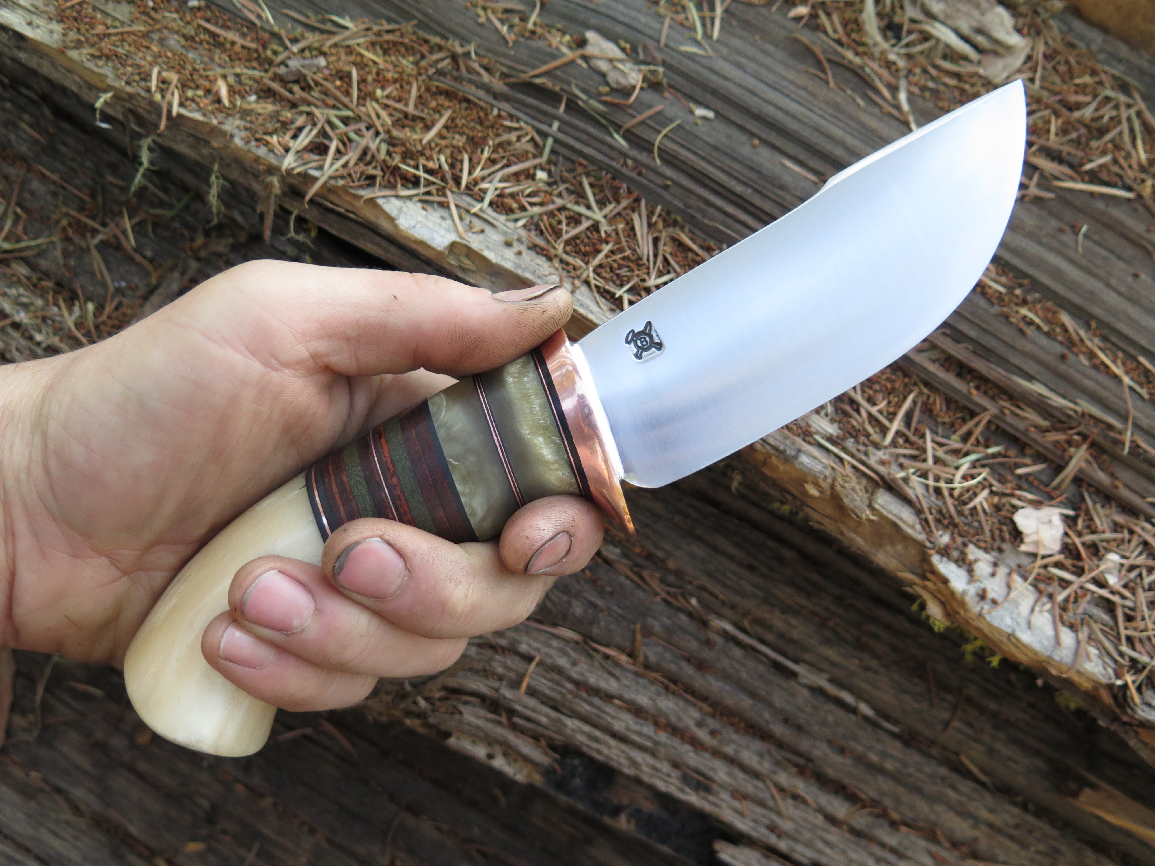 This beastly new Woodcraft from Behring Made© is hand forged from 3/16" thick high carbon 01 tool steel and it measures 5" from tip to guard with a razor sharp convex grind. The copper guard is soldered in place above black fiber, green micarta, copper, horsehide and two beautiful musk ox spacers in addition to the musk ox horn butt that is also pinned with copper. The overall length measures 9 1/2" and it comes in a custom pouch sheath from Warlander Leather.
