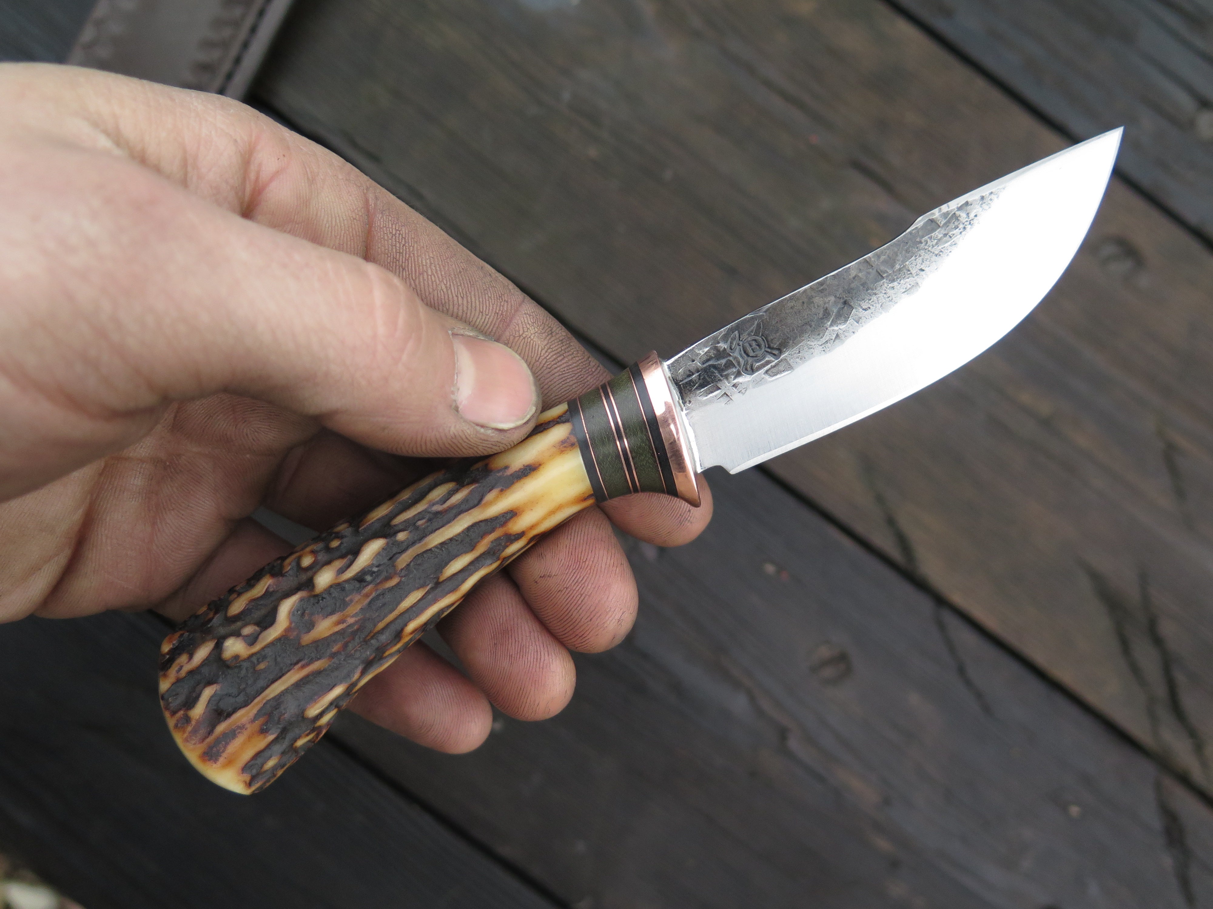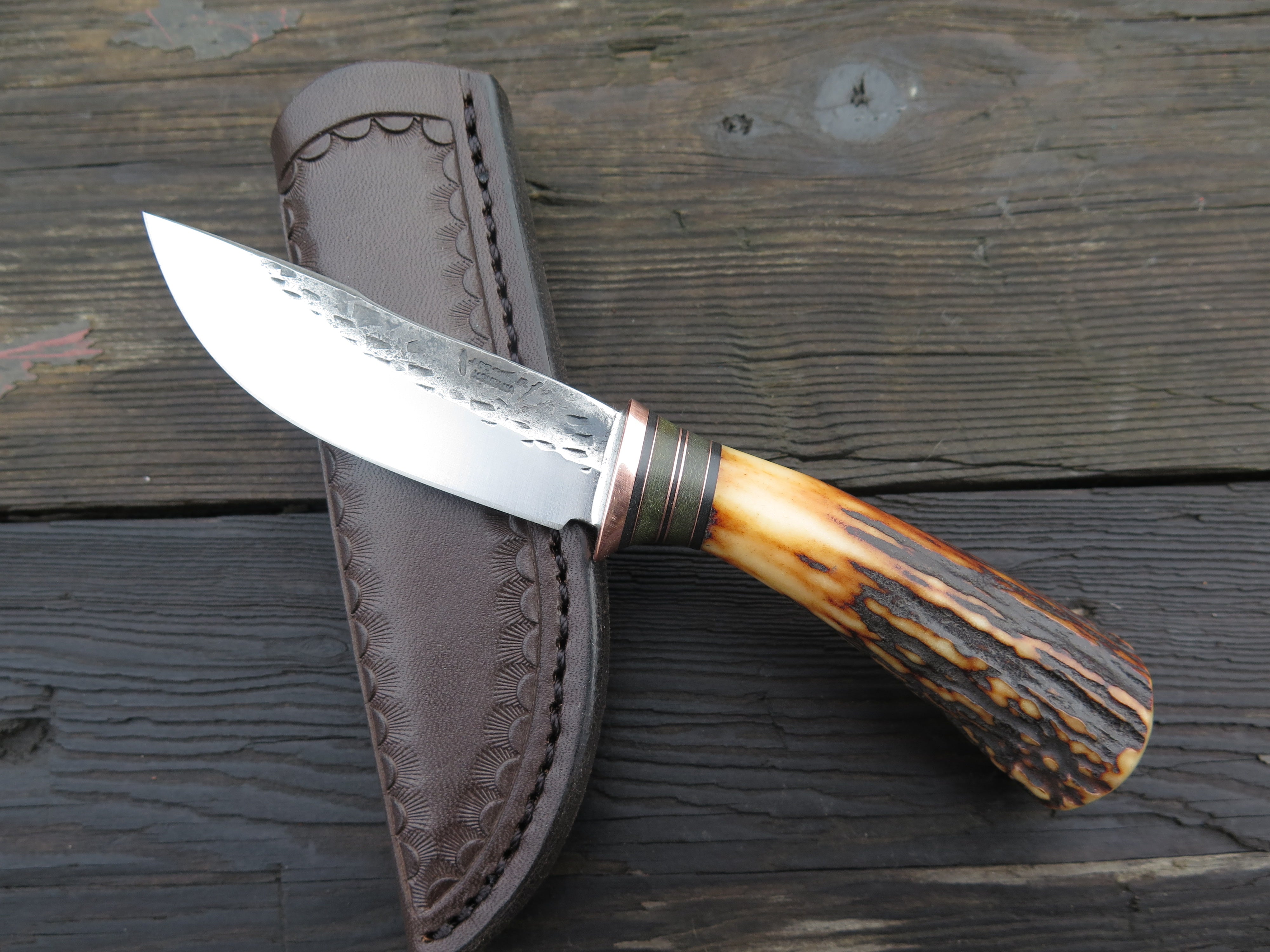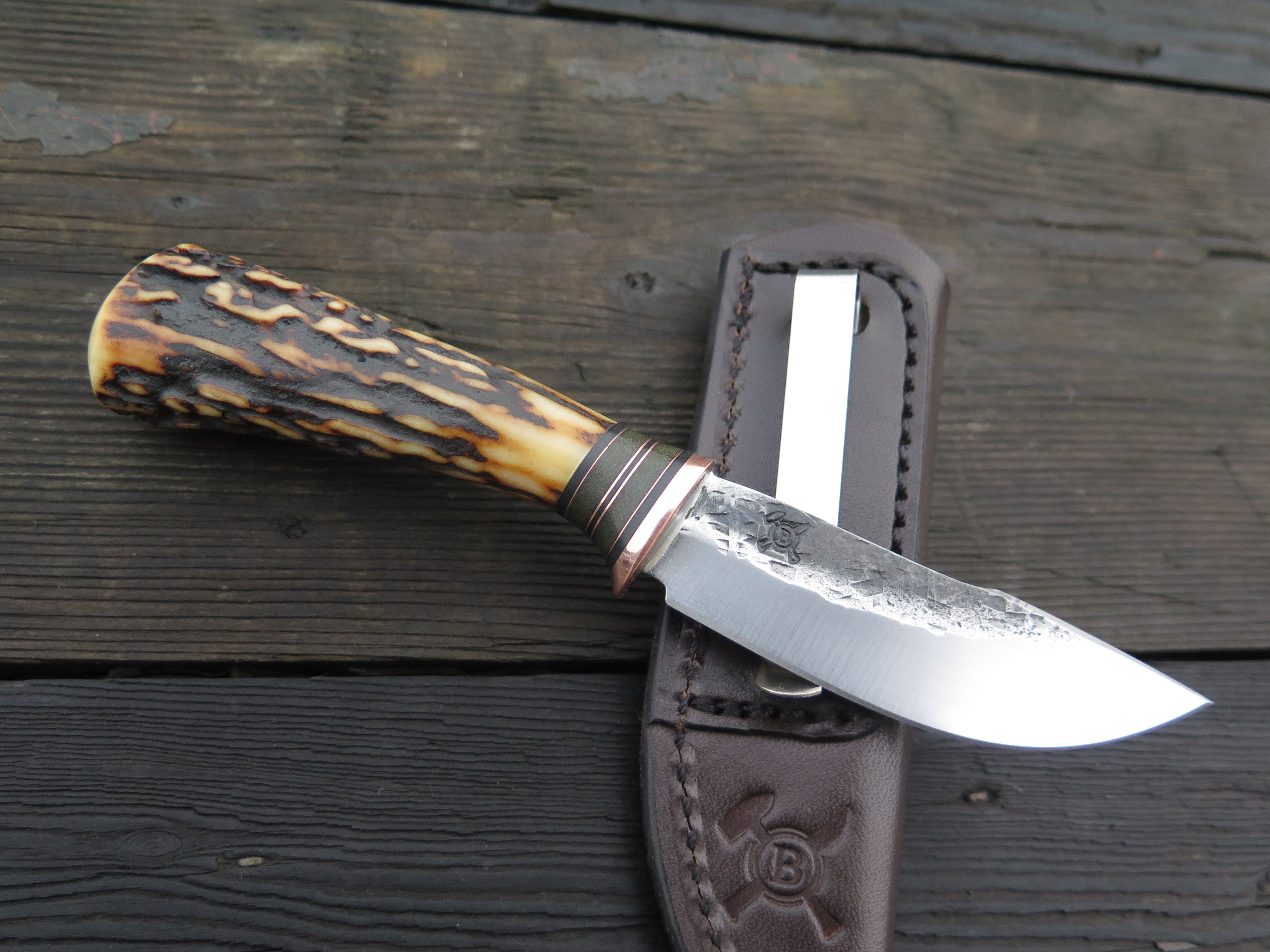 This beautiful new Woodcraft pocket knife from Behring Made© is hand forged from 1/8" thick high carbon 01 tool steel and it measures 3 1/4" from tip to guard with a razor sharp hollow grind and our hammermark finish. The copper guard is soldered in place above black fiber, copper and green micarta spacers as well as a premium sambar stag handle with truly impressive texture and natural coloration. The overall length measures 6 5/8" and it comes in a clip pouch sheath designed for wear in the right hand pocket of your jeans.
