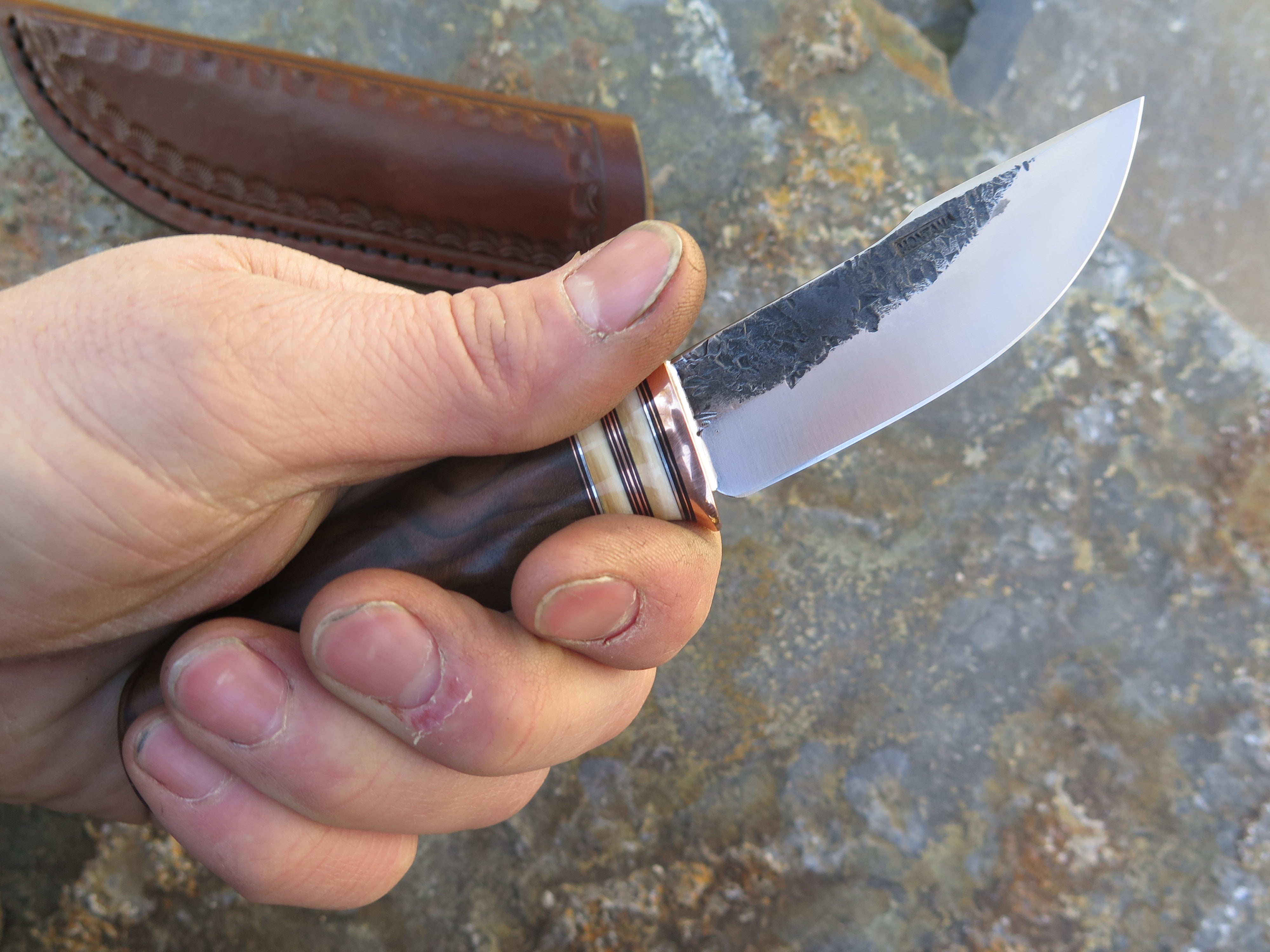 This sleek new Behring Made© Woodcraft pocket is hand forged from 1/8" thick high carbon 01 tool steel and it measures 3" from tip to guard with a razor sharp hollow grind and our hammermark finish. The copper guard is soldered in place above black fiber, copper, aluminum and two mammoth ivory spacers. The premium Turkish walnut handle features a beautiful grain pattern and the overall length measures just over 6 1/2". The sheath is outfitted with a spring clip and designed to ride conveniently inside the right hand pocket of your britches.