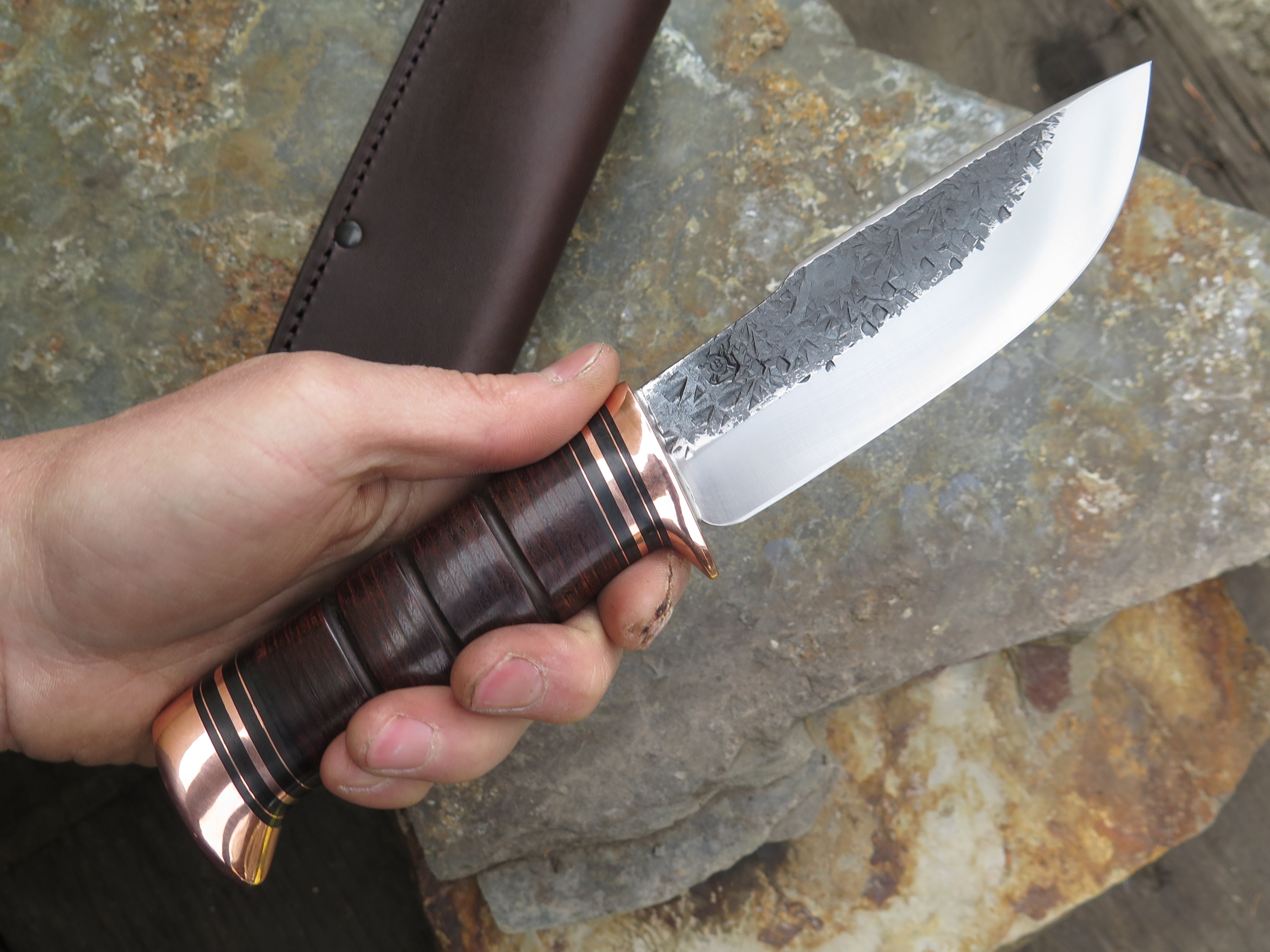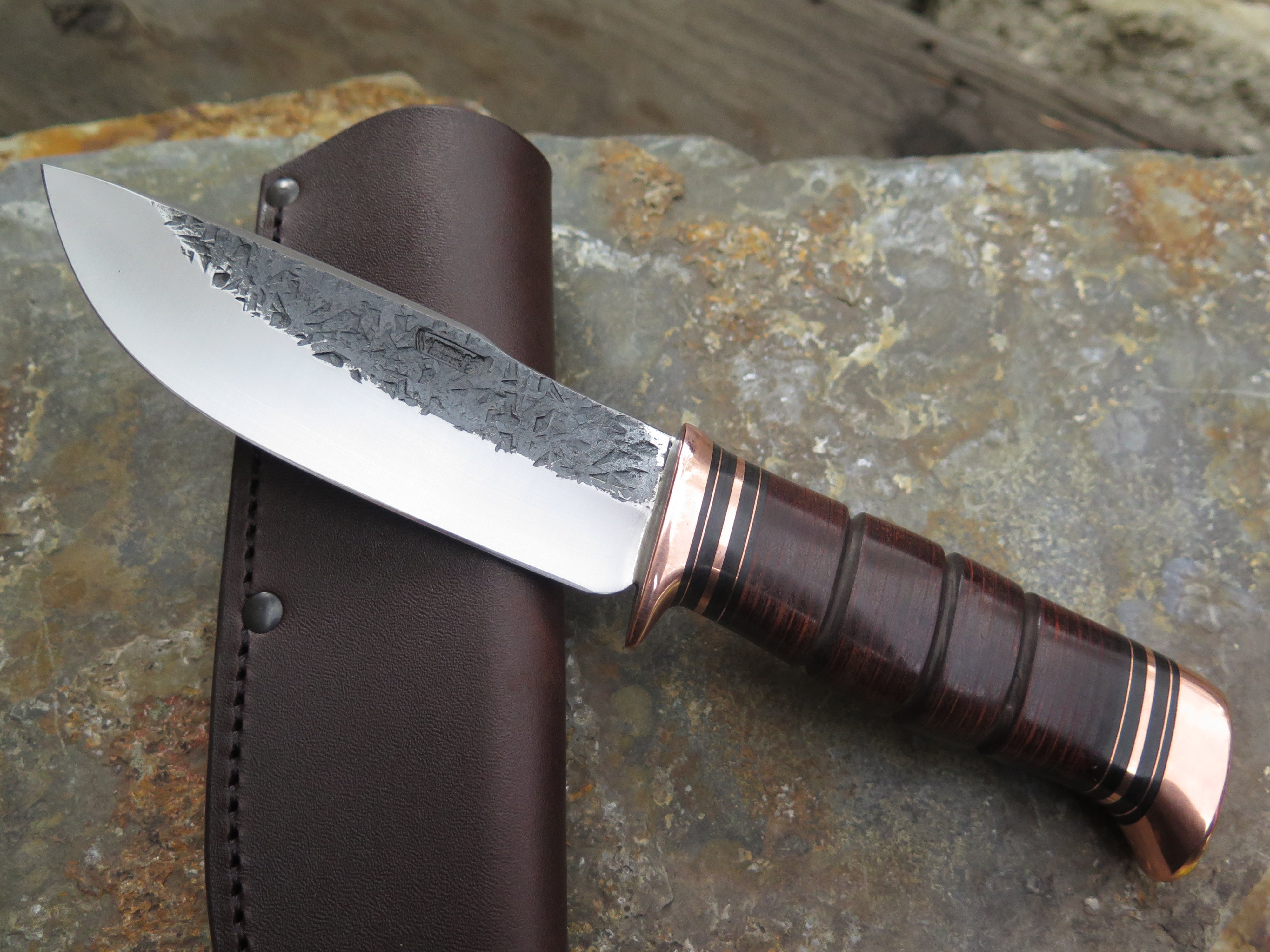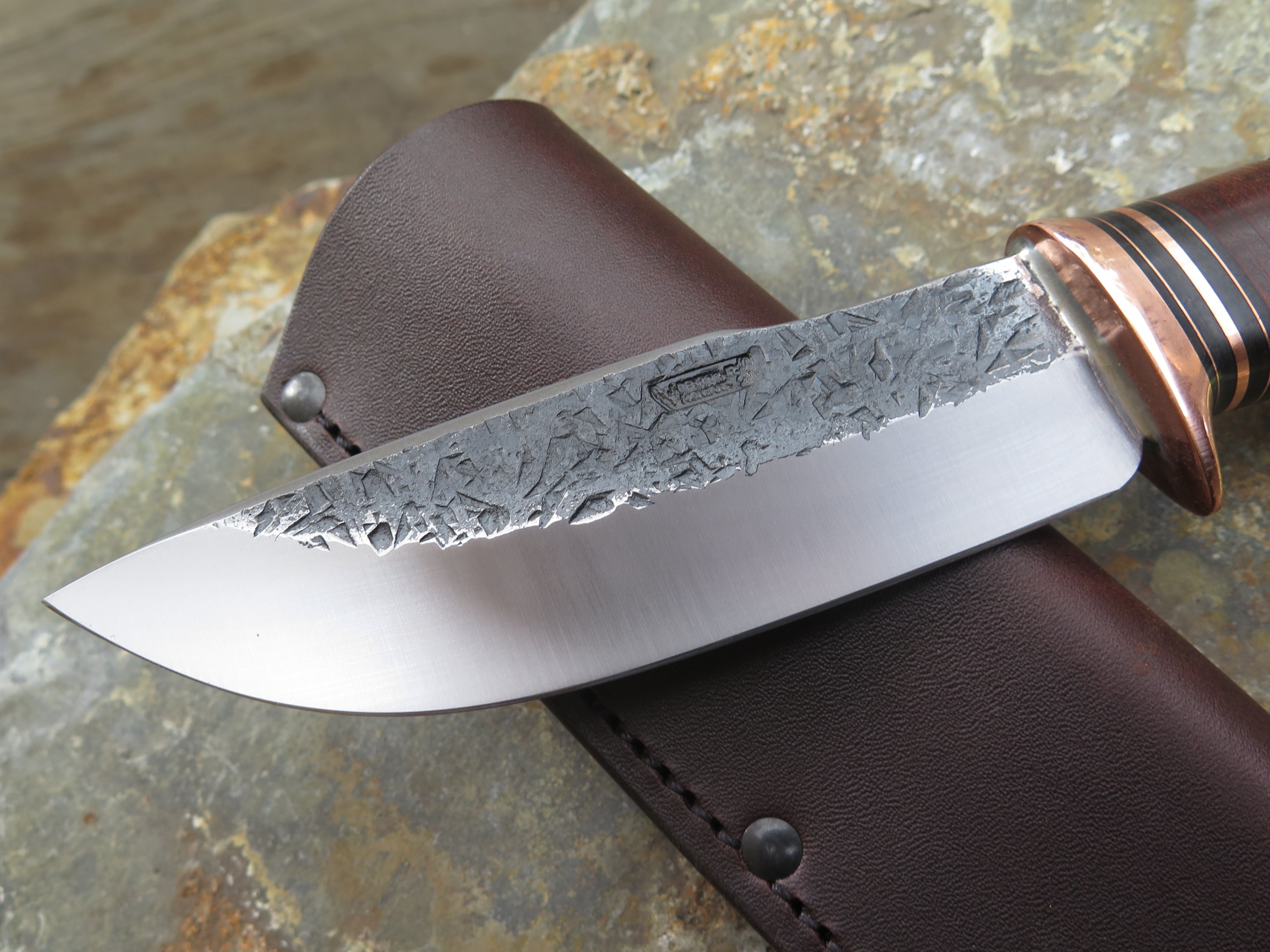 This drop point blade is hand forged from 3/16" thick high carbon 01 tool steel and it measures 5 1/2" from tip to guard with a razor sharp hollow grind and our hammermark finish. The copper guard is soldered in place above black fiber and copper spacers as well as a scalloped stack of horsehide leather and a copper butt that's also pinned through the tang with copper. The overall length measures just over 10" and it comes in a classic leather belt pouch sheath. This knife is made to order. Current lead times are 6 - 8 weeks.