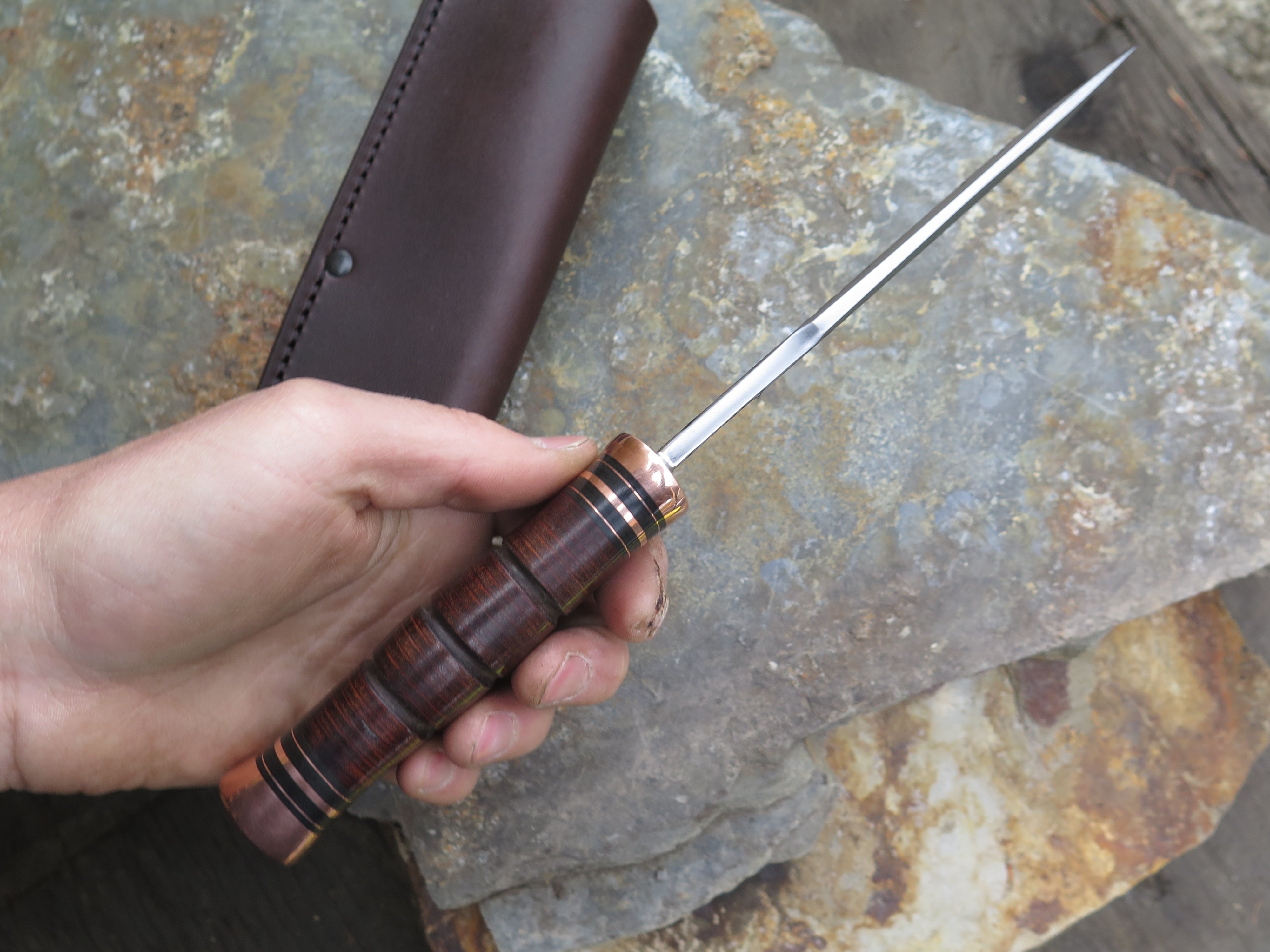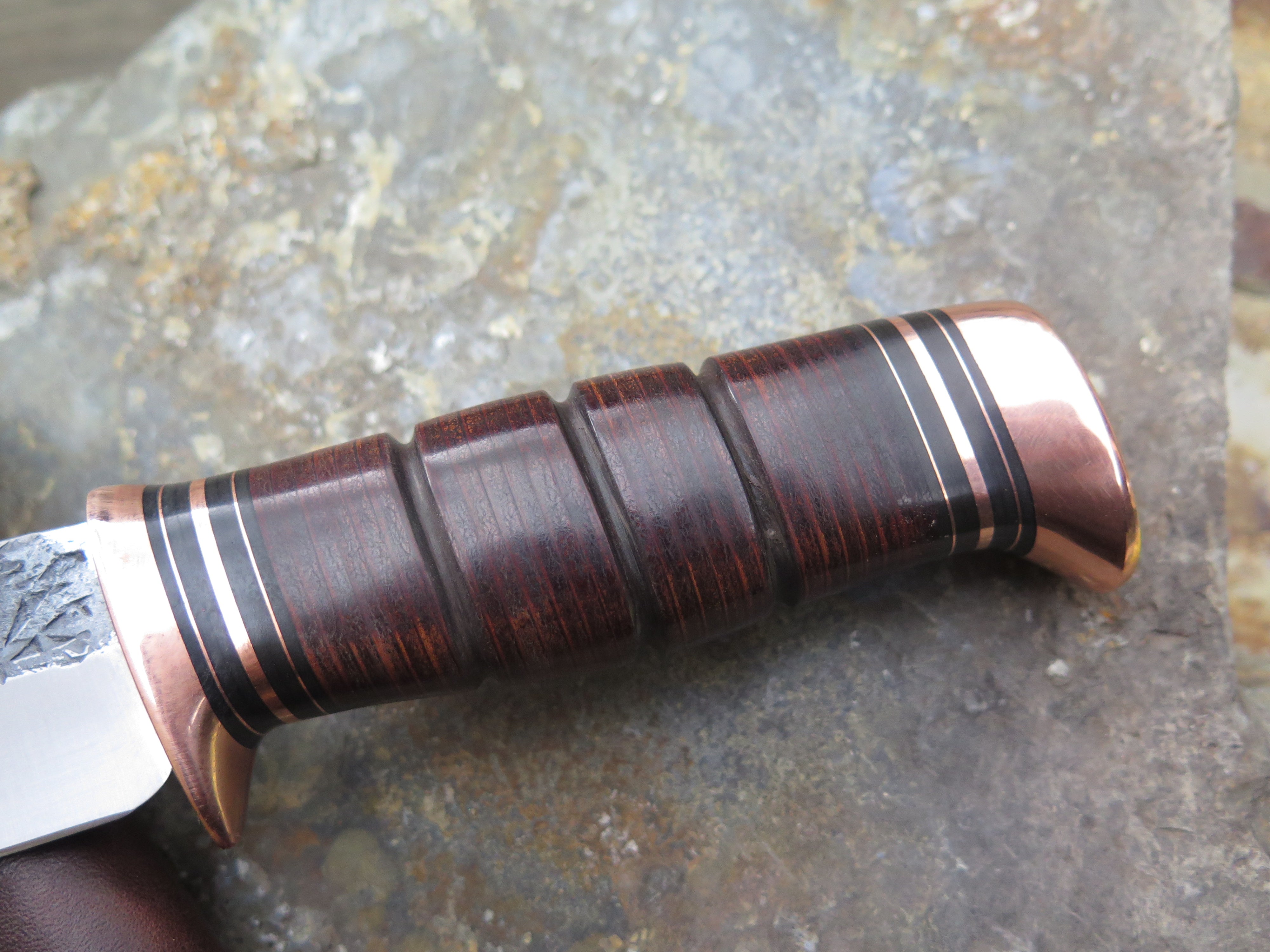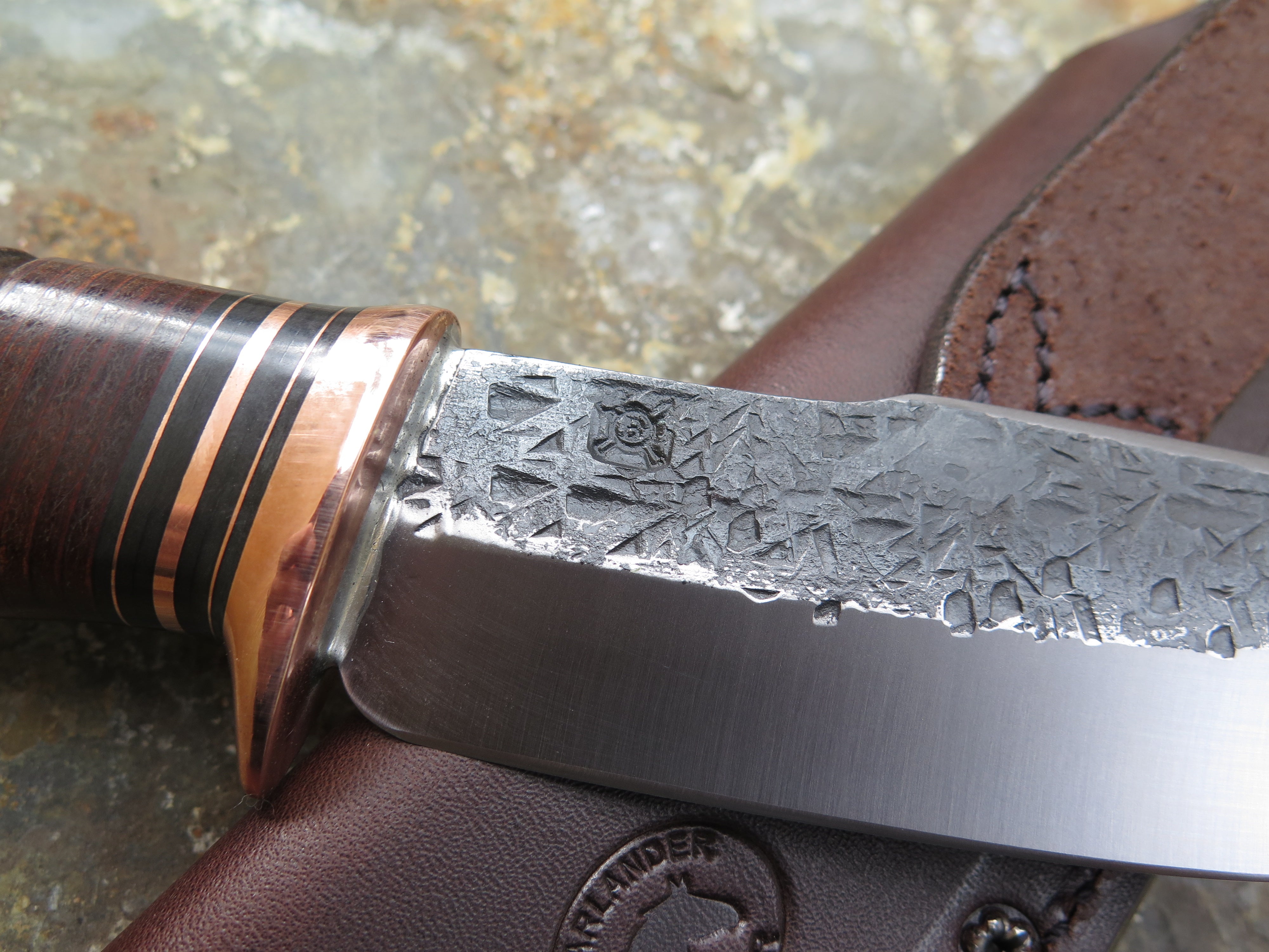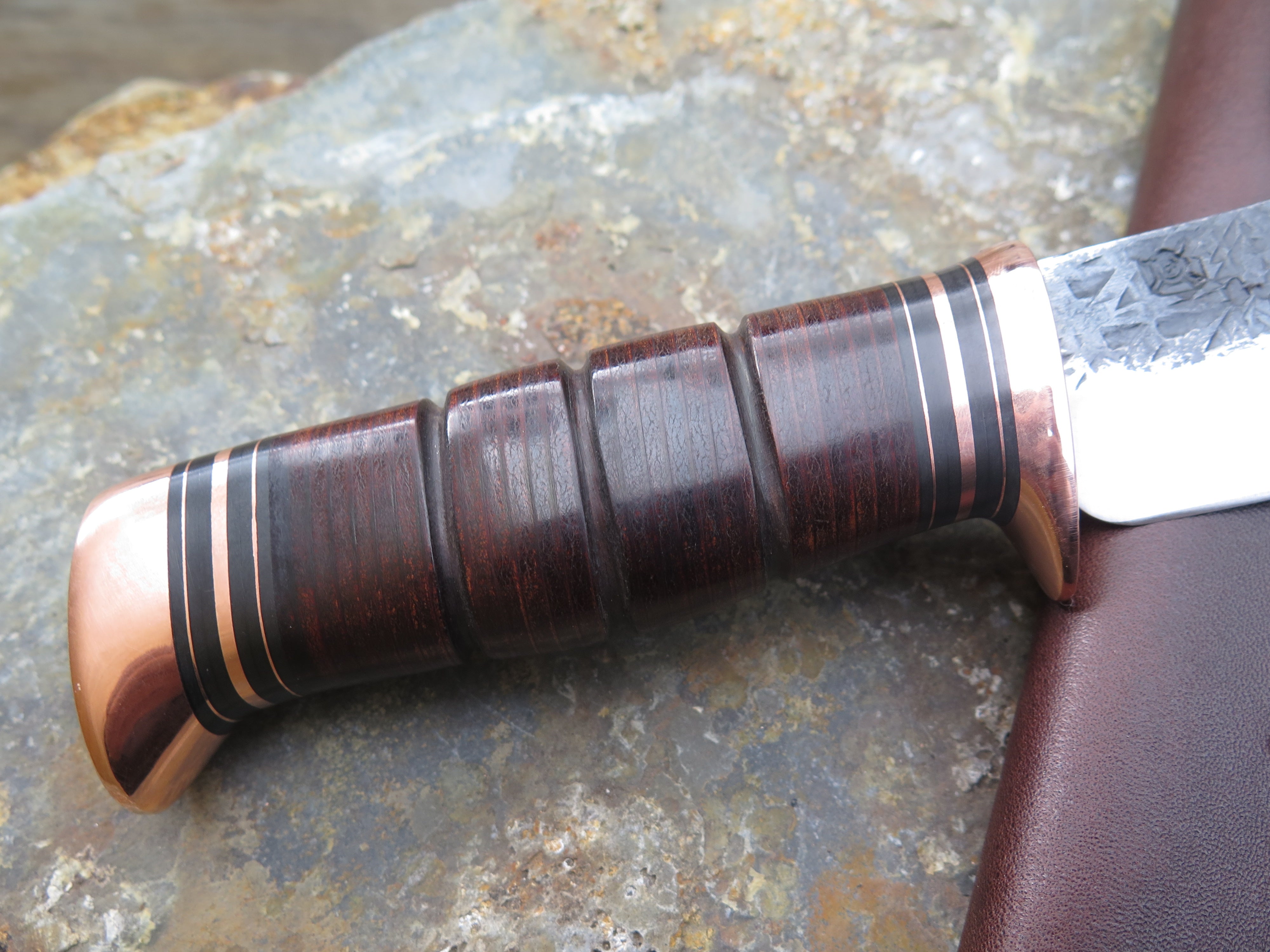 This drop point blade is hand forged from 3/16" thick high carbon 01 tool steel and it measures 5 1/2" from tip to guard with a razor sharp hollow grind and our hammermark finish. The copper guard is soldered in place above black fiber and copper spacers as well as a scalloped stack of horsehide leather and a copper butt that's also pinned through the tang with copper. The overall length measures just over 10" and it comes in a classic leather belt pouch sheath. This knife is made to order. Current lead times are 6 - 8 weeks.