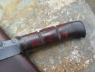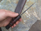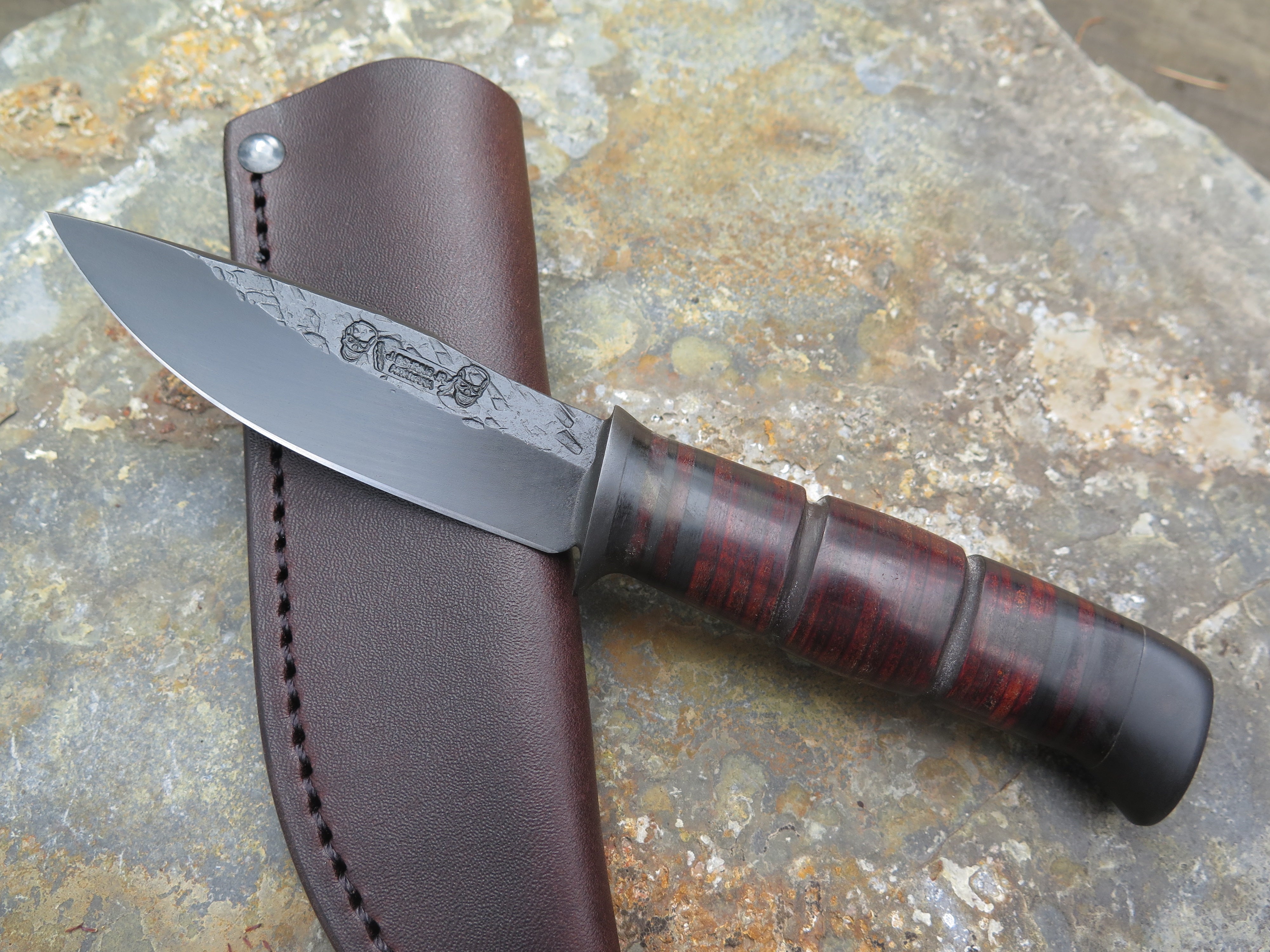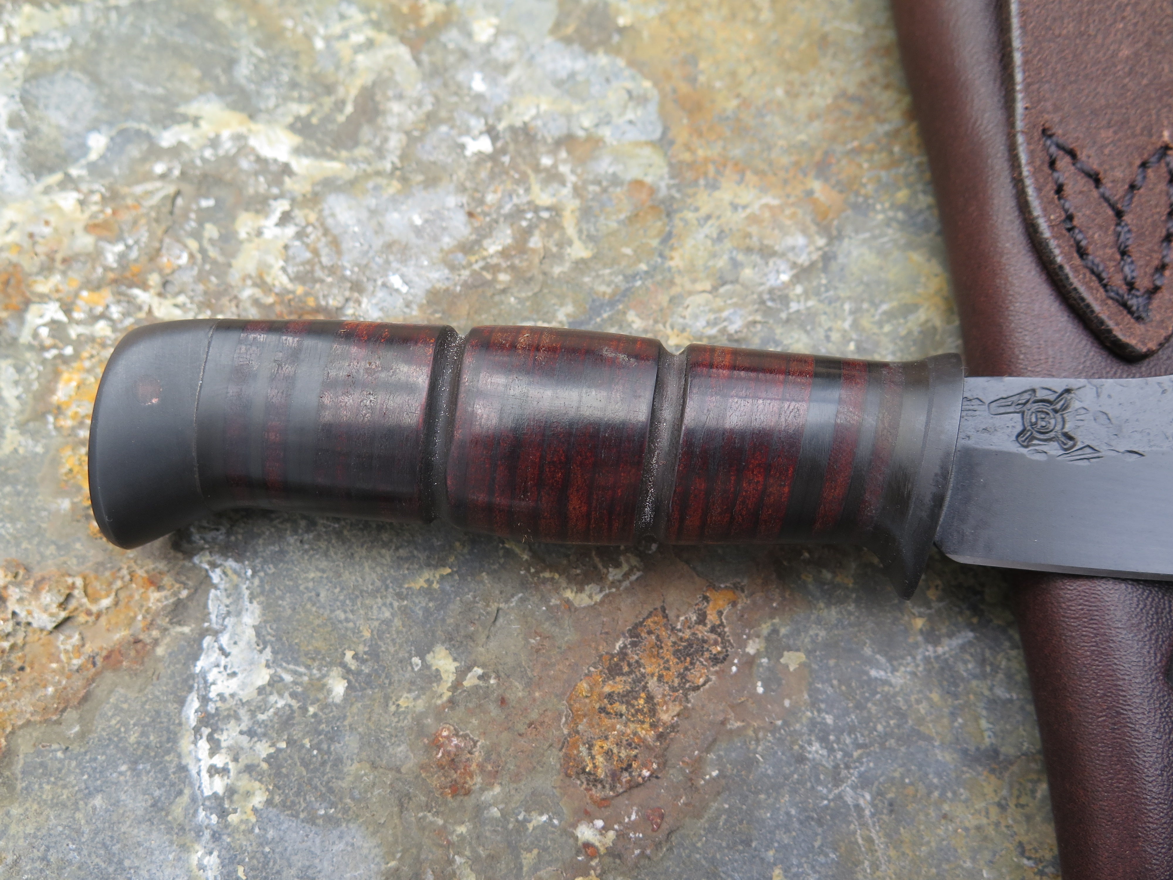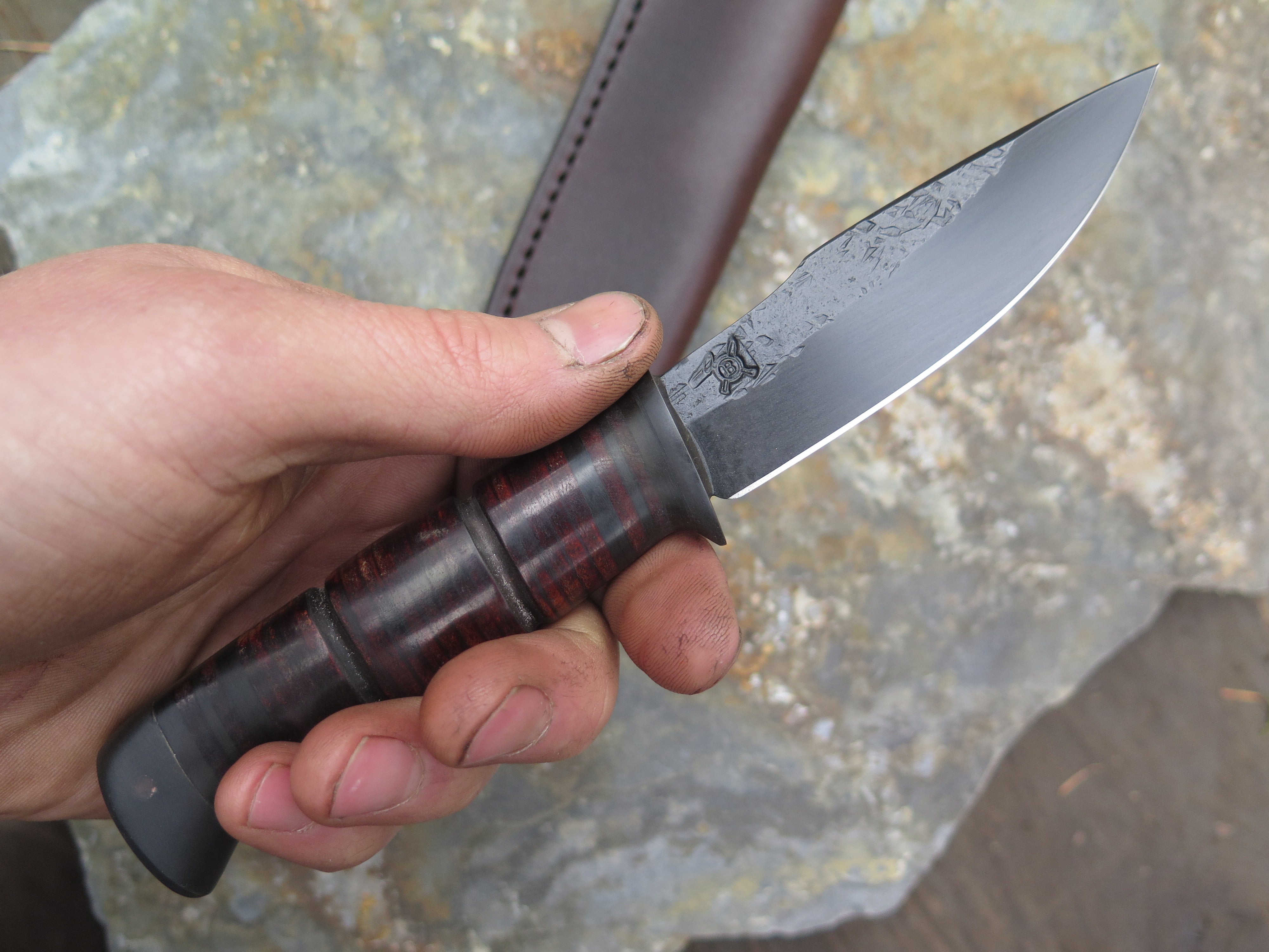 This sleek new Drop Point from Behring Made© is hand forged from 1/8" thick high carbon 01 tool steel and it measures 3 3/4" from tip to guard with a razor sharp hollow grind, hammermarks and our forced patina blued finish. The blued steel guard is soldered in place above black fiber and a stack of scalloped horsehide leather spacers which are capped with blued steel and a copper pin through the tang. The overall length measures 7 1/2" and it comes in a classic leather belt pouch sheath.