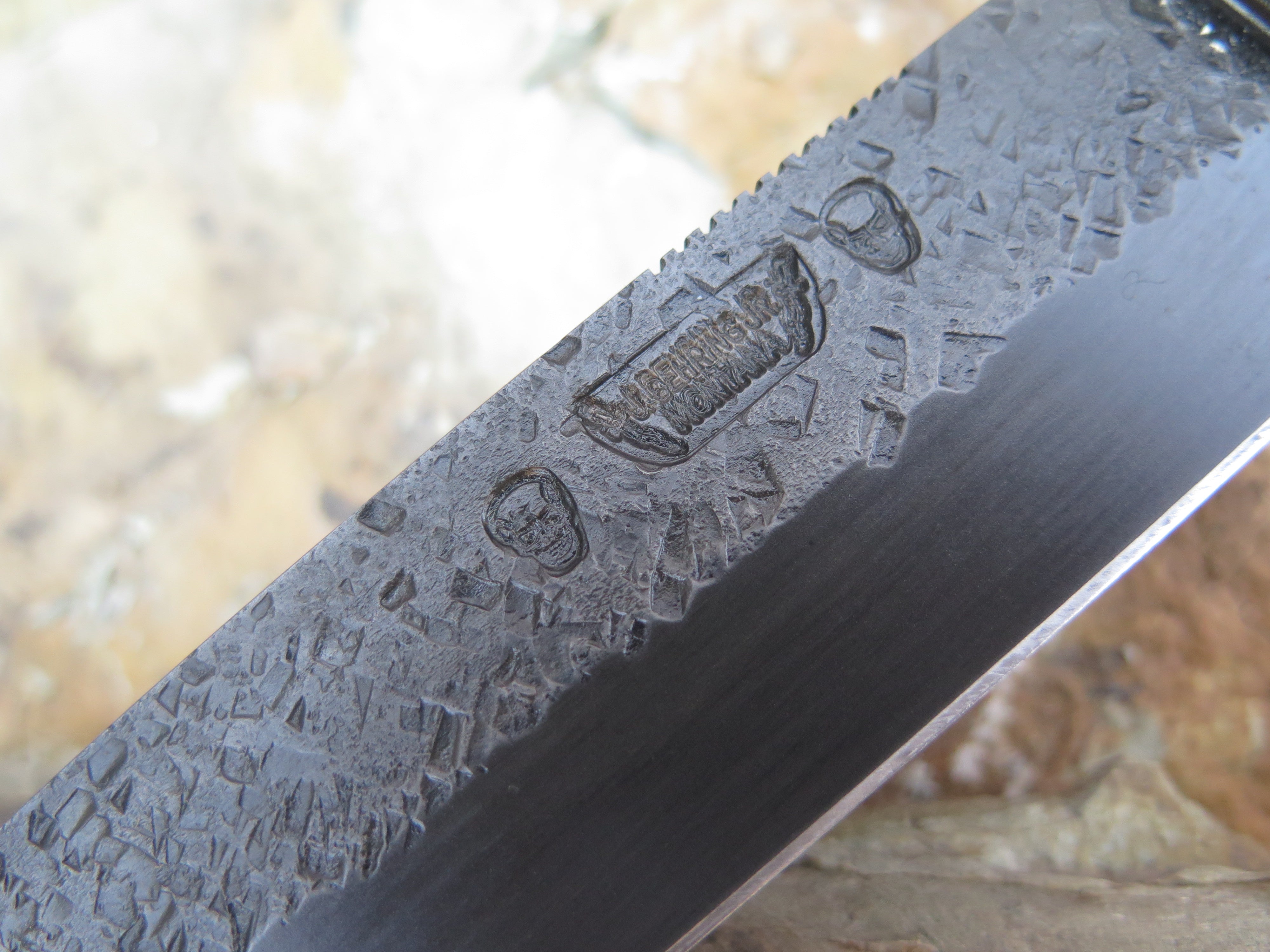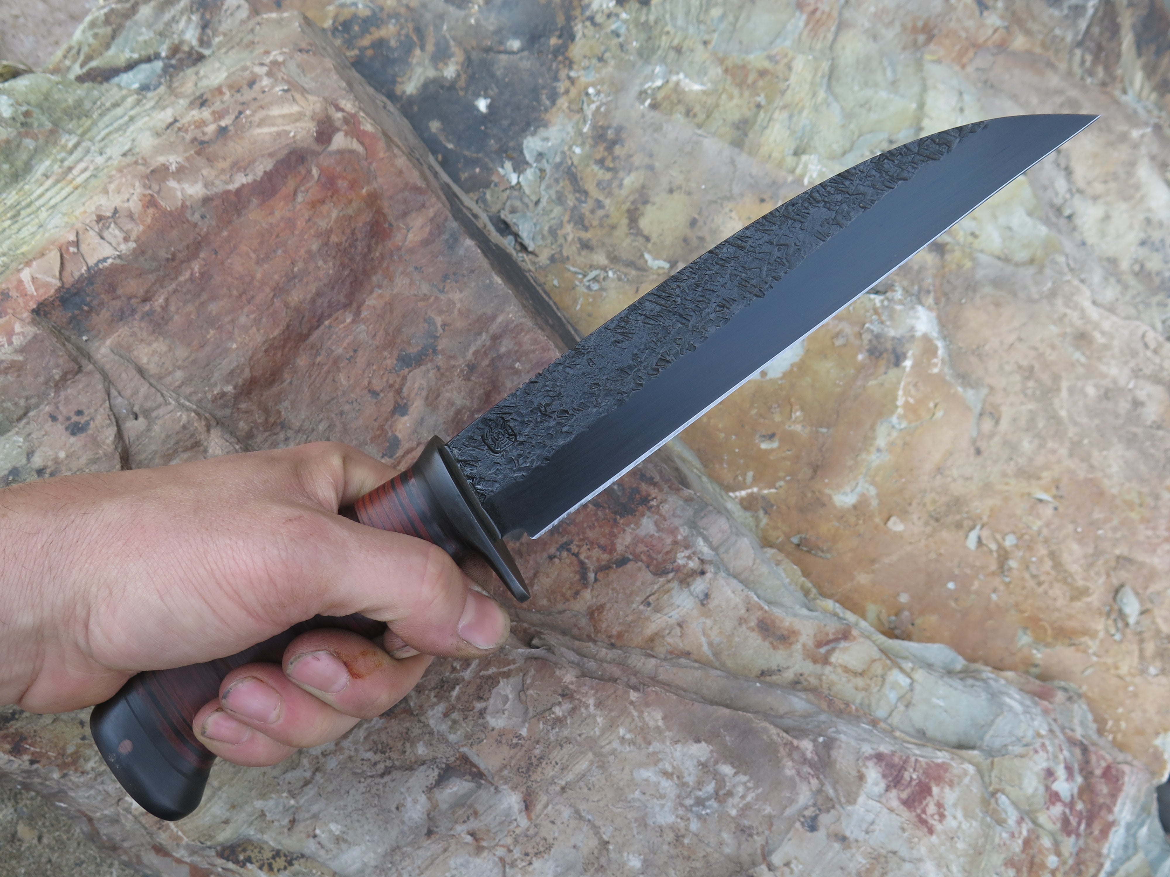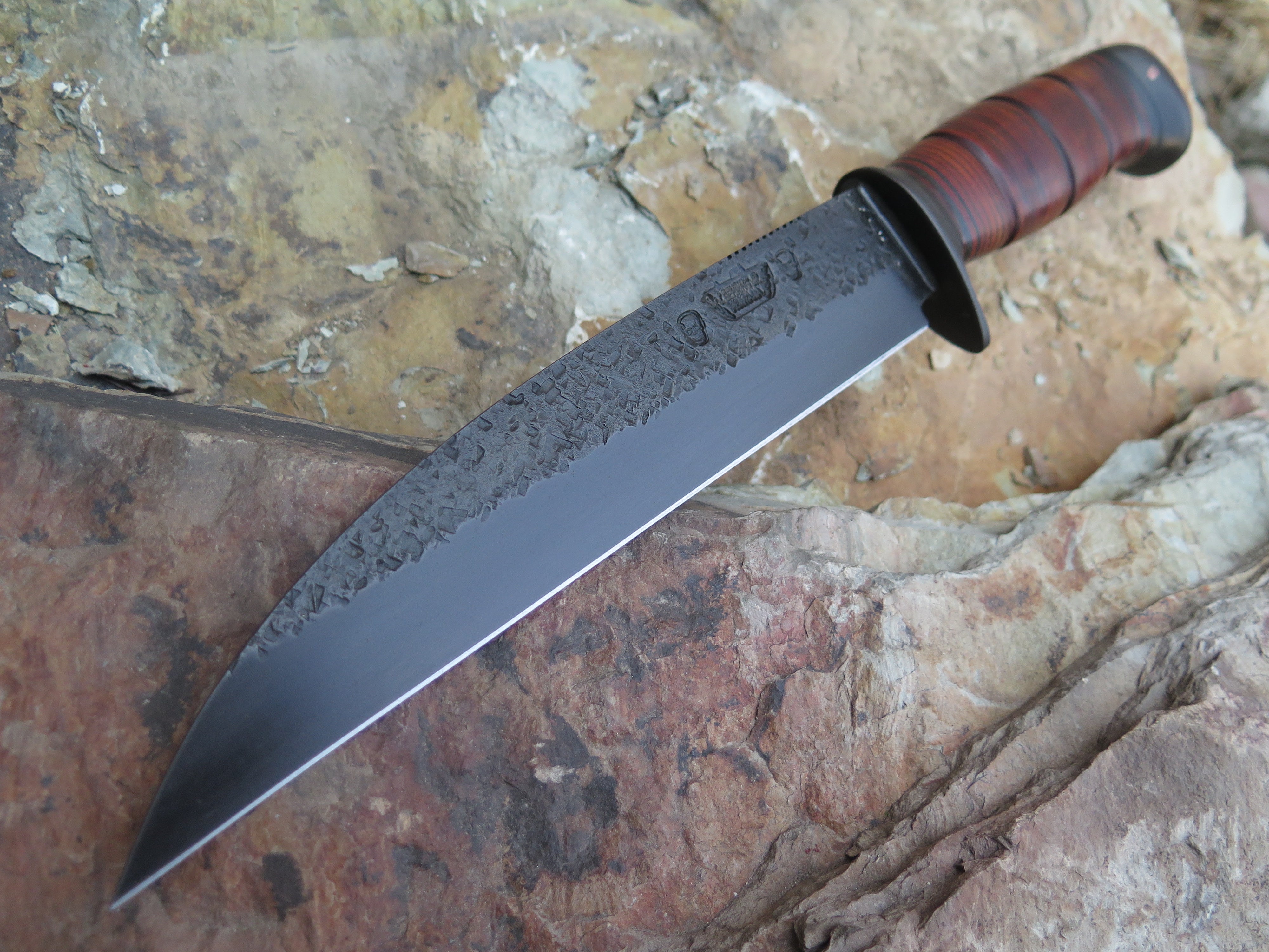 This savage Wharncliffe Fighter from Behring Made™ is hand forged from hefty 1/4" thick high carbon 01 tool steel and it measures 8" from tip to guard with a razor sharp hollow grind, hammermarks and our forced patina blued finish. The blued steel guard is silver soldered in place above black fiber spacers with a stack of premium horsehide leather that's scalloped for a truly confident grip, plus it's capped with blued steel that's pinned through the tang with copper- rock solid. The overall length of this one measures 12 1/2" and it'll come in a custom sheath from Behring Made leather shop. Lead time 6 - 8 weeks.