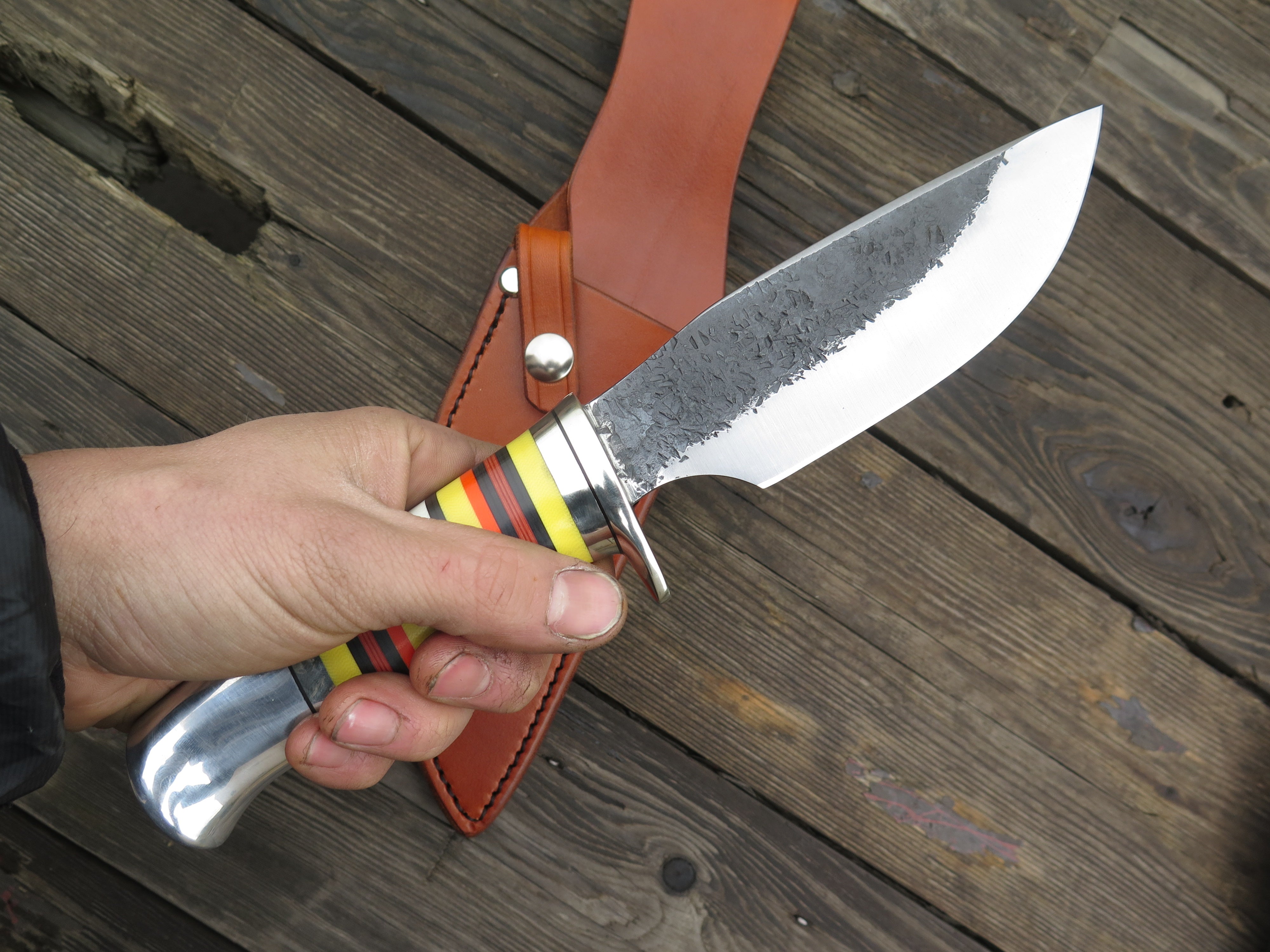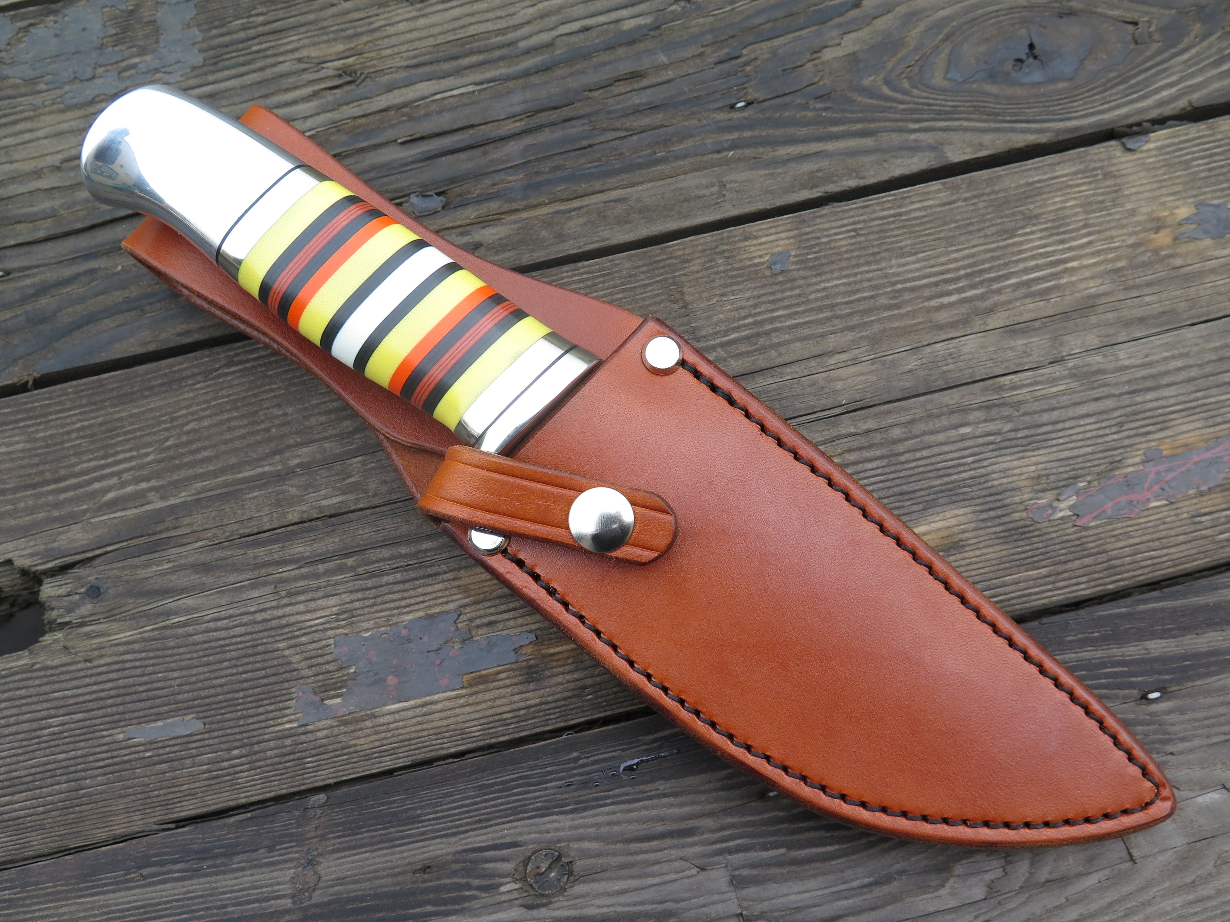 This incredible new Alaskan from Behring Made© is a tribute to the knives made by soldiers while deployed during WWII. Many would source loose materials and create brilliant works of art- in this case it cuts like a razor too! The blade is hand forged from 13/64" thick 5160 spring steel and it measures 6" from tip to guard with a razor sharp hollow grind and our hammermark finish. The nickel silver guard is soldered in place above black and maroon fiber, aluminum, white, orange and yellow g10 with an aluminum butt that's also pinned through the tang. The overall length measures 11" and it comes in a custom sheath from Warlander Leather. As this is an archive listing, please allow 6-8 weeks for production and delivery. Behring Made zipper case optional.